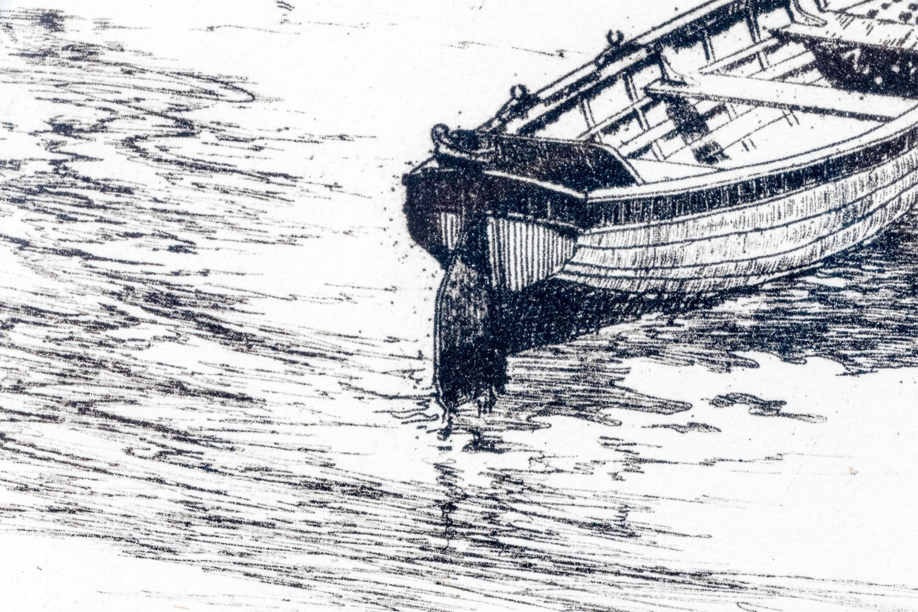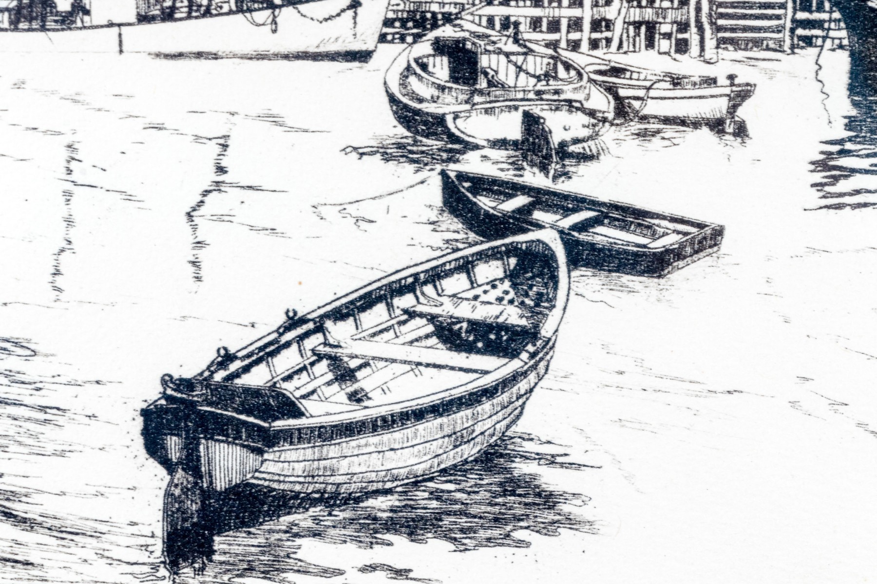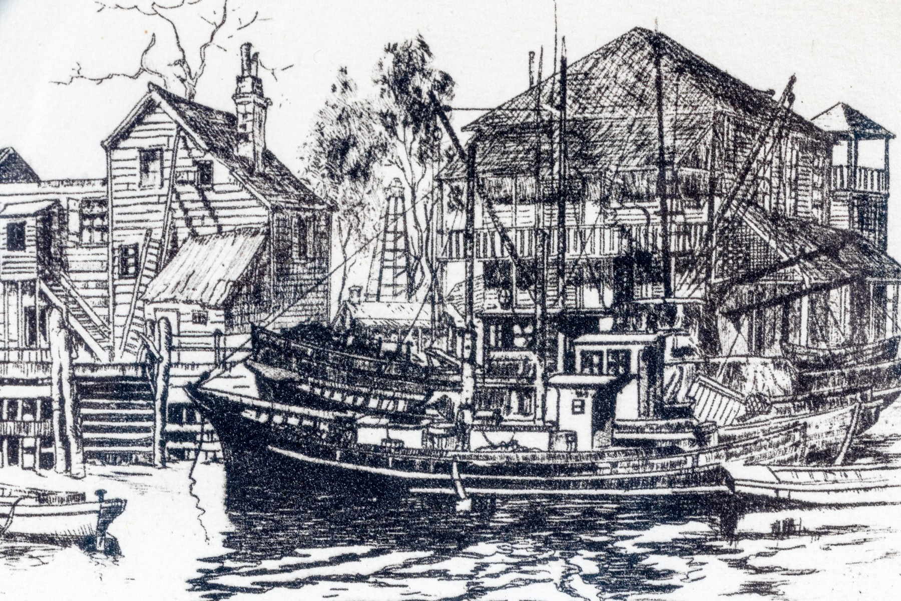 Signed indistinctly in plate lower right, titled in plate lower left. Printed in the U.S.A. View of San Pedro on the water with its wooden dock houses and a variety of boats. Presented in a black and gilt frame with glass,