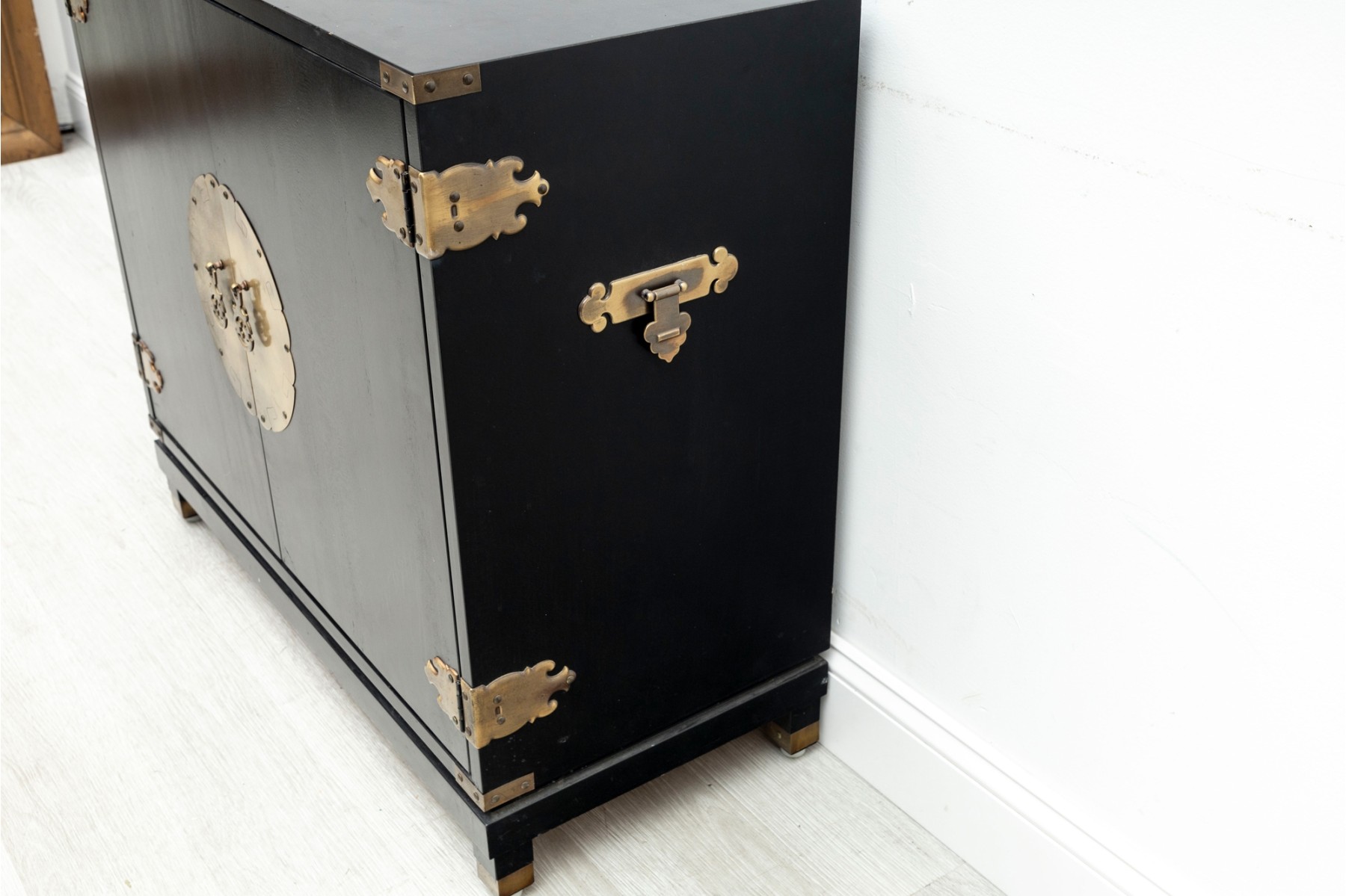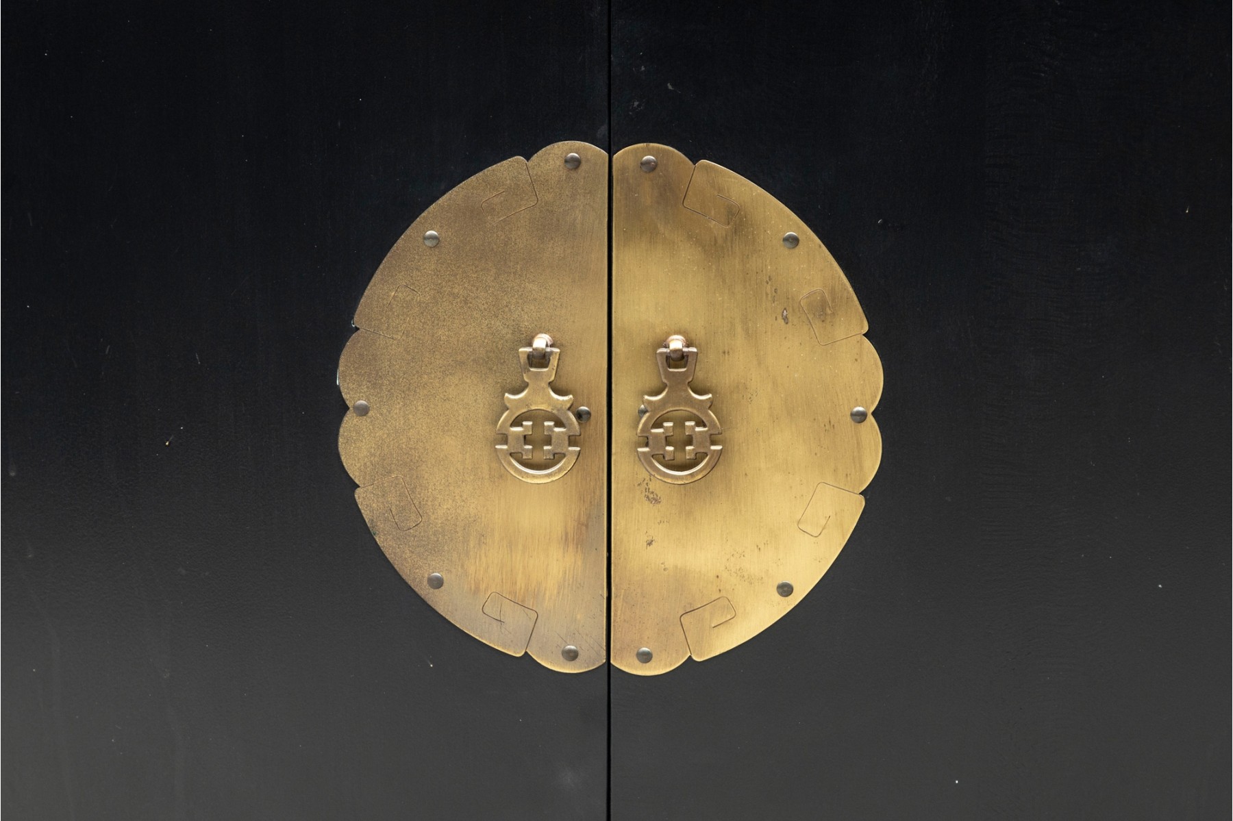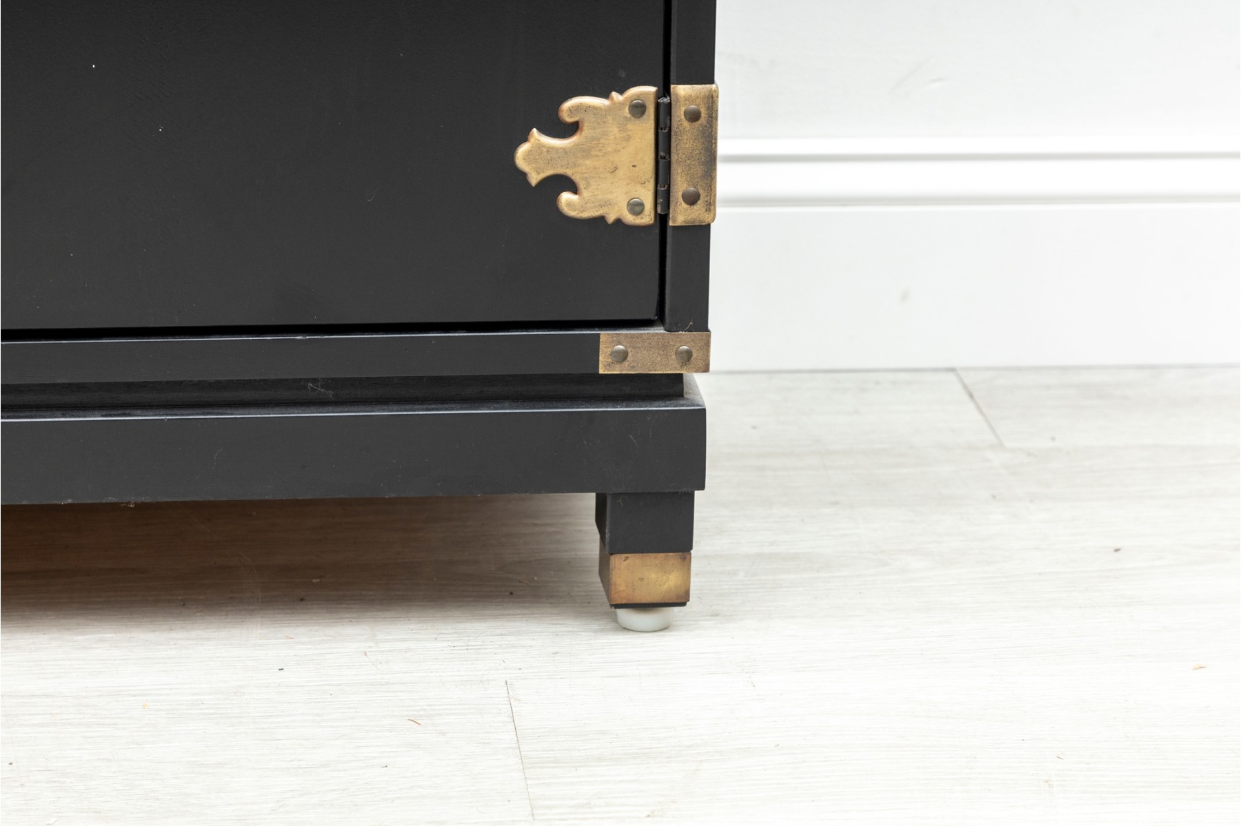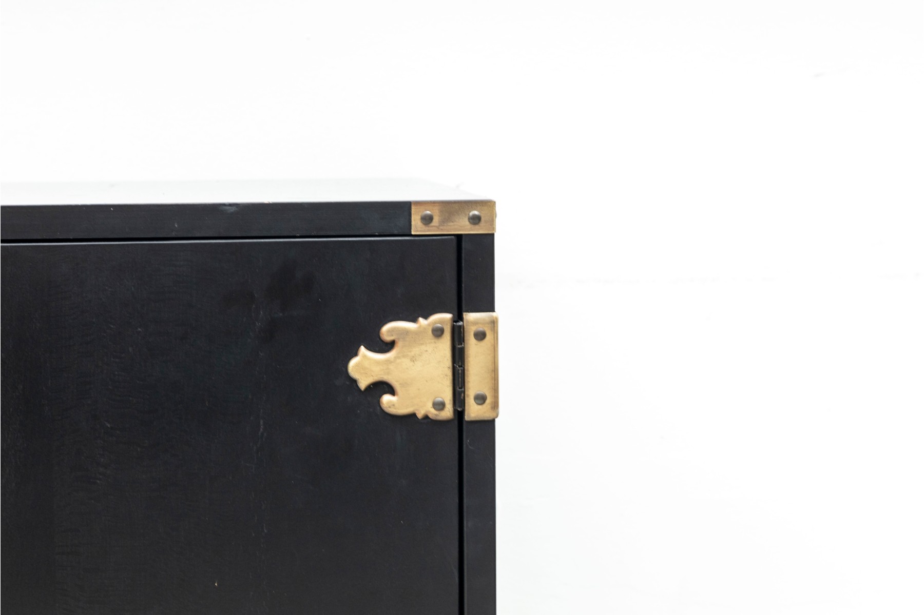 This black Chinoiserie chest is a stunning display of Eastern-inspired elegance, adorned with intricate brass hardware and decorative brass accents throughout. The interior features a center shelf and drawer.