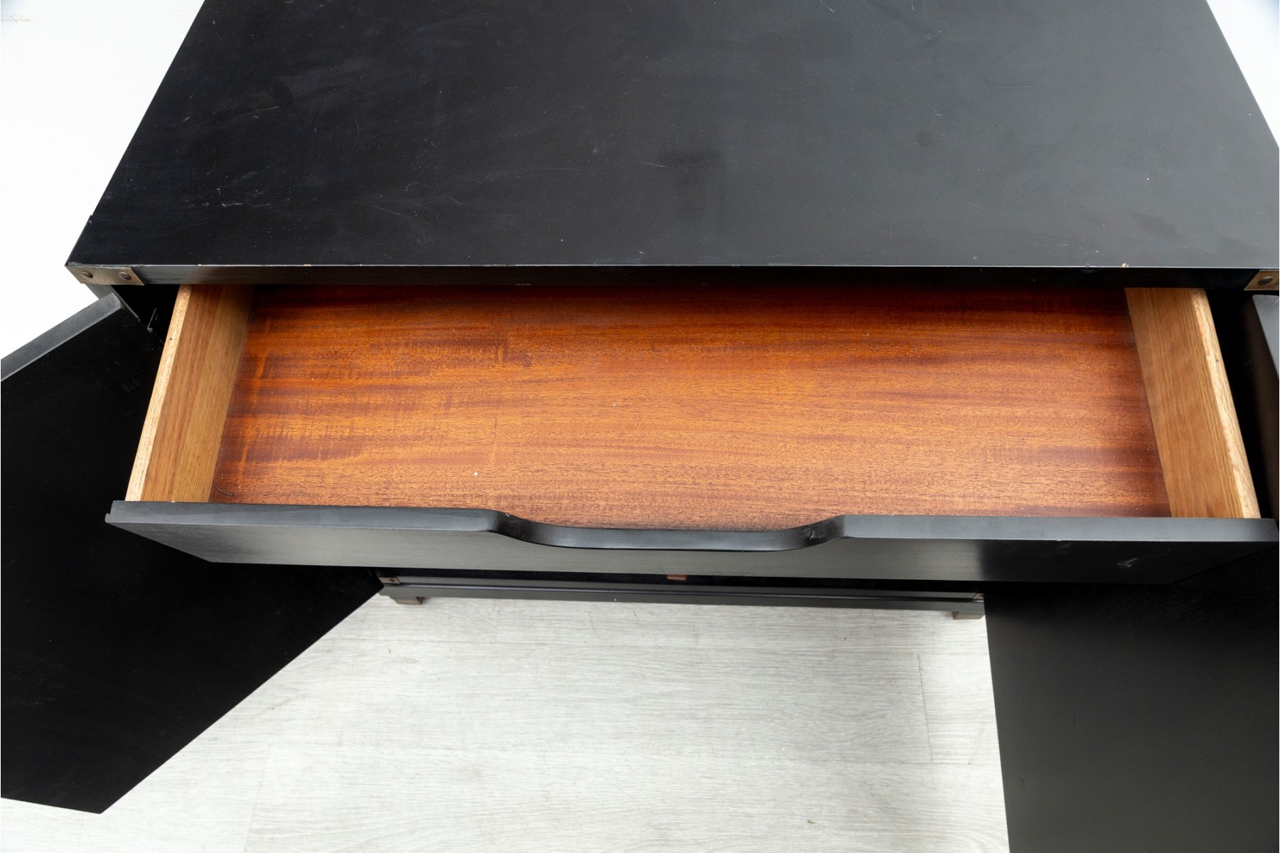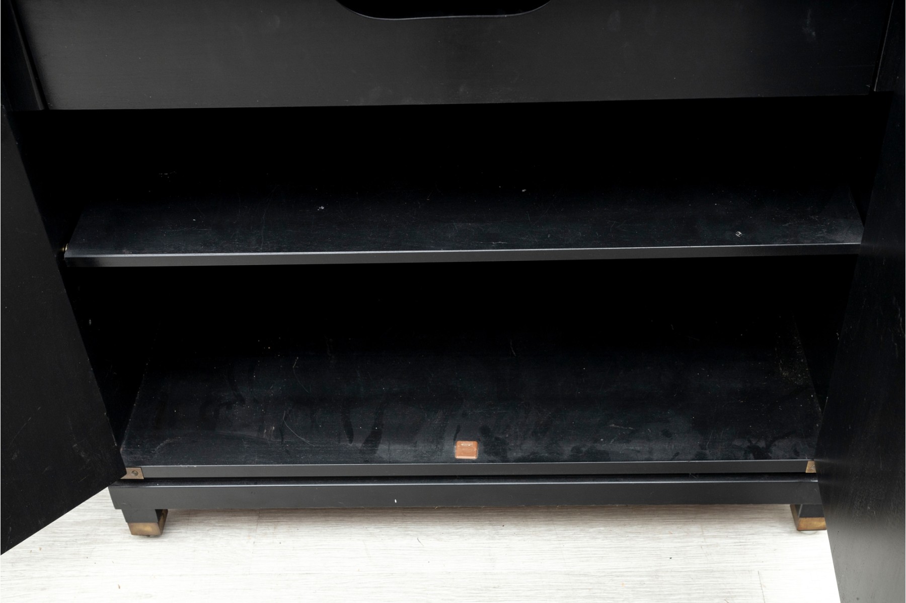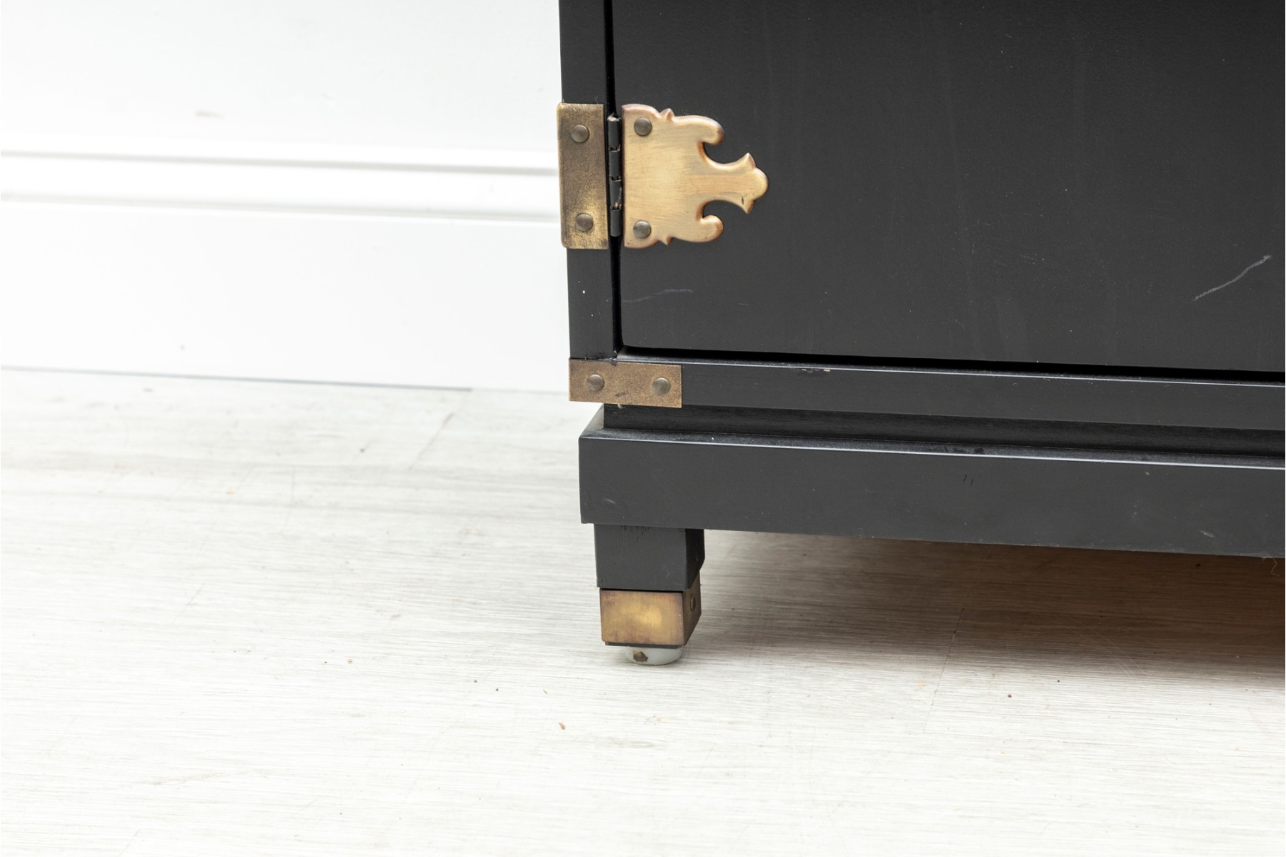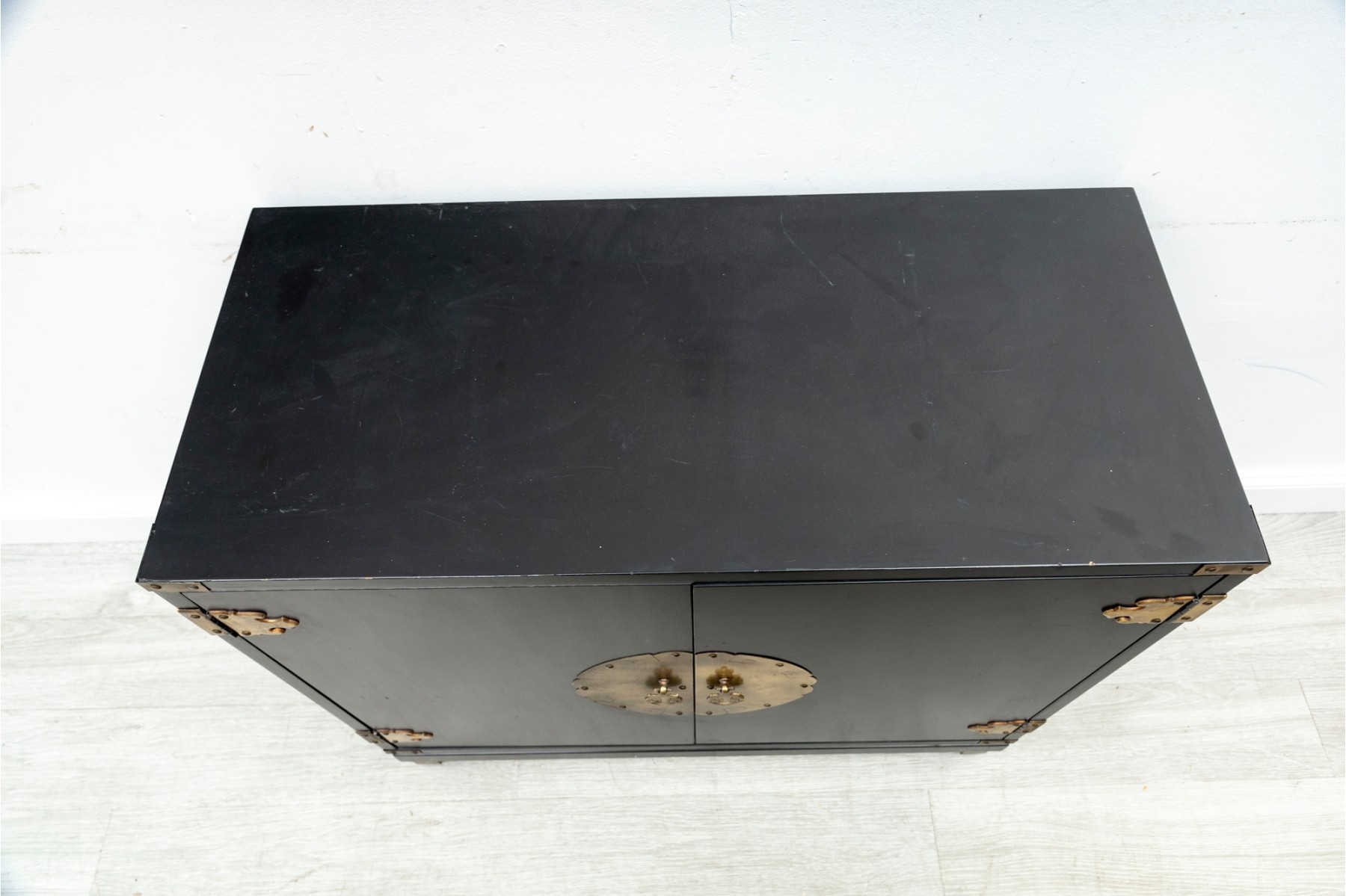 This black Chinoiserie chest is a stunning display of Eastern-inspired elegance, adorned with intricate brass hardware and decorative brass accents throughout. The interior features a center shelf and drawer.