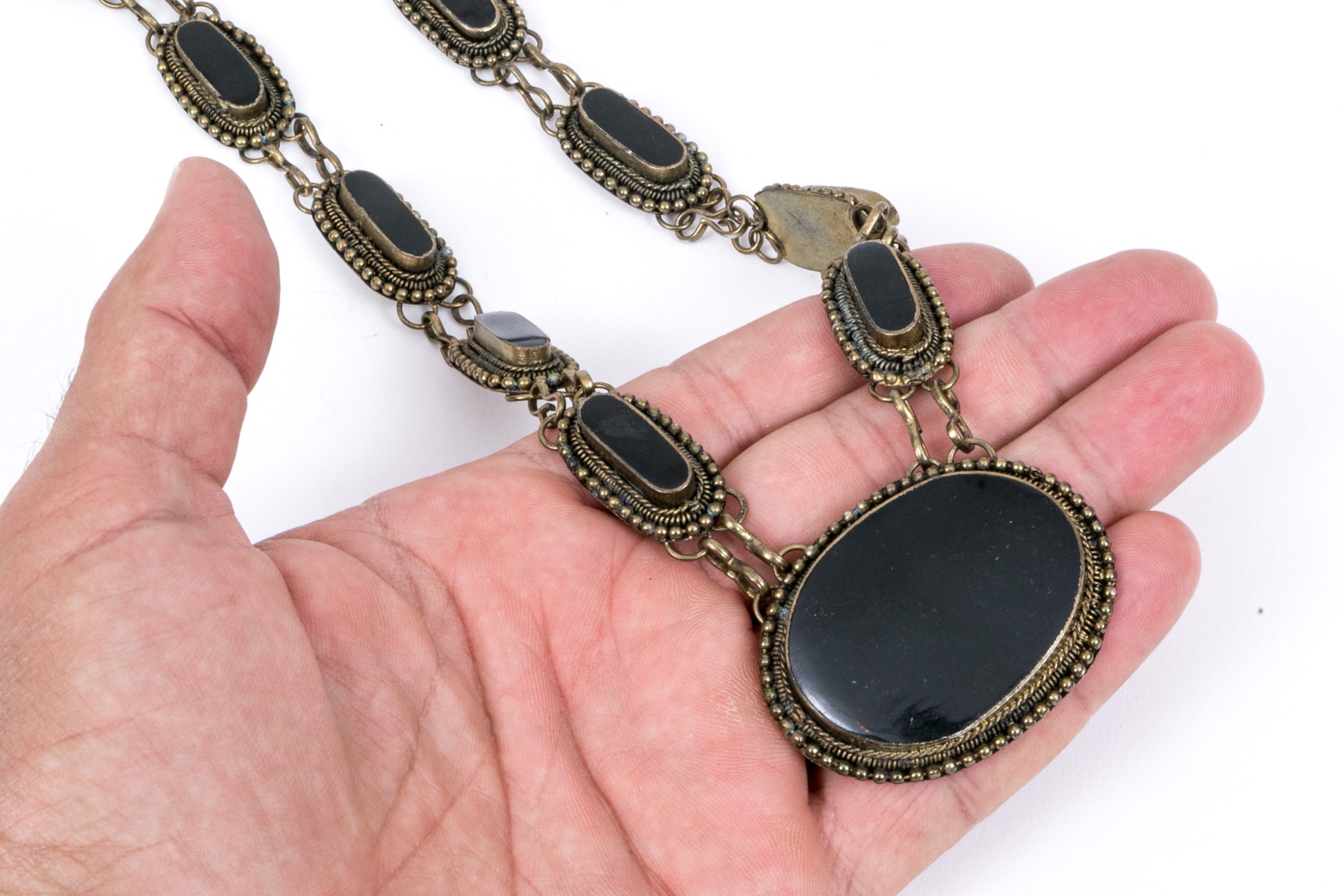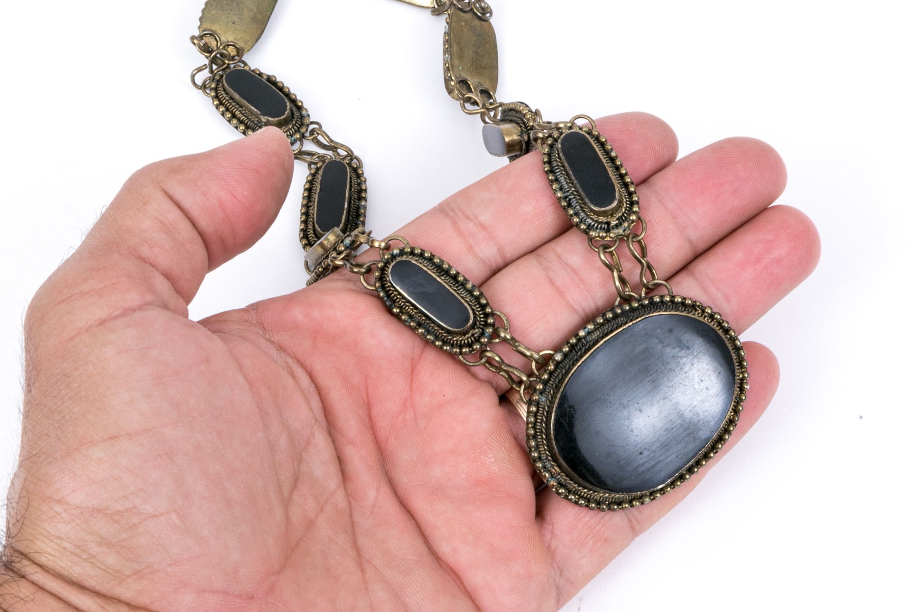 Vintage black wood and gold plated impactful chunky opera length necklace, finished with a hook style clasp