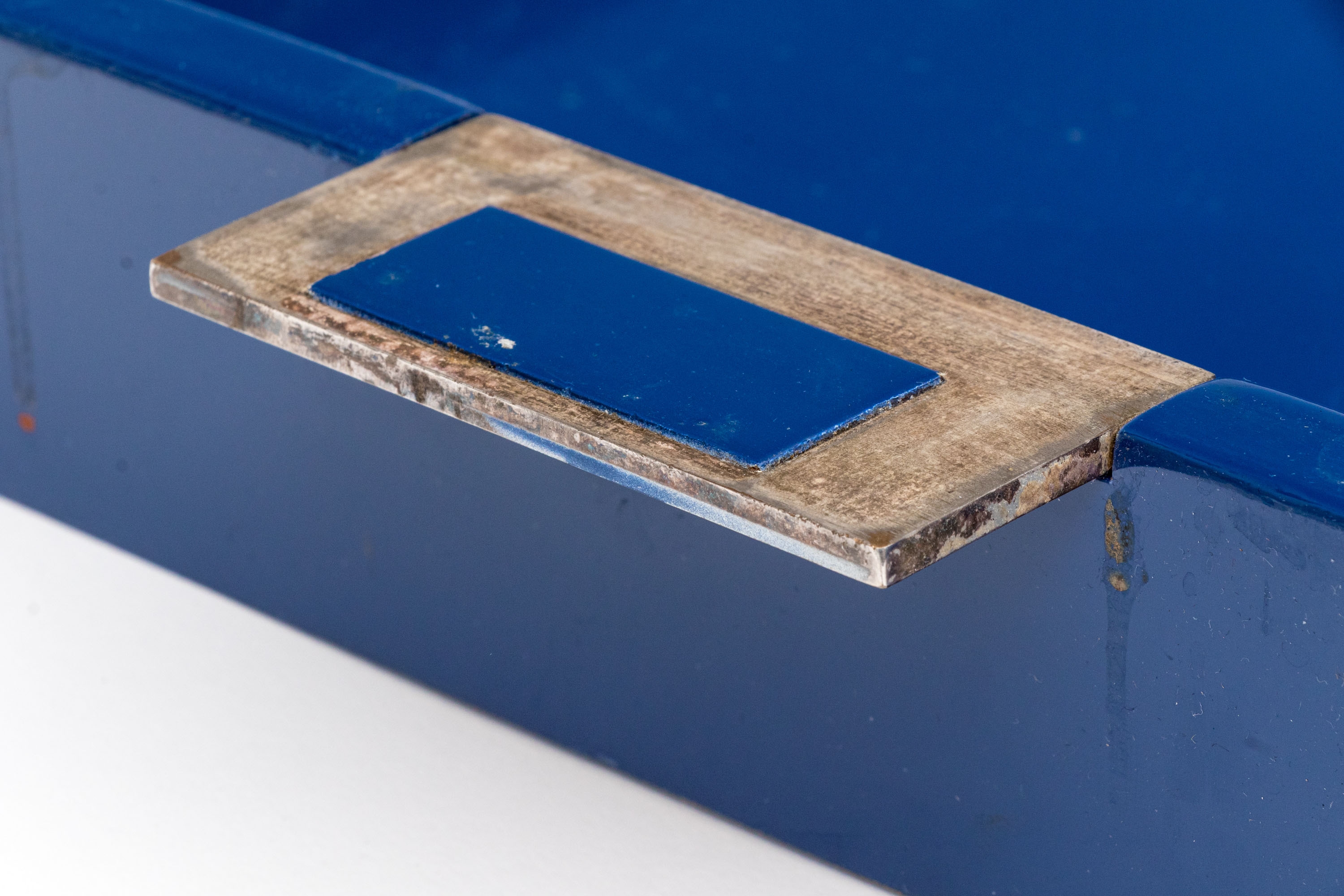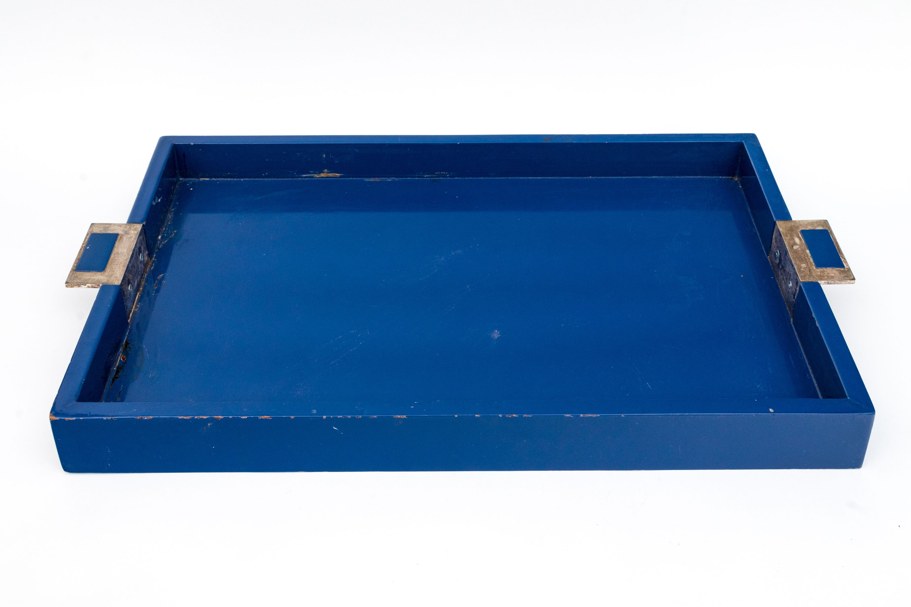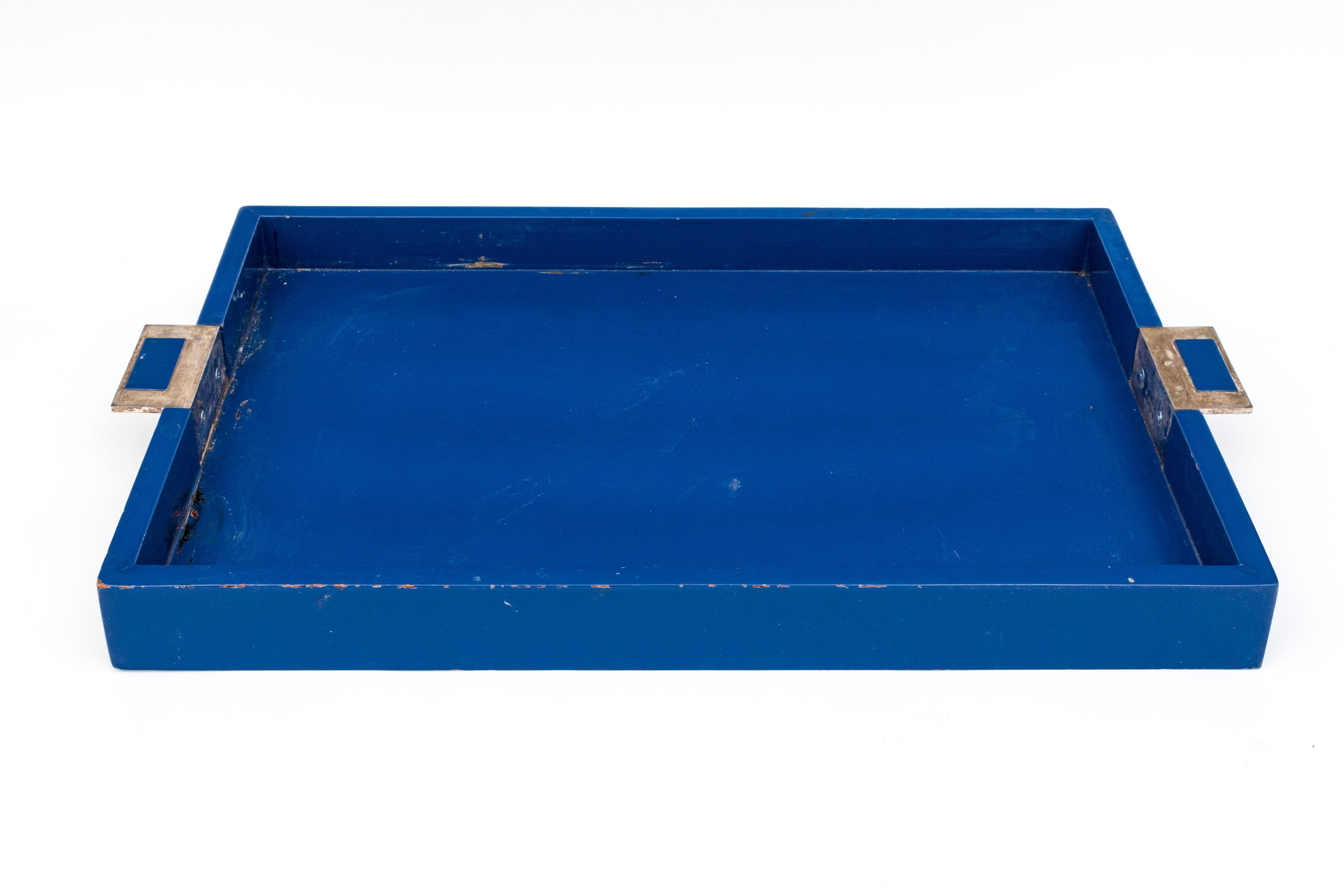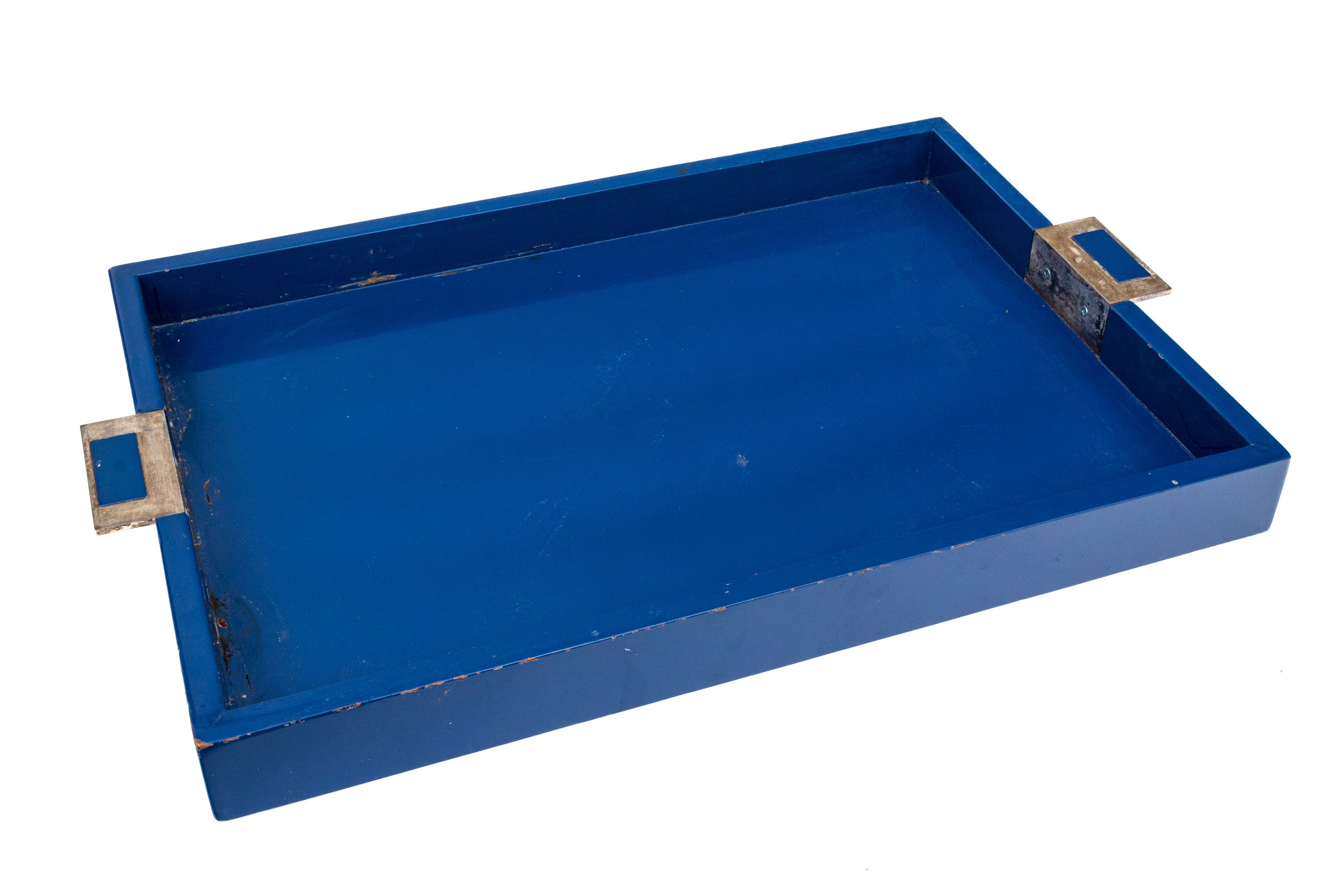 A large rectangular tray in blue lacquer with metal extended handles with inset blue lacquered plaques.