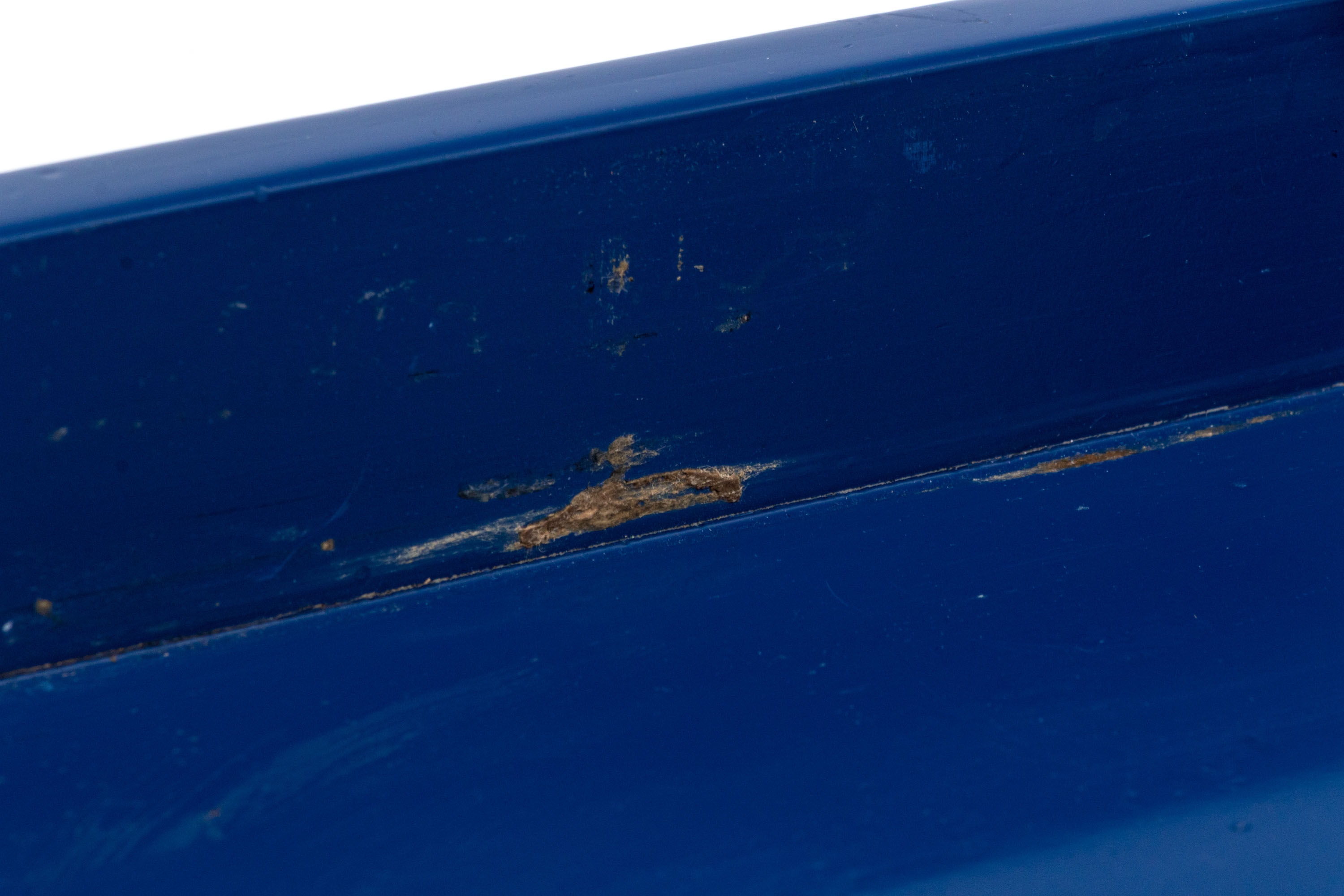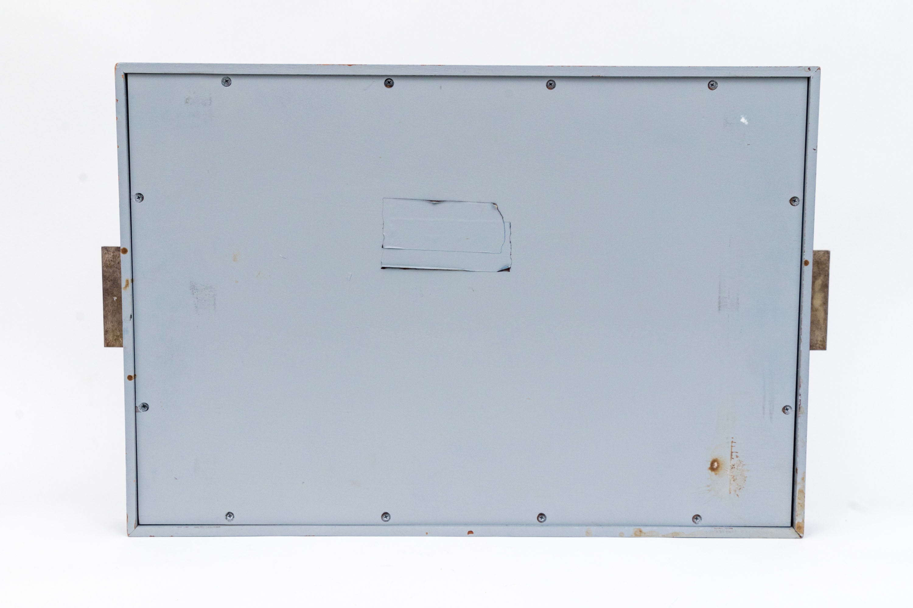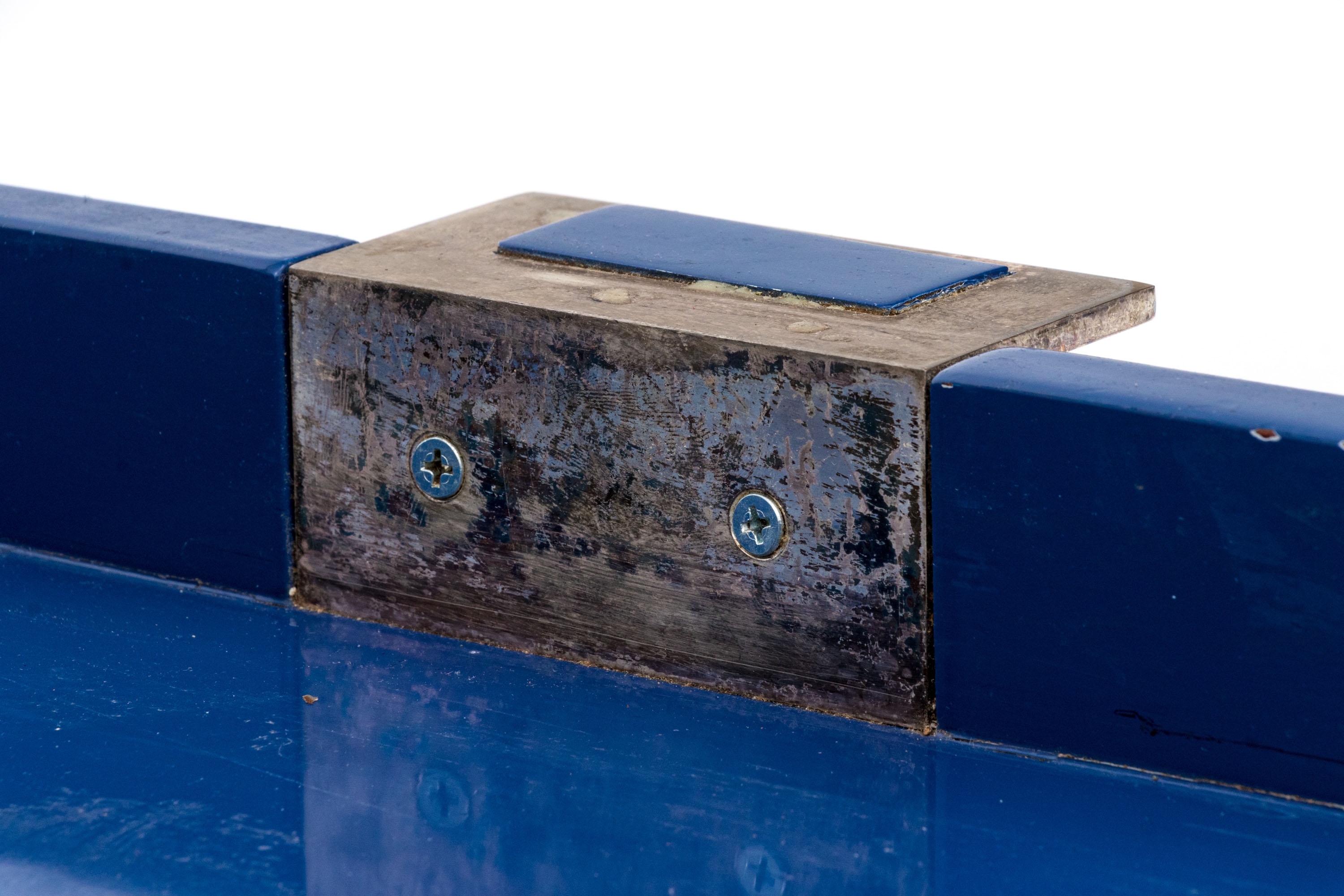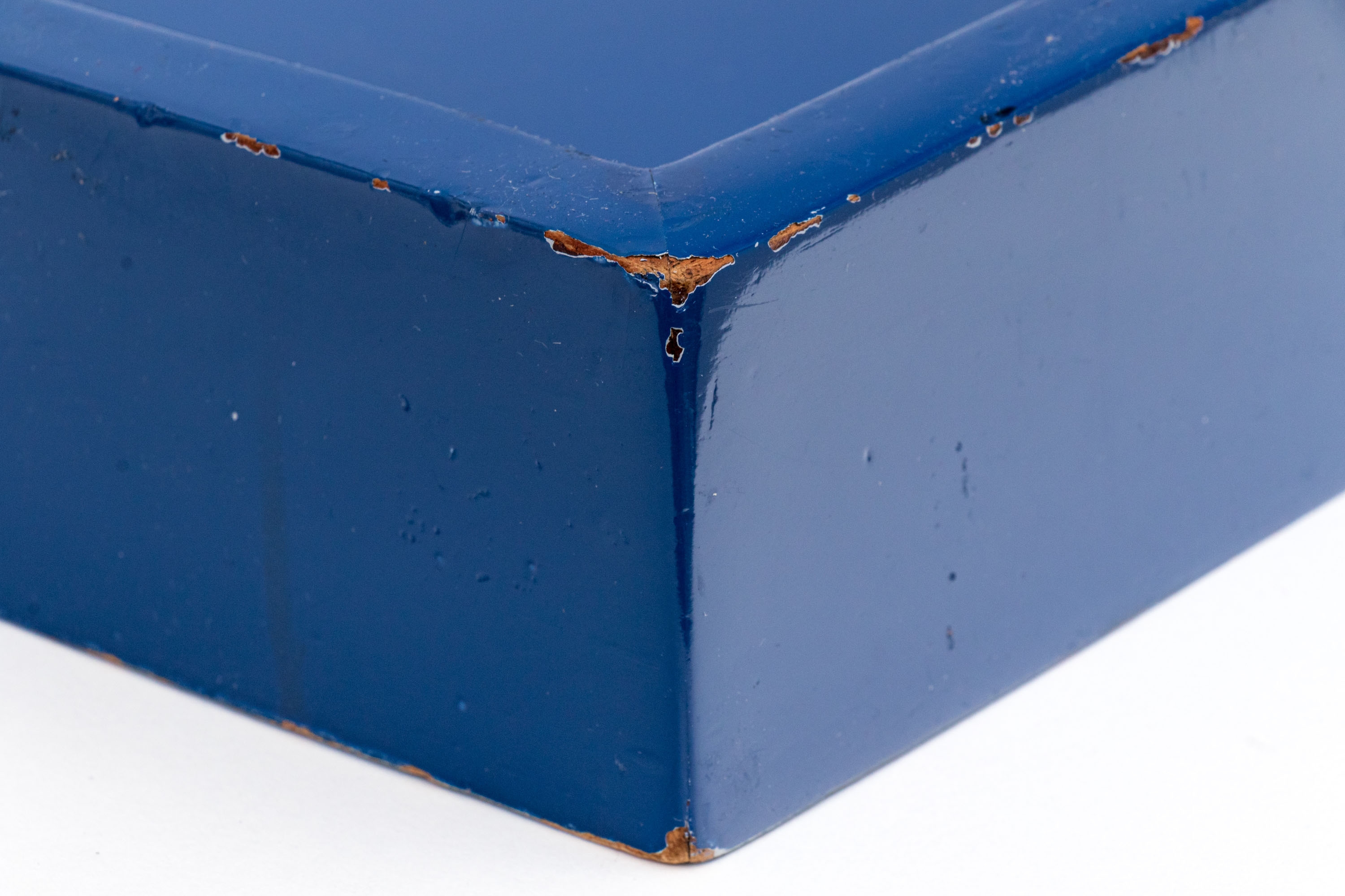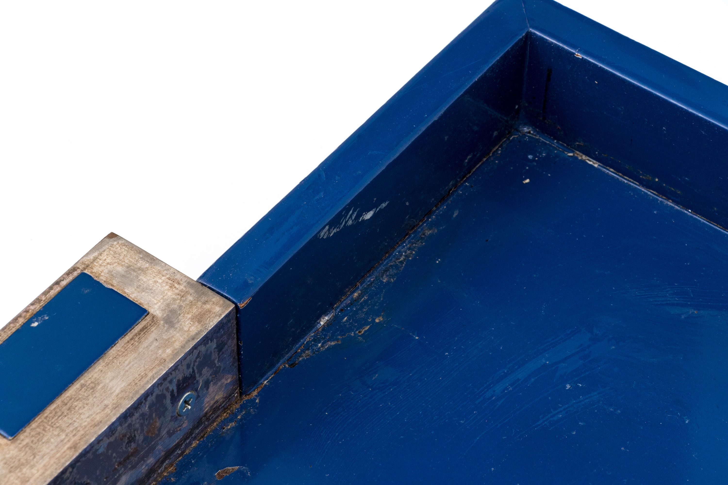 A large rectangular tray in blue lacquer with metal extended handles with inset blue lacquered plaques.