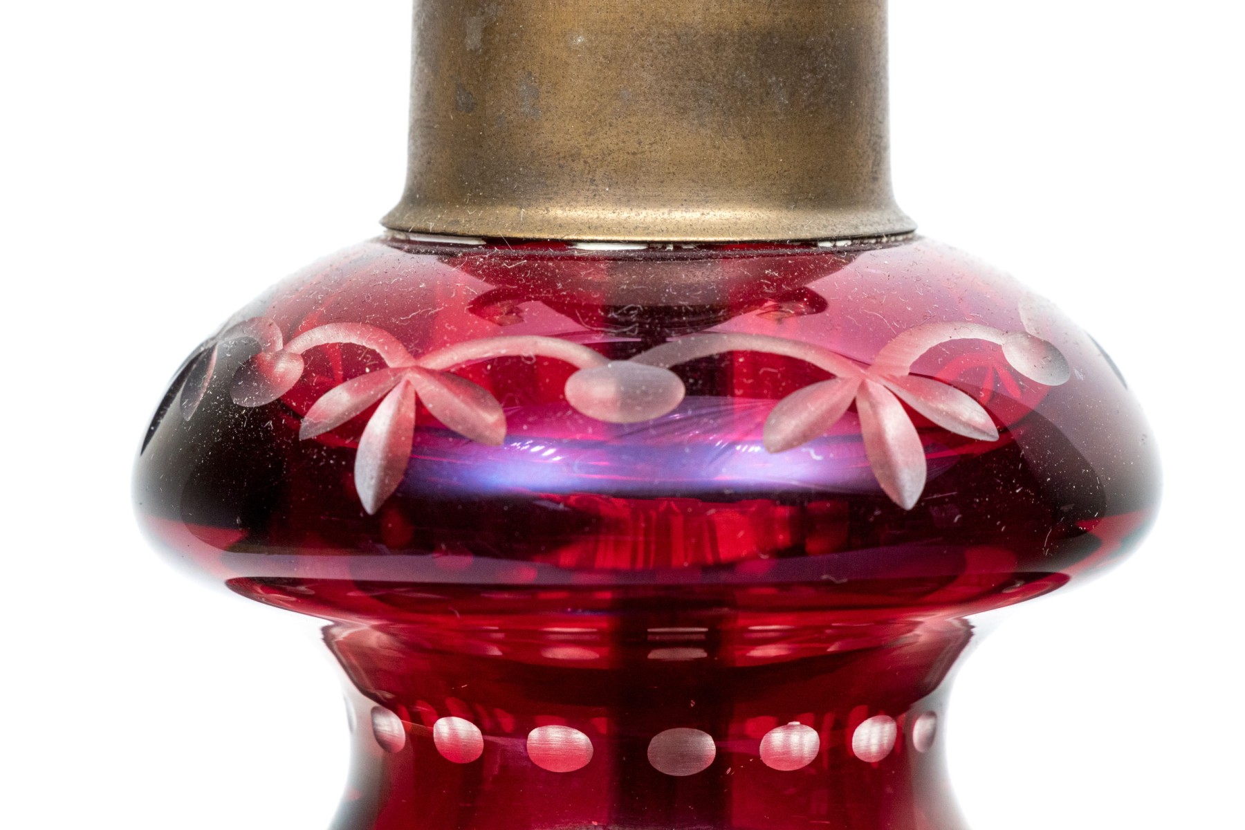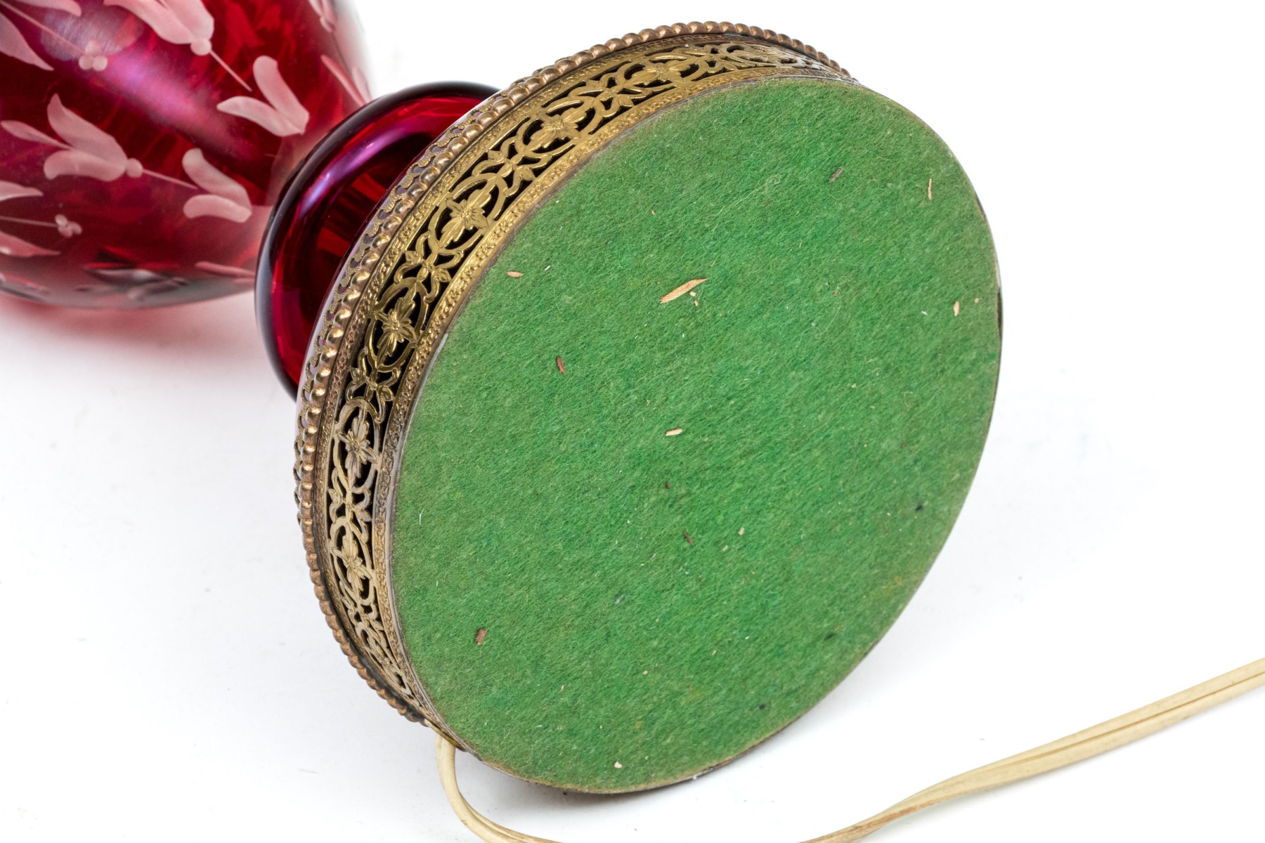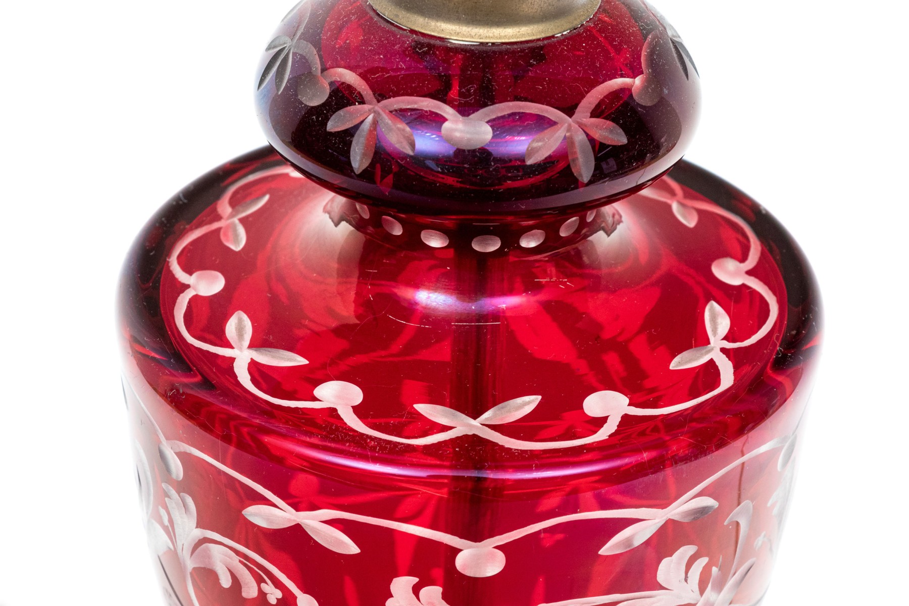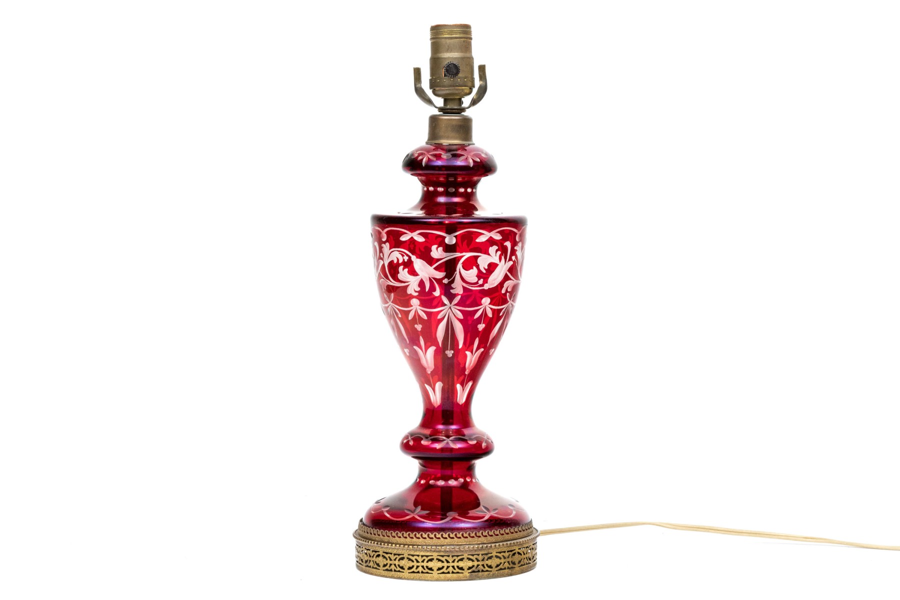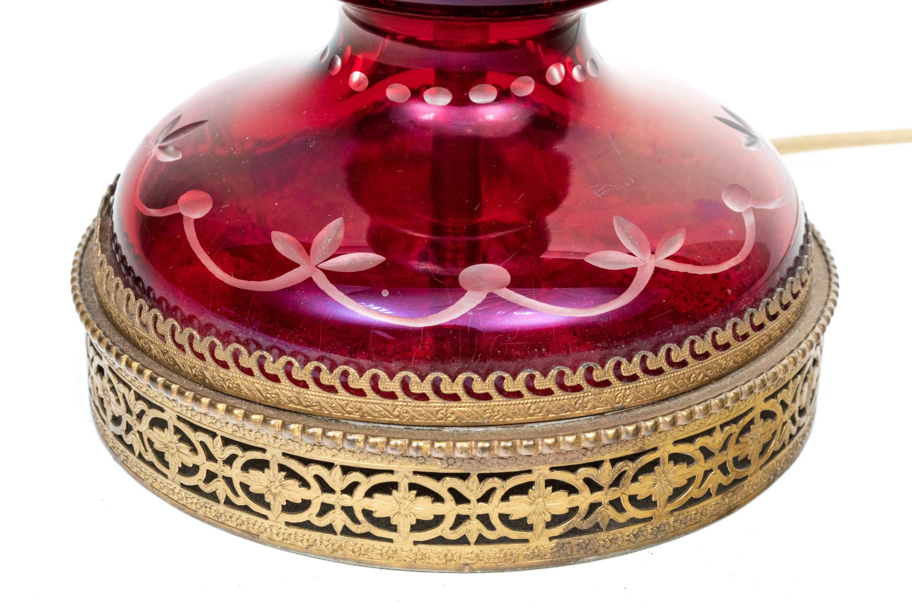 With an overall etched floral vine pattern and a bulbous top and base on a circular domed foot. Mounted on a pierced brass base.