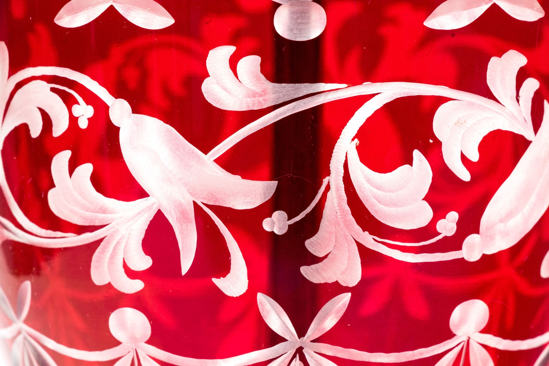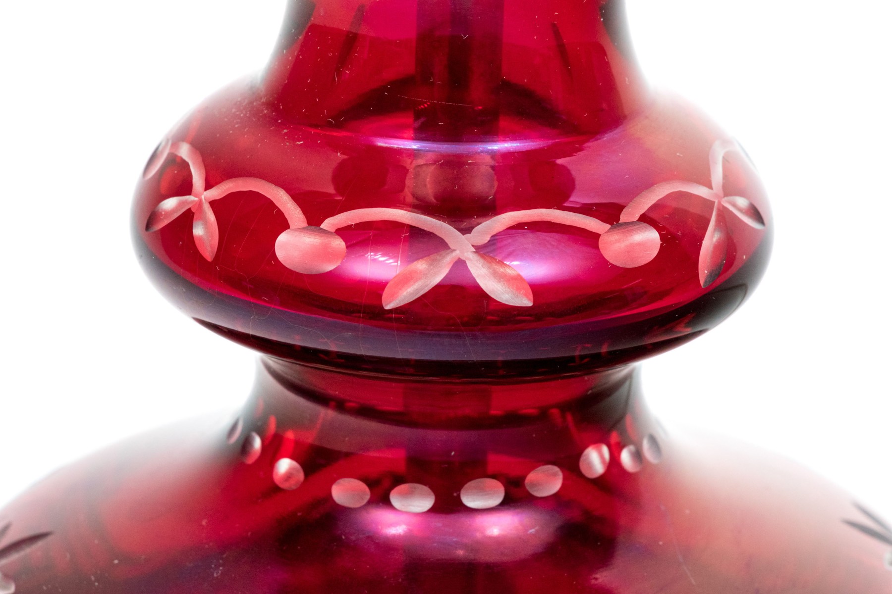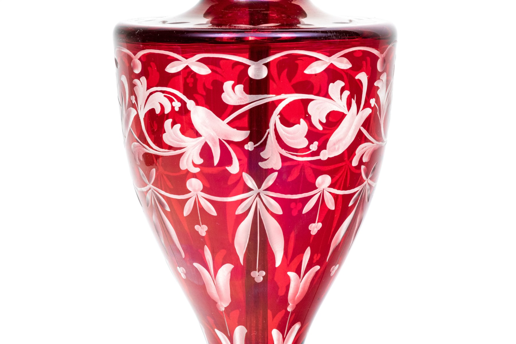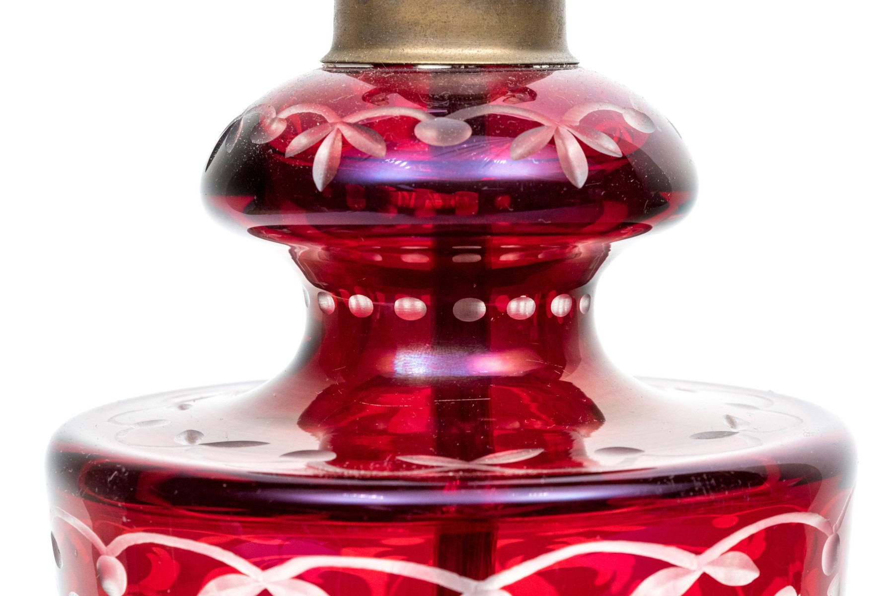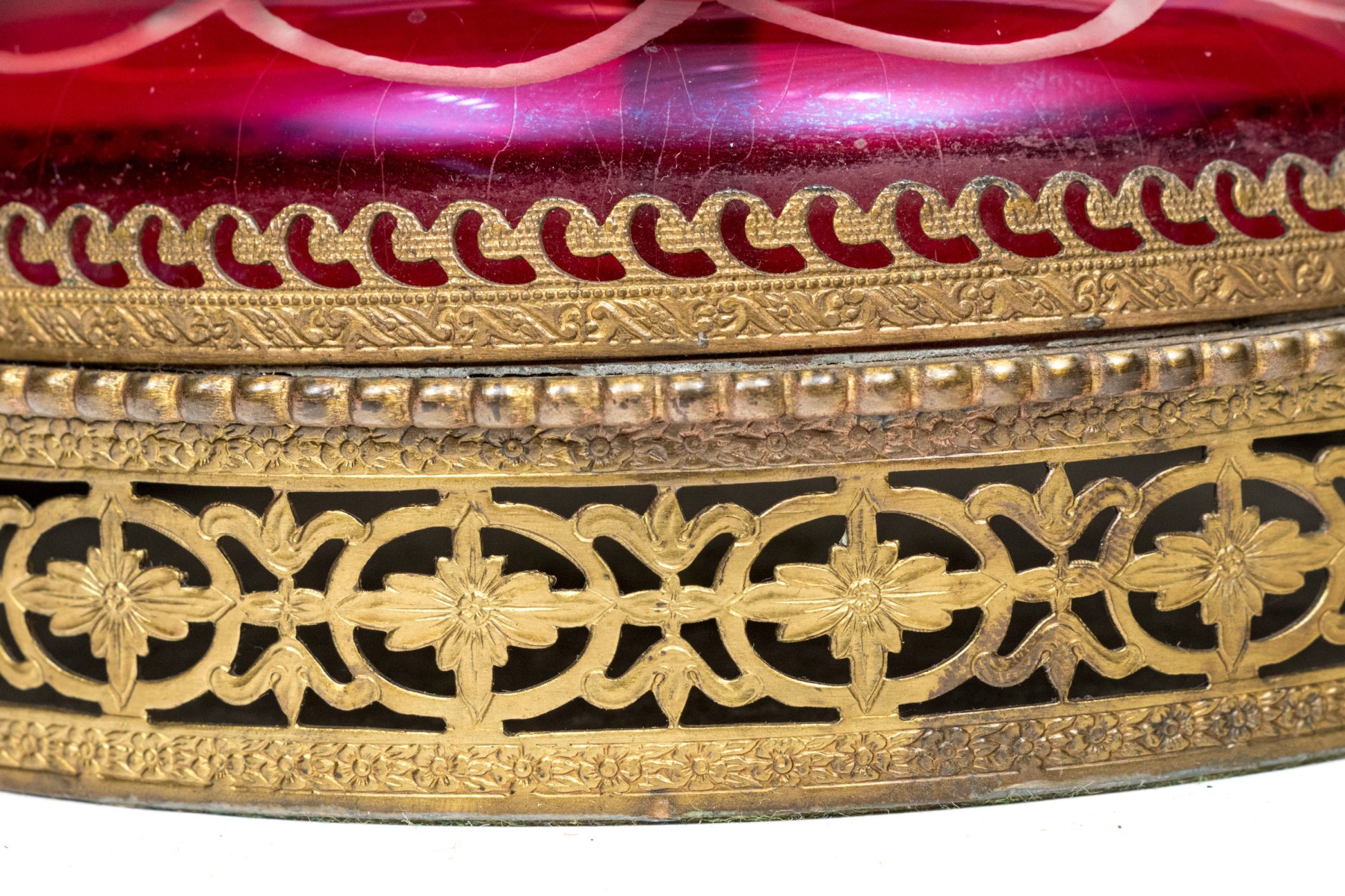 With an overall etched floral vine pattern and a bulbous top and base on a circular domed foot. Mounted on a pierced brass base.