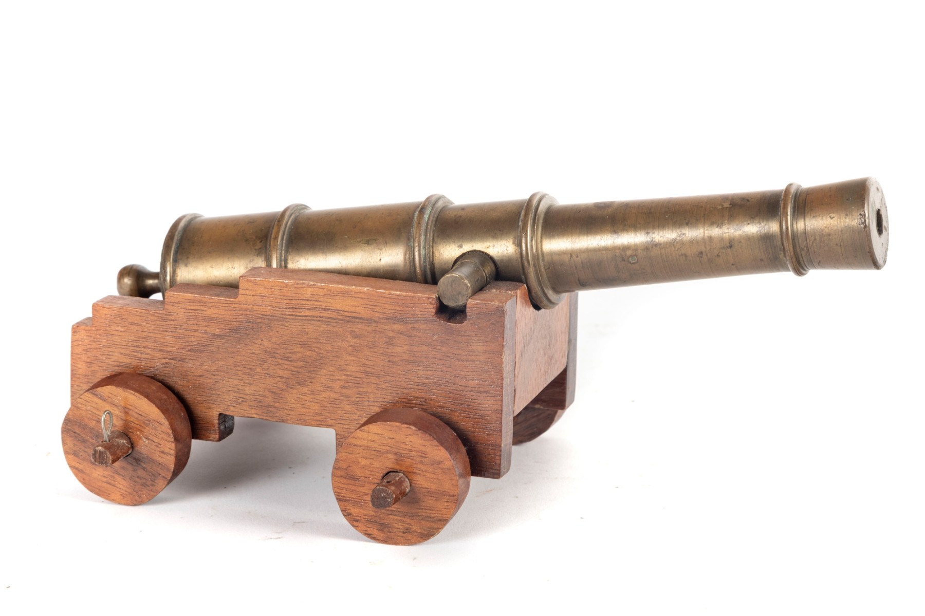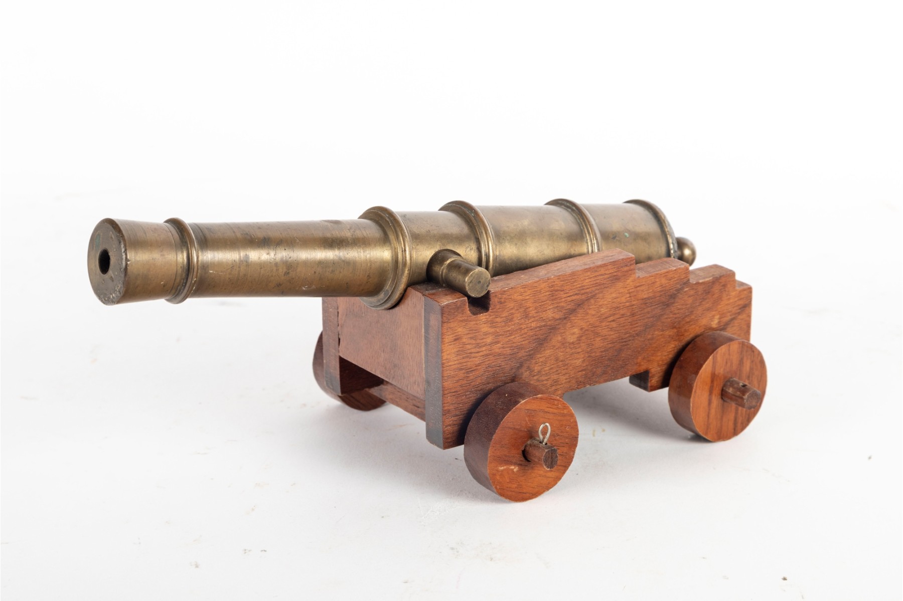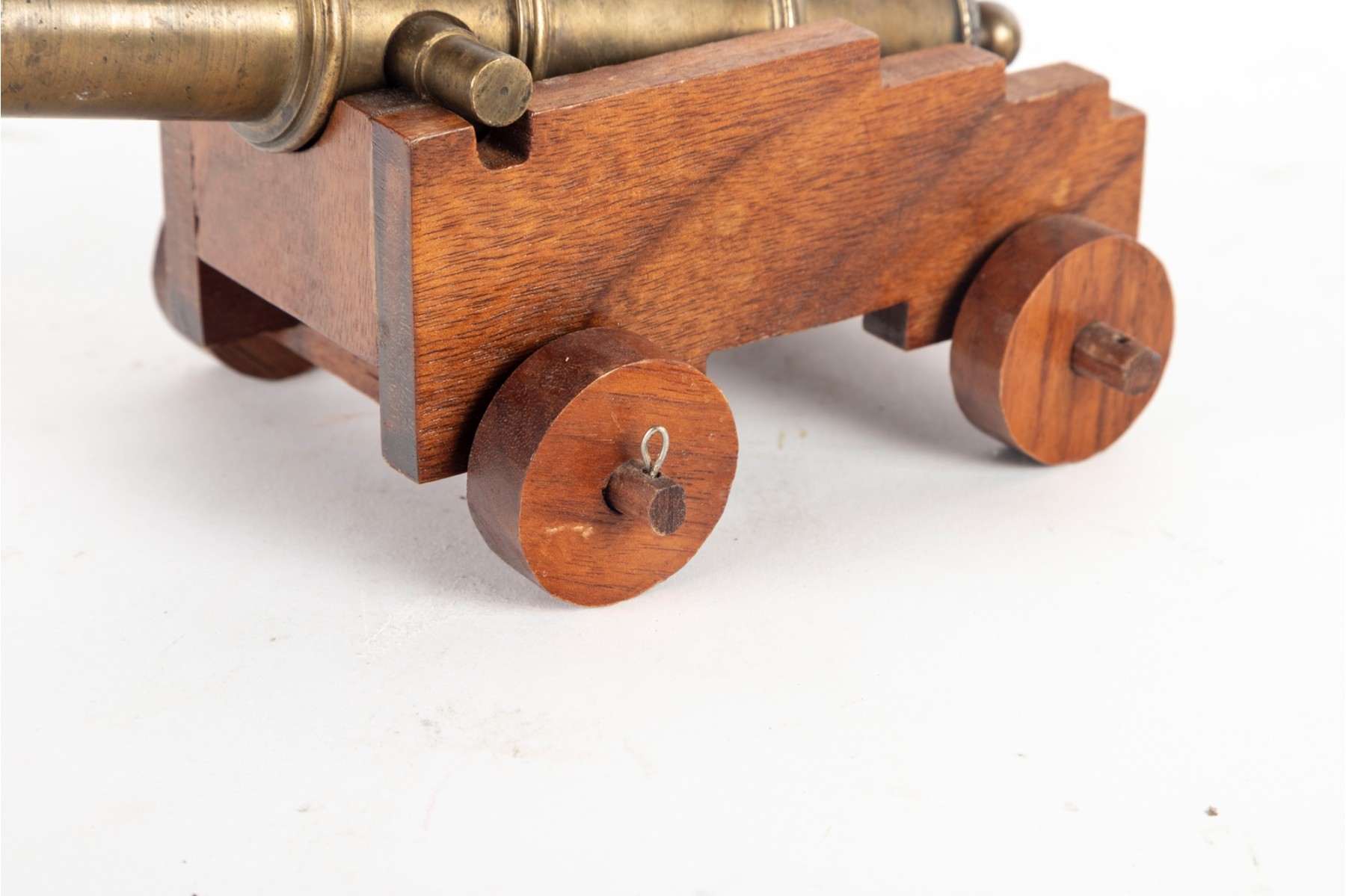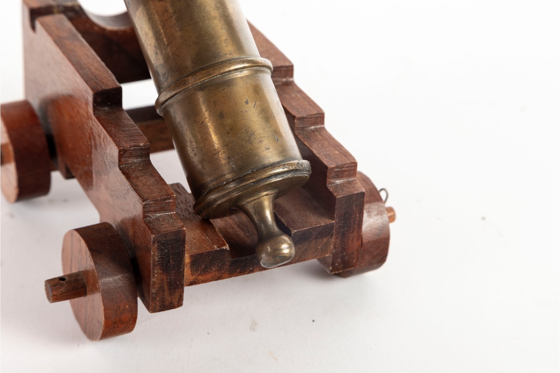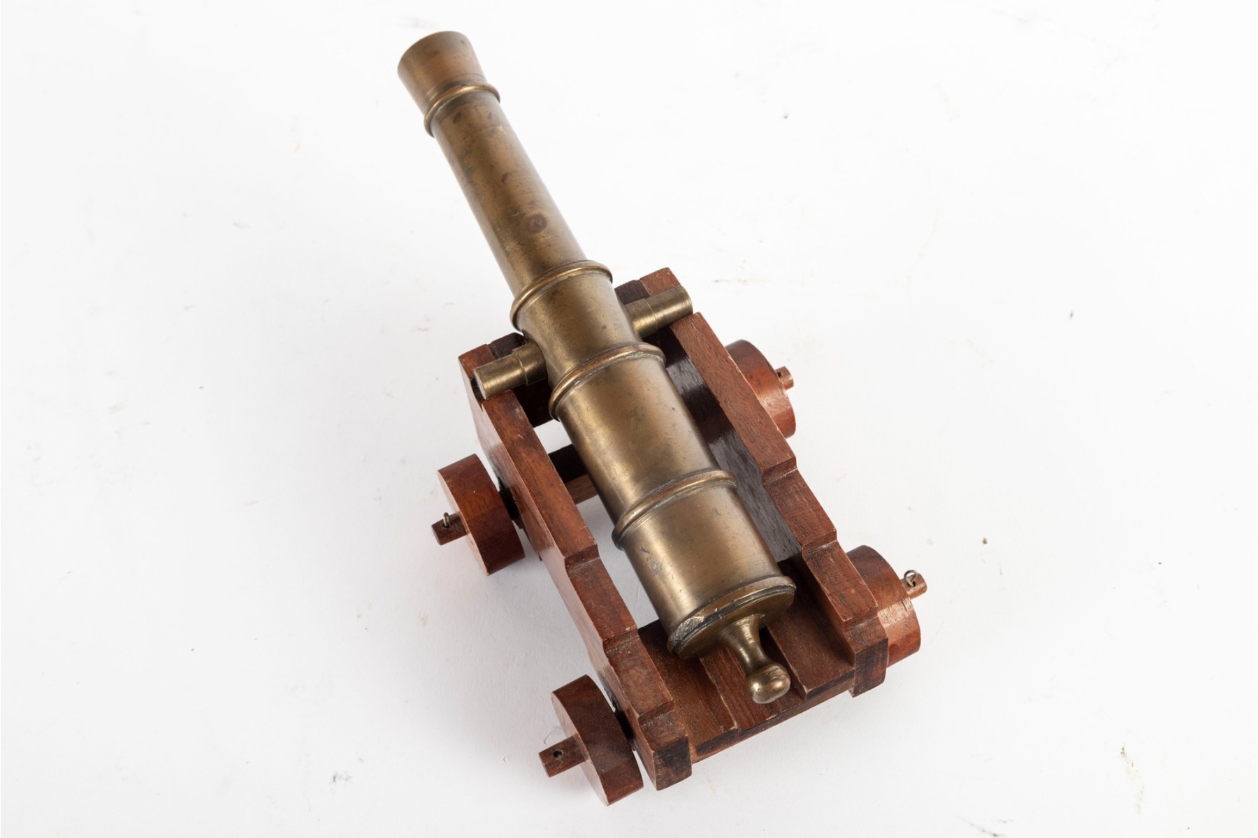 A wonderful vintage brass and wood model of a cannon on wheels.
