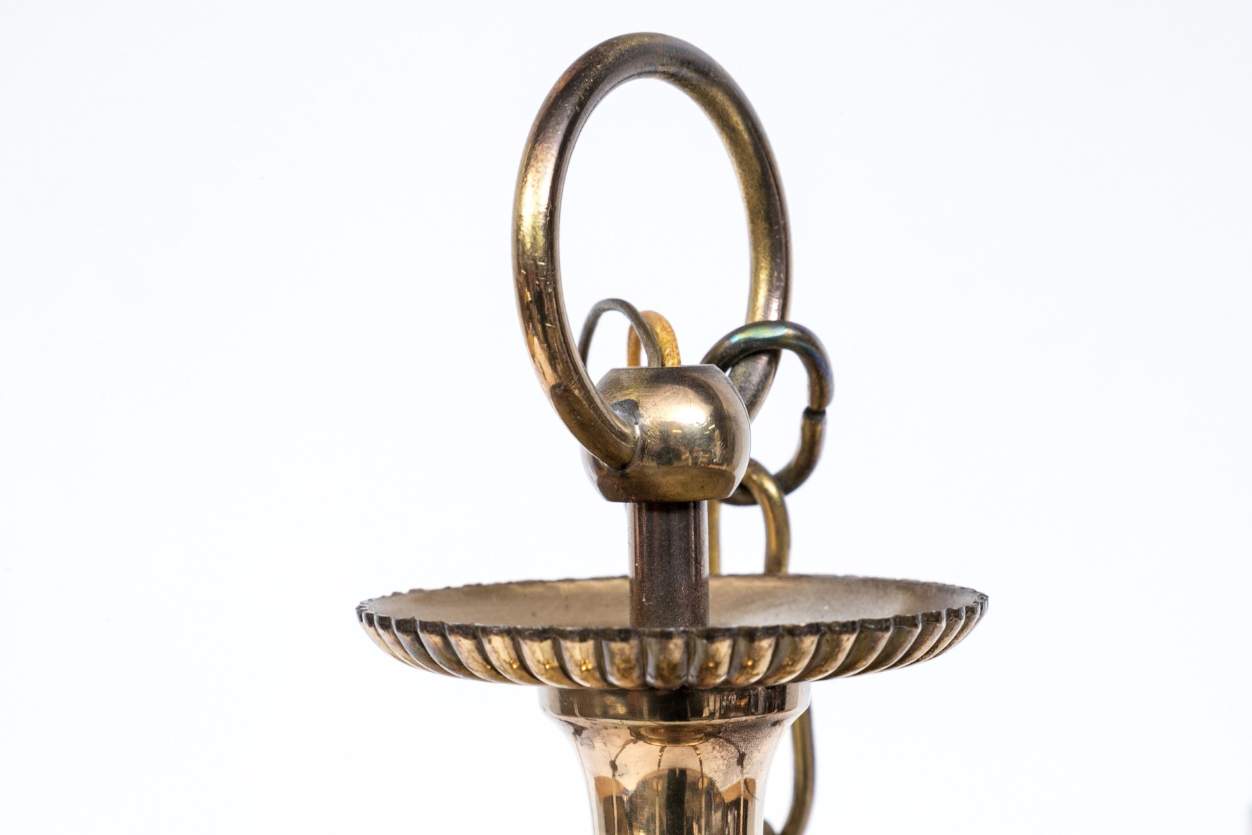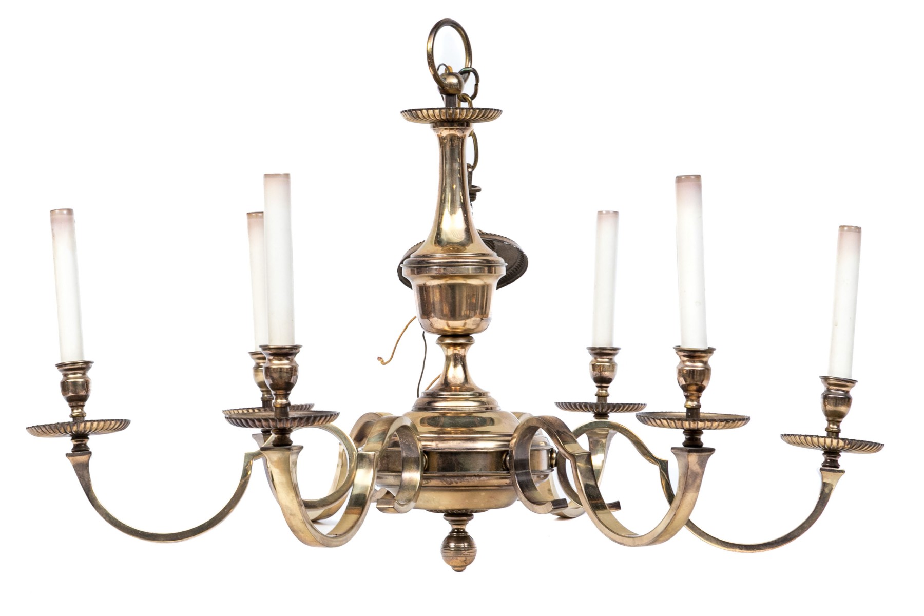 A classic shaped standard with a ring and dish top and ball terminal. The six scrolled lights with ribbed bobeches. With a chain and ceiling plate.