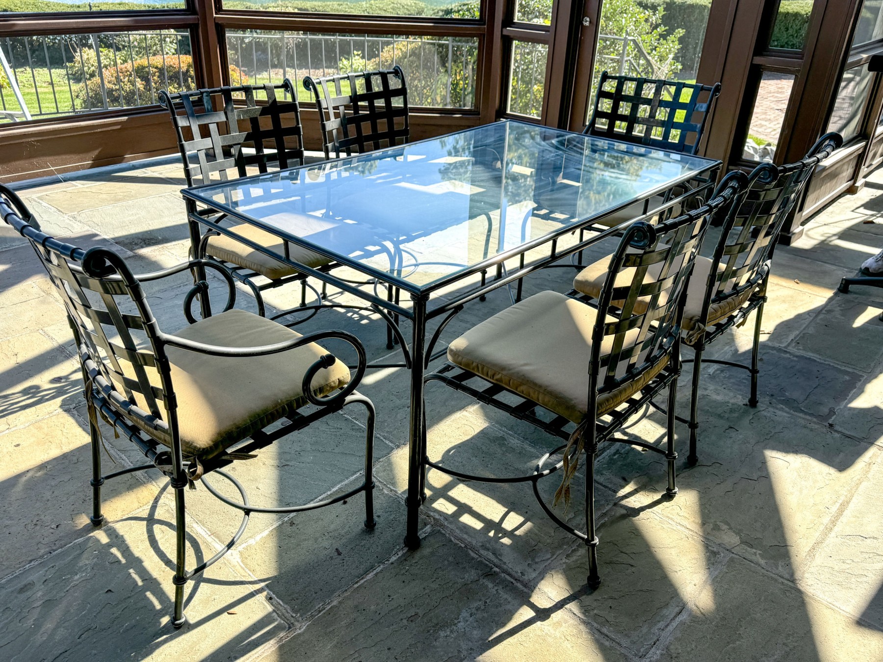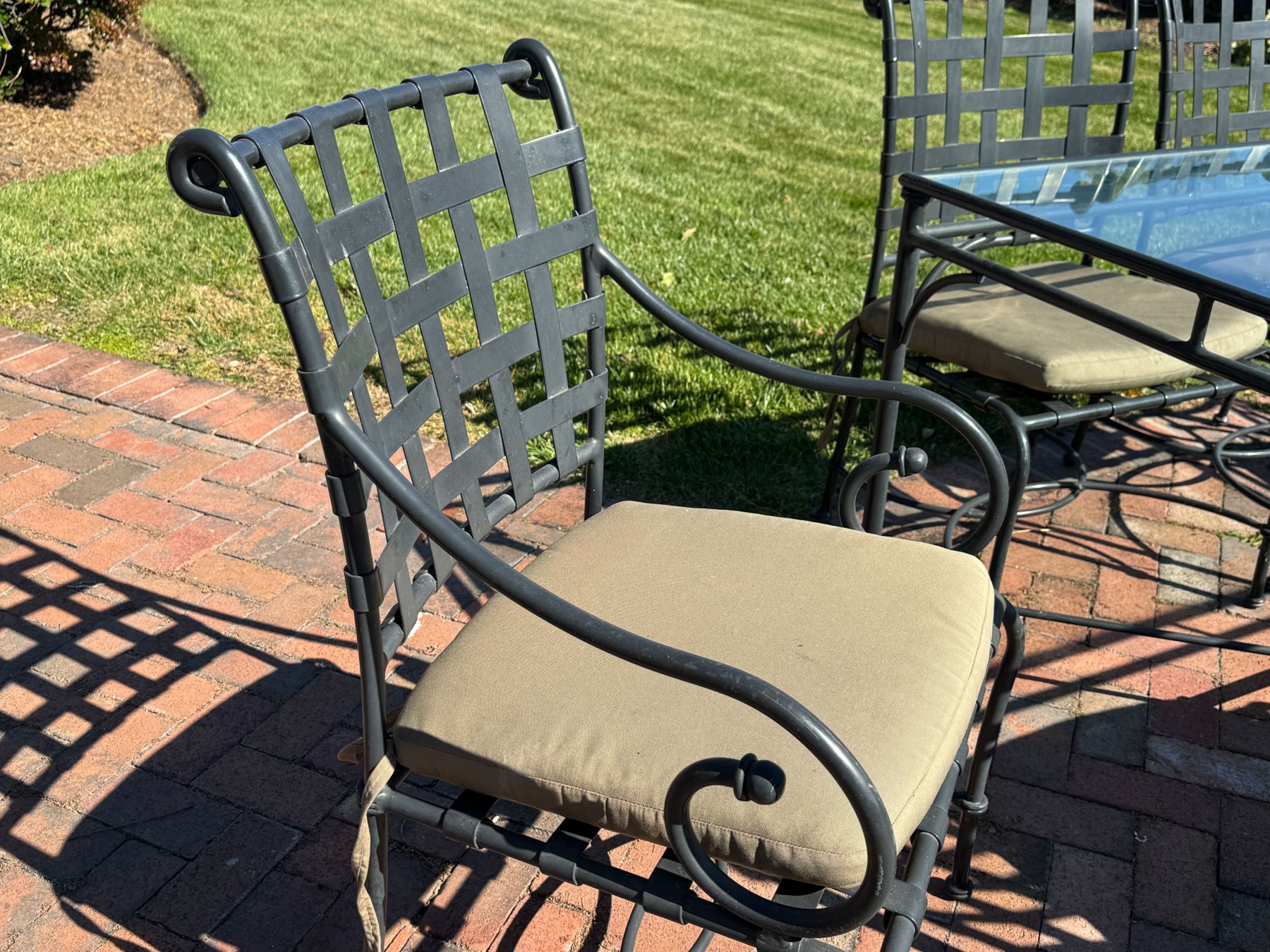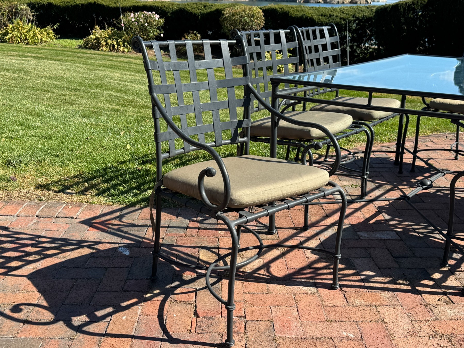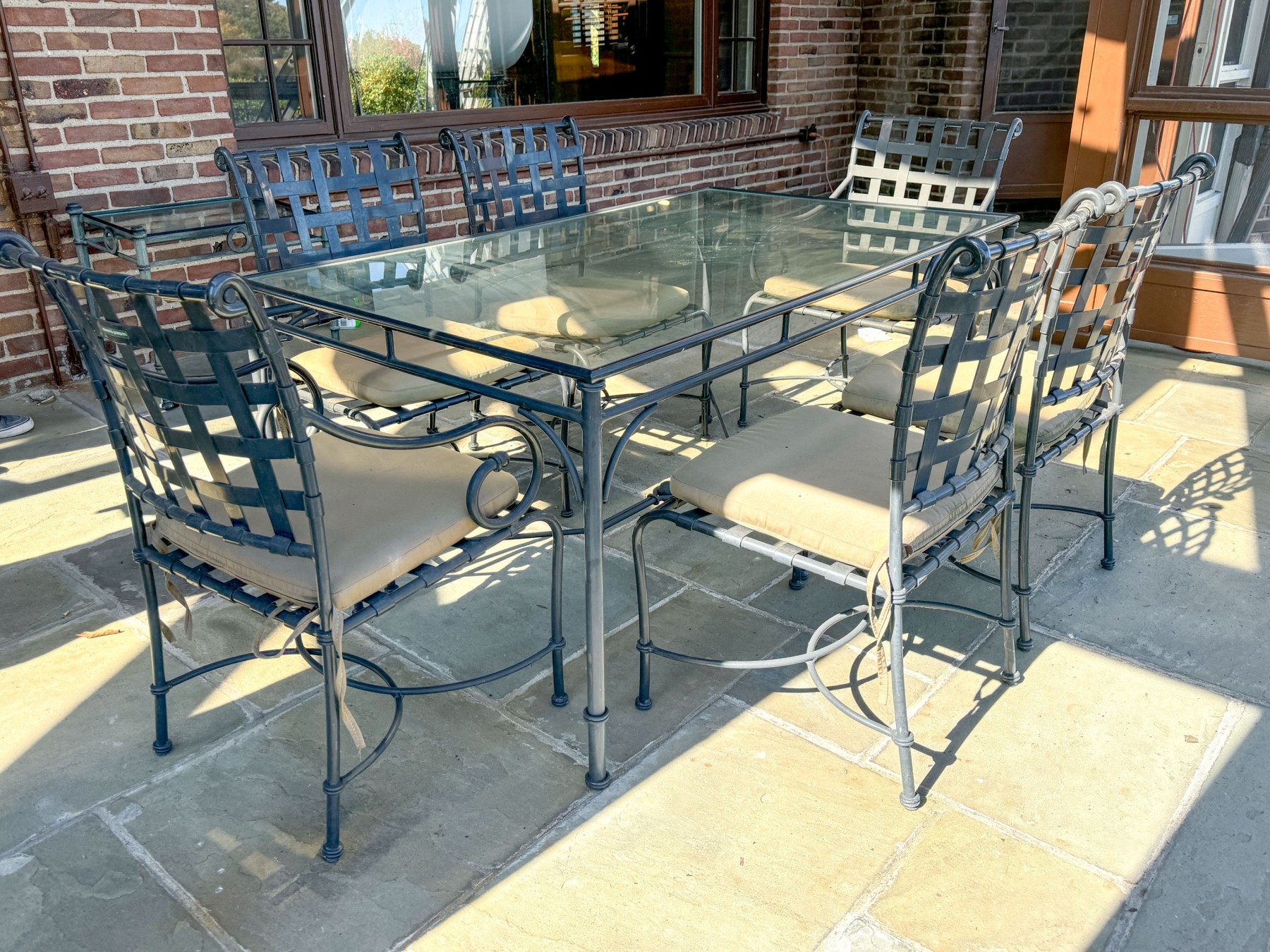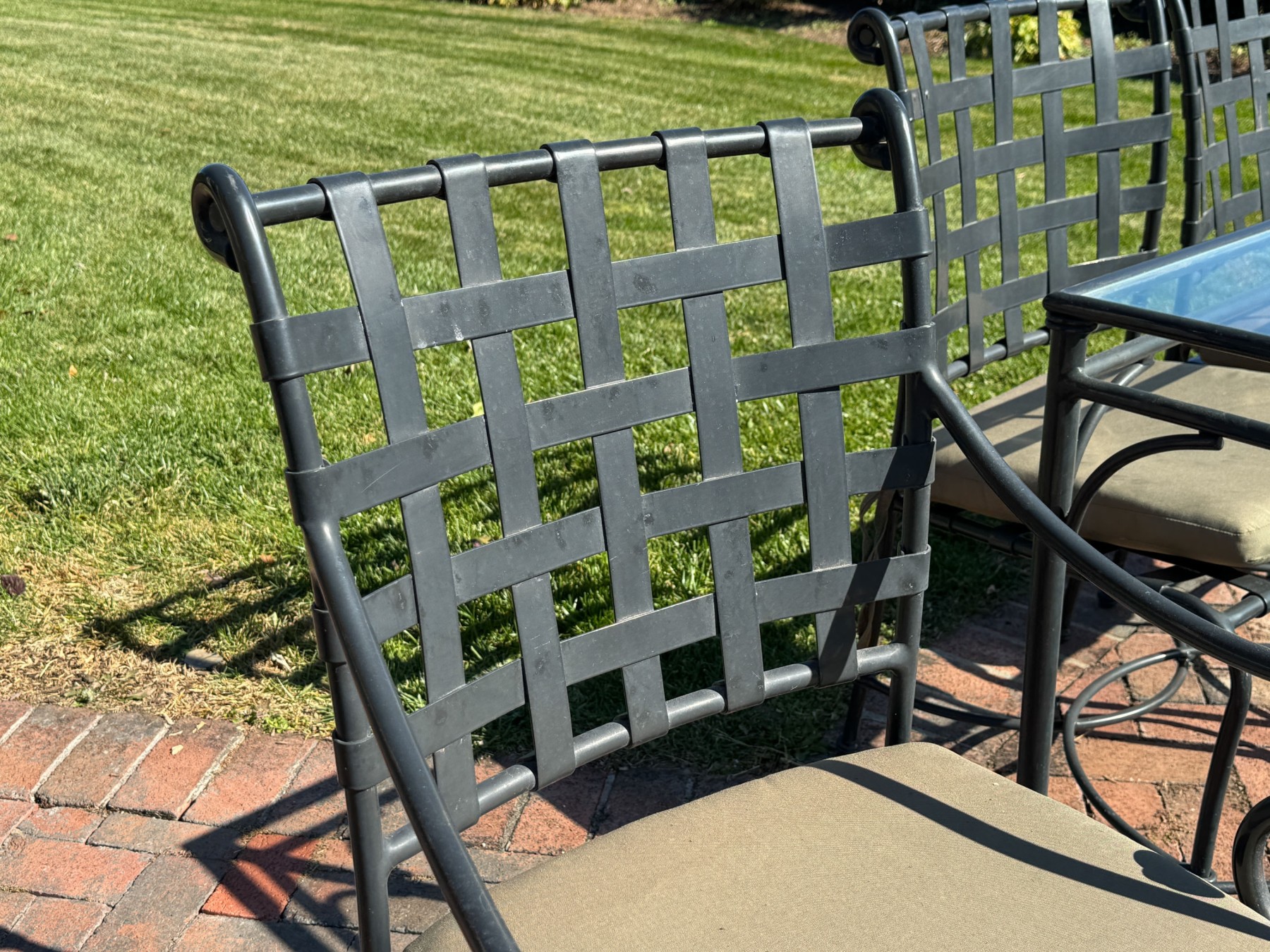 An excellent vintage Brown Jordan "Florentine" outdoor dining set including a table, four side chairs, and two end armchairs in powder coated aluminum.