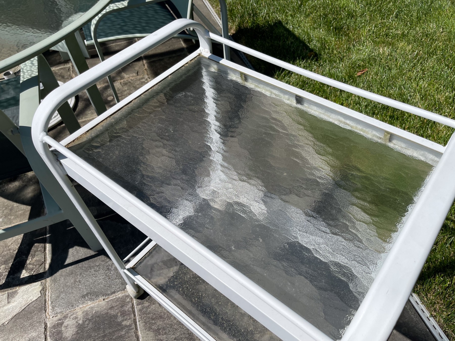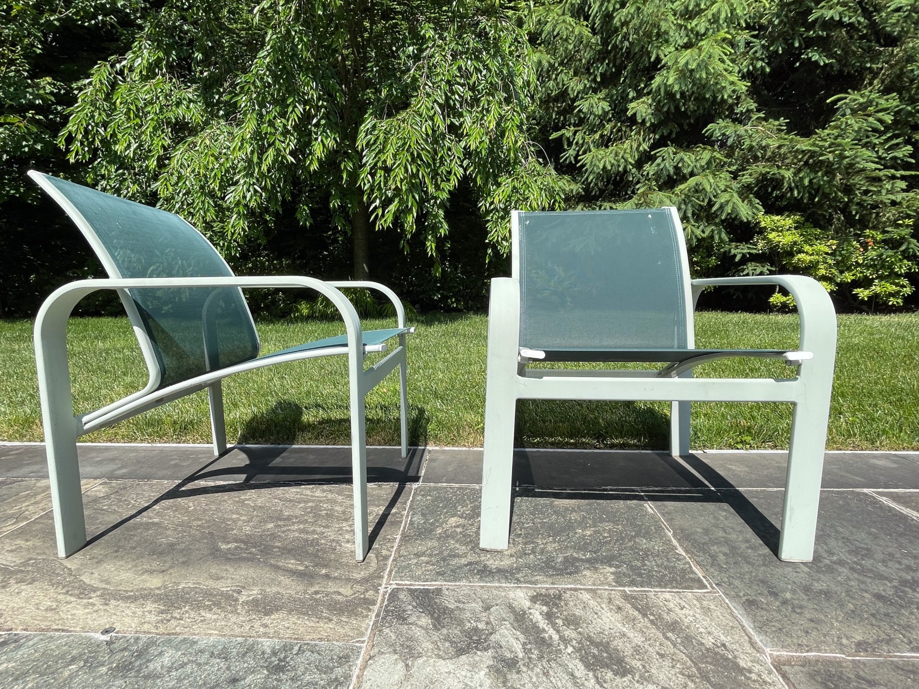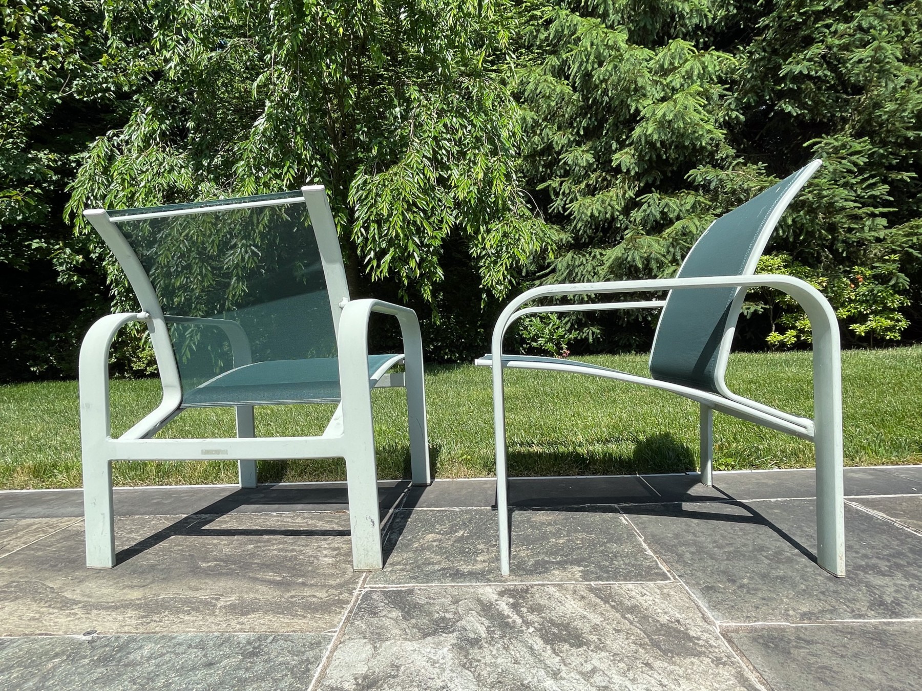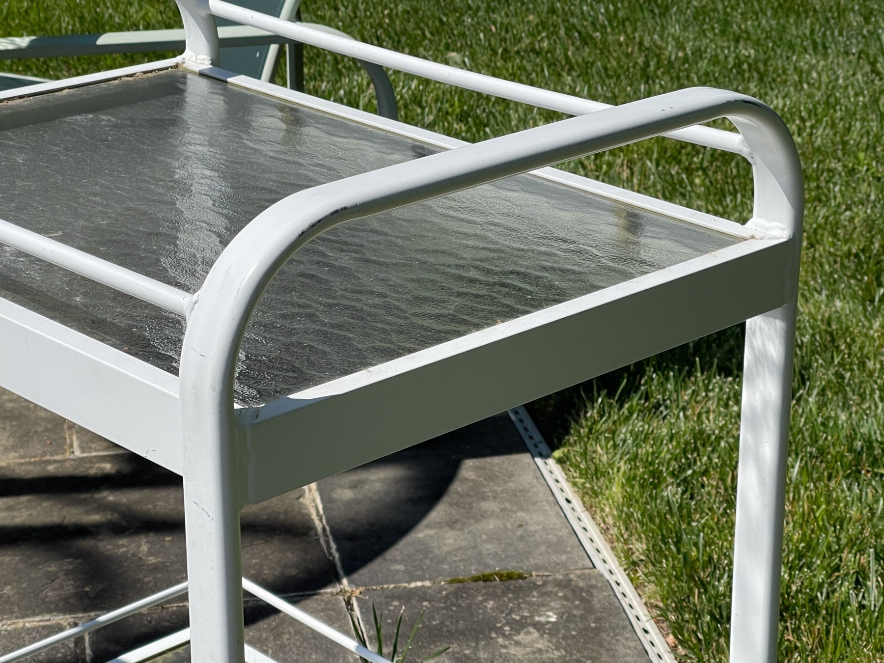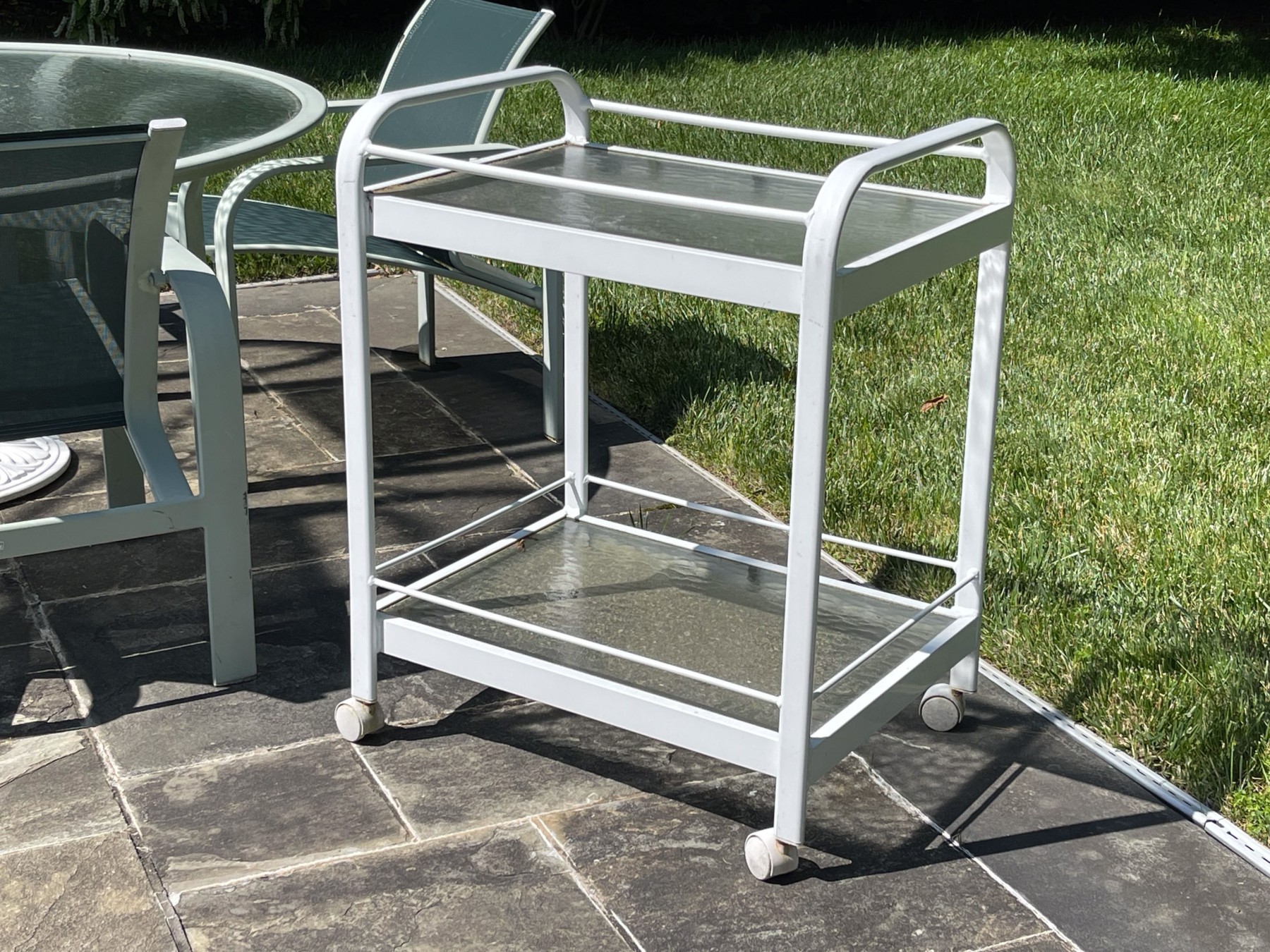 Presents well. All with wear commensurate with age and use. Wear to netting on seats and seat backs and paint loss to umbrella stand and bar cart. Please review the pictures as they are a part of the condition report.