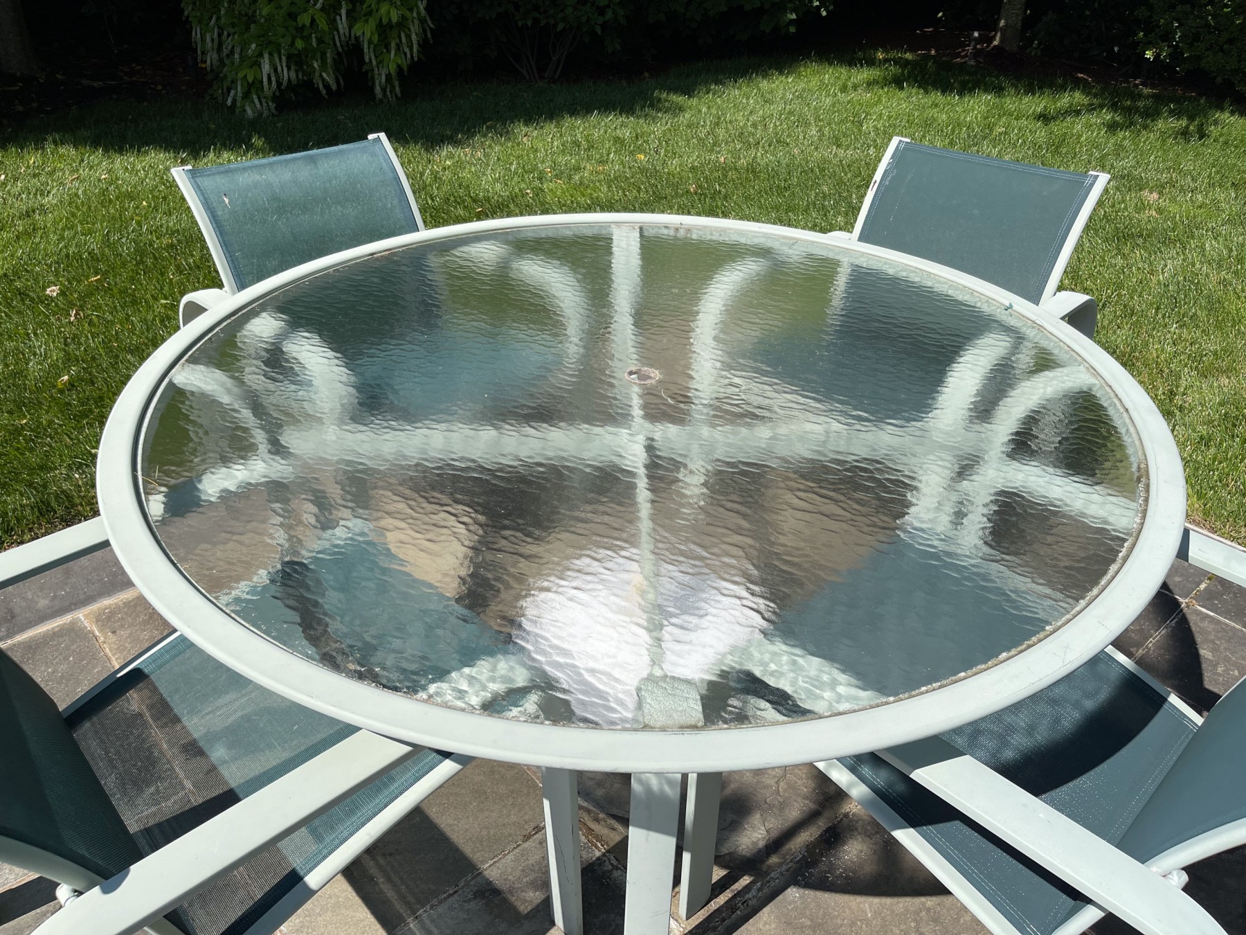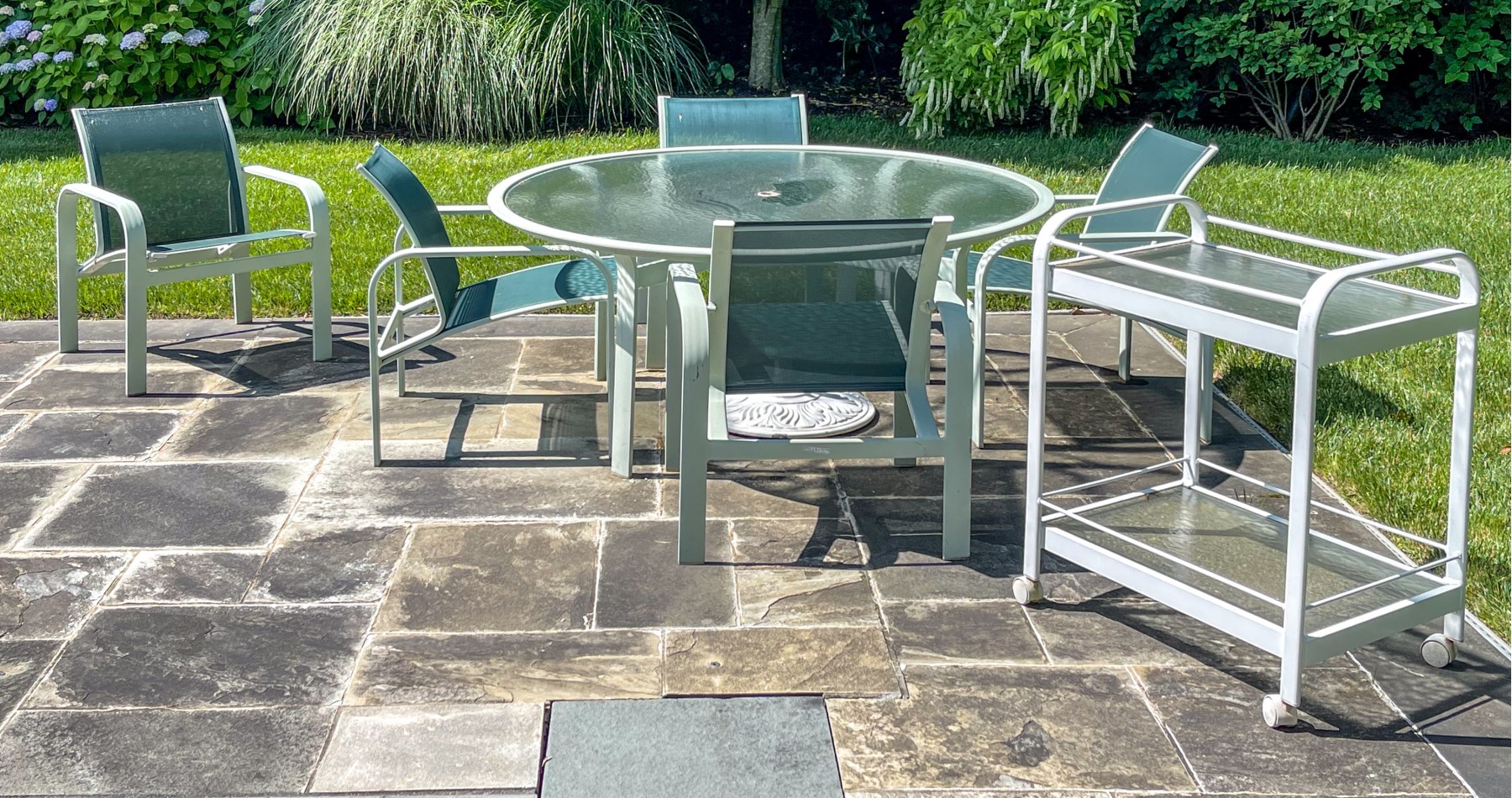 A fabulous vintage Brown Jordan outdoor dining set. Includes a circular glass-top table, five armchairs, an umbrella stand, and a barcart.