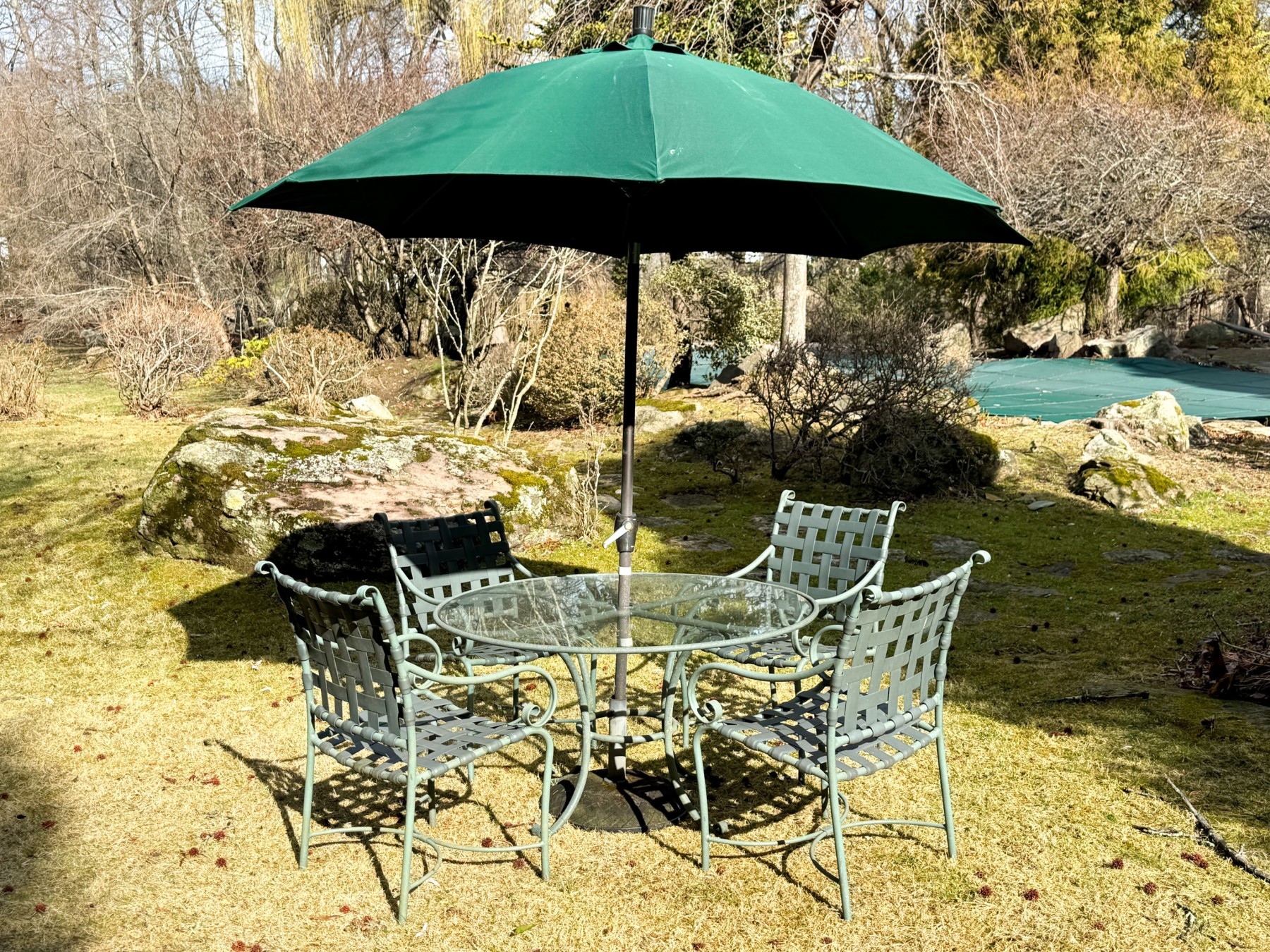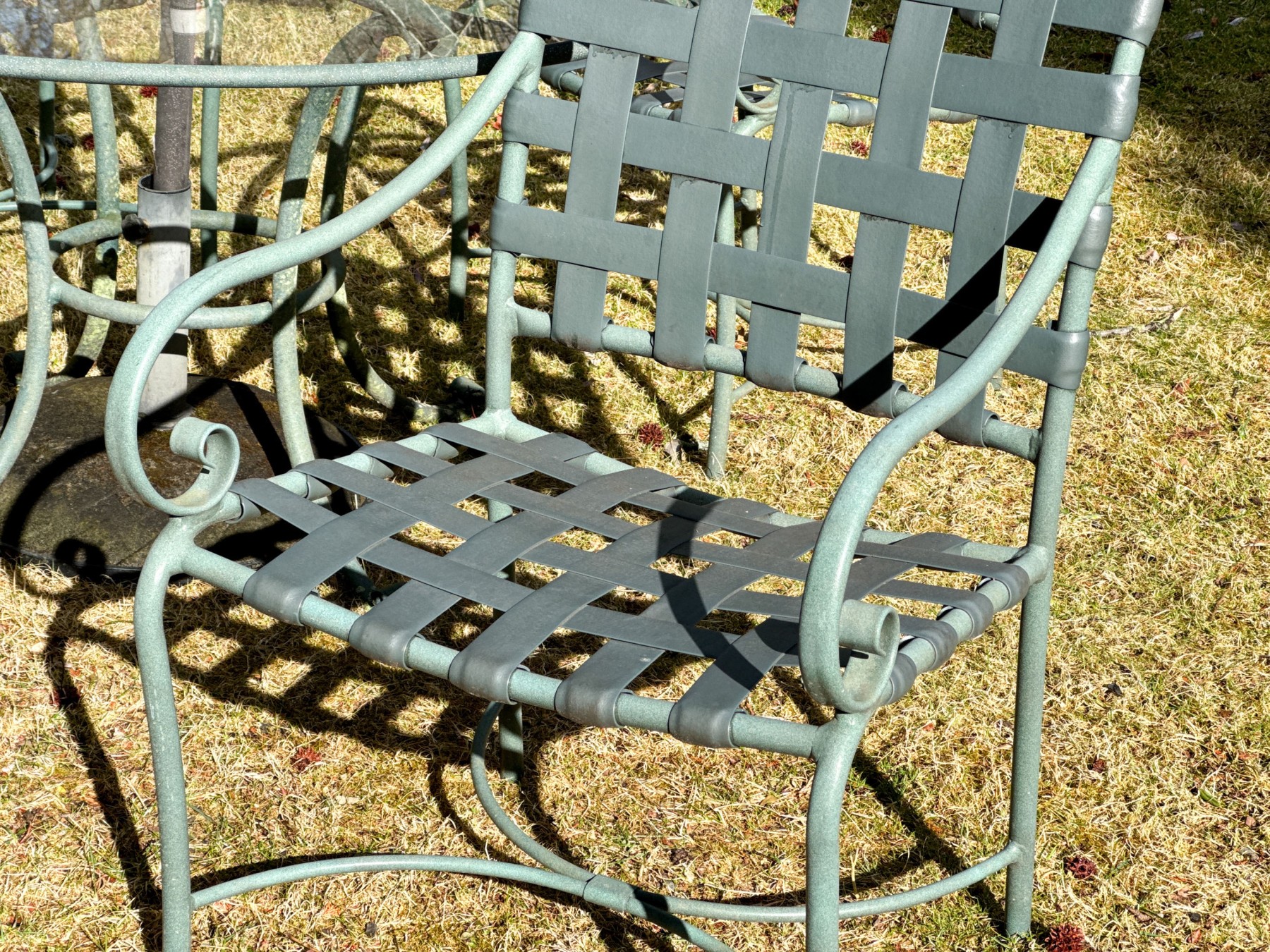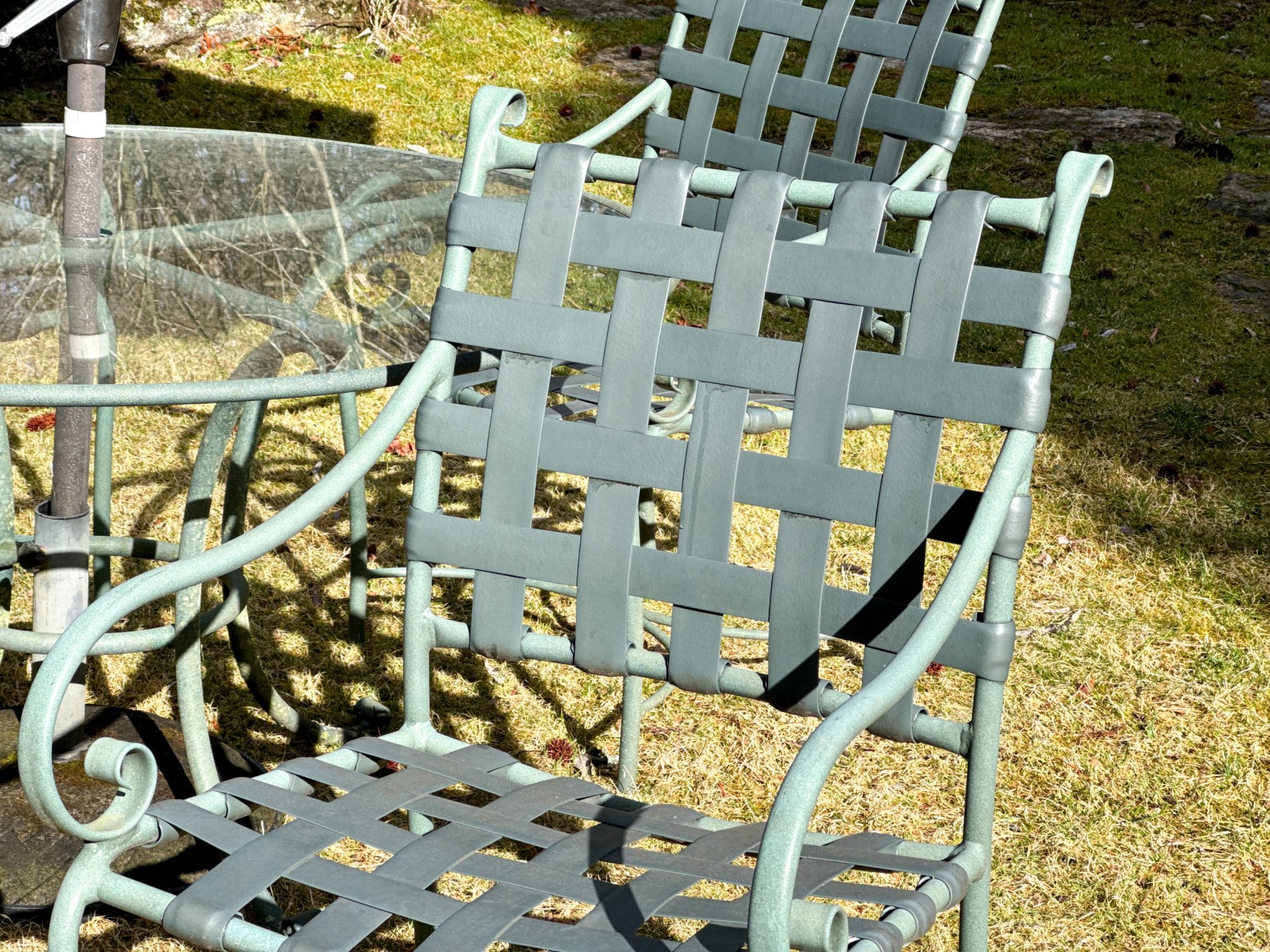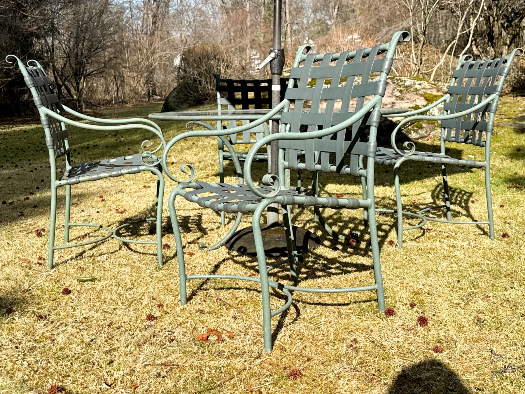 Includes four armchairs with strapped seats and seat backs, a glass top pedestal table and large umbrella with its base. Does not bear the makers mark.