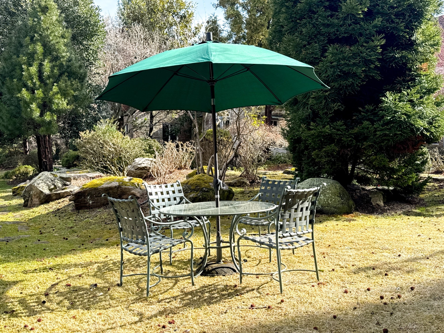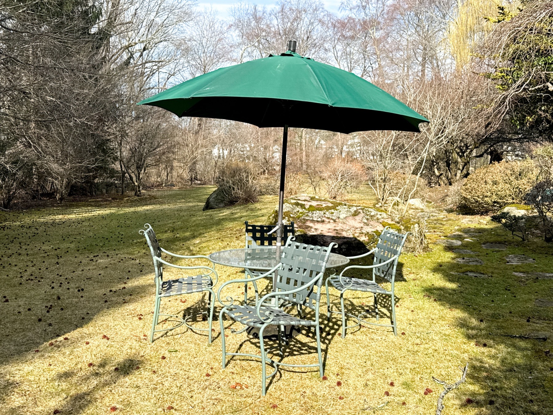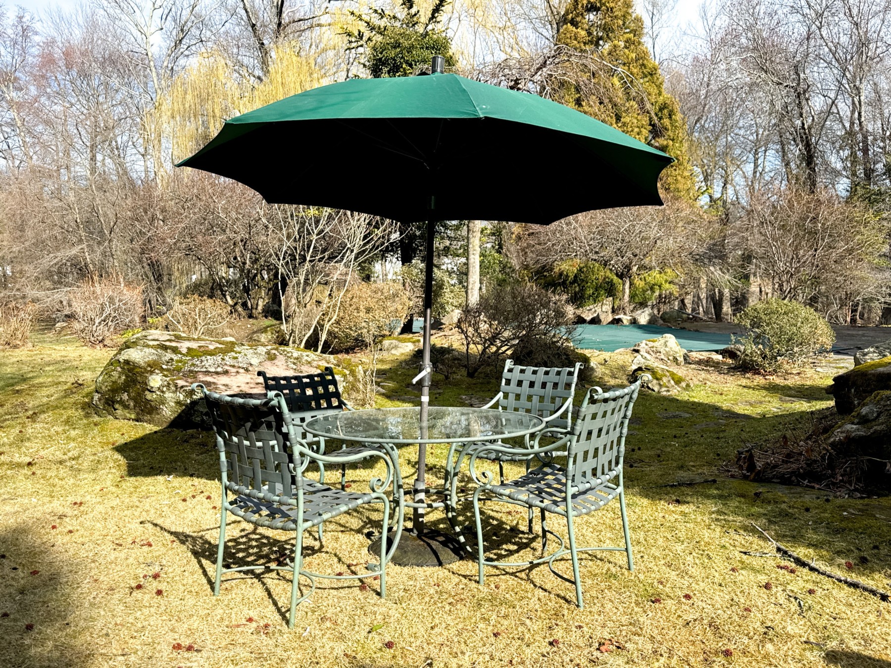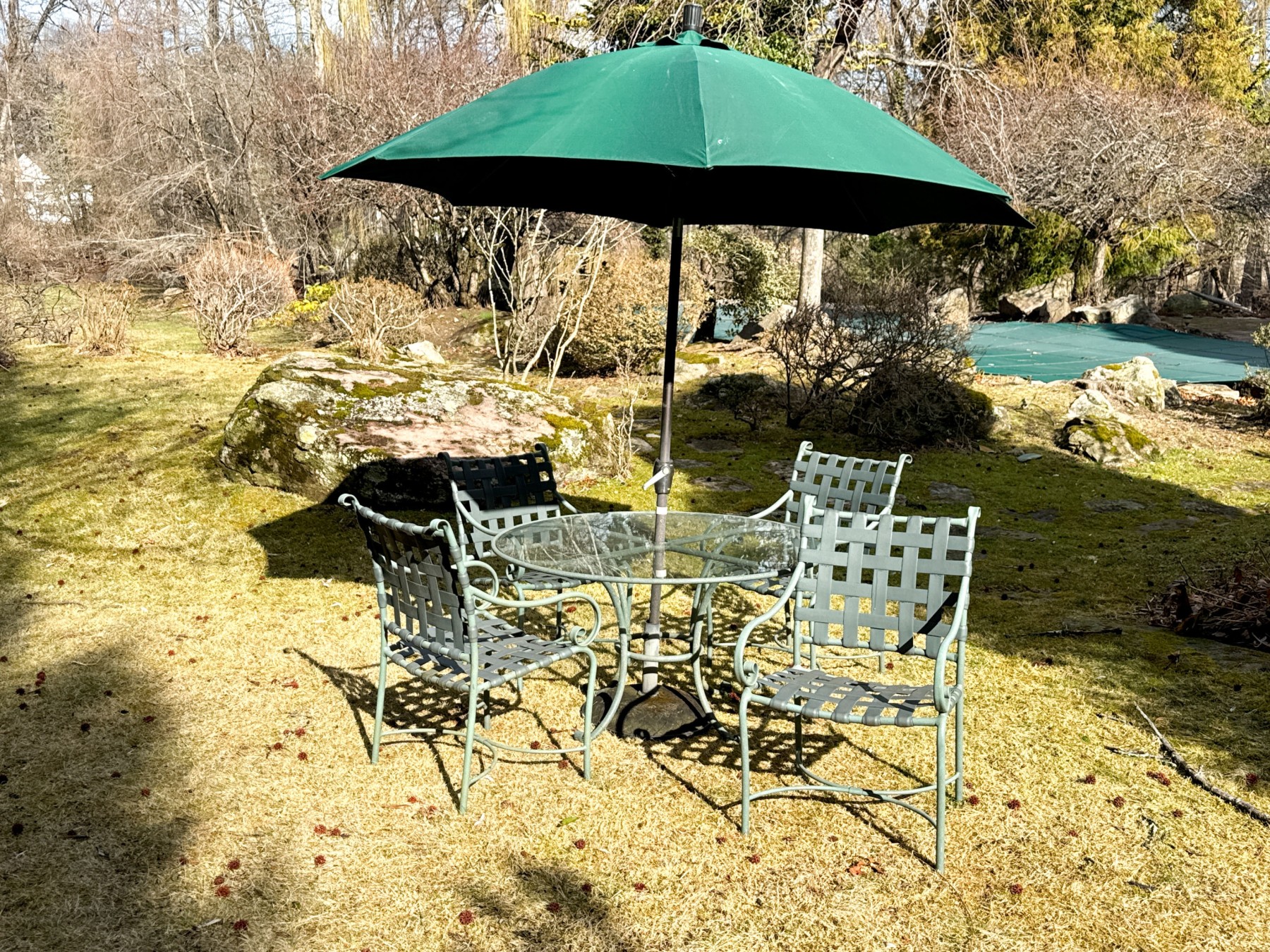 Includes four armchairs with strapped seats and seat backs, a glass top pedestal table and large umbrella with its base. Does not bear the makers mark.