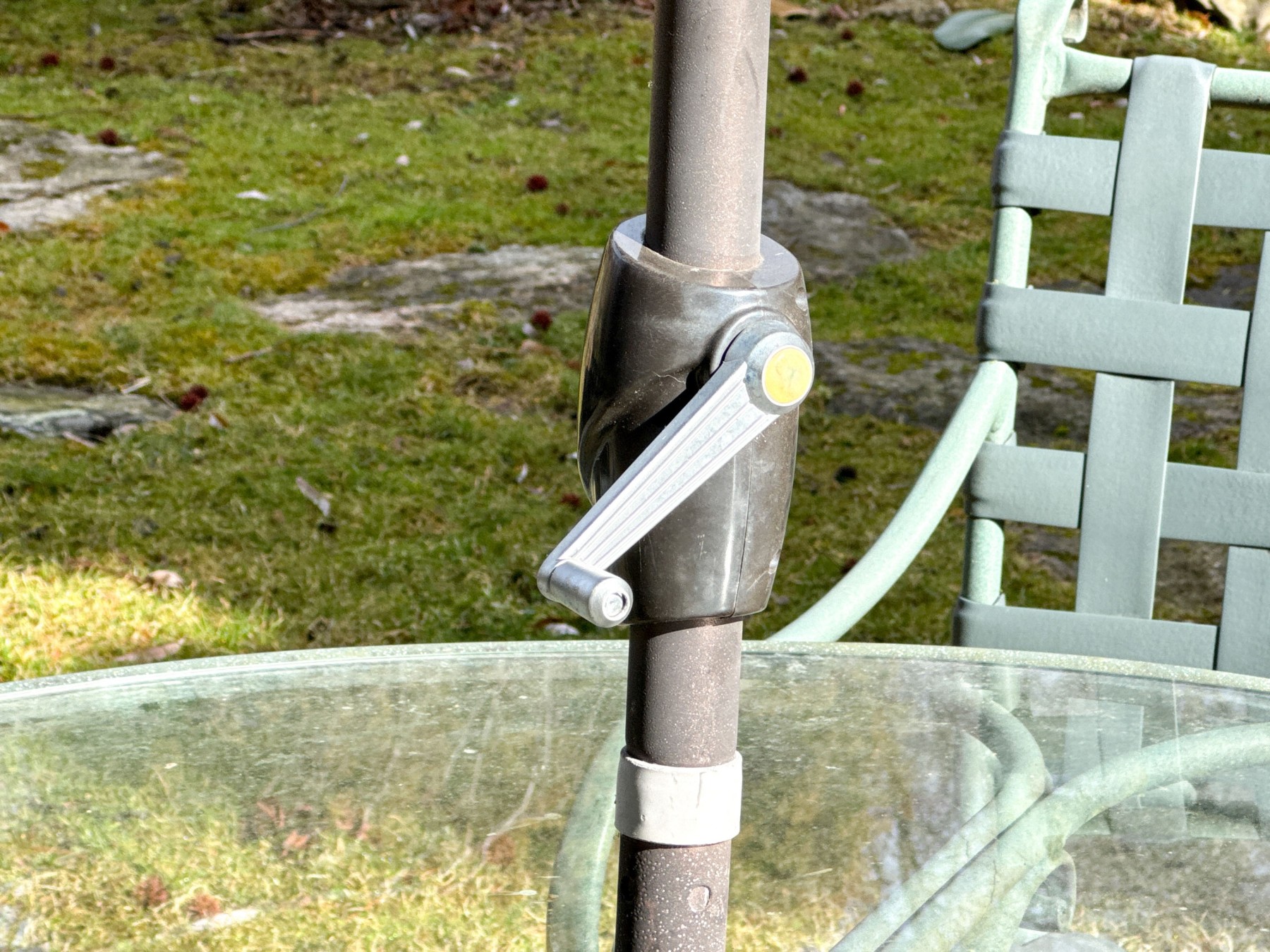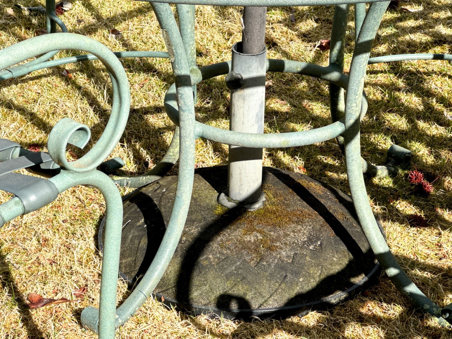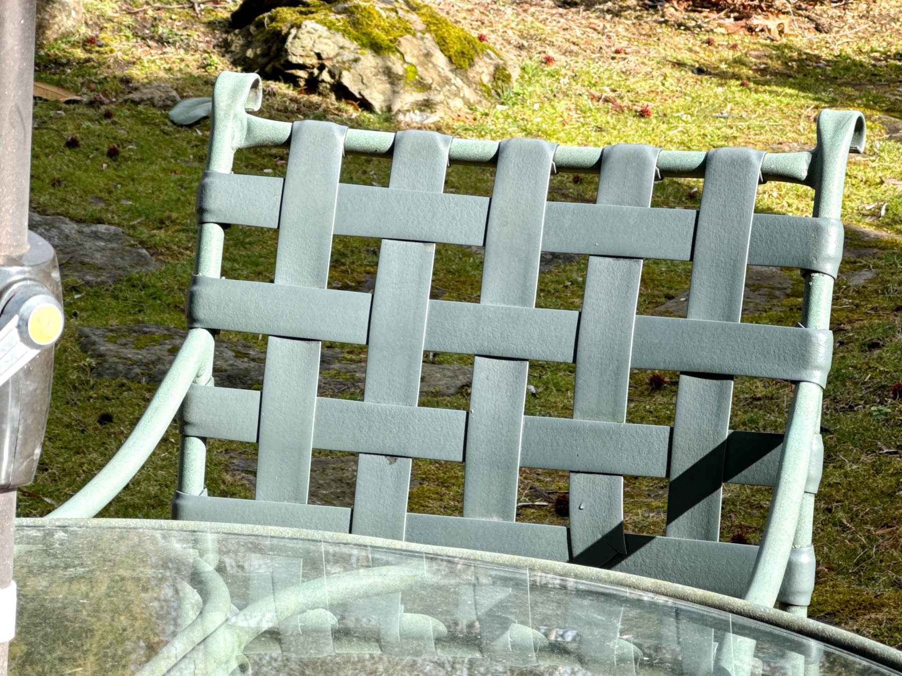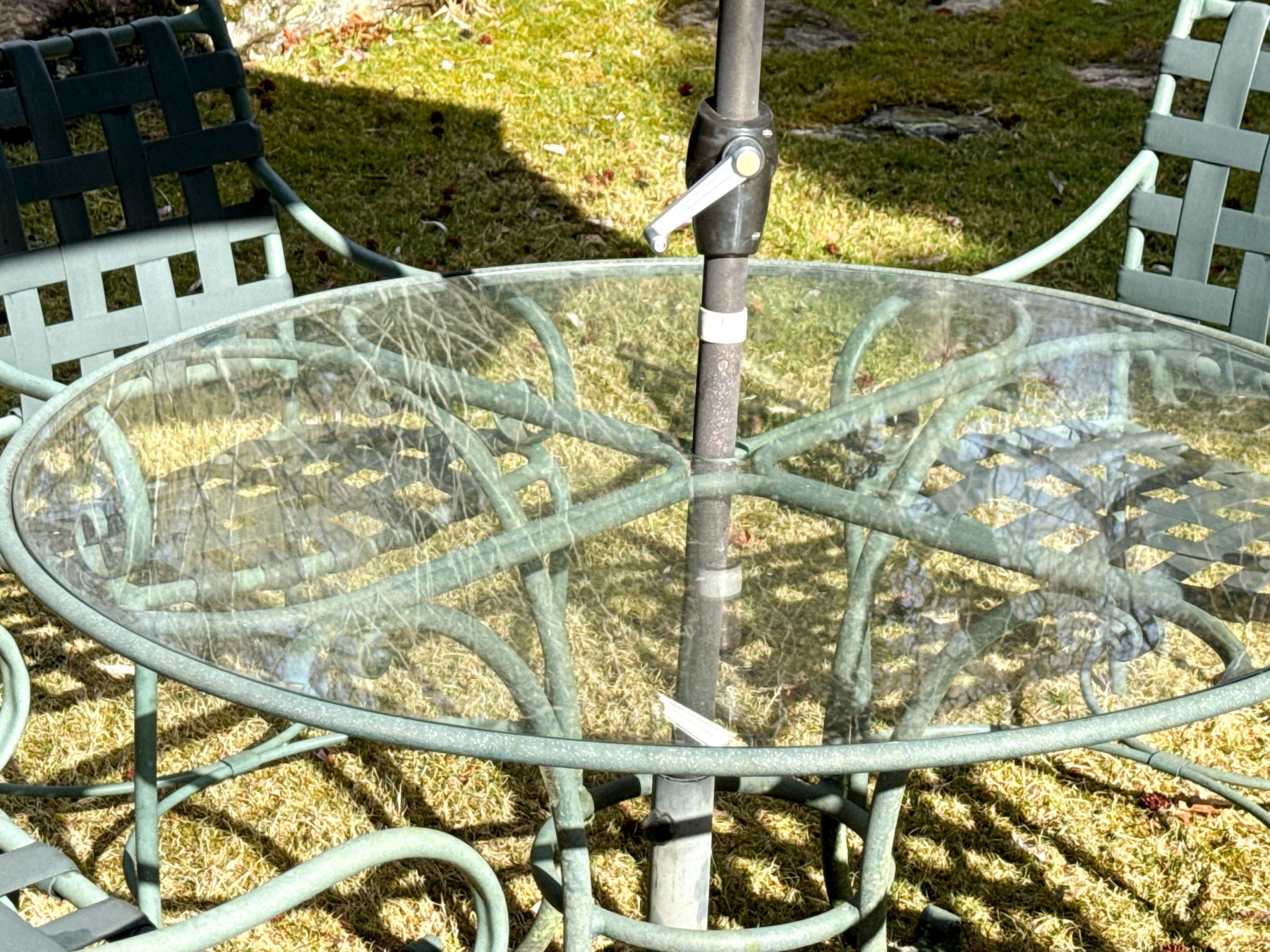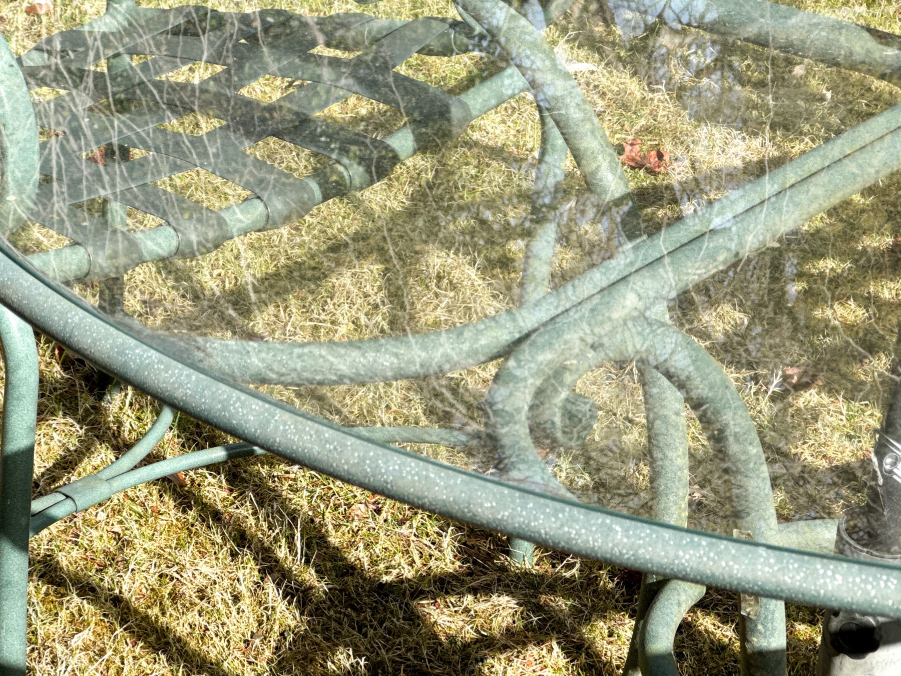 Wear commensurate with age and use and storage in the outdoors. Oxidation and wear to the green finish. Gentle wear to the glass top.