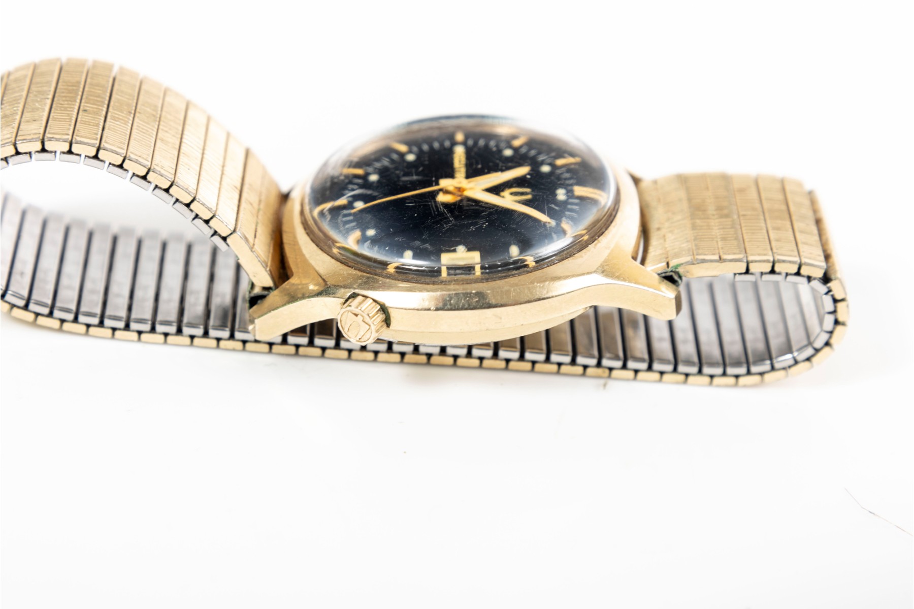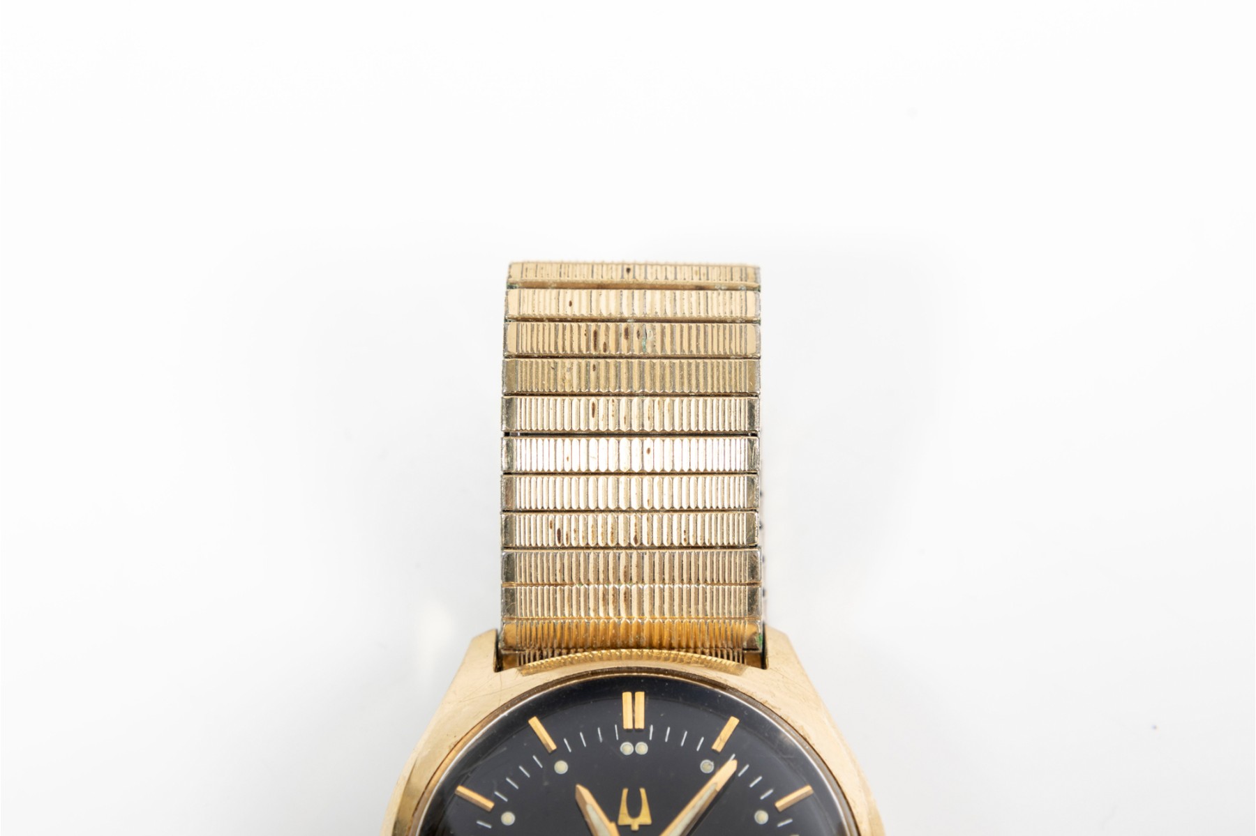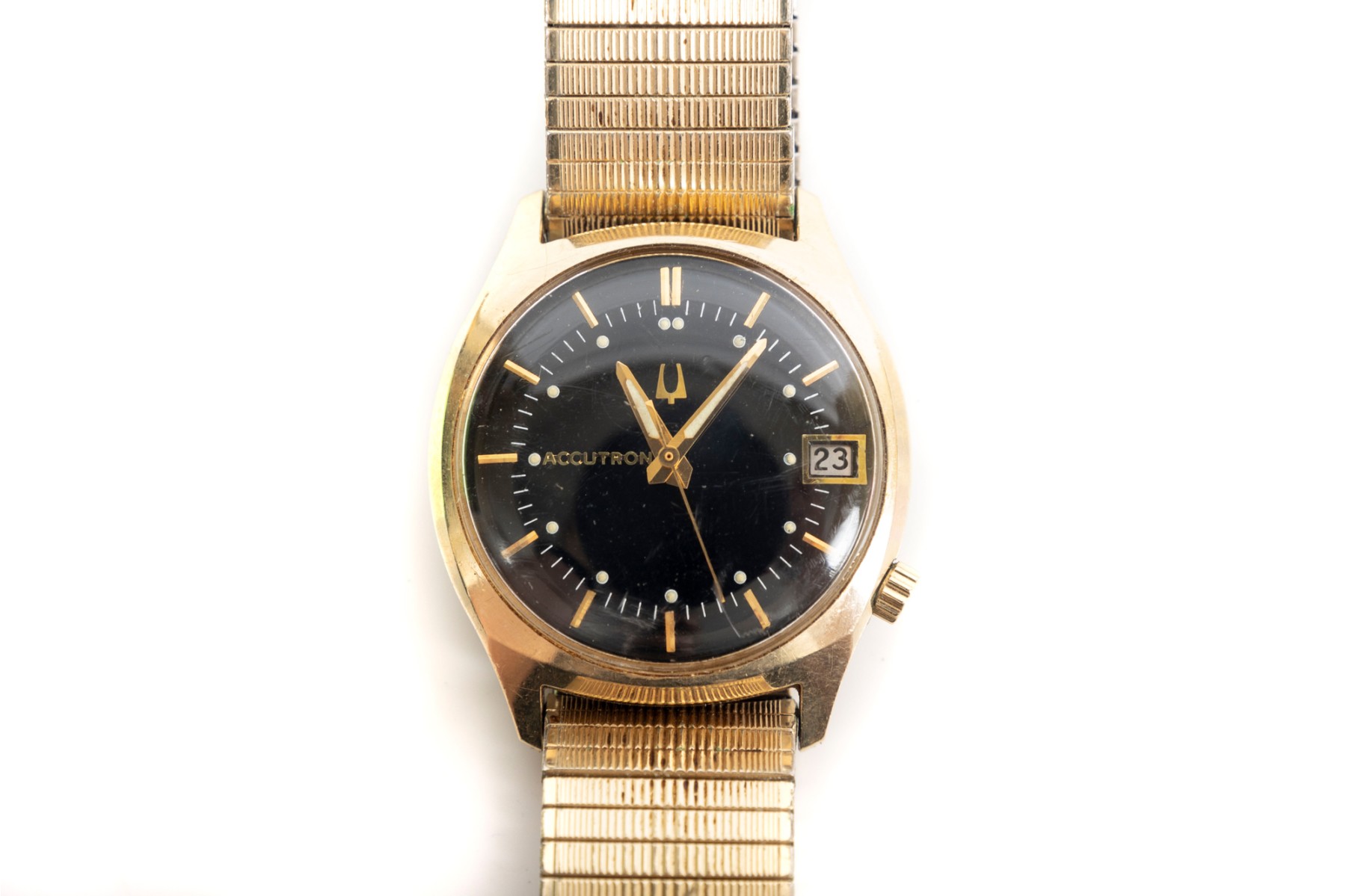 Vintage Bulova Accutron 14KT Gold Filled Case watch. Rare, 1967 with black dial and original wristband.