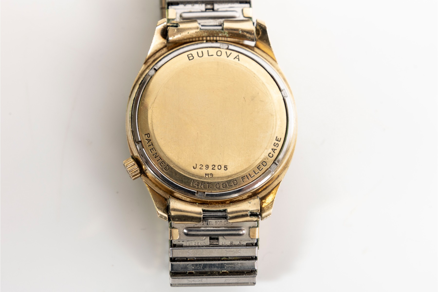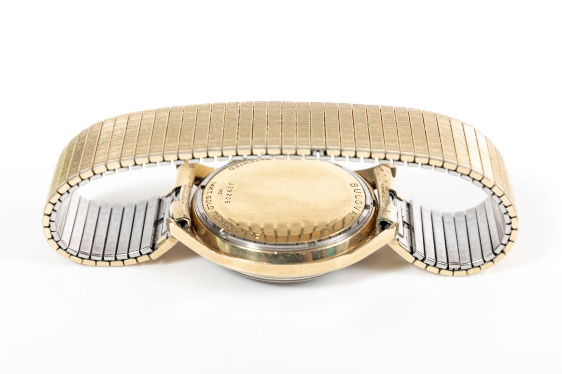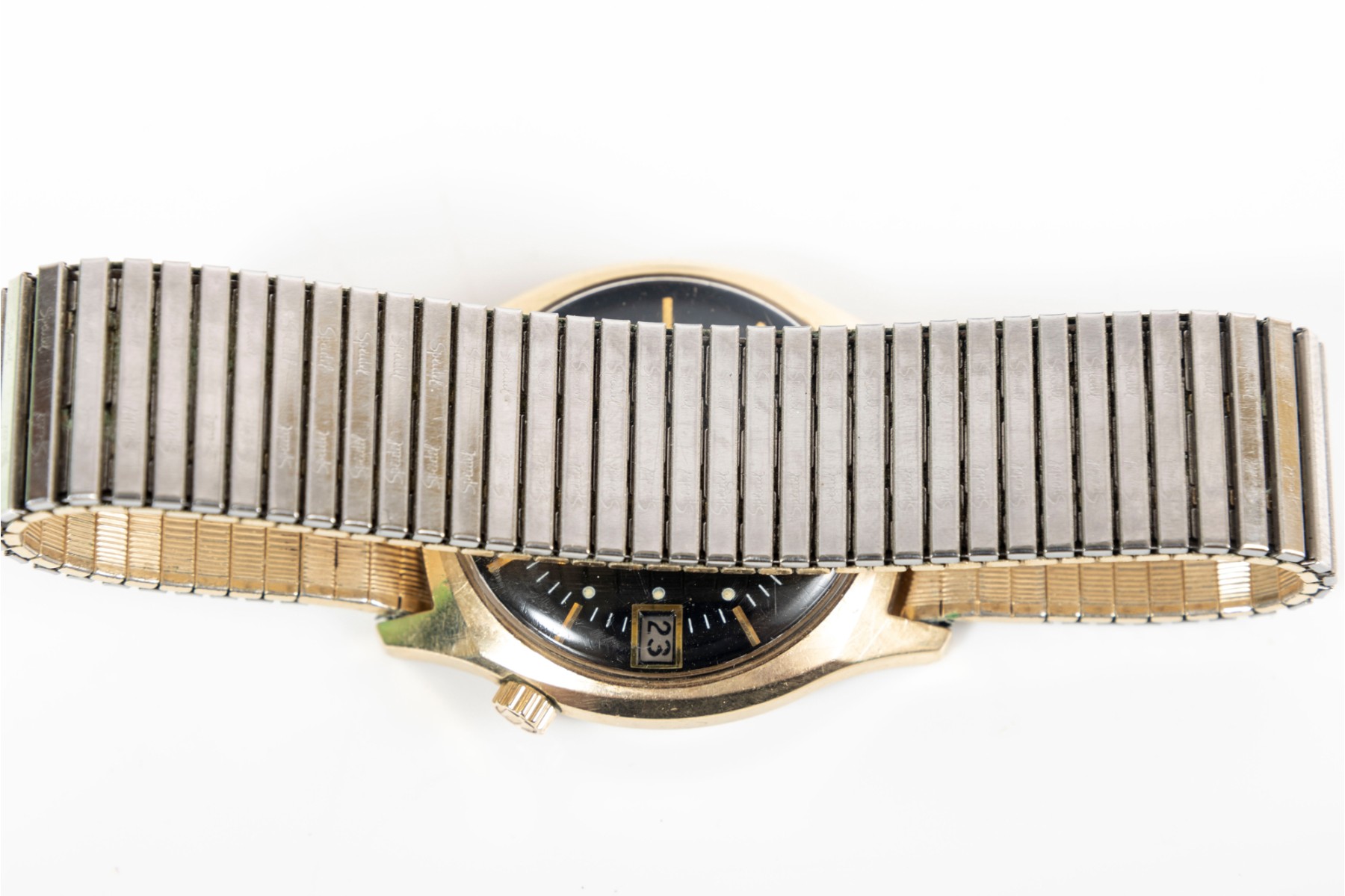 Vintage Bulova Accutron 14KT Gold Filled Case watch. Rare, 1967 with black dial and original wristband.