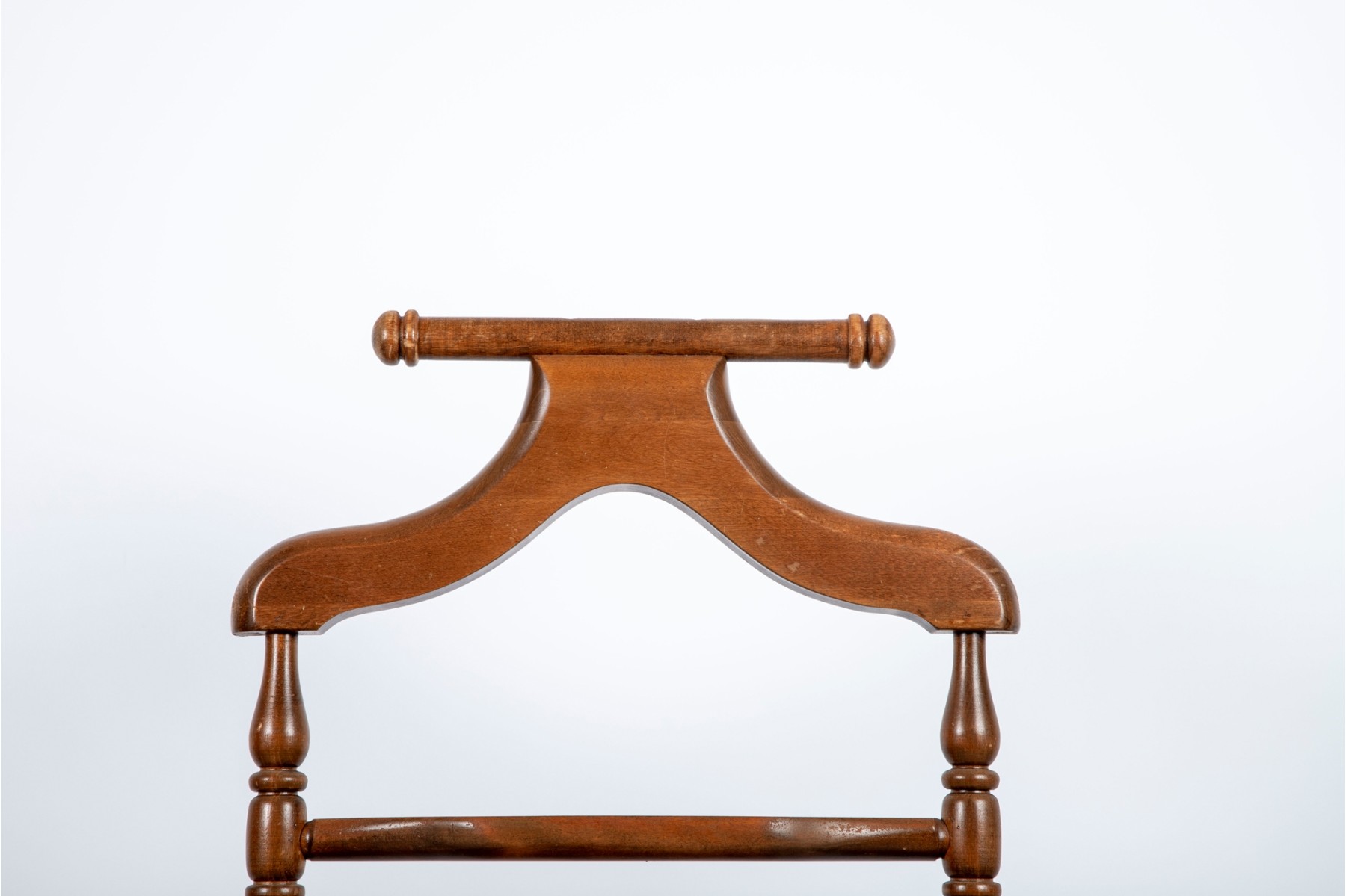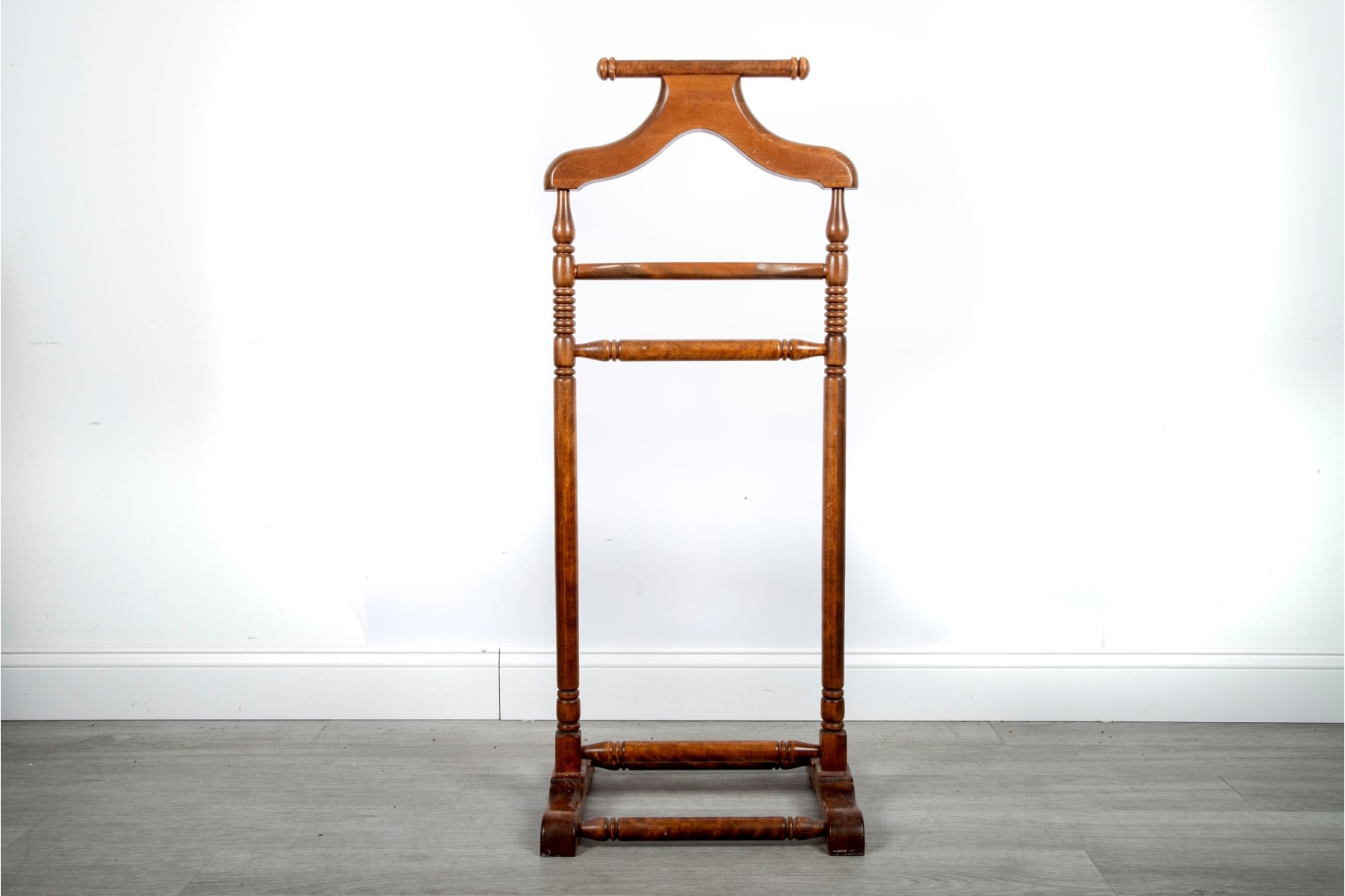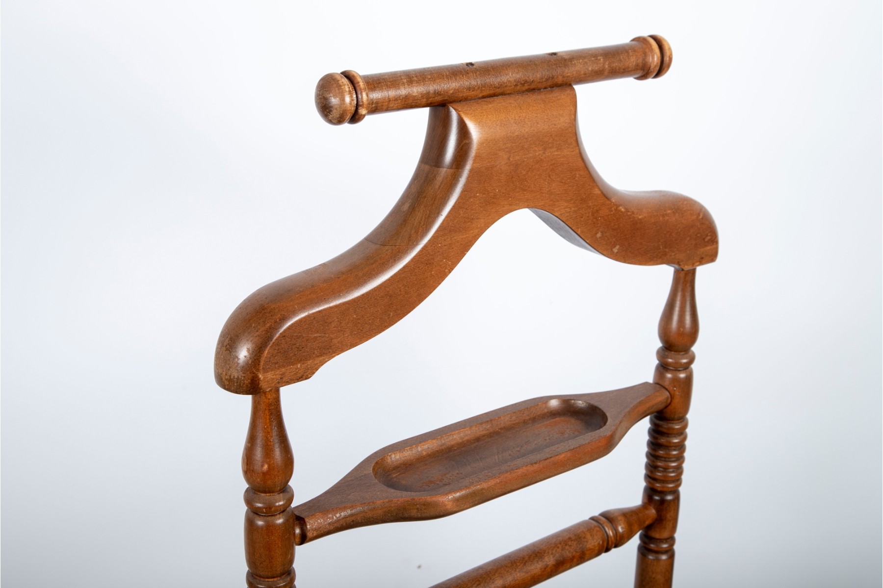 A classic wooden valet stand featuring a sturdy frame with turned spindle details. Designed to neatly organize clothing, it includes a hanger for jackets, a bar for trousers, and a base for shoes or accessories.