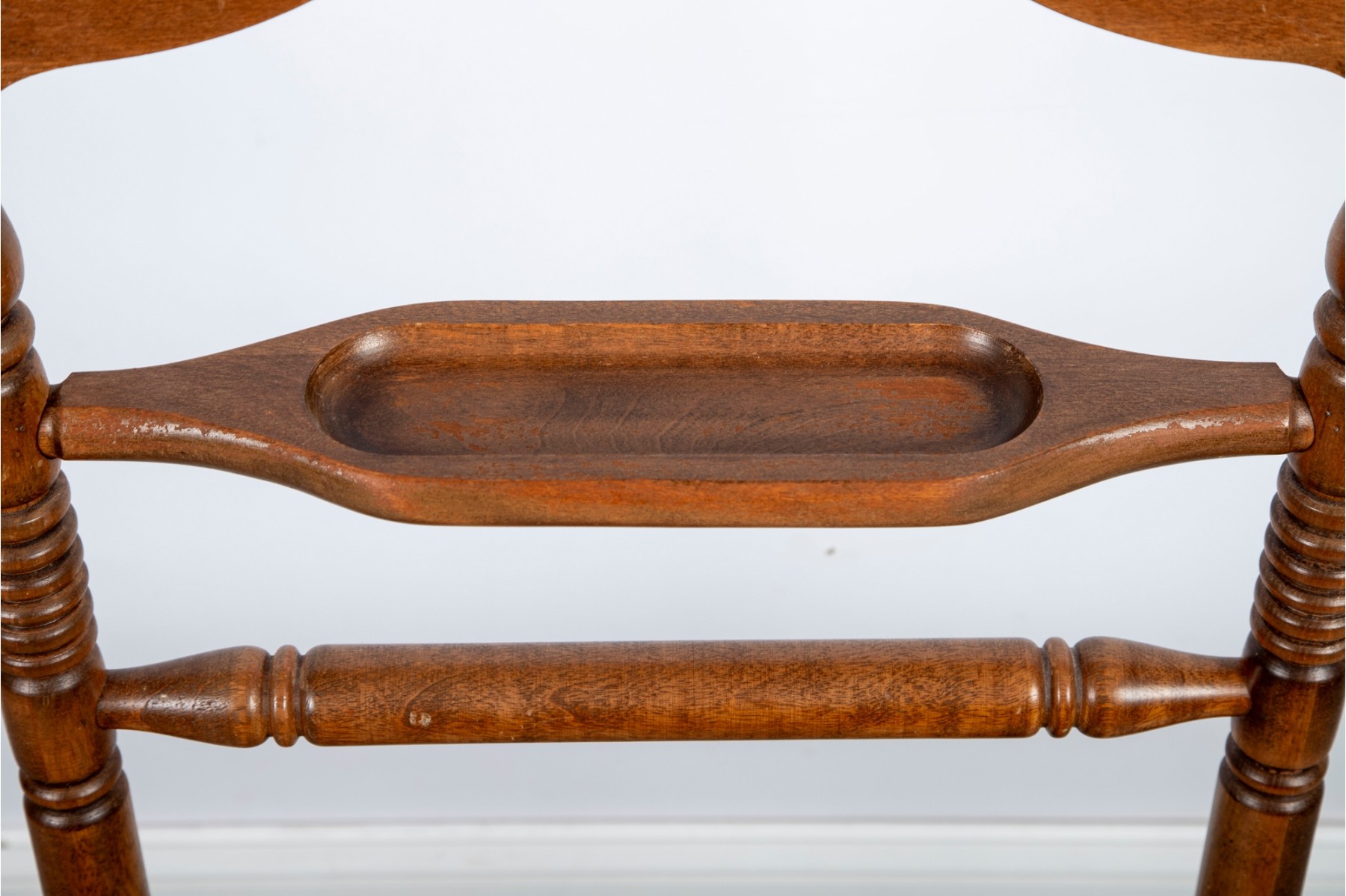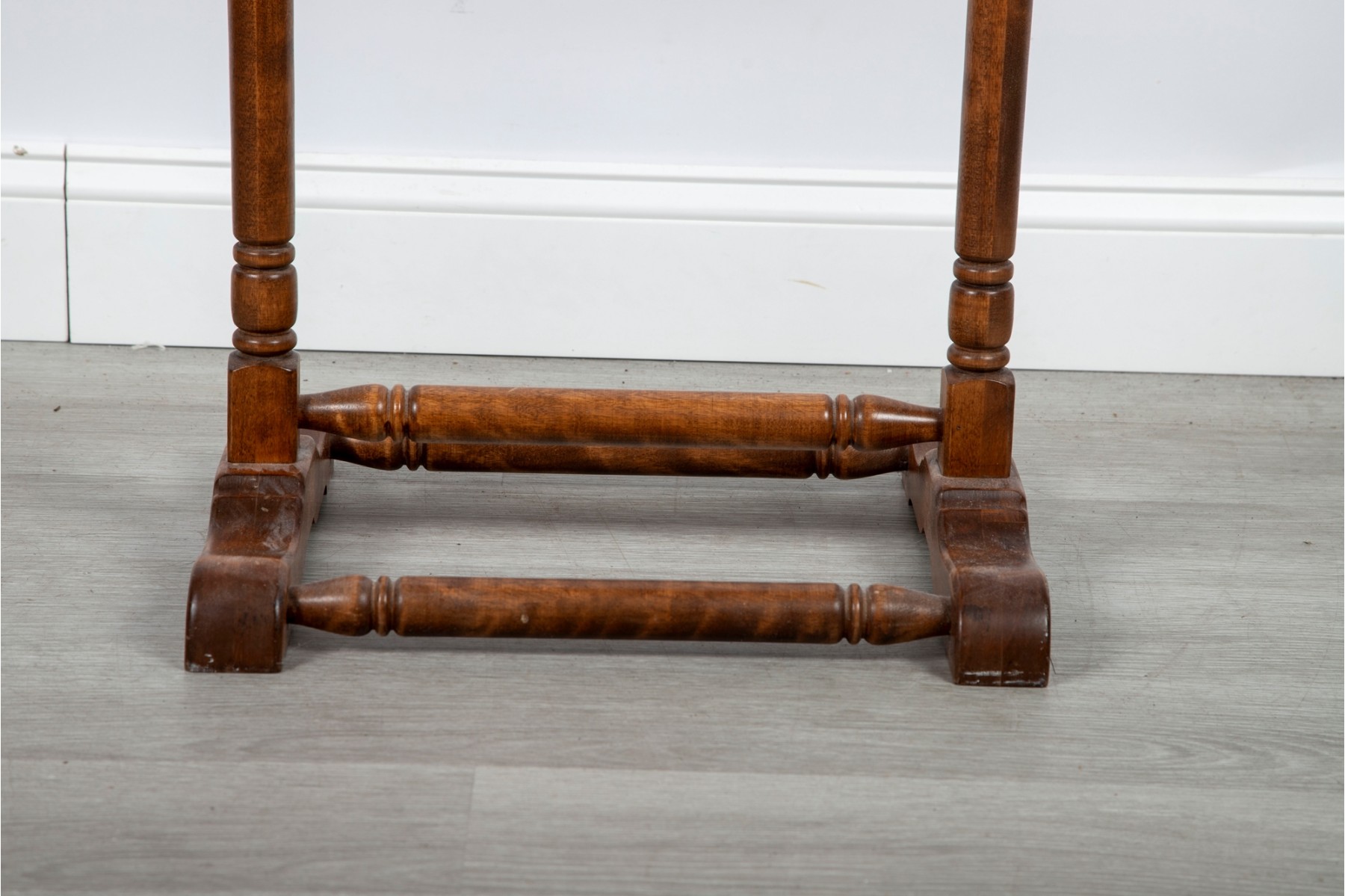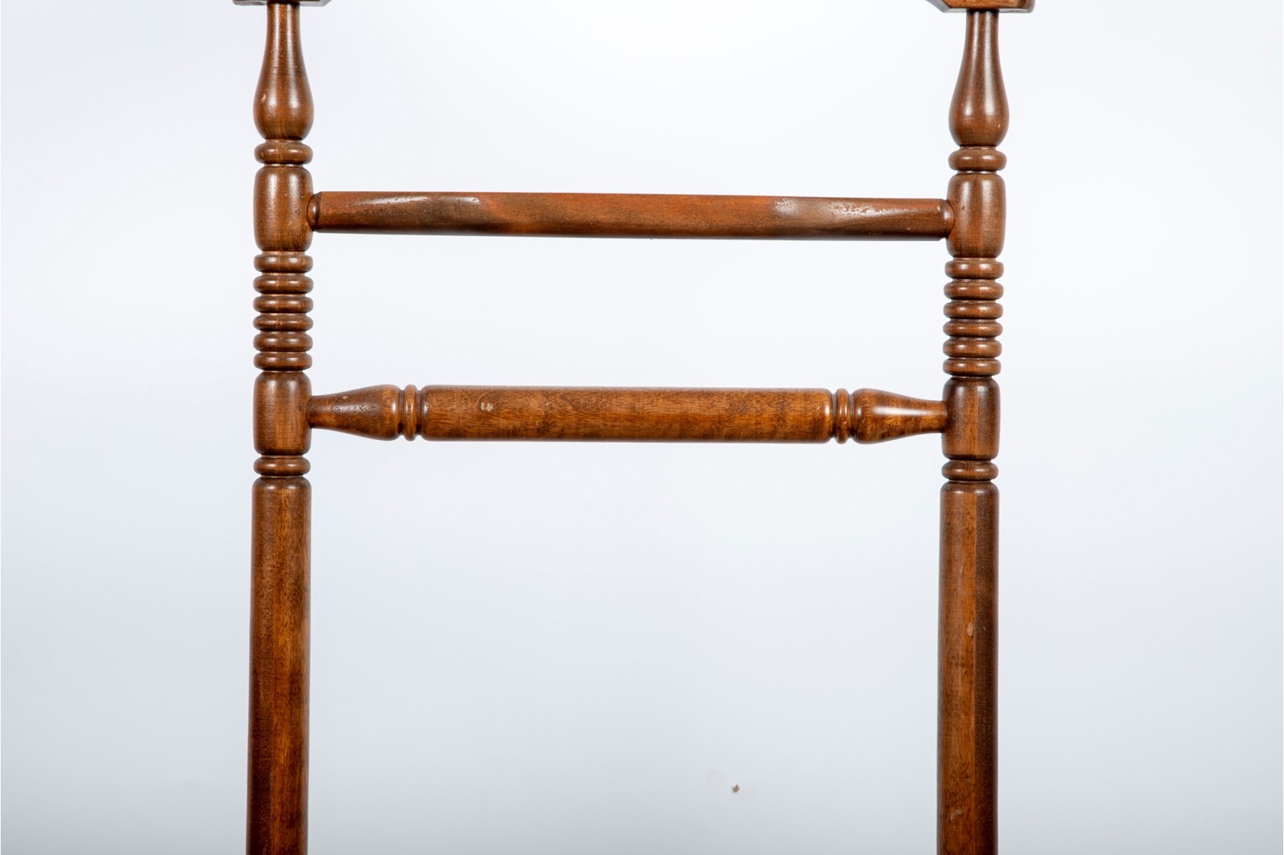 A classic wooden valet stand featuring a sturdy frame with turned spindle details. Designed to neatly organize clothing, it includes a hanger for jackets, a bar for trousers, and a base for shoes or accessories.