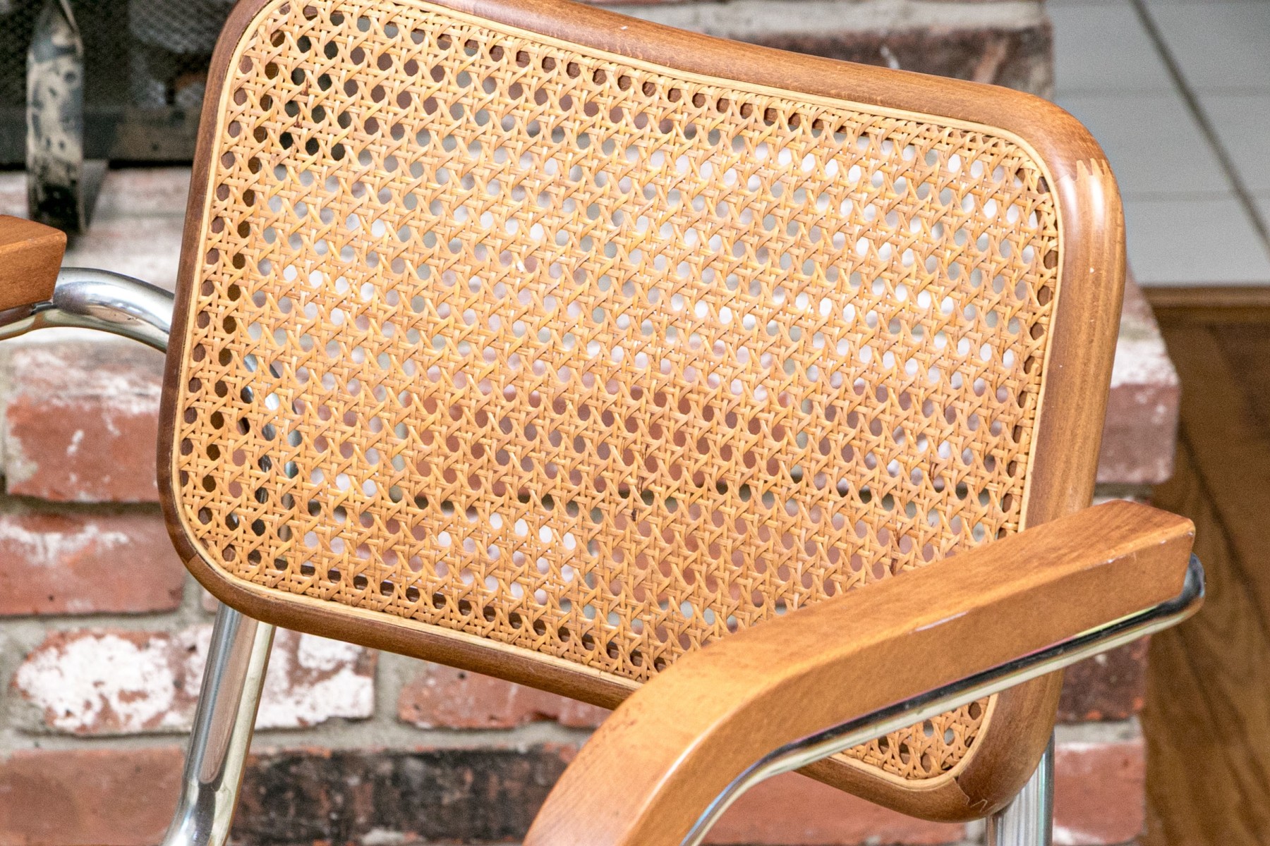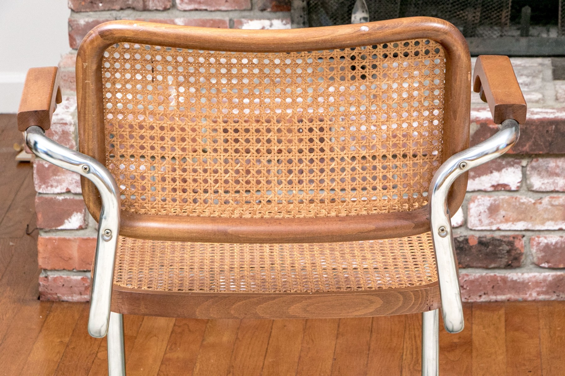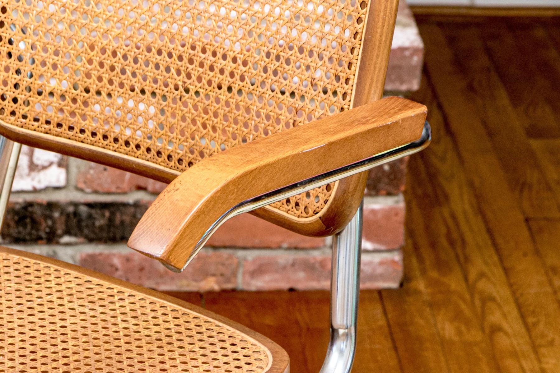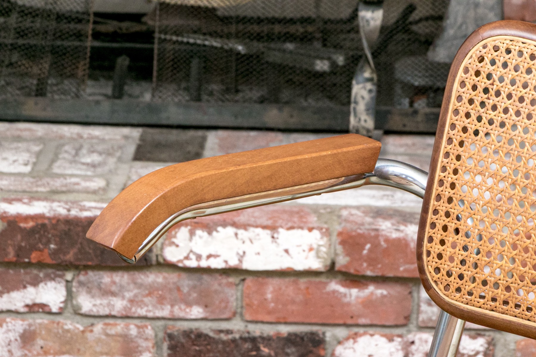 A handsome pair of armchairs in the manner of Marcel Breuer "Cesca." Each chair has chrome finished tubular steel frames with wooden arms, seat and seat back frames, fitted with caned seats and seat backs.