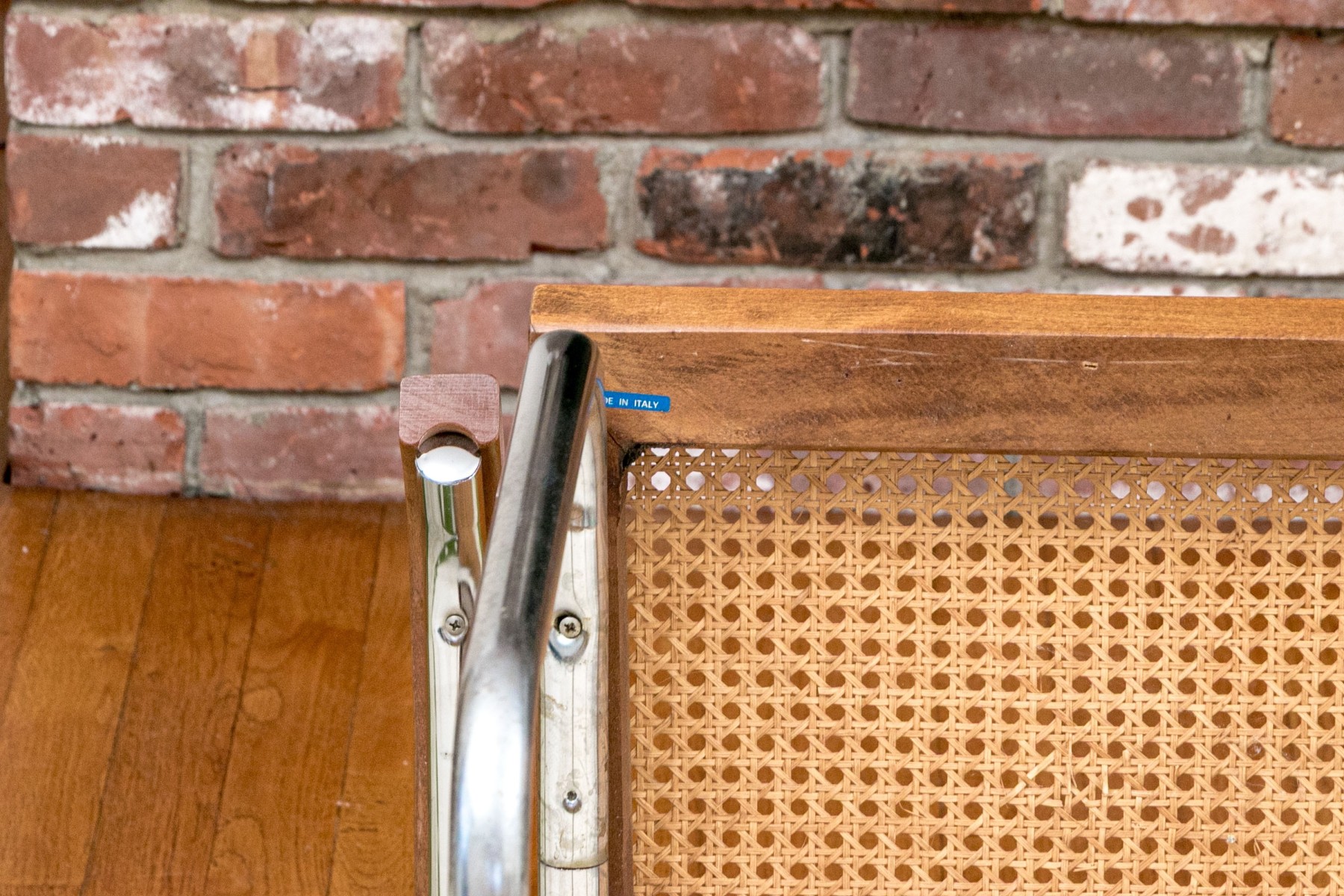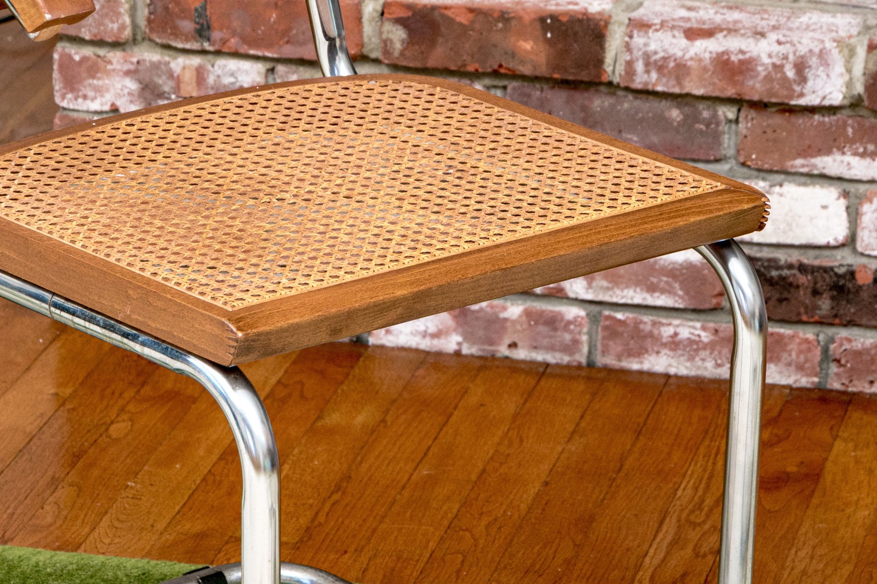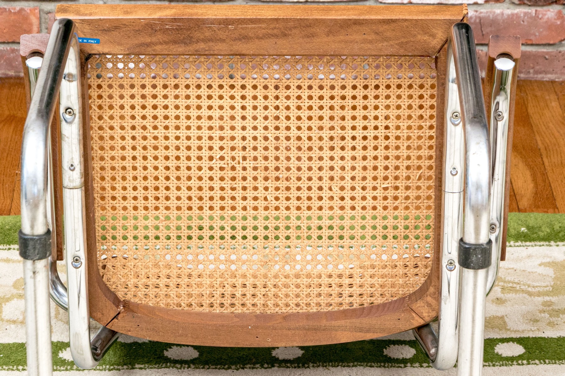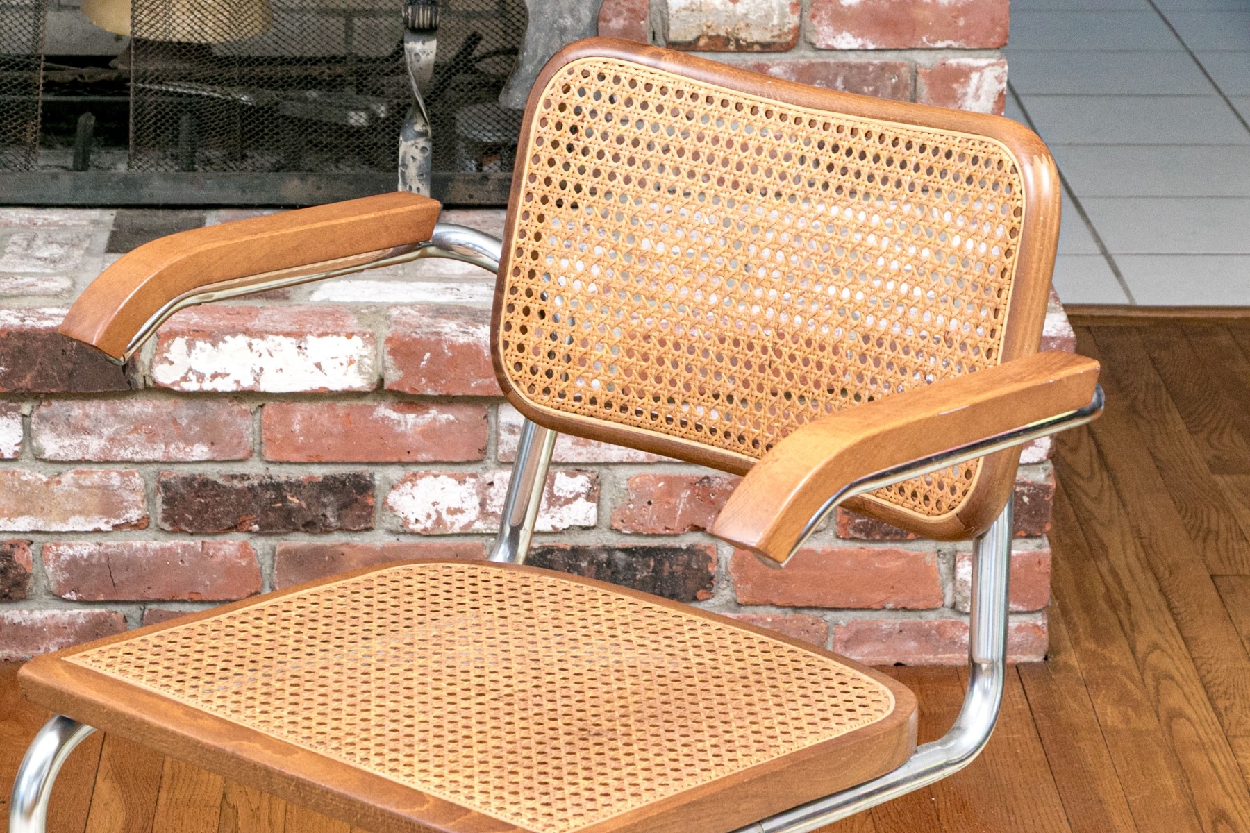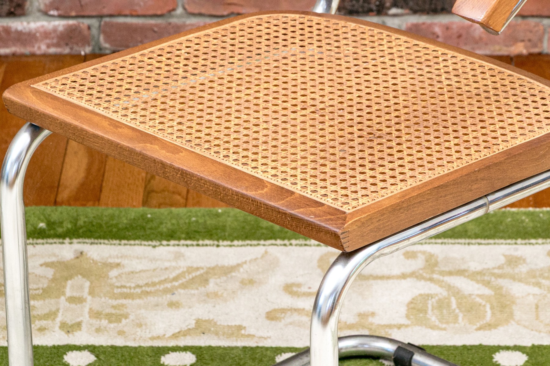 A handsome pair of armchairs in the manner of Marcel Breuer "Cesca." Each chair has chrome finished tubular steel frames with wooden arms, seat and seat back frames, fitted with caned seats and seat backs.