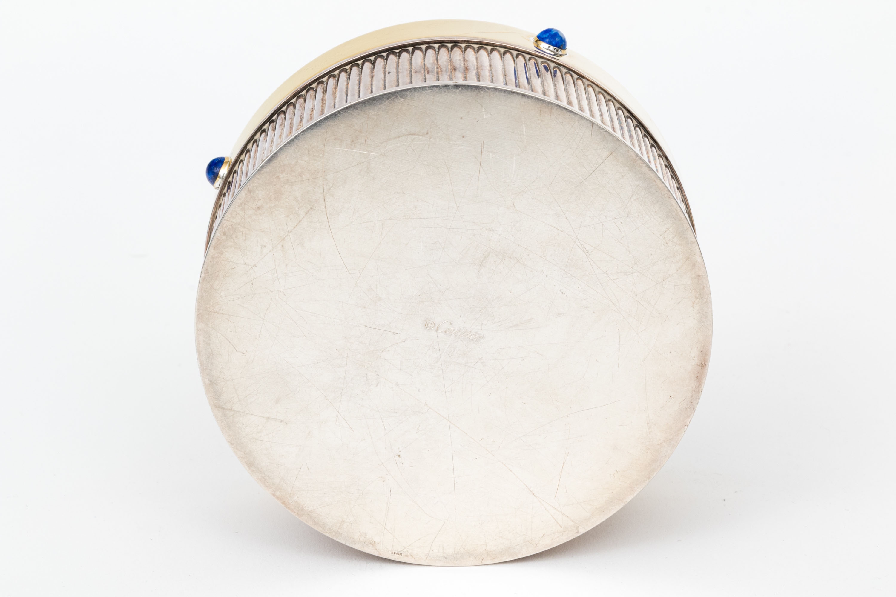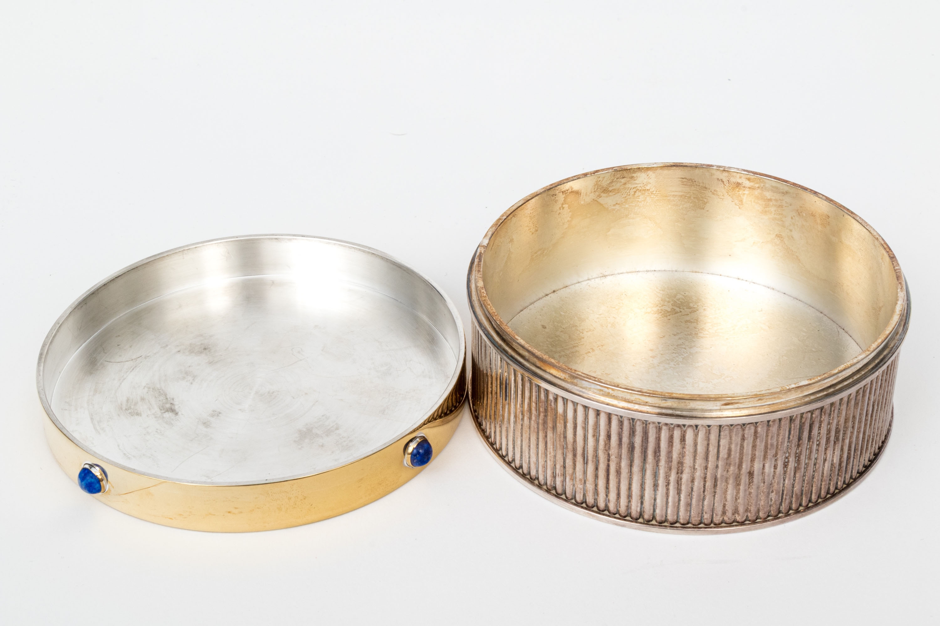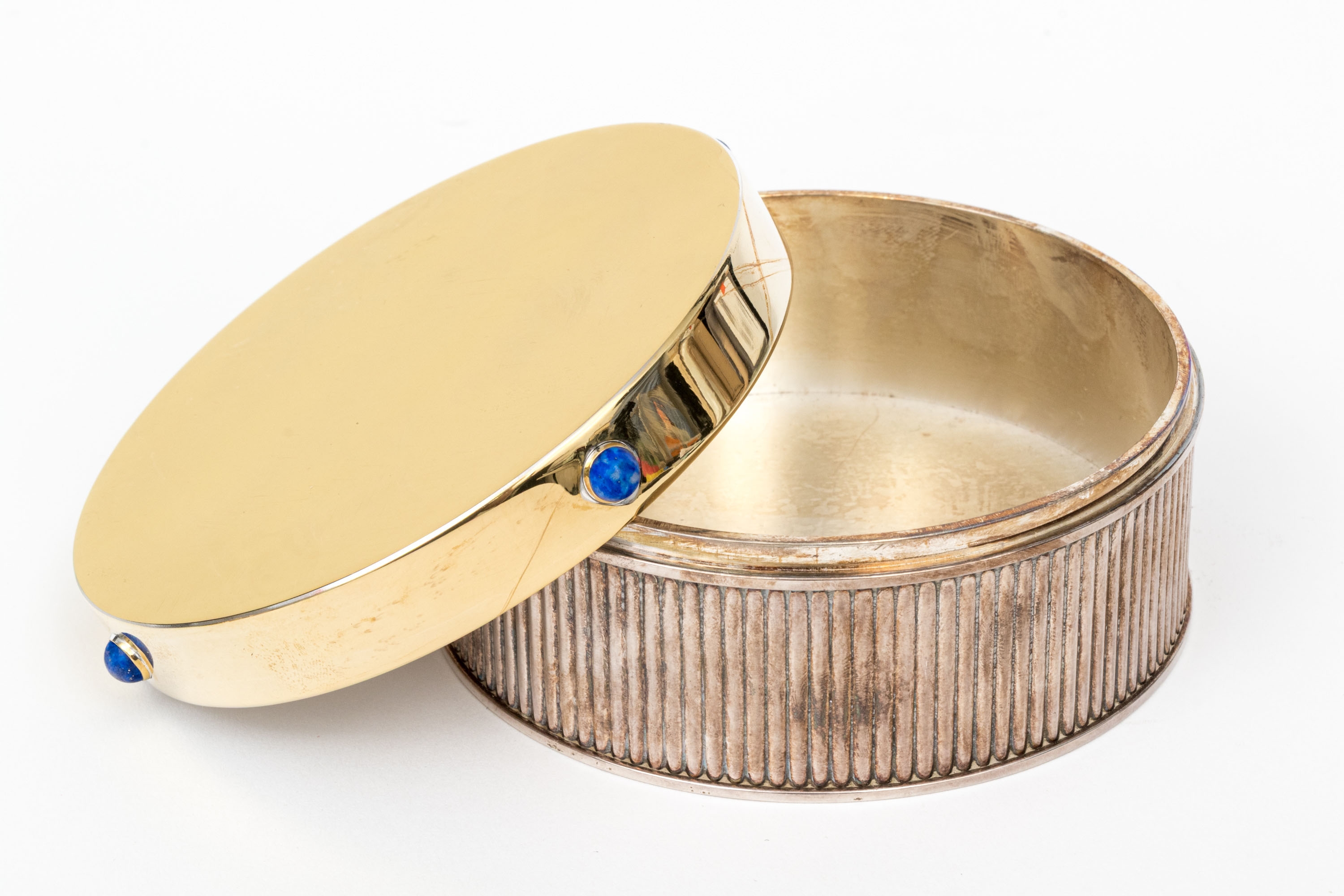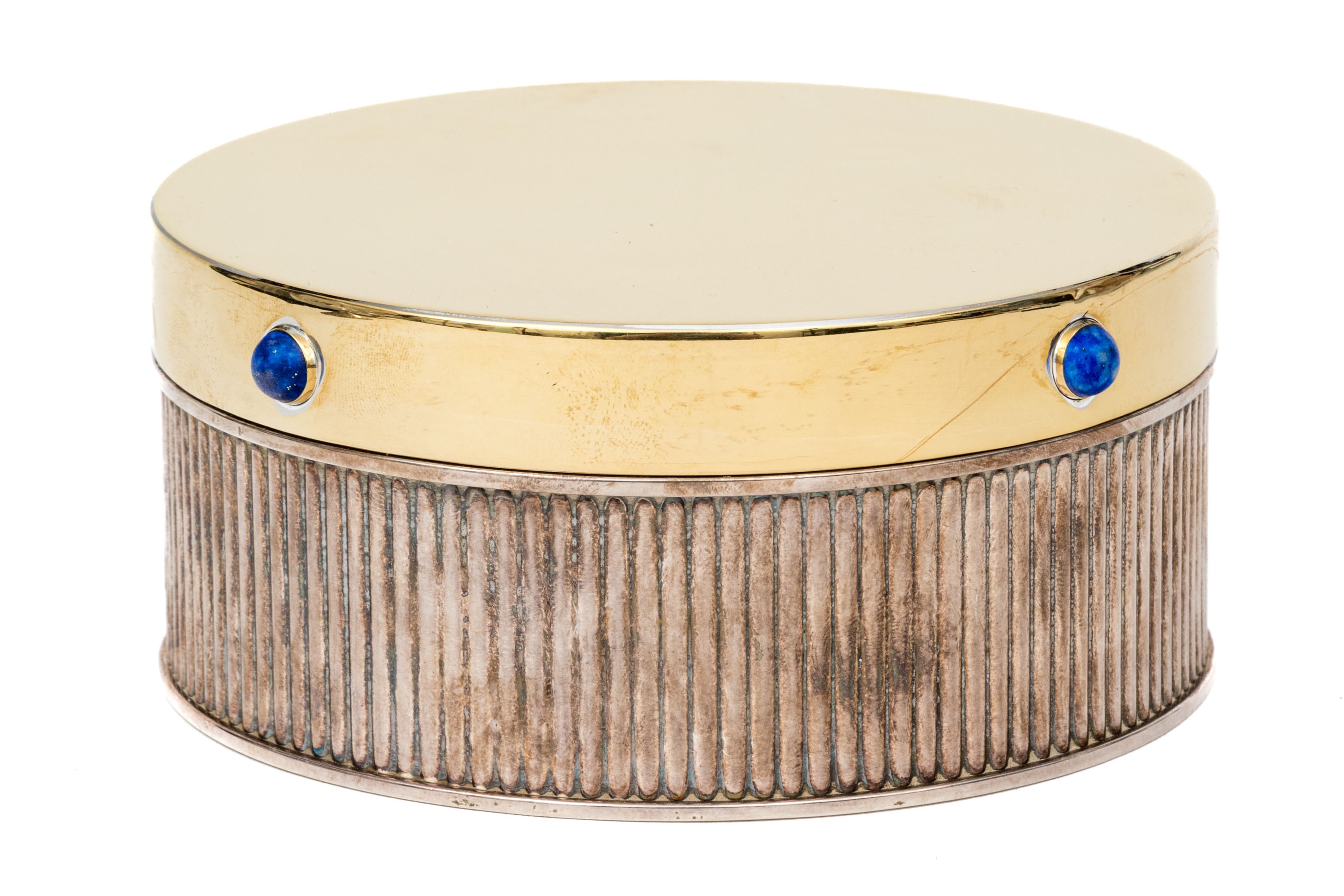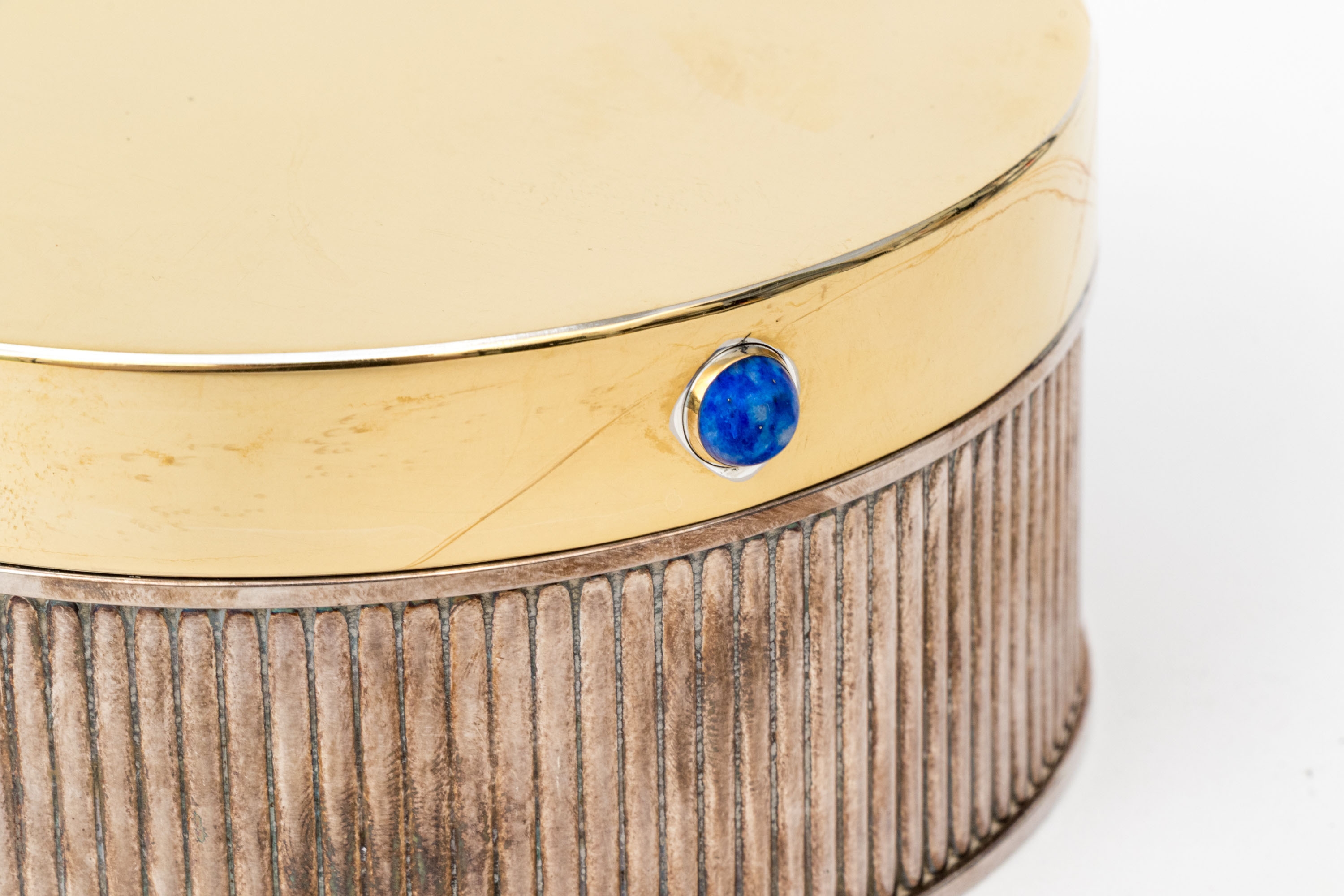 A fine silverplate round ribbed box with gold plated lid set with lapis lazuli cabochons.