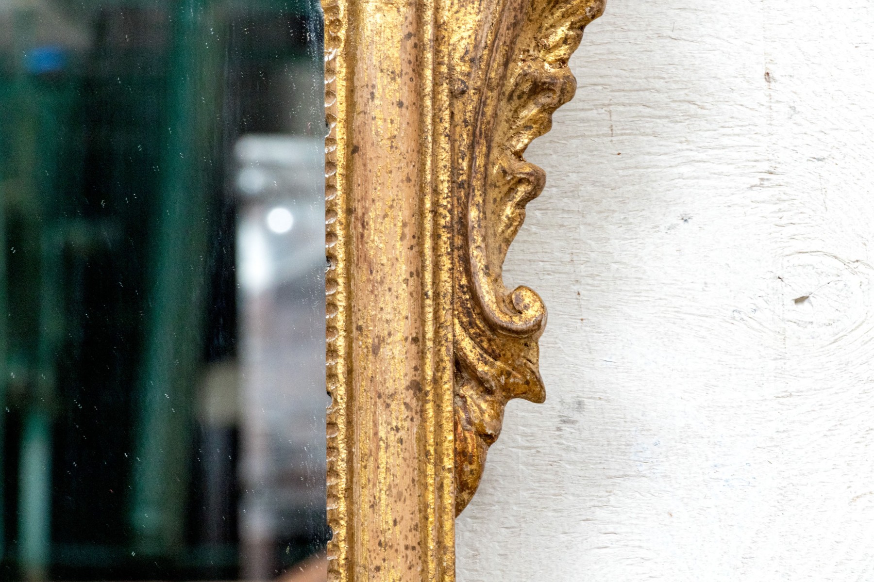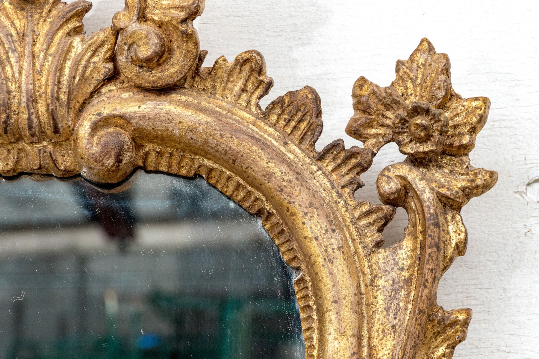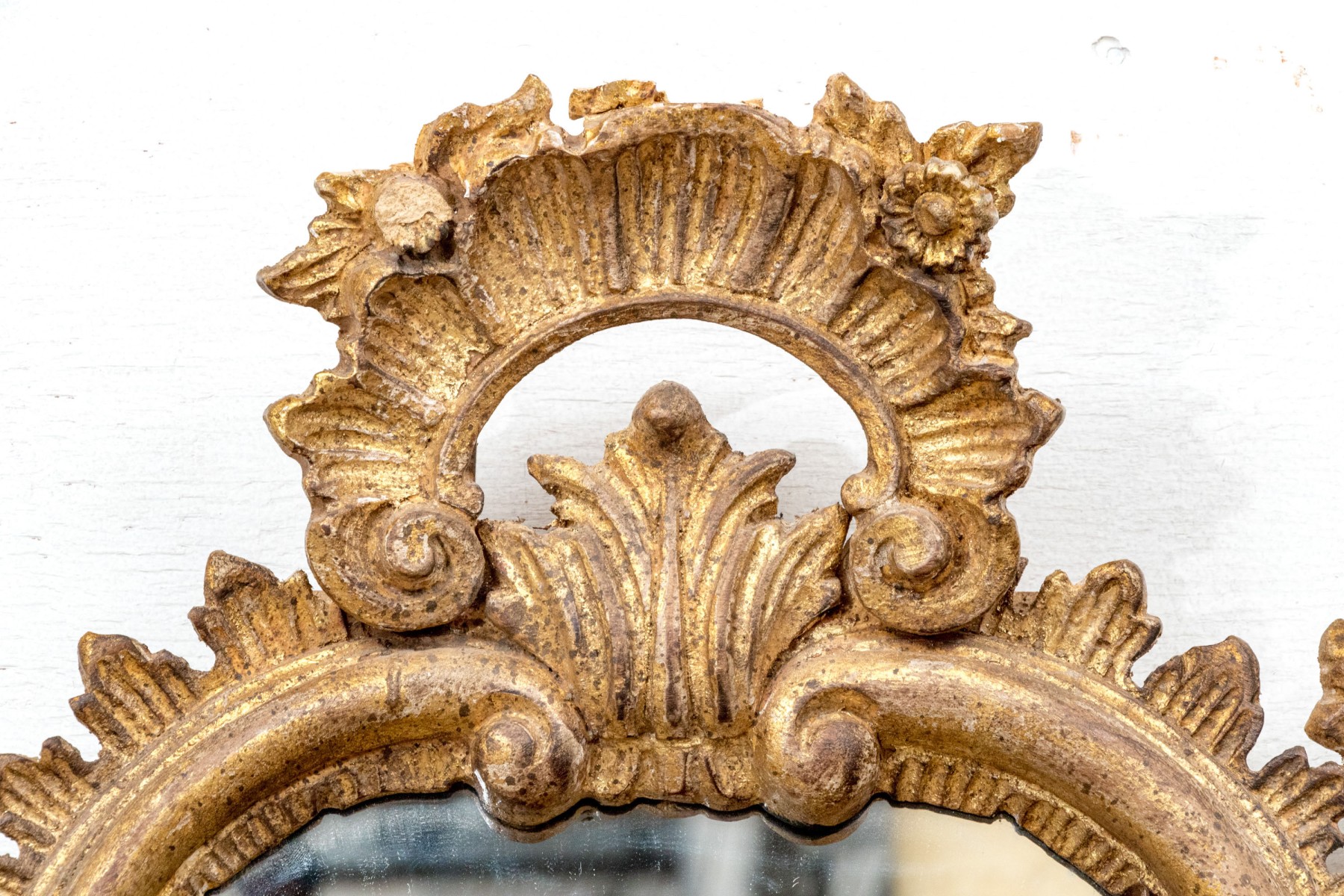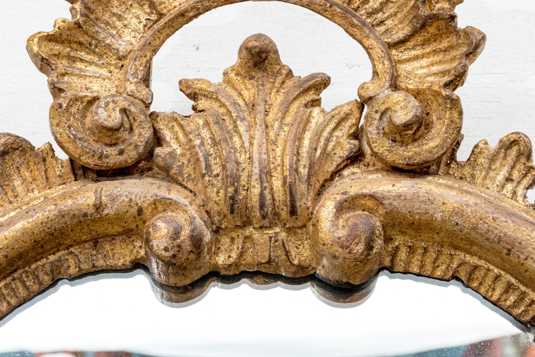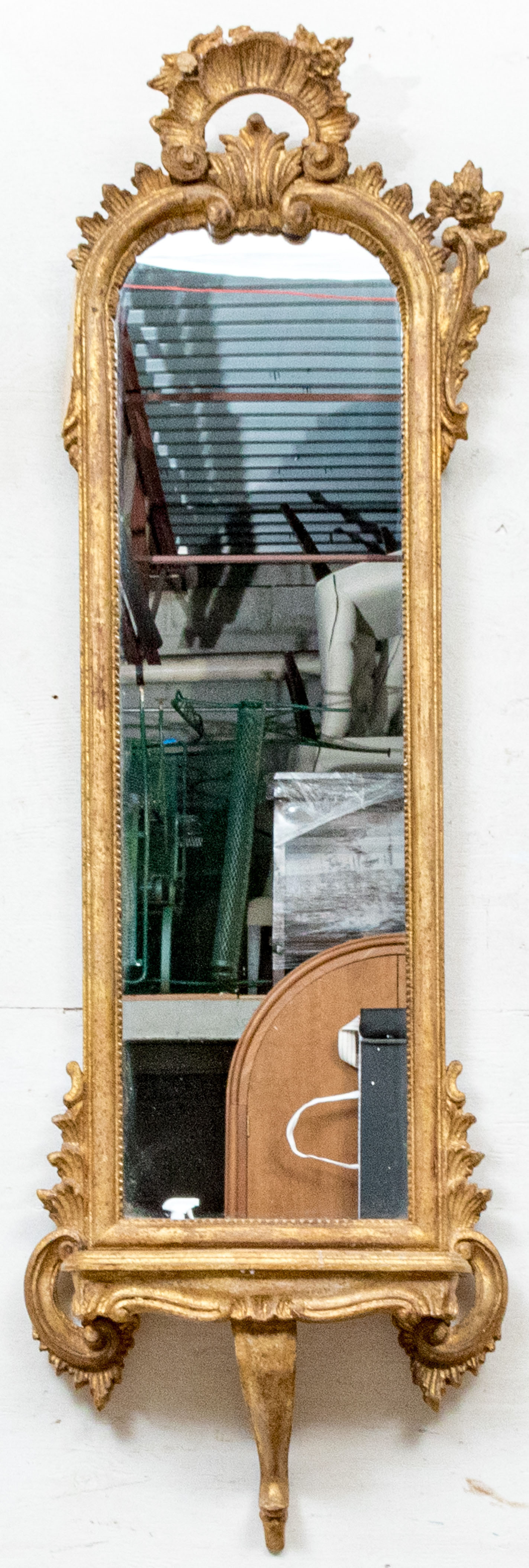 A tall narrow oval mirror carved and gilt with an openwork crest with palmette top. Flower decorated scrolls flank the crest, and below leaves and scrolls frame the attached shelf with curved leg support.