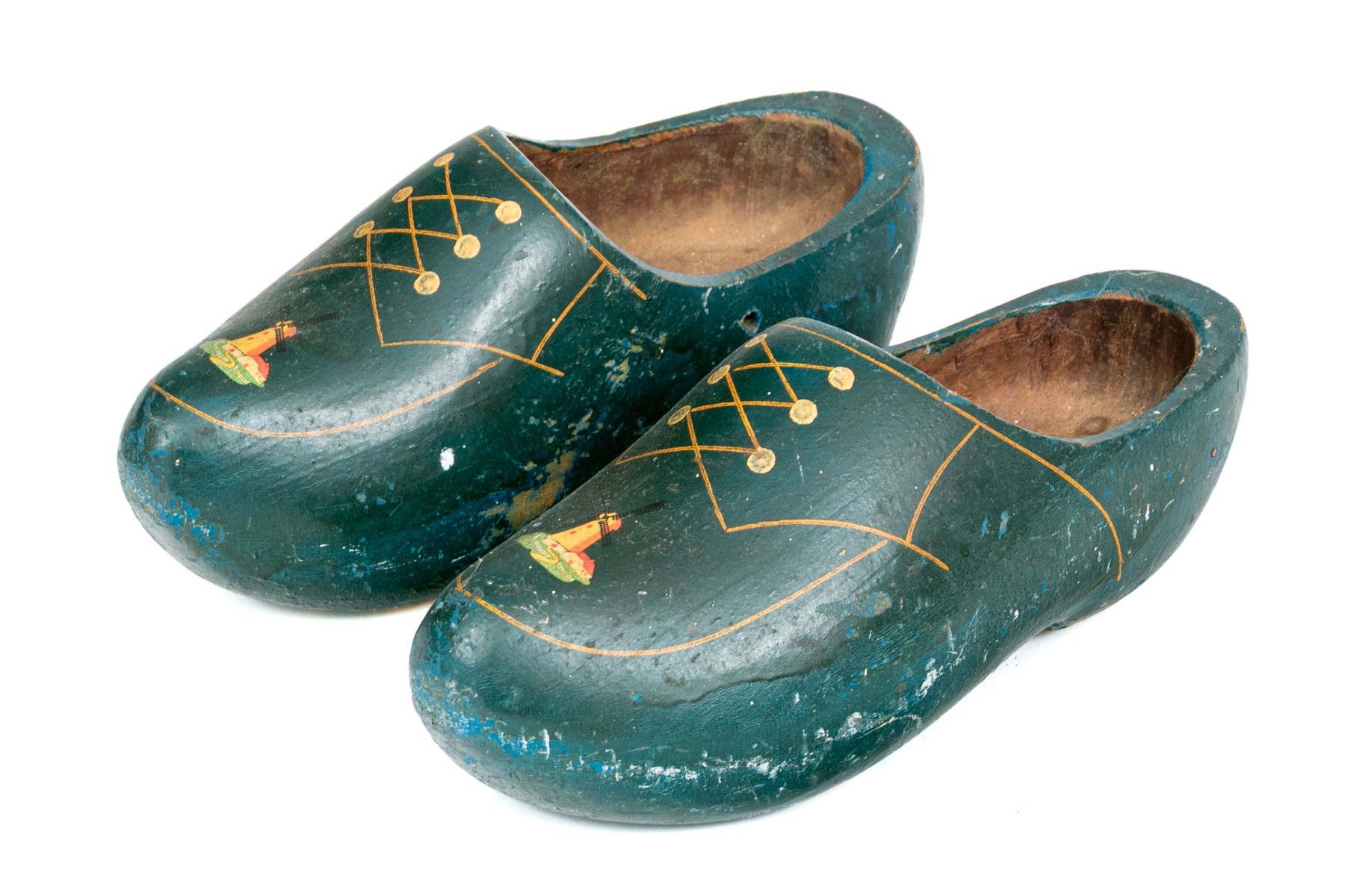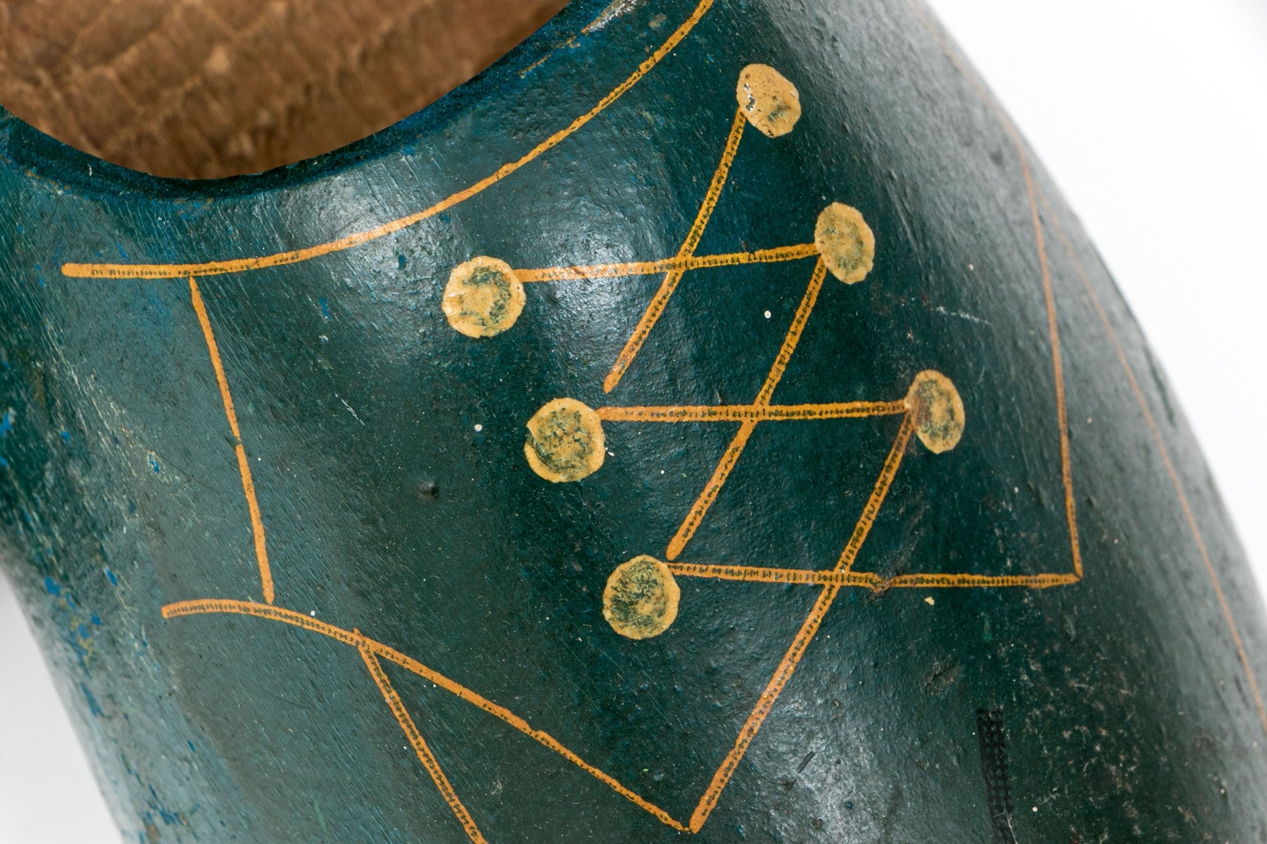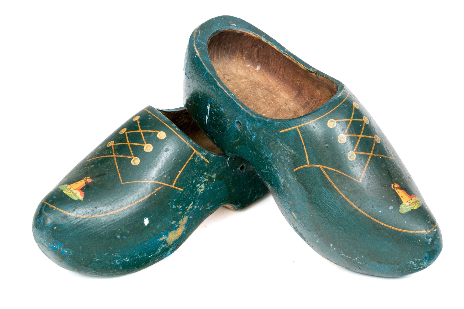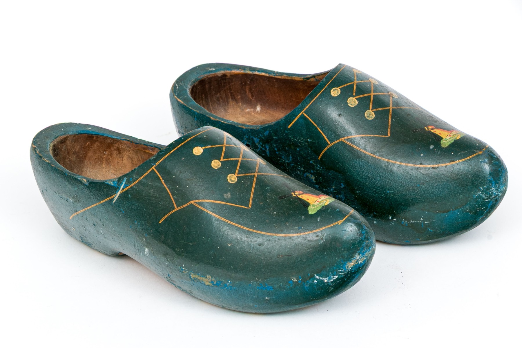 A charming pair of vintage carved wood clogs painted green with gilt embellishment and polychromatic reserves with windmills.