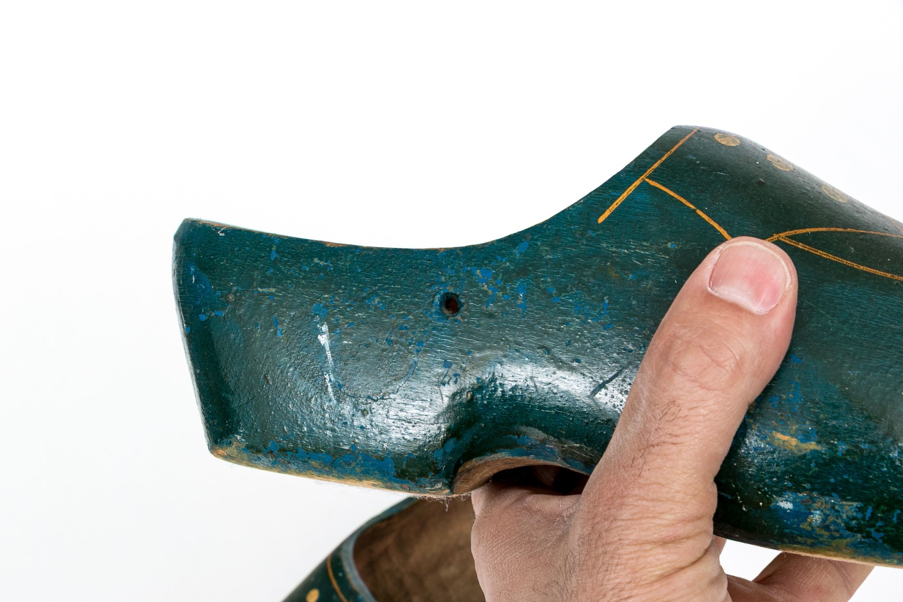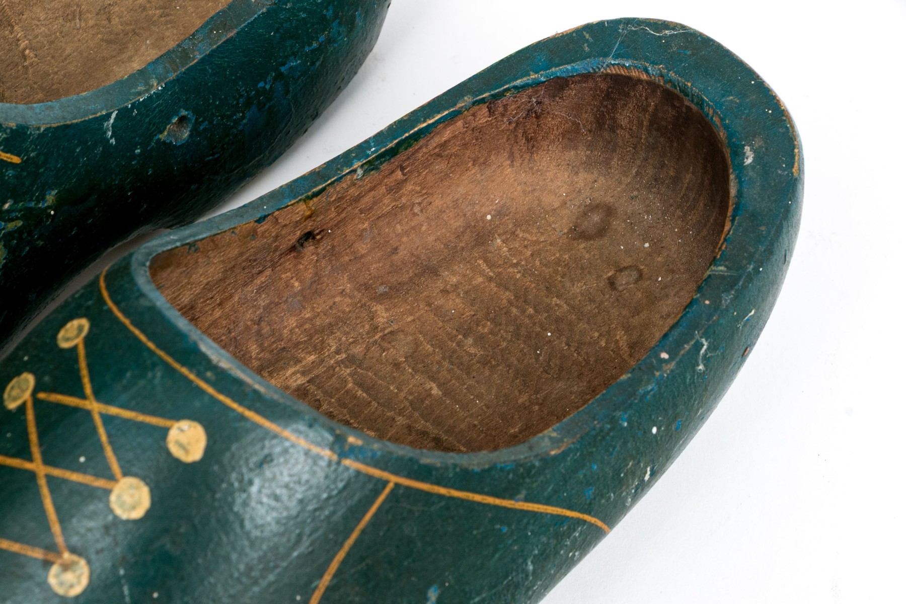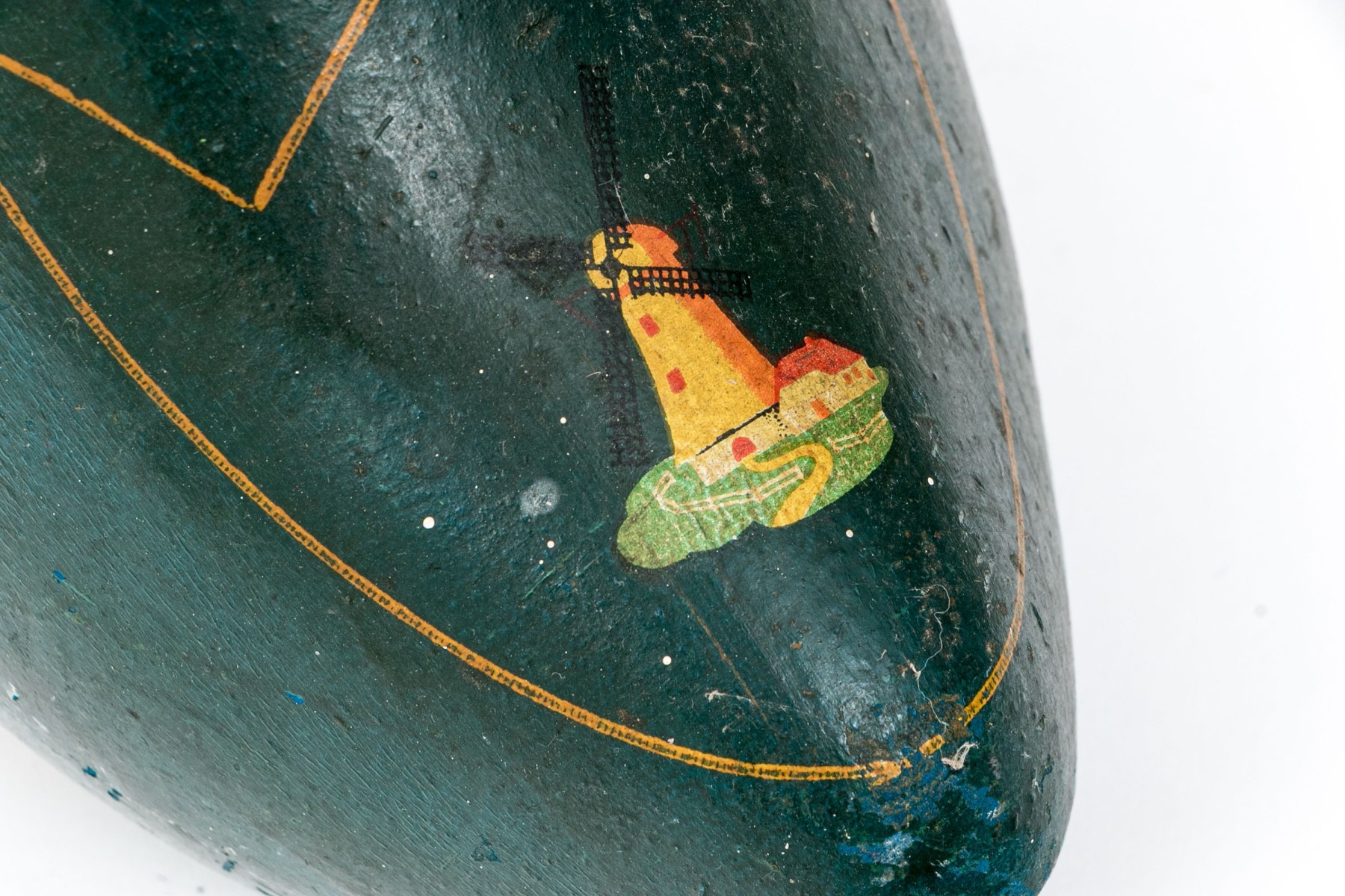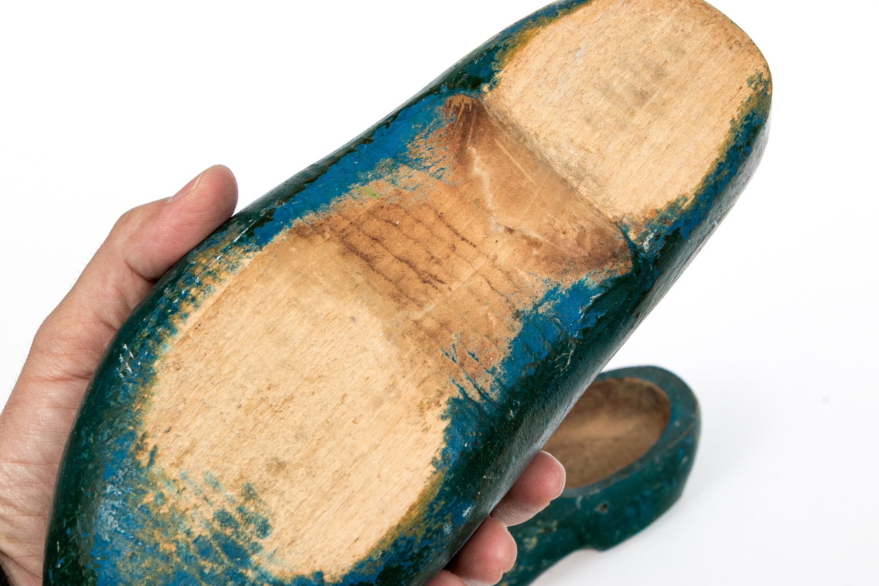A charming pair of vintage carved wood clogs painted green with gilt embellishment and polychromatic reserves with windmills.