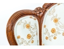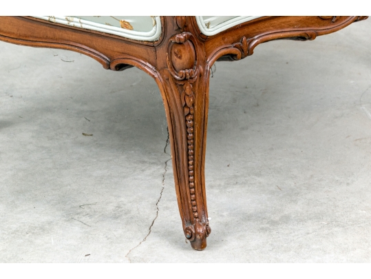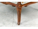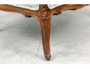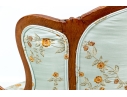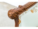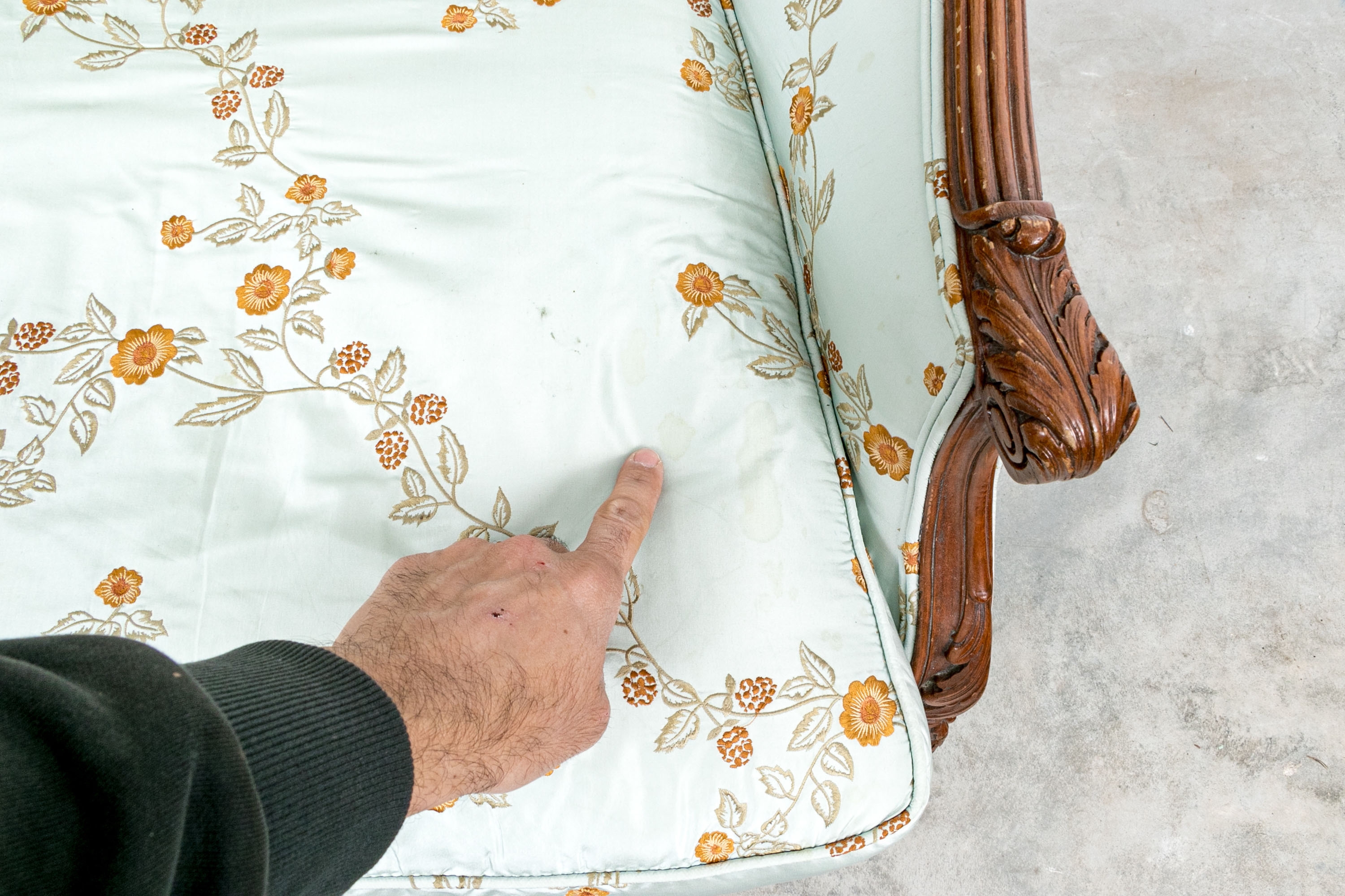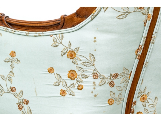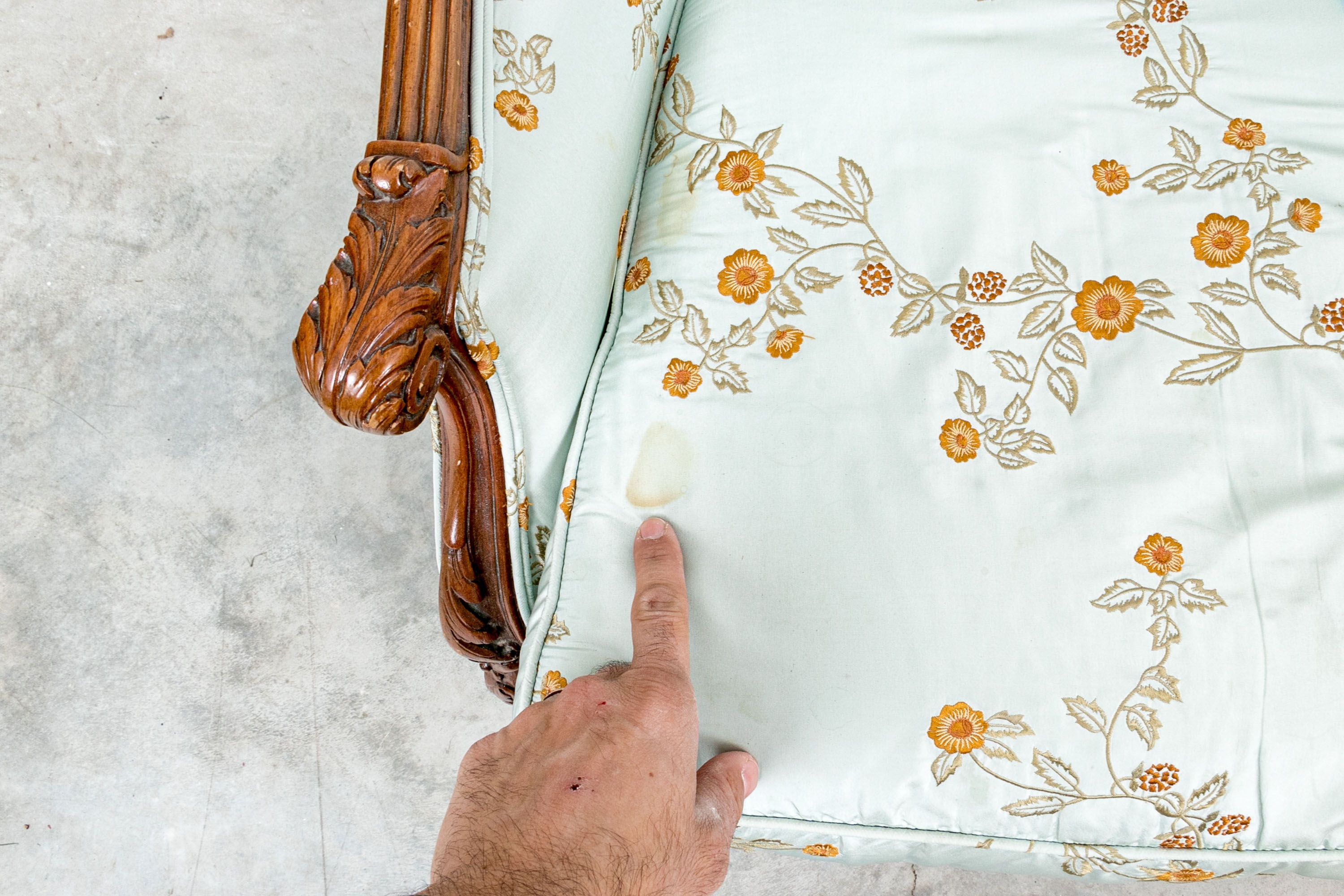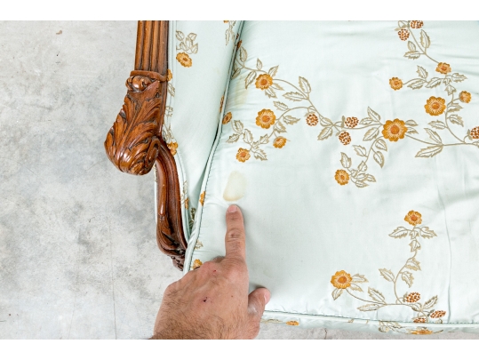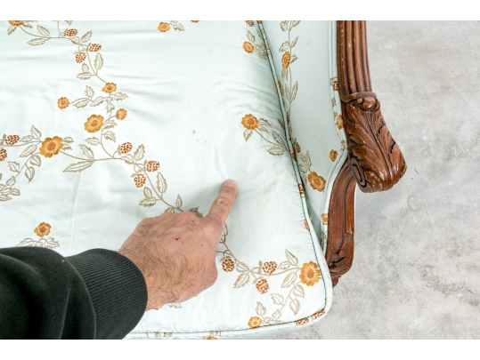 Condition: Please review the detail photos. The upper right crest rail molding with cracks and chips but is stable. There is a chip to one front foot. Stains on the seat cushion, on inside the lower arms, and on one side.