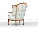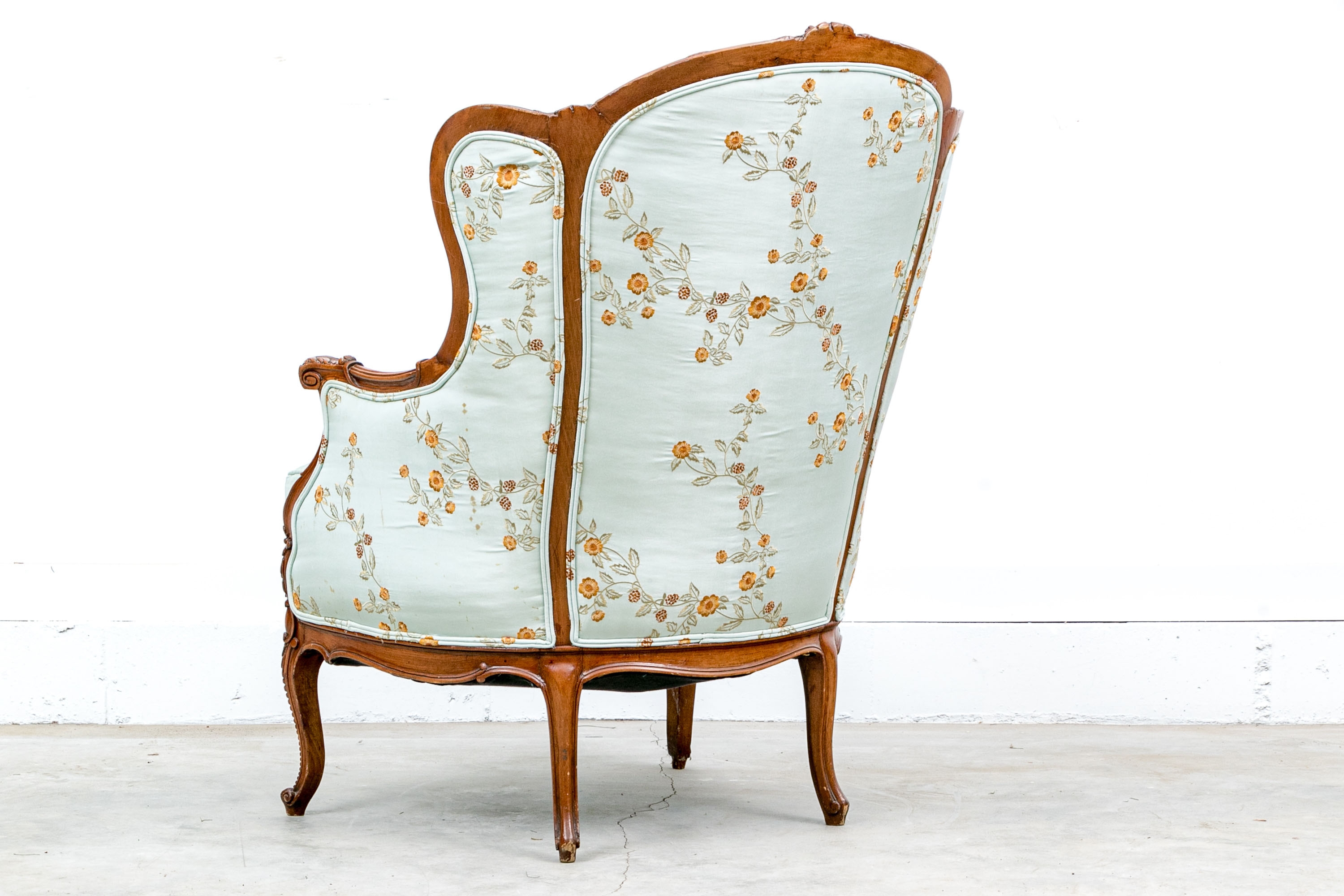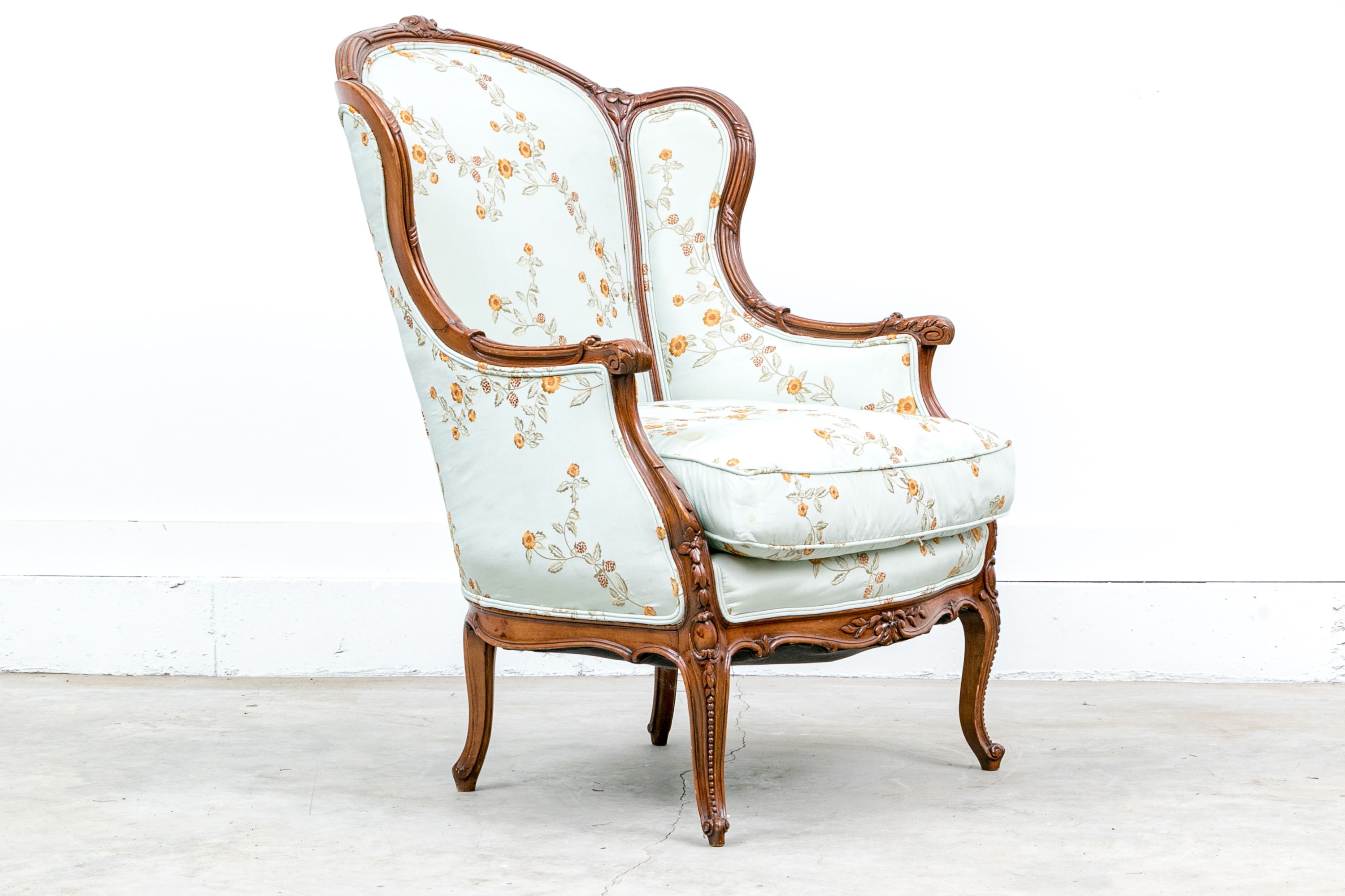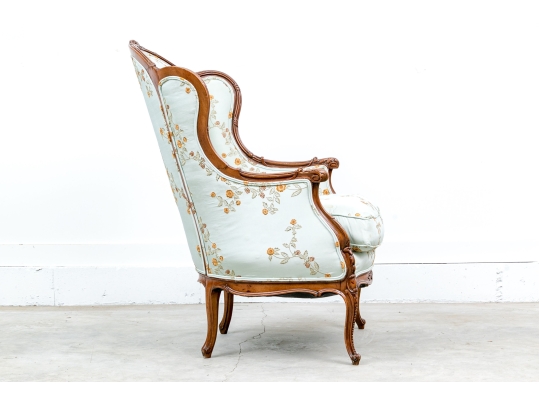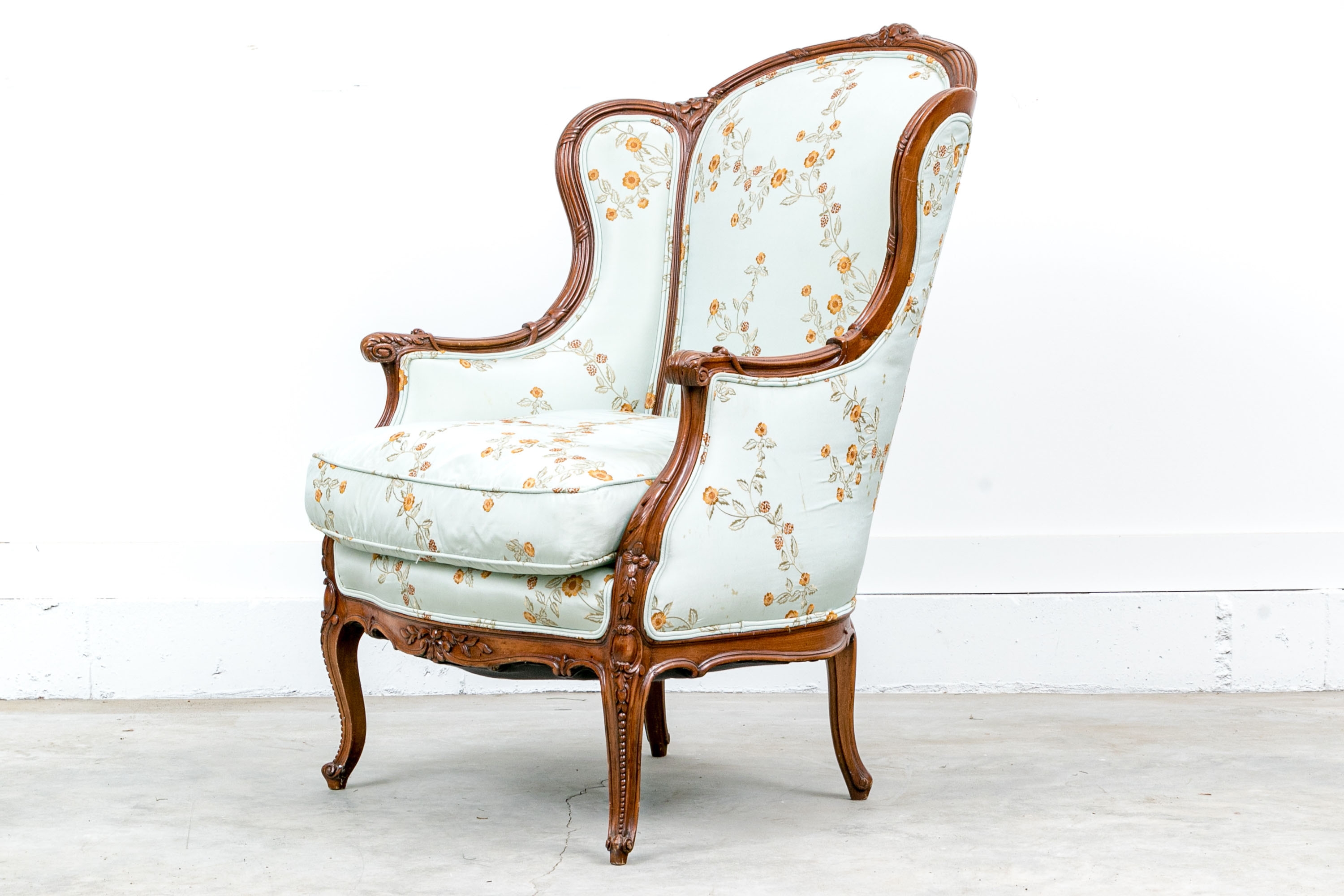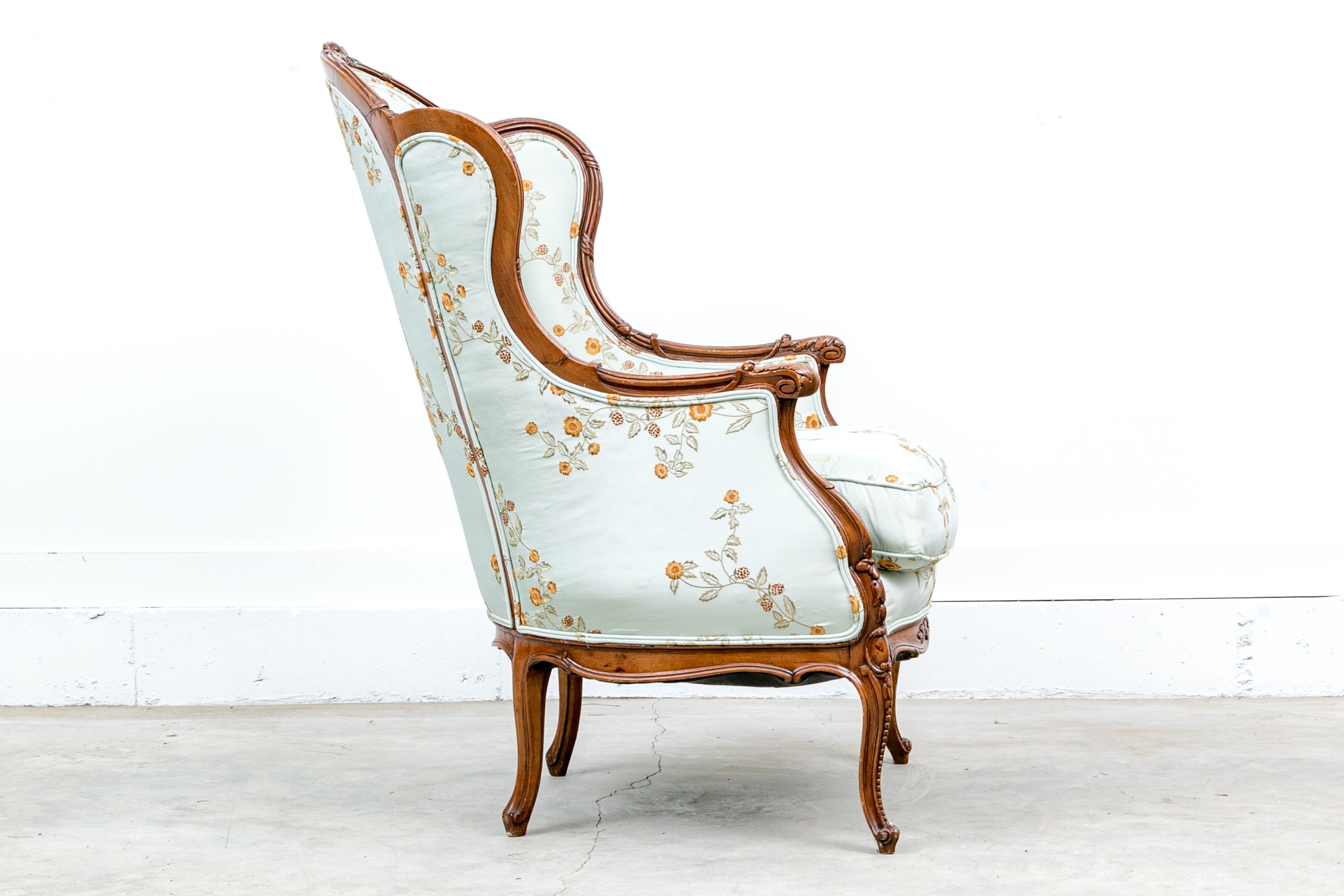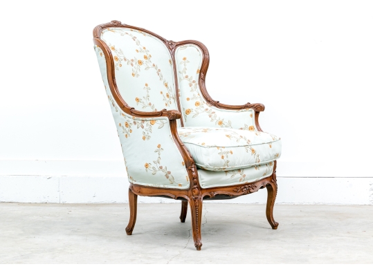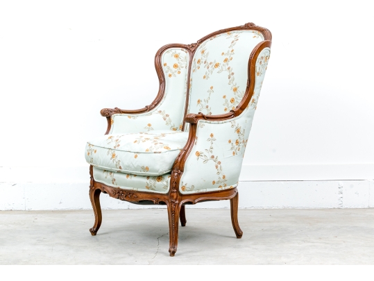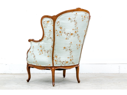 A Louis XV style French country wing chair with carved and ribbed leafy frame. With a floral decorated crest rail and shaped arms with scrolled ends. The seat rail with complementary carved leaves. The cabriole legs with carved beaded details, medallions and scrolled feet. Upholstered in a lovely silky pale blue fabric with orange flowers and berries.