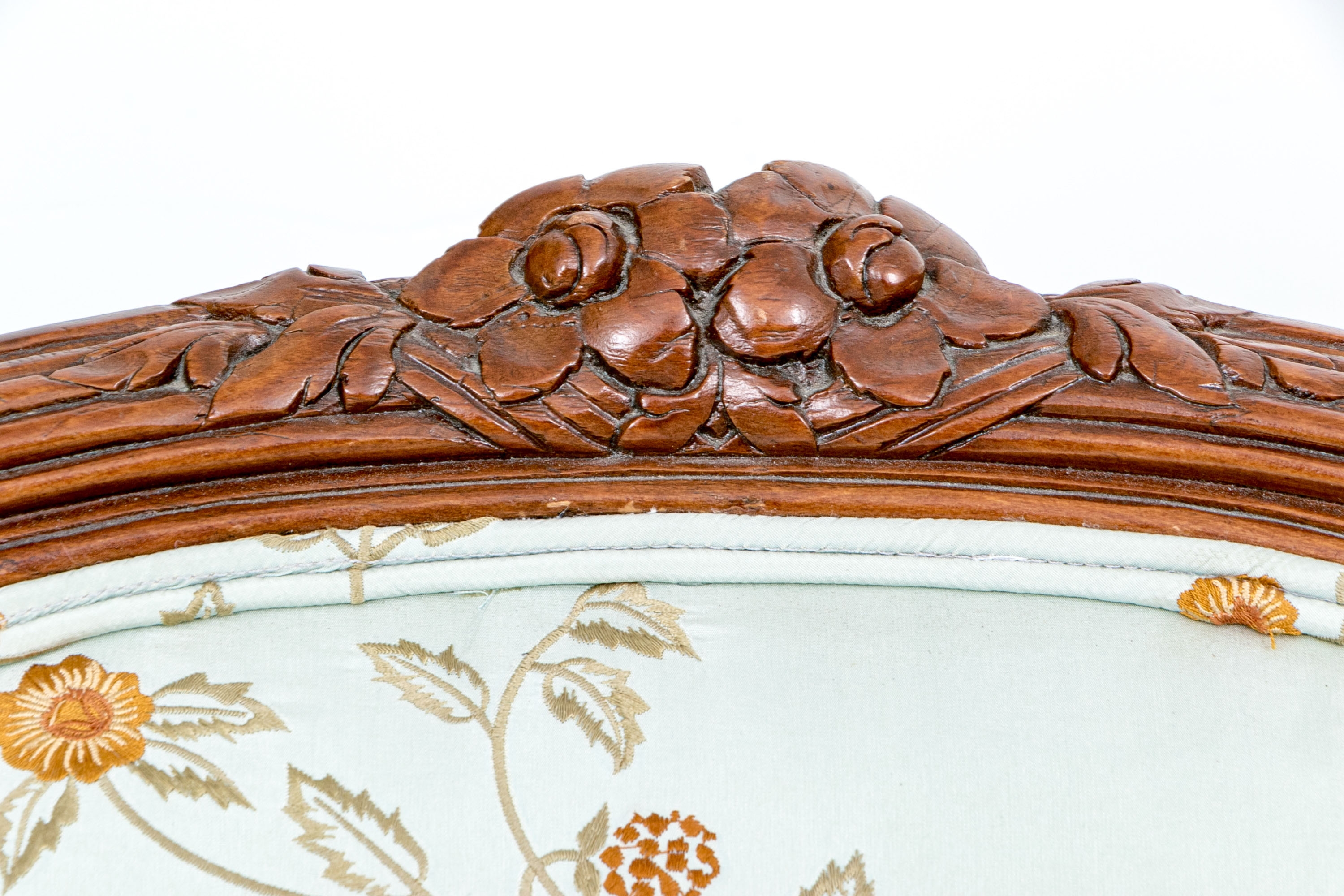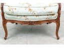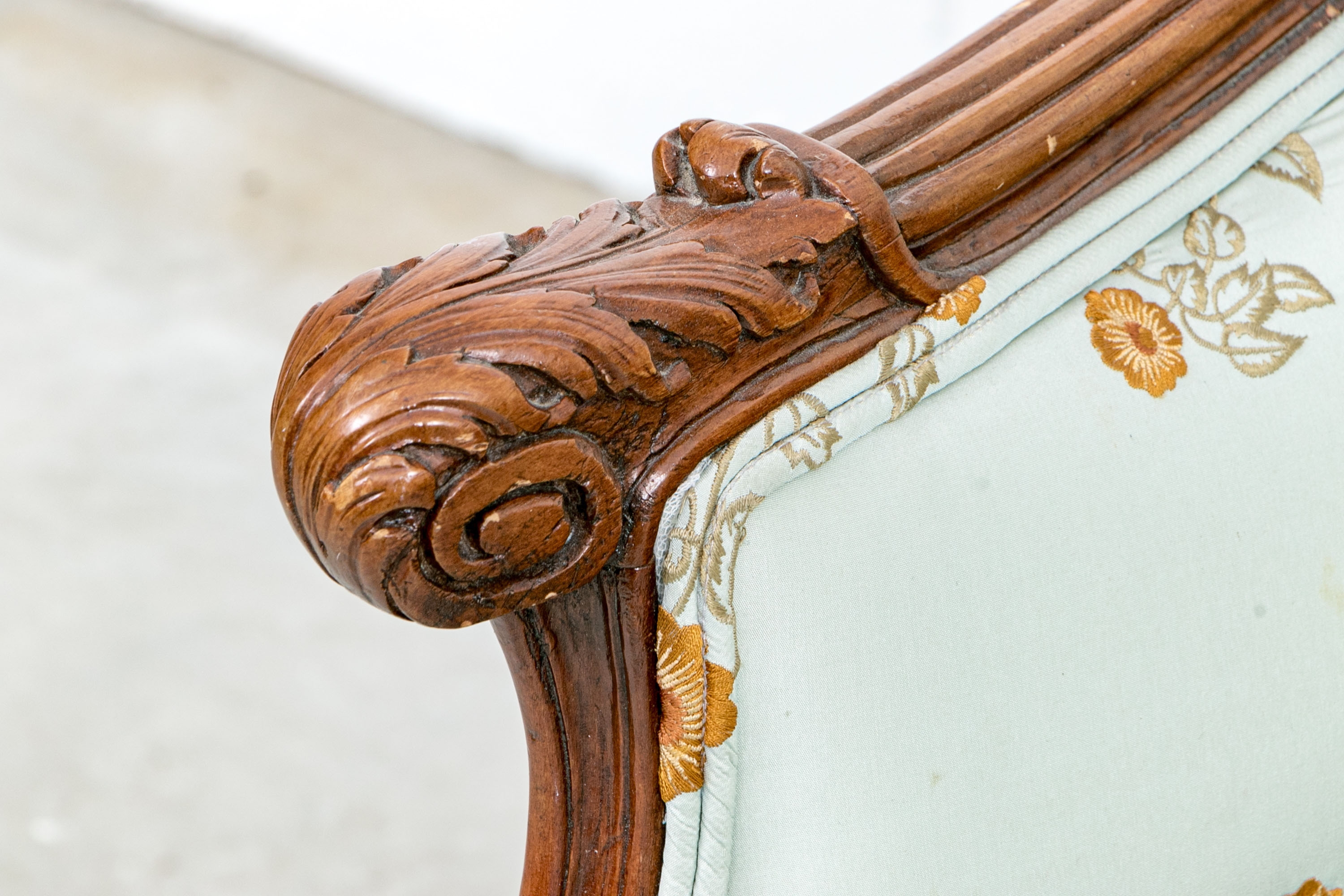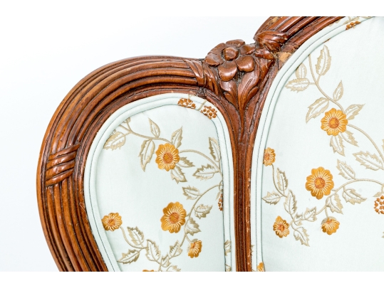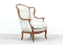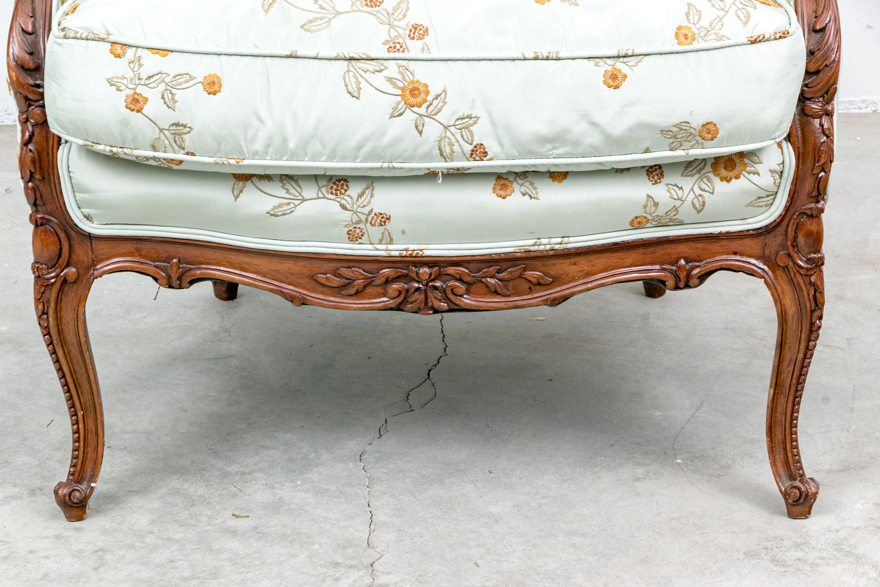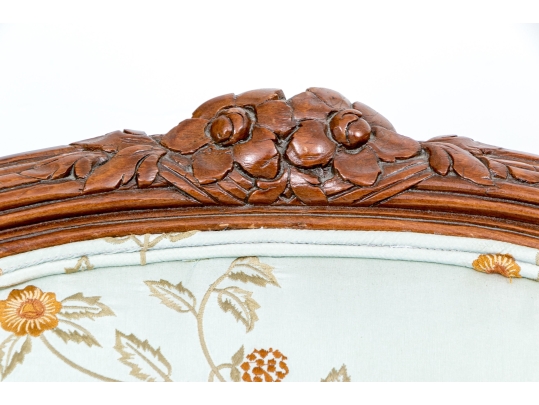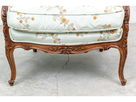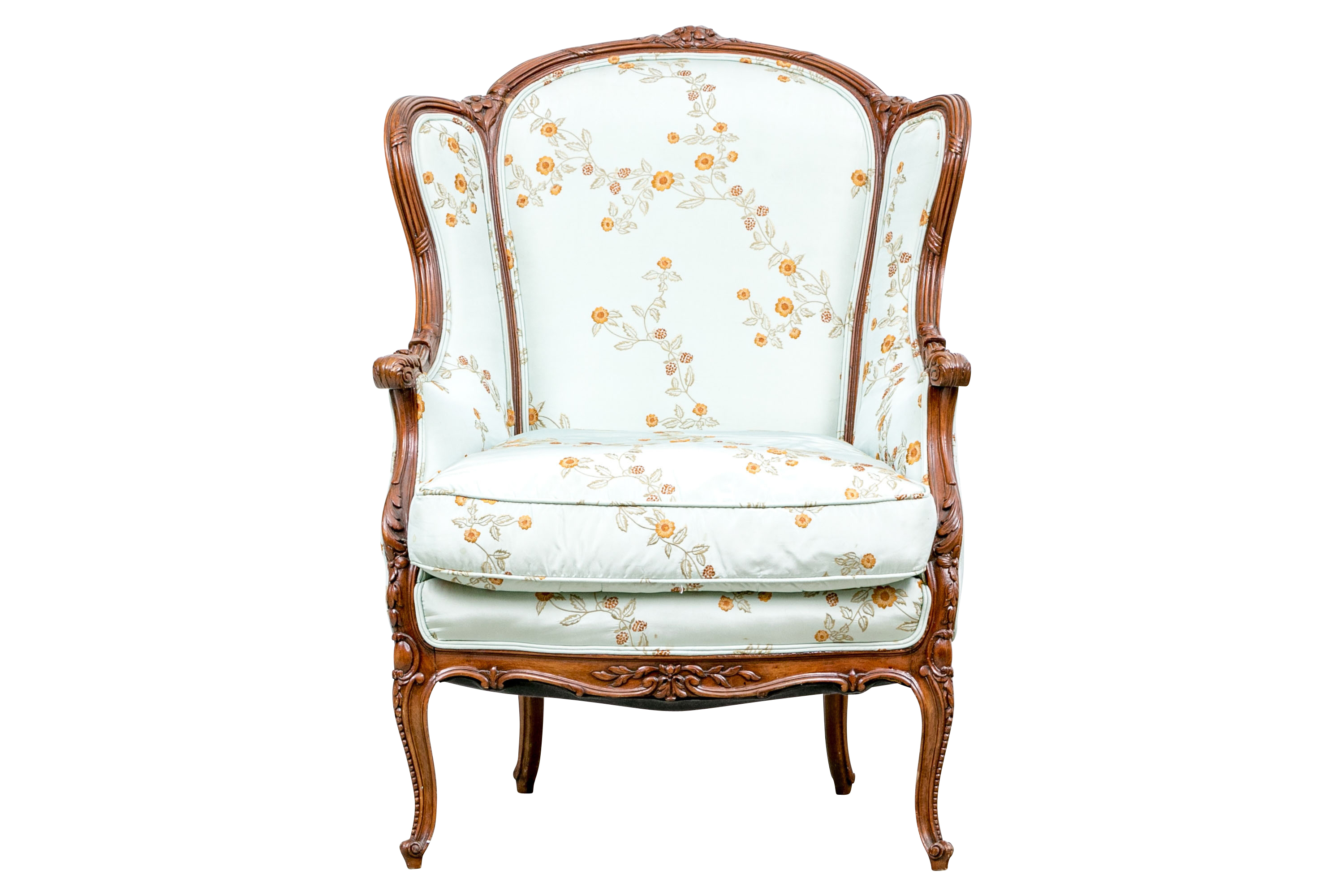 A Louis XV style French country wing chair with carved and ribbed leafy frame. With a floral decorated crest rail and shaped arms with scrolled ends. The seat rail with complementary carved leaves. The cabriole legs with carved beaded details, medallions and scrolled feet. Upholstered in a lovely silky pale blue fabric with orange flowers and berries.