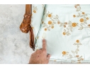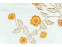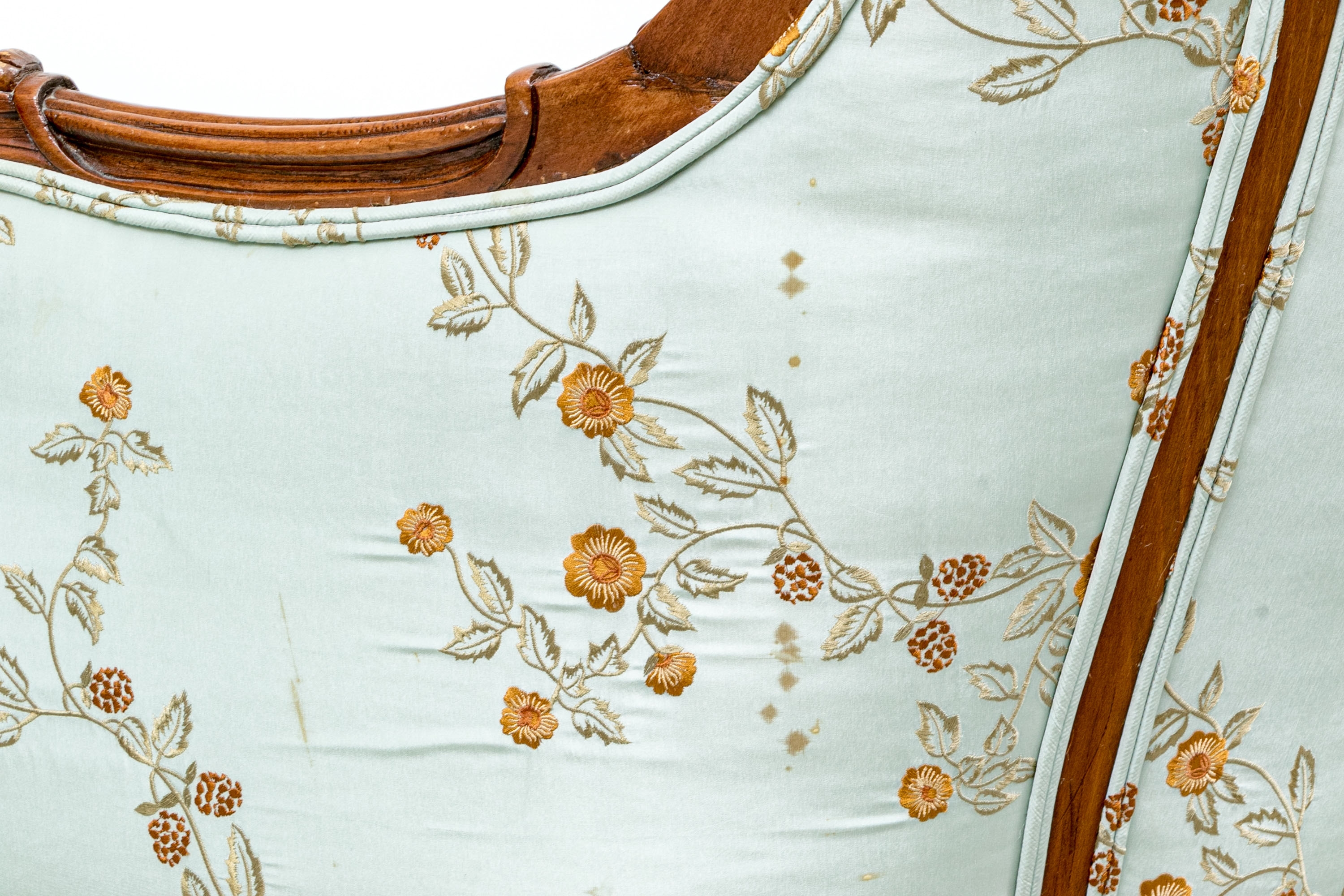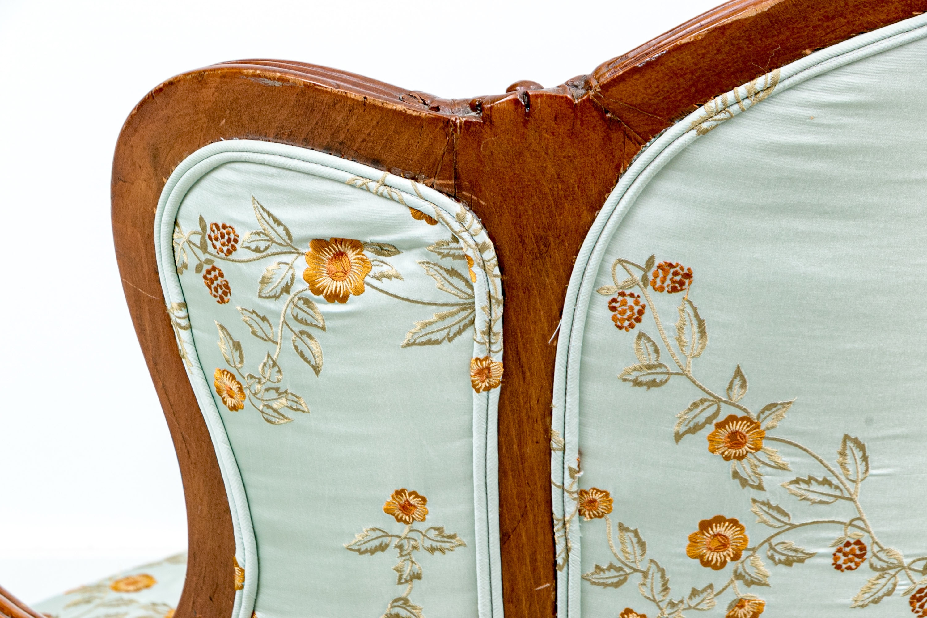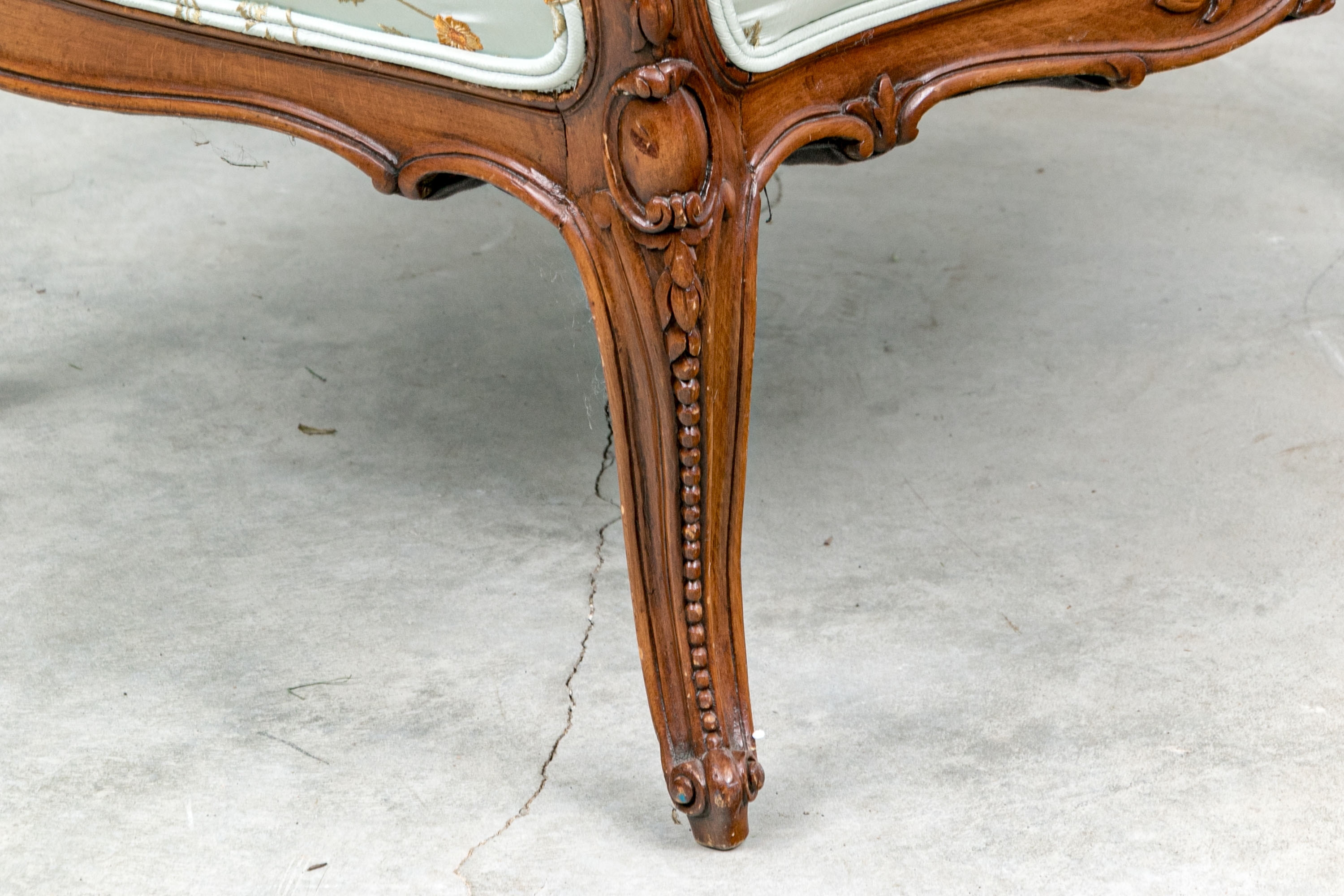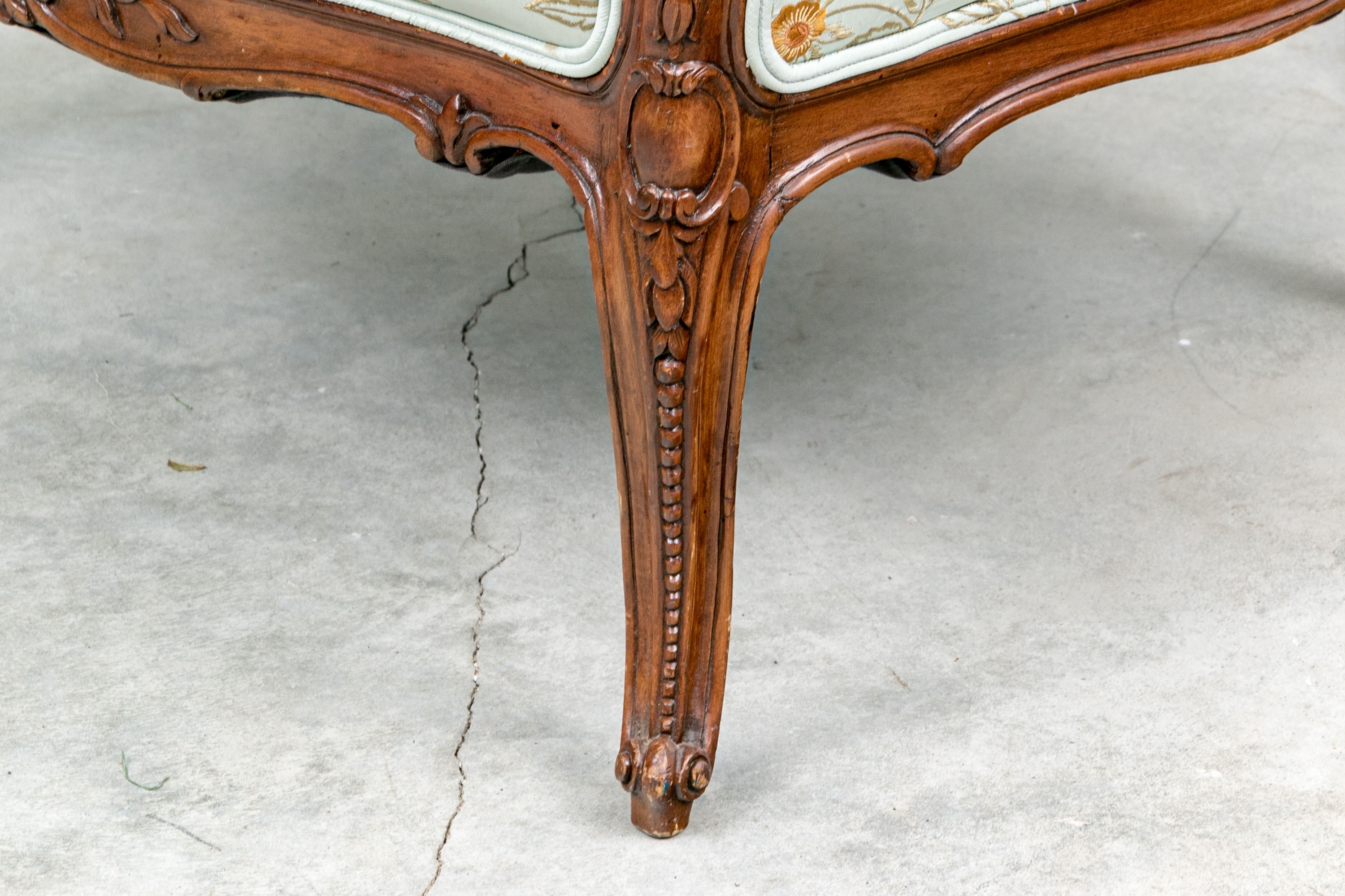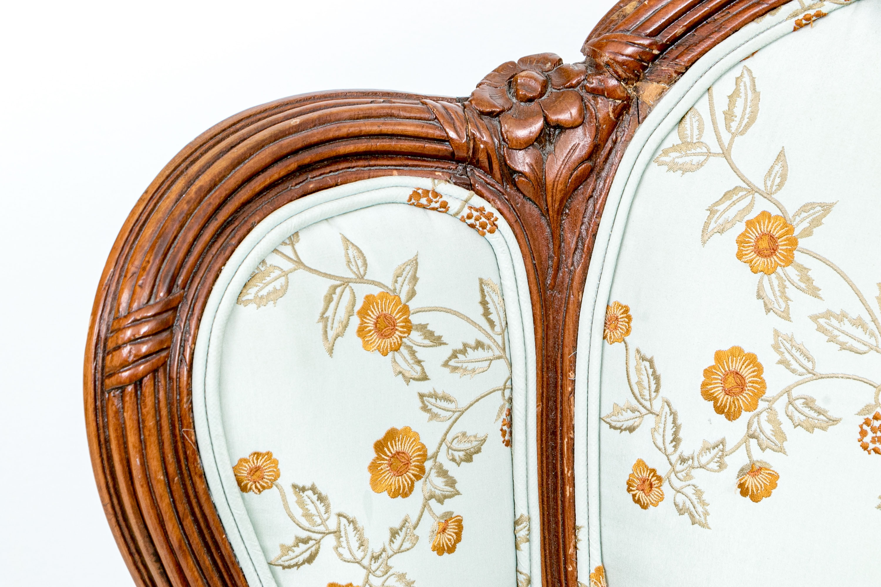 A Louis XV style French country wing chair with carved and ribbed leafy frame. With a floral decorated crest rail and shaped arms with scrolled ends. The seat rail with complementary carved leaves. The cabriole legs with carved beaded details, medallions and scrolled feet. Upholstered in a lovely silky pale blue fabric with orange flowers and berries.