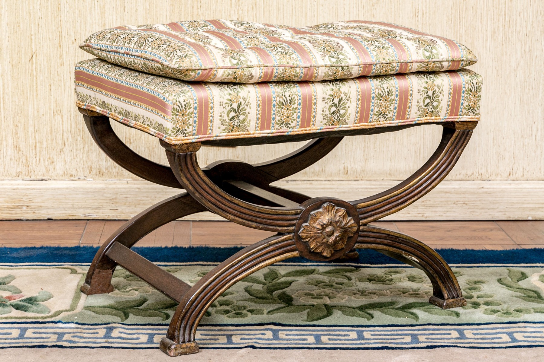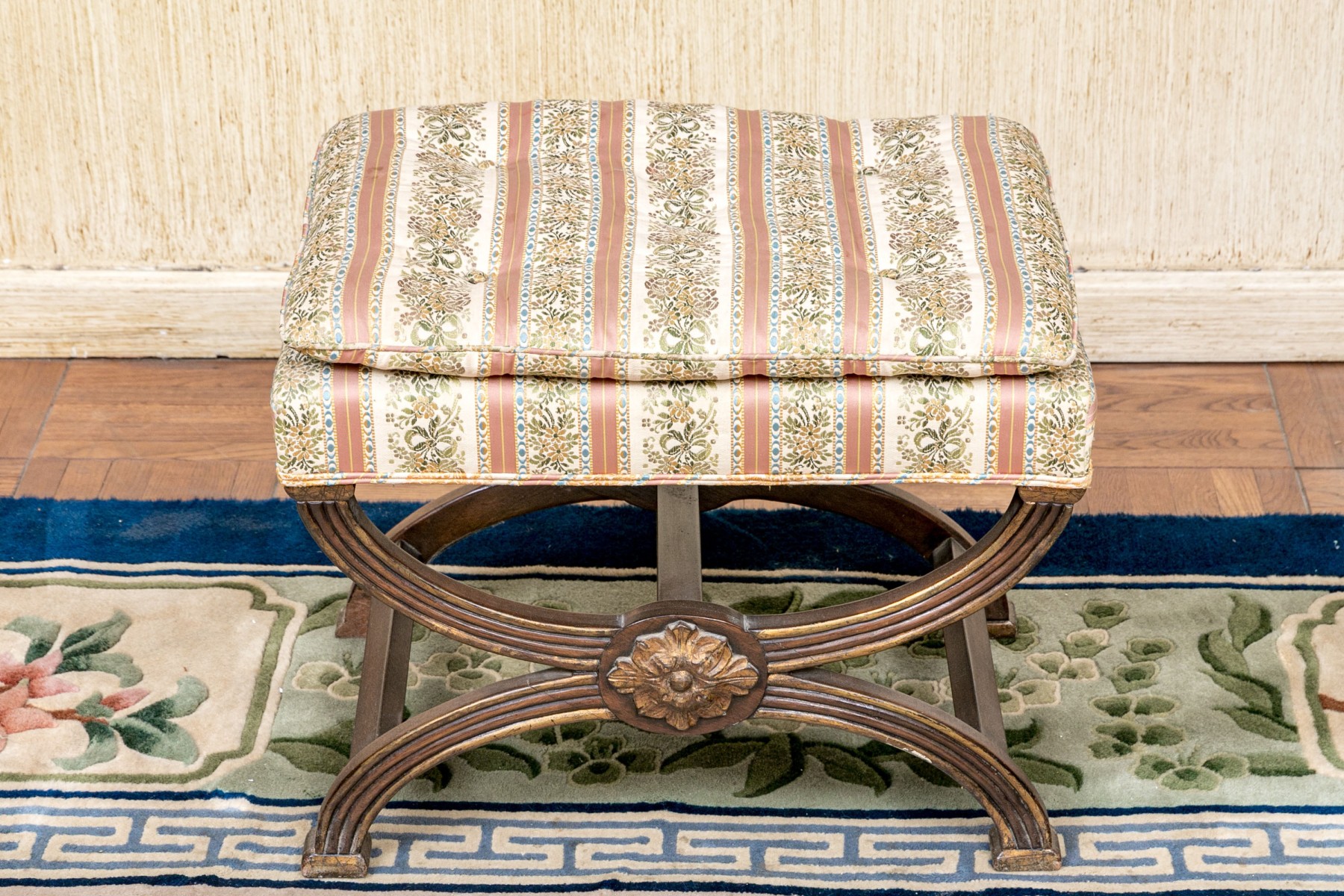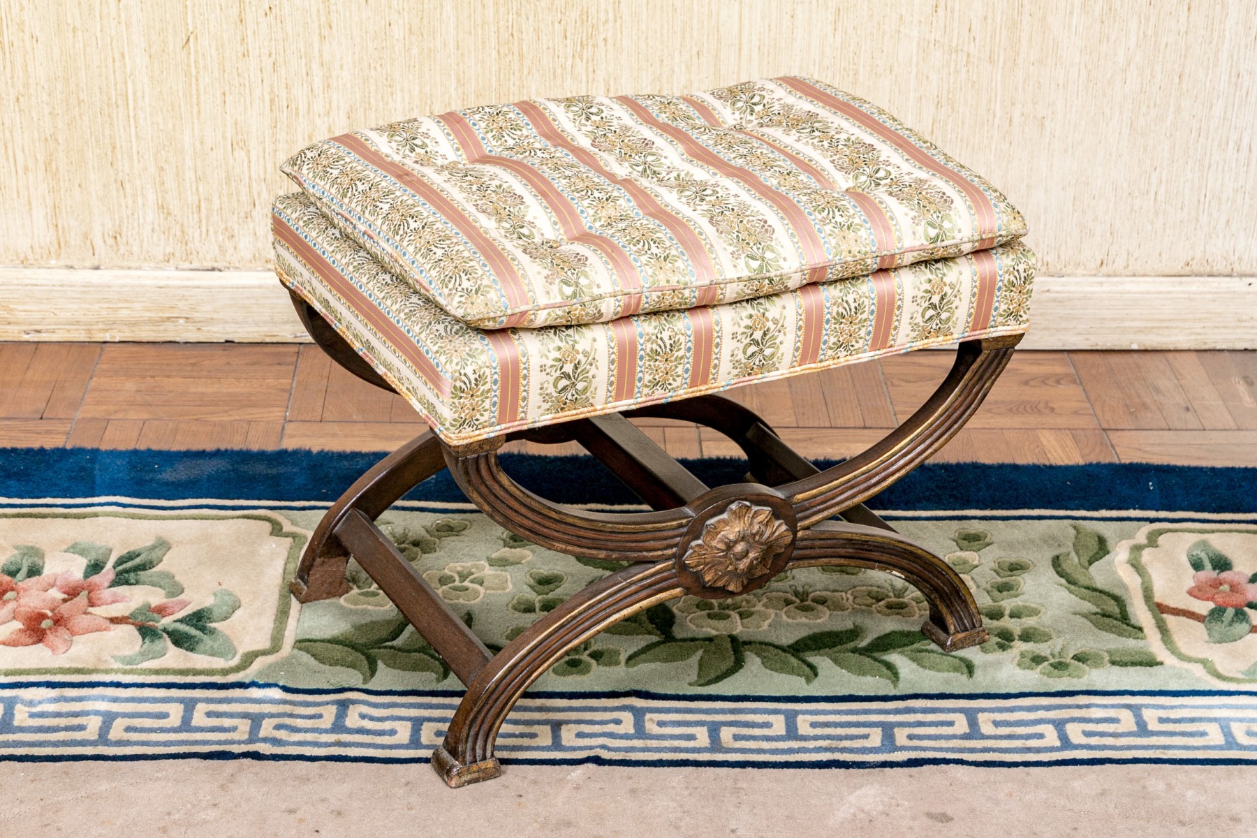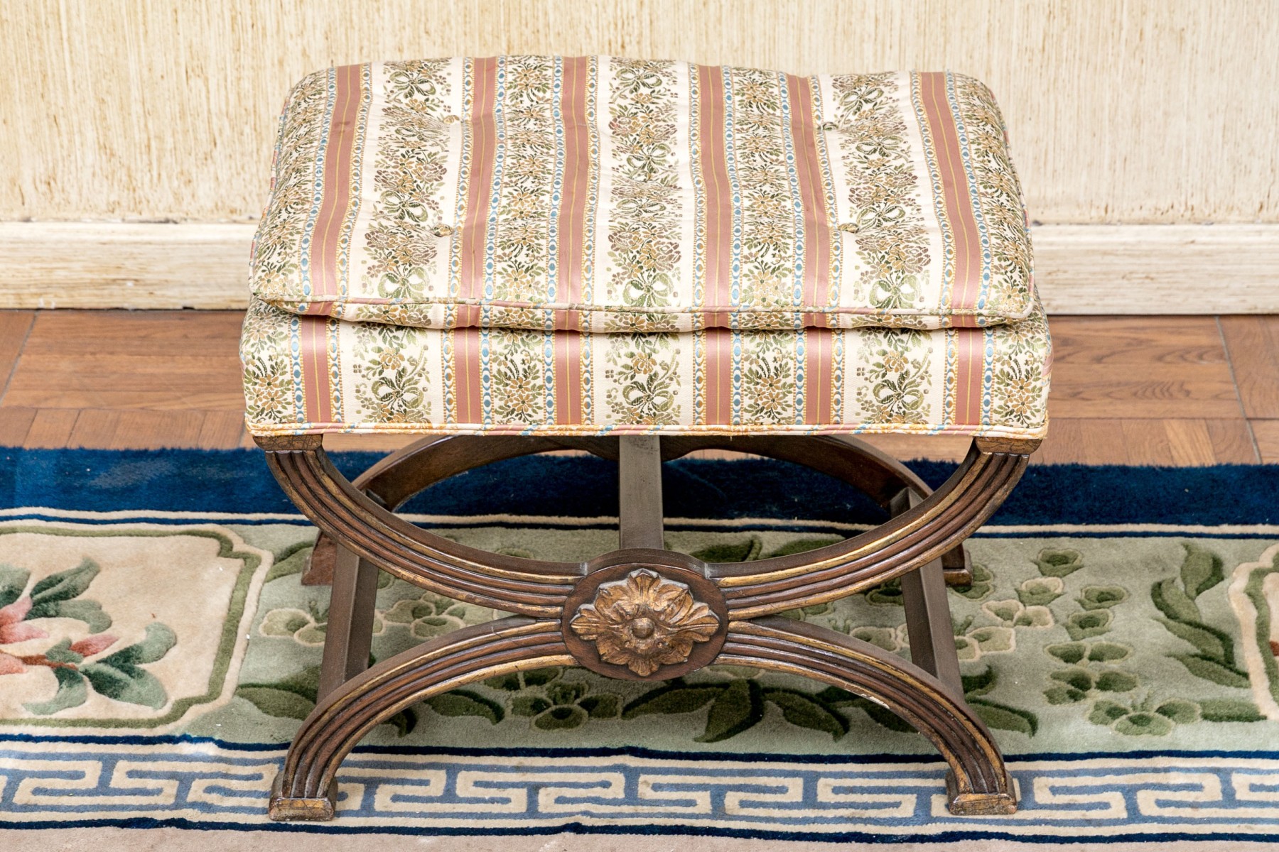 The carved reeded X frame with parcel gilt details and gilt leafy bosses. The seat upholstered in a button tufted pastel ribbon band fabric.