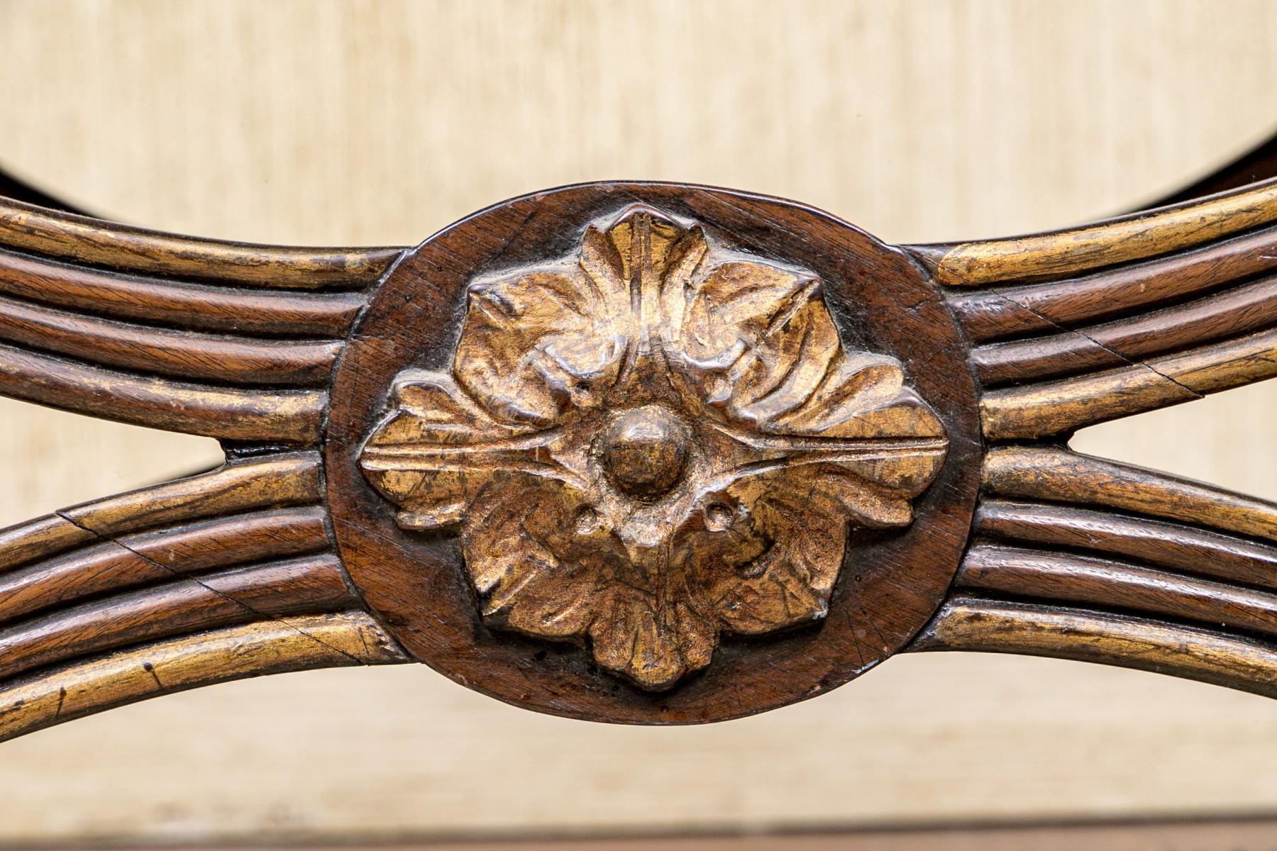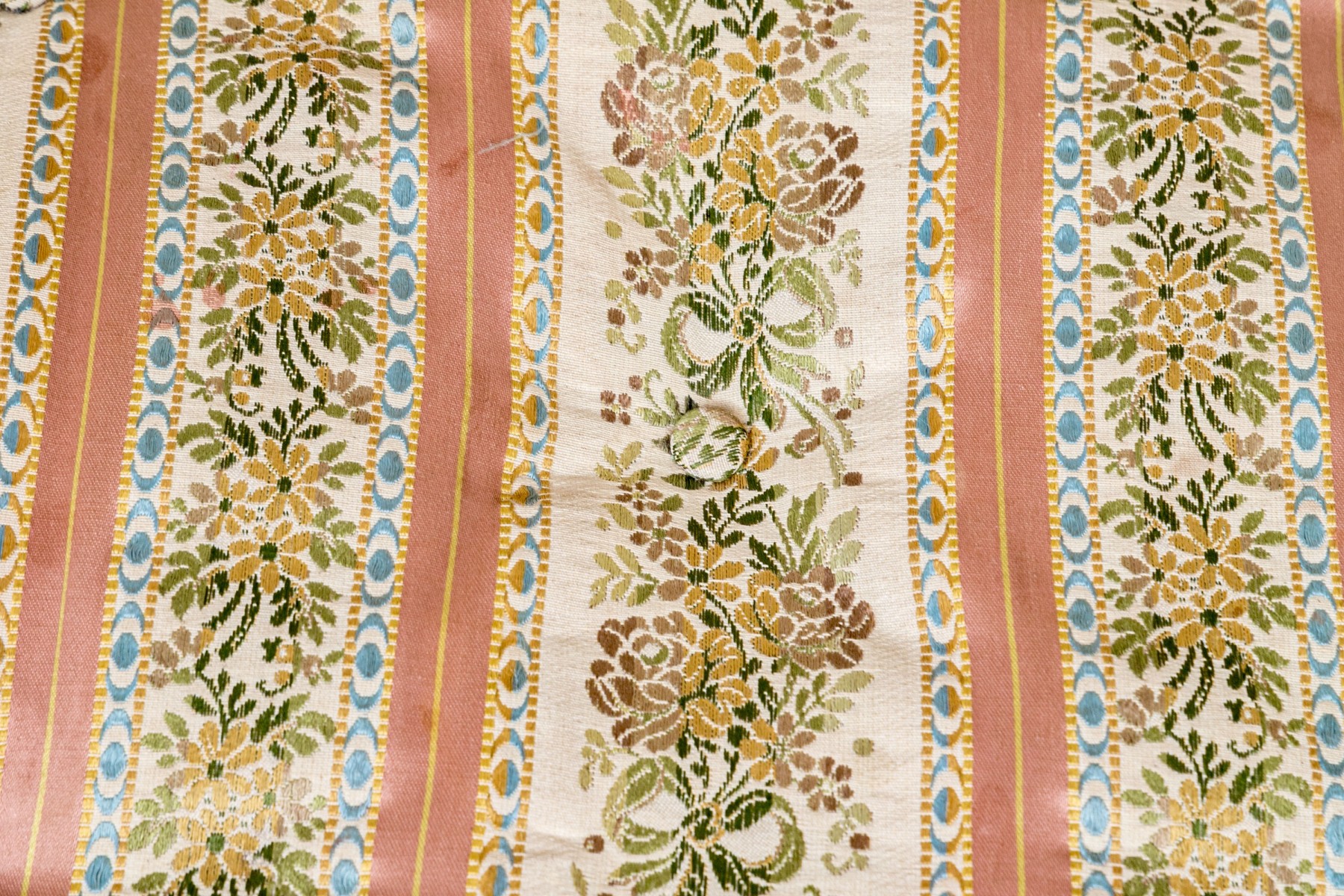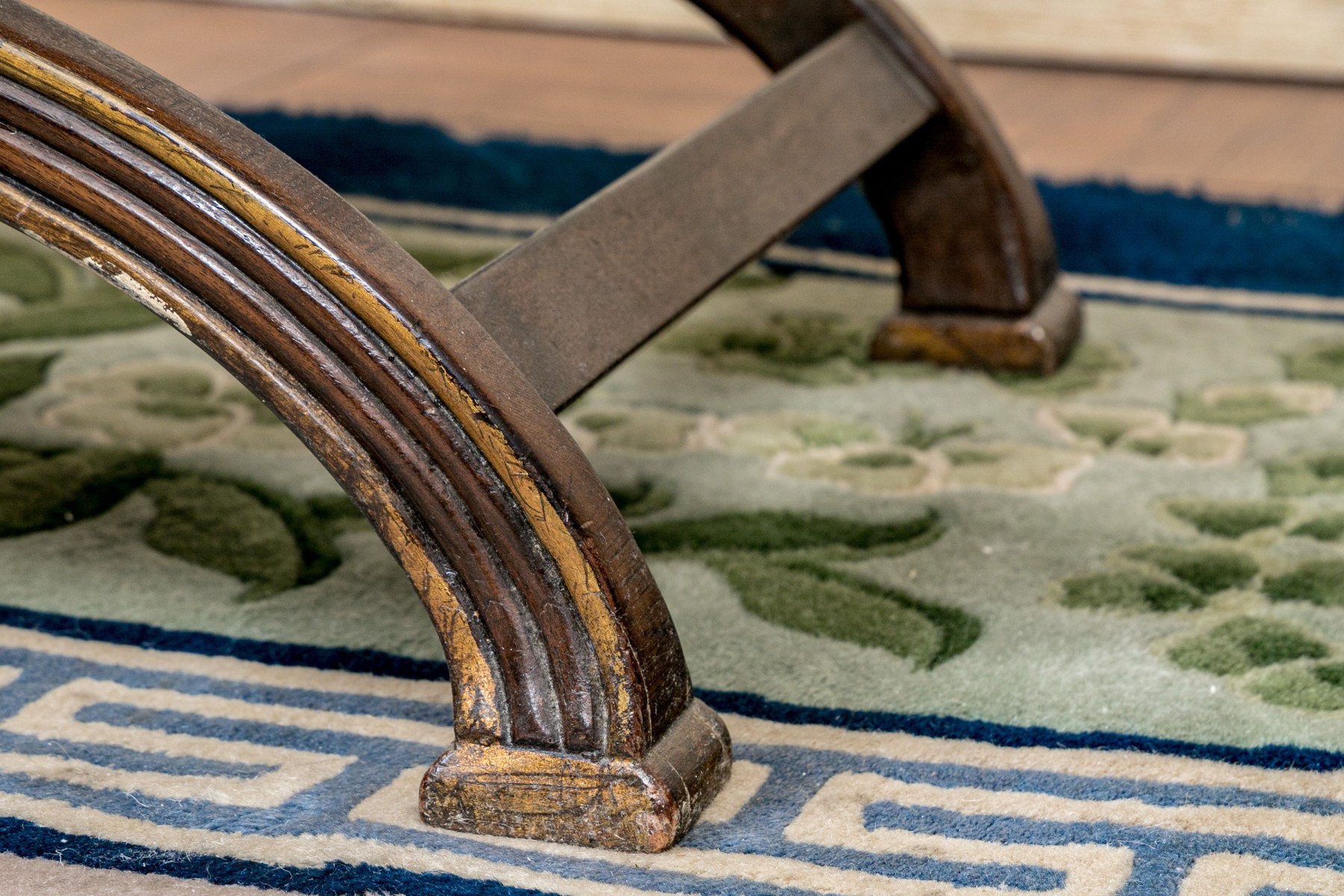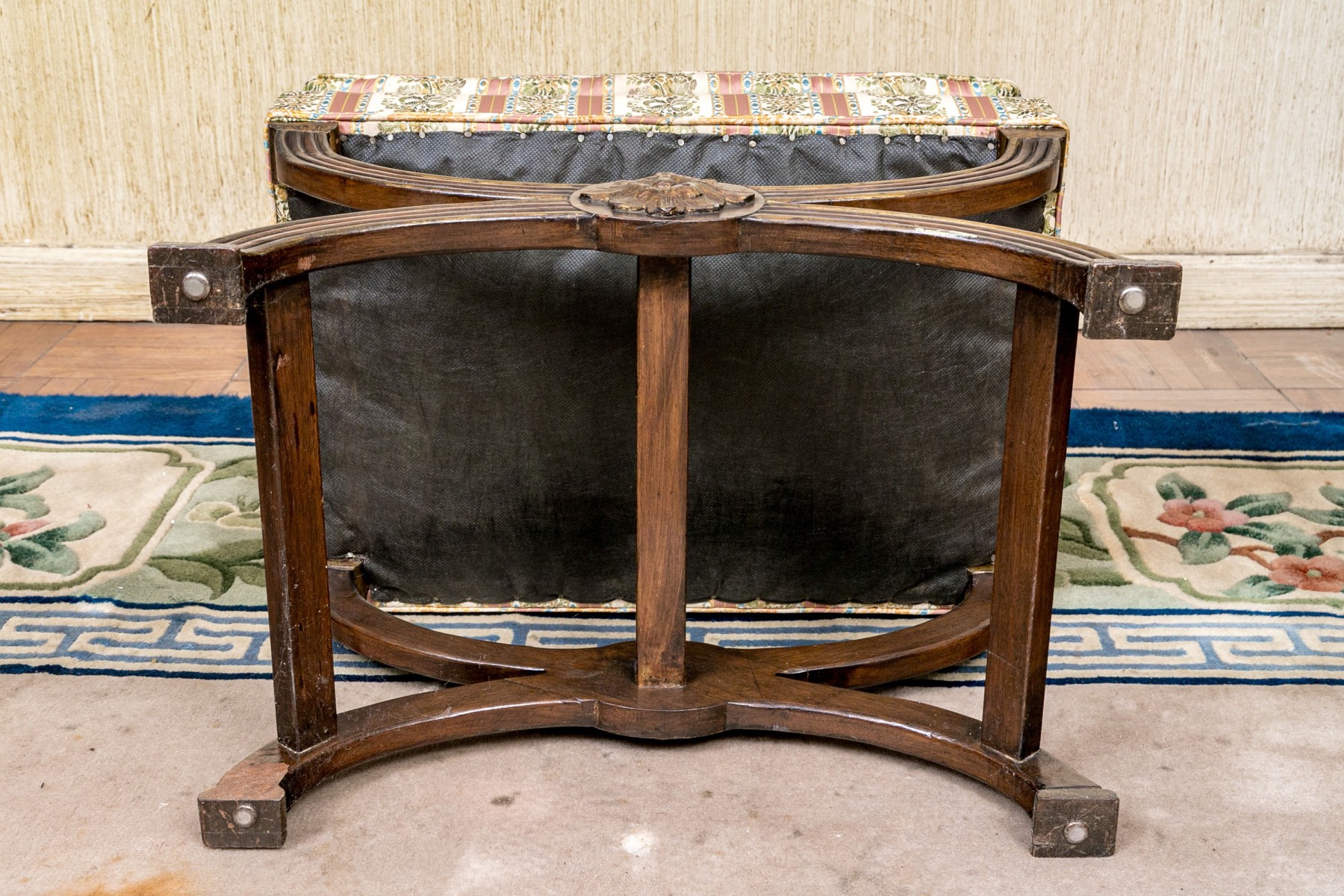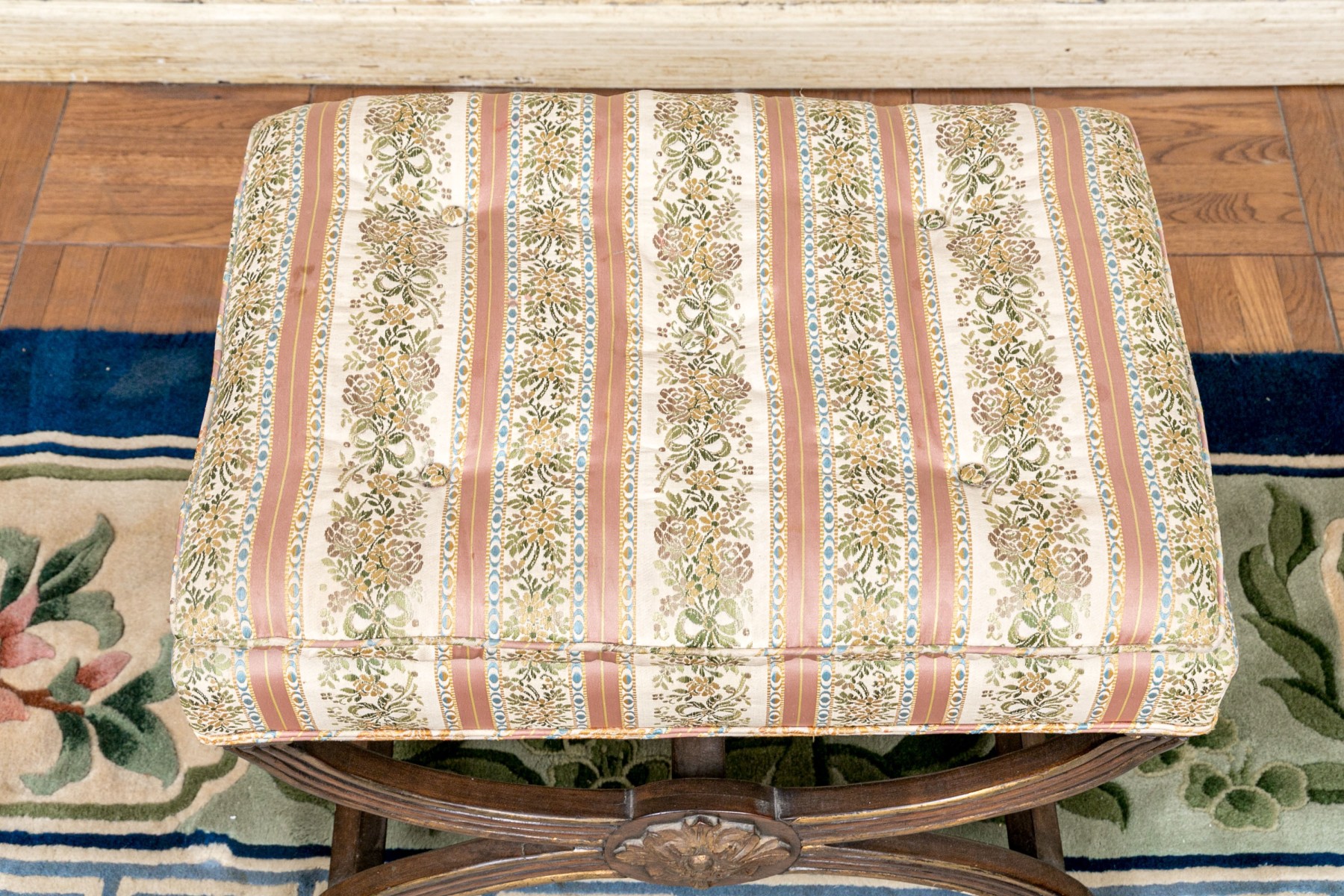 The carved reeded X frame with parcel gilt details and gilt leafy bosses. The seat upholstered in a button tufted pastel ribbon band fabric.