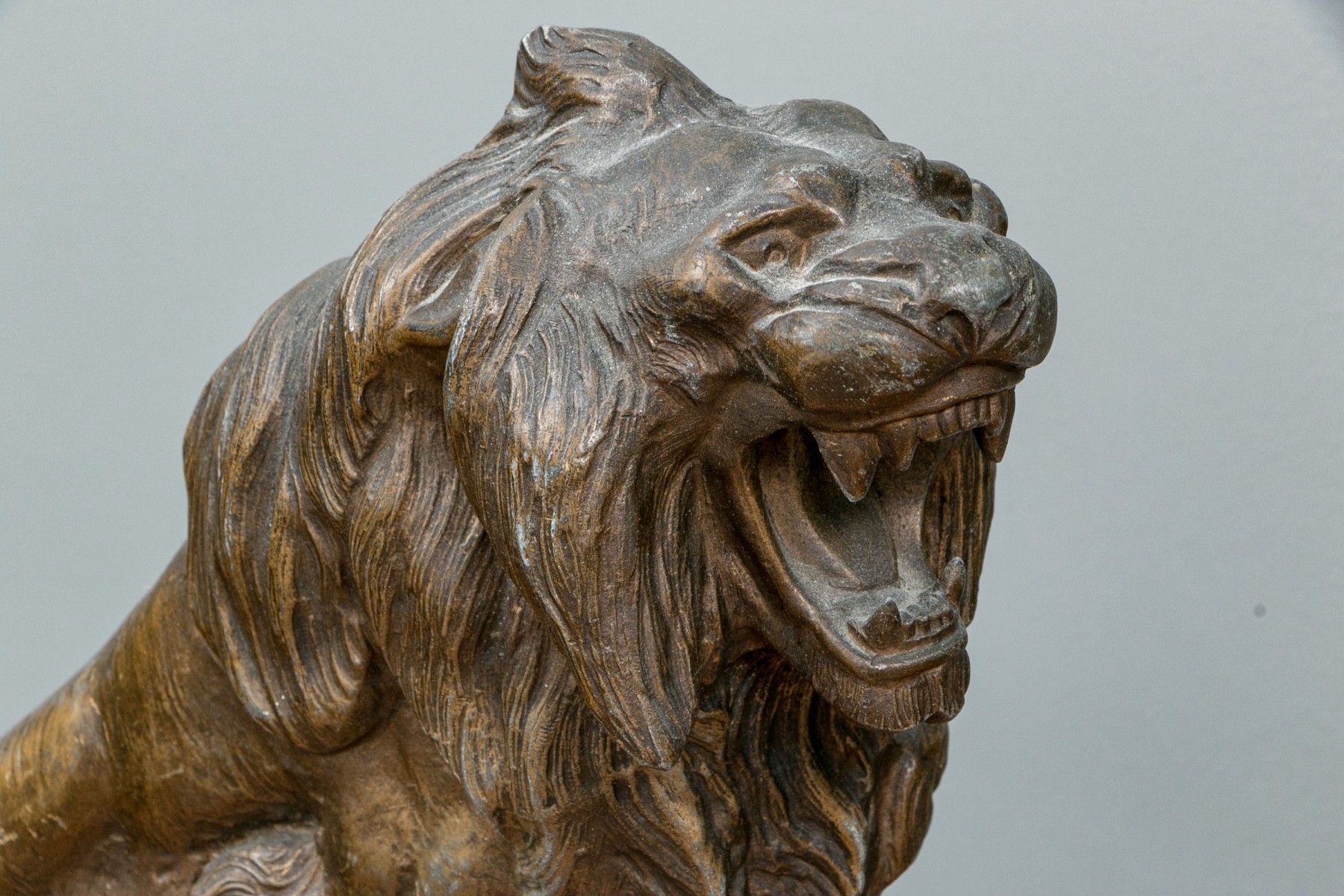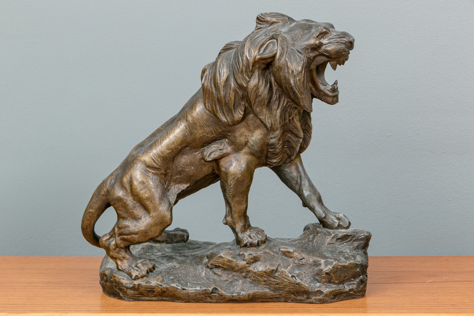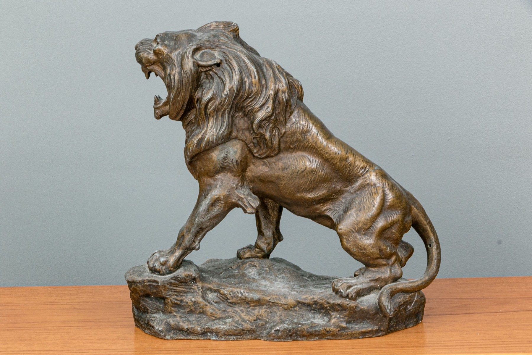 Unmarked. A large standing lion on a rocky base roaring at an enemy. In a patinated finish.