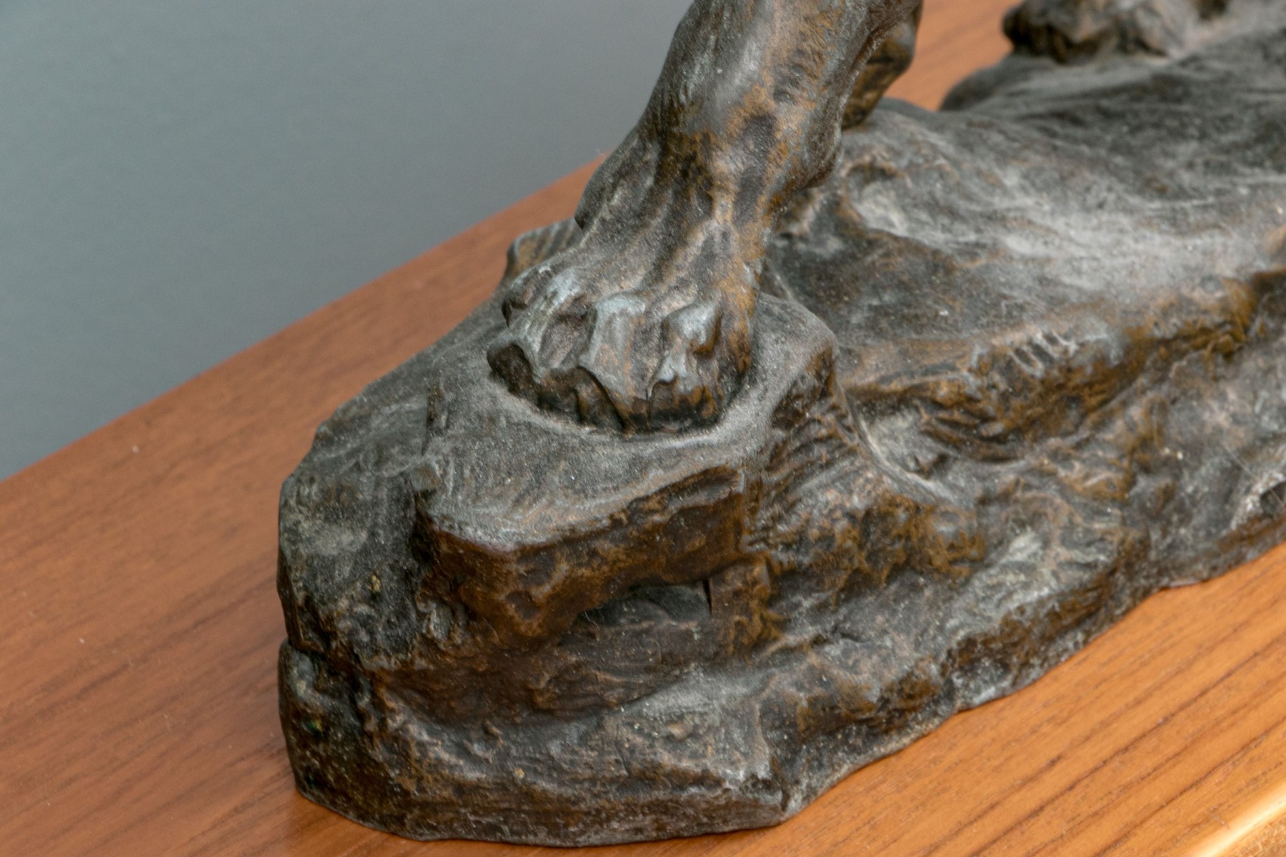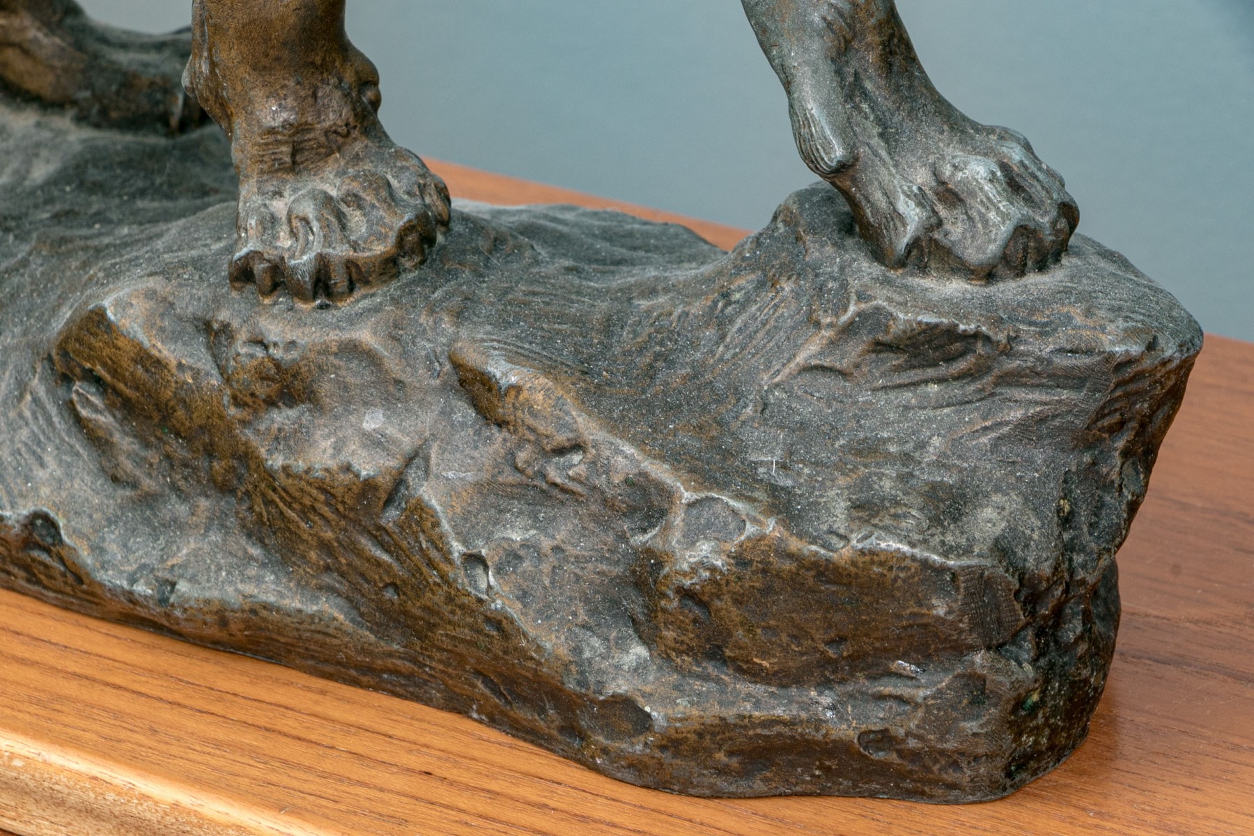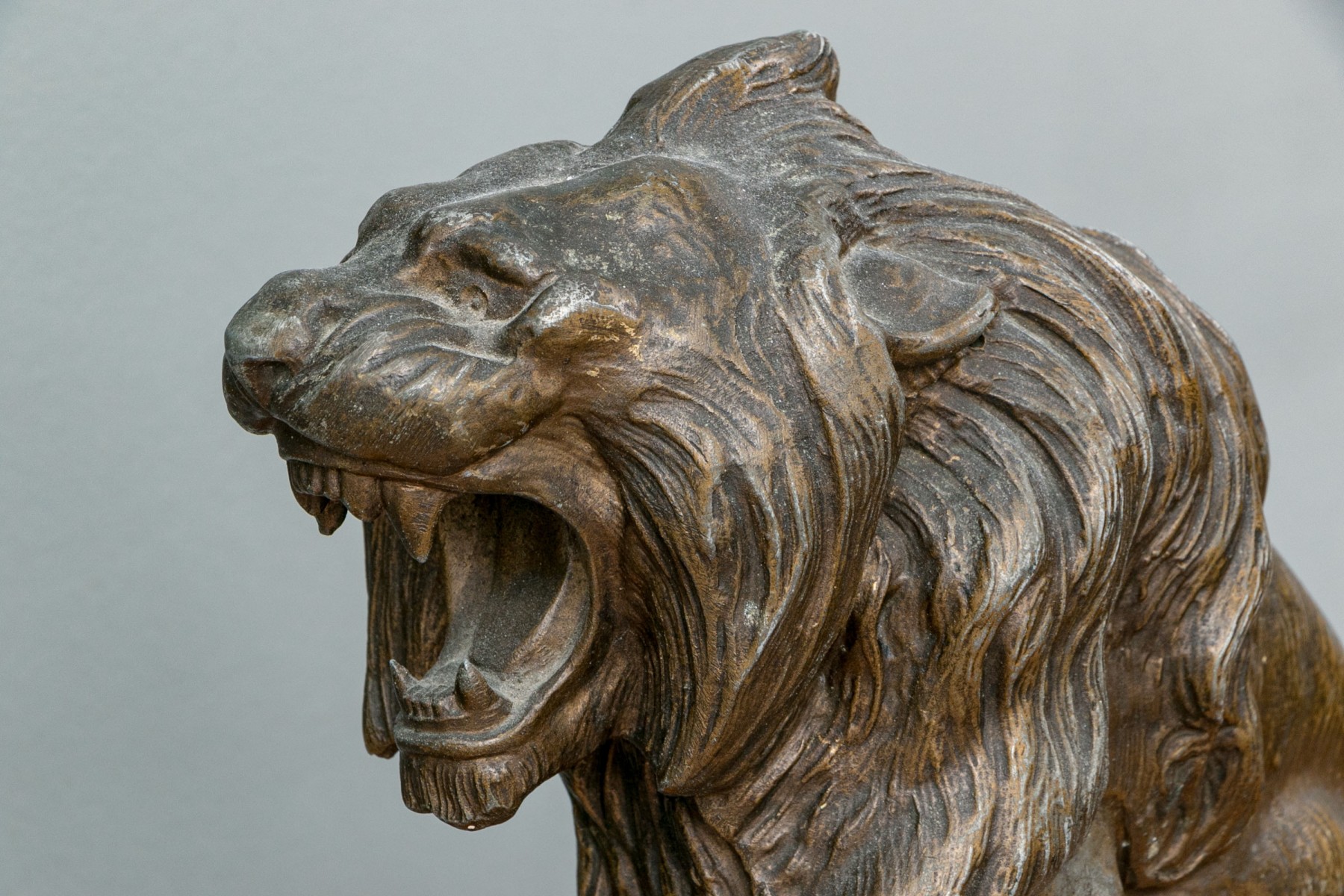 Unmarked. A large standing lion on a rocky base roaring at an enemy. In a patinated finish.