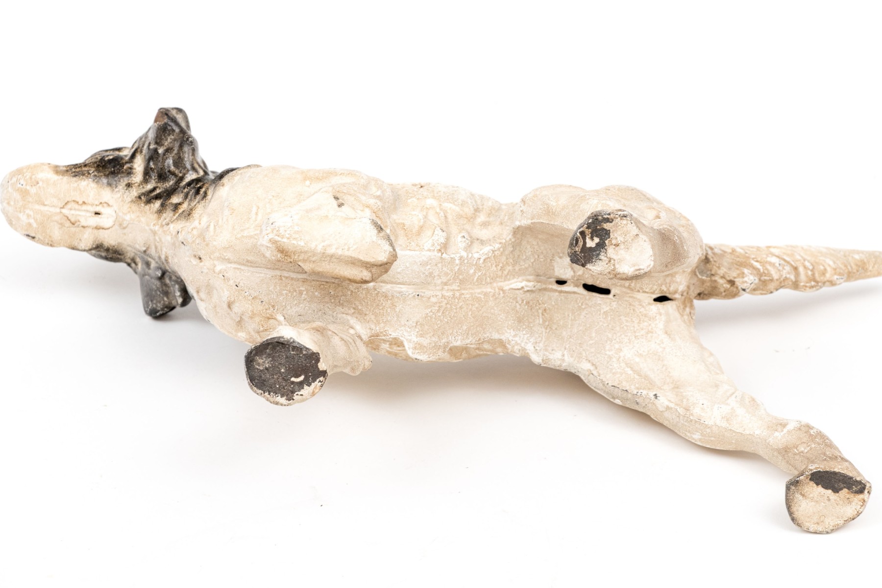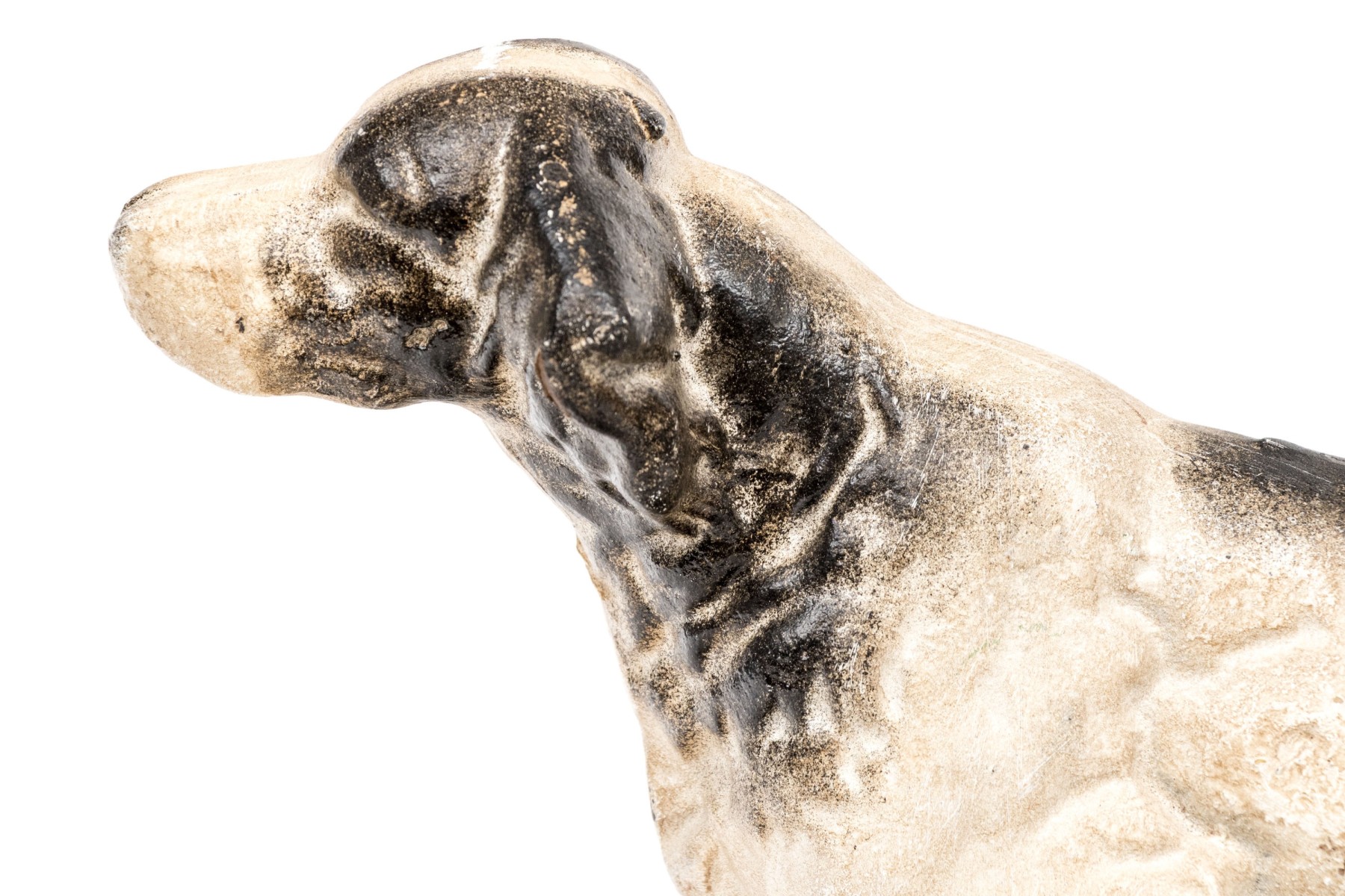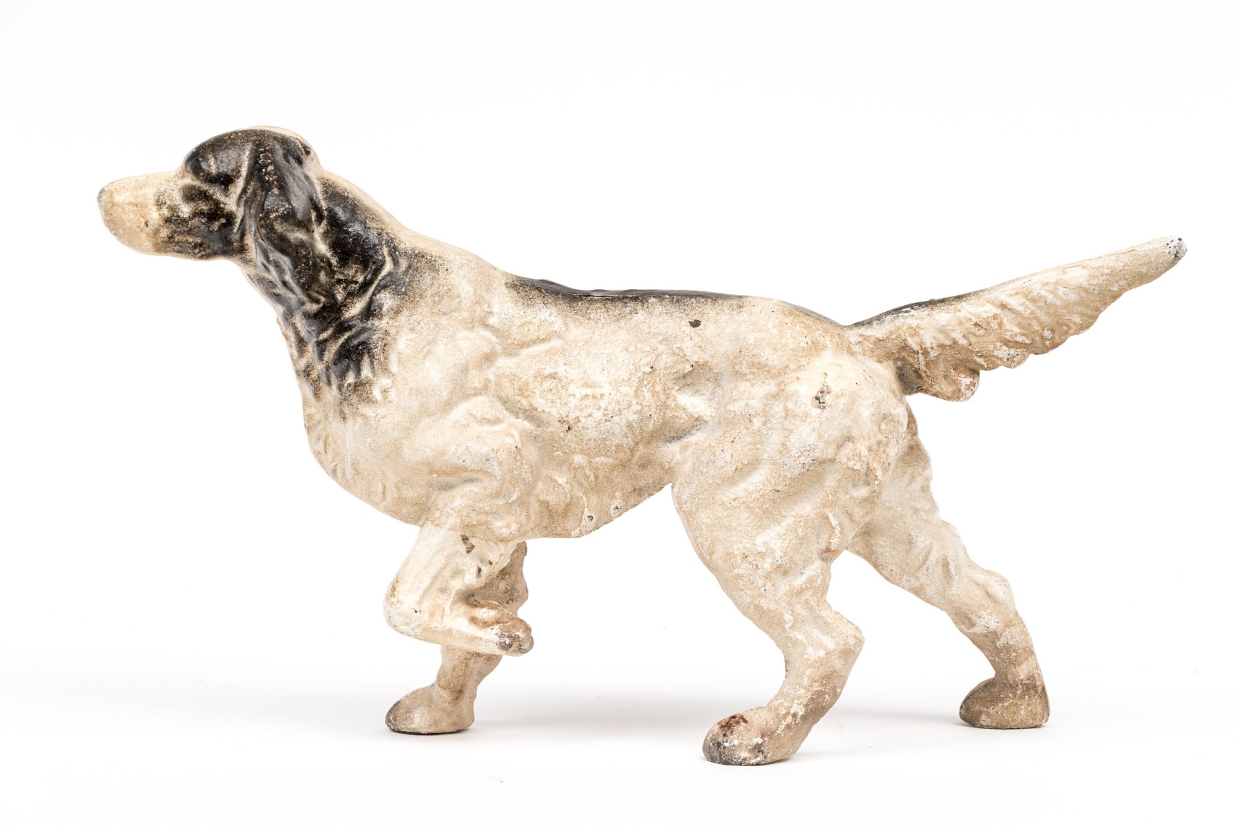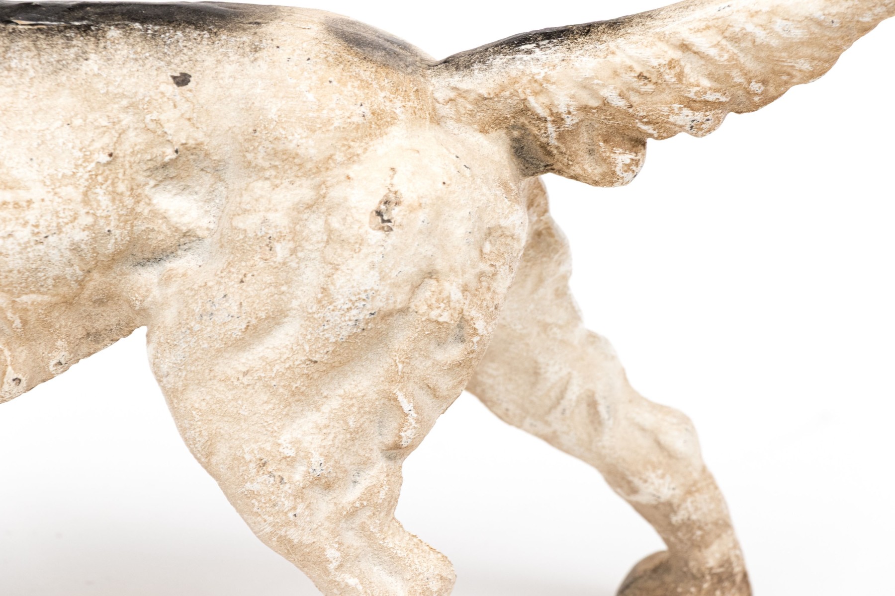 A wonderful vintage cast iron doorstop in the form of a setter dog posed pointing with head forward and tail straight, one front paw raised. Beautifully detailed and finished in white and black.