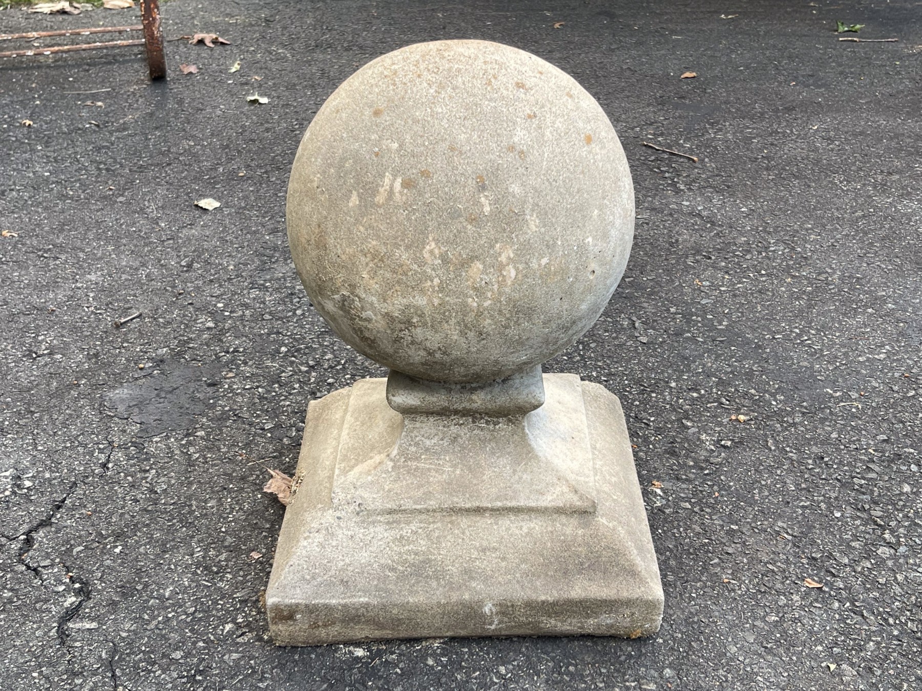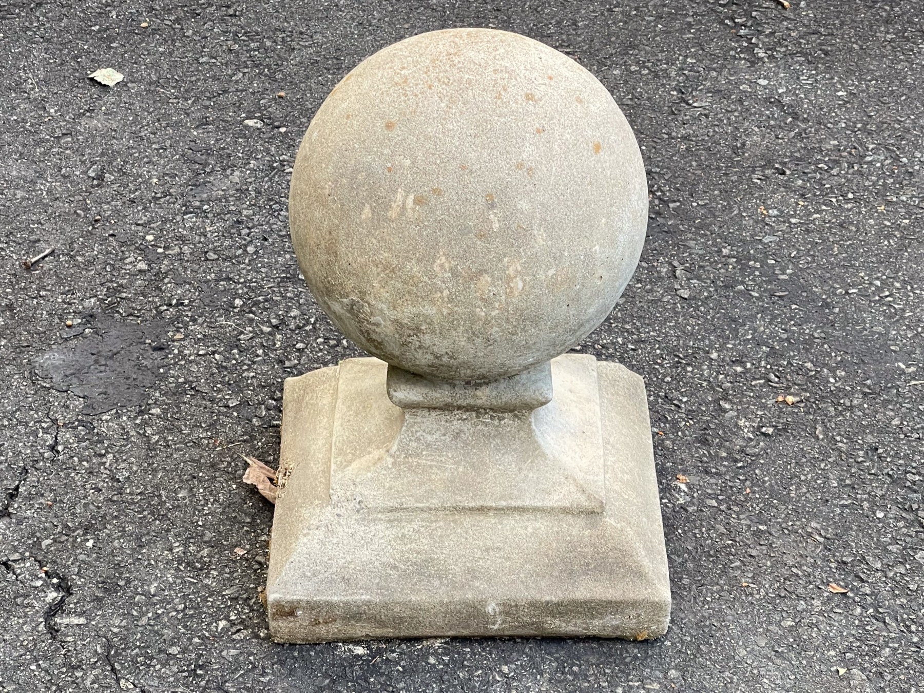 A vintage cast stone architectural ornament, in the form of a ball or globe set upon a square form, tapered pedestal. The ornament or finial can be used in a multitude of decorative manners to your liking, only limited by imagination.