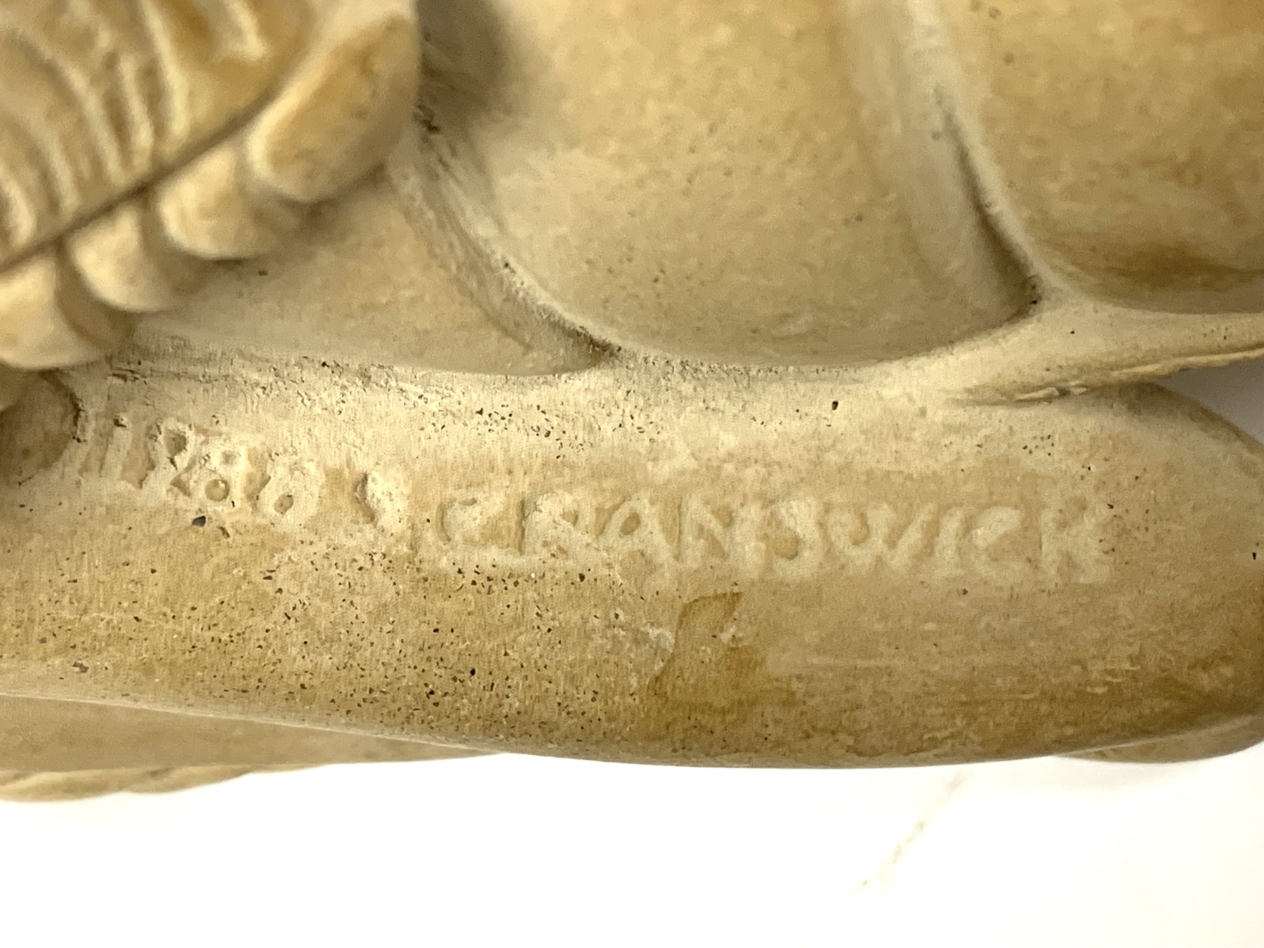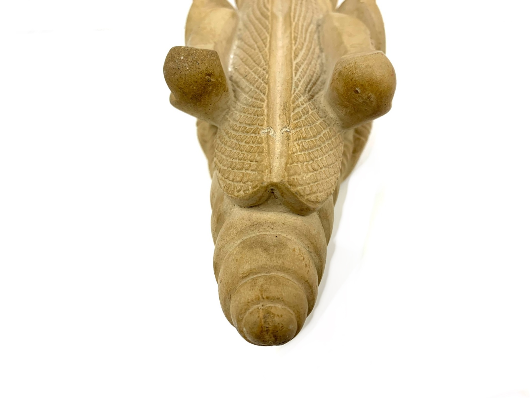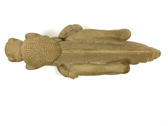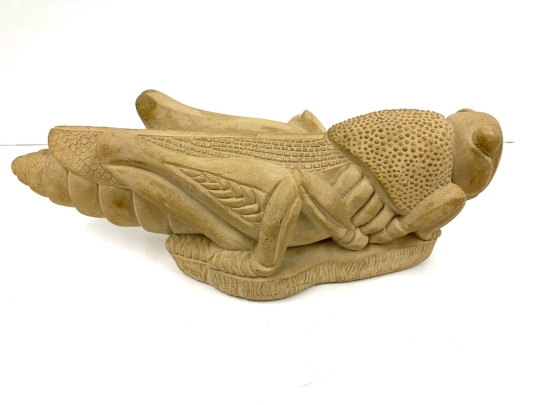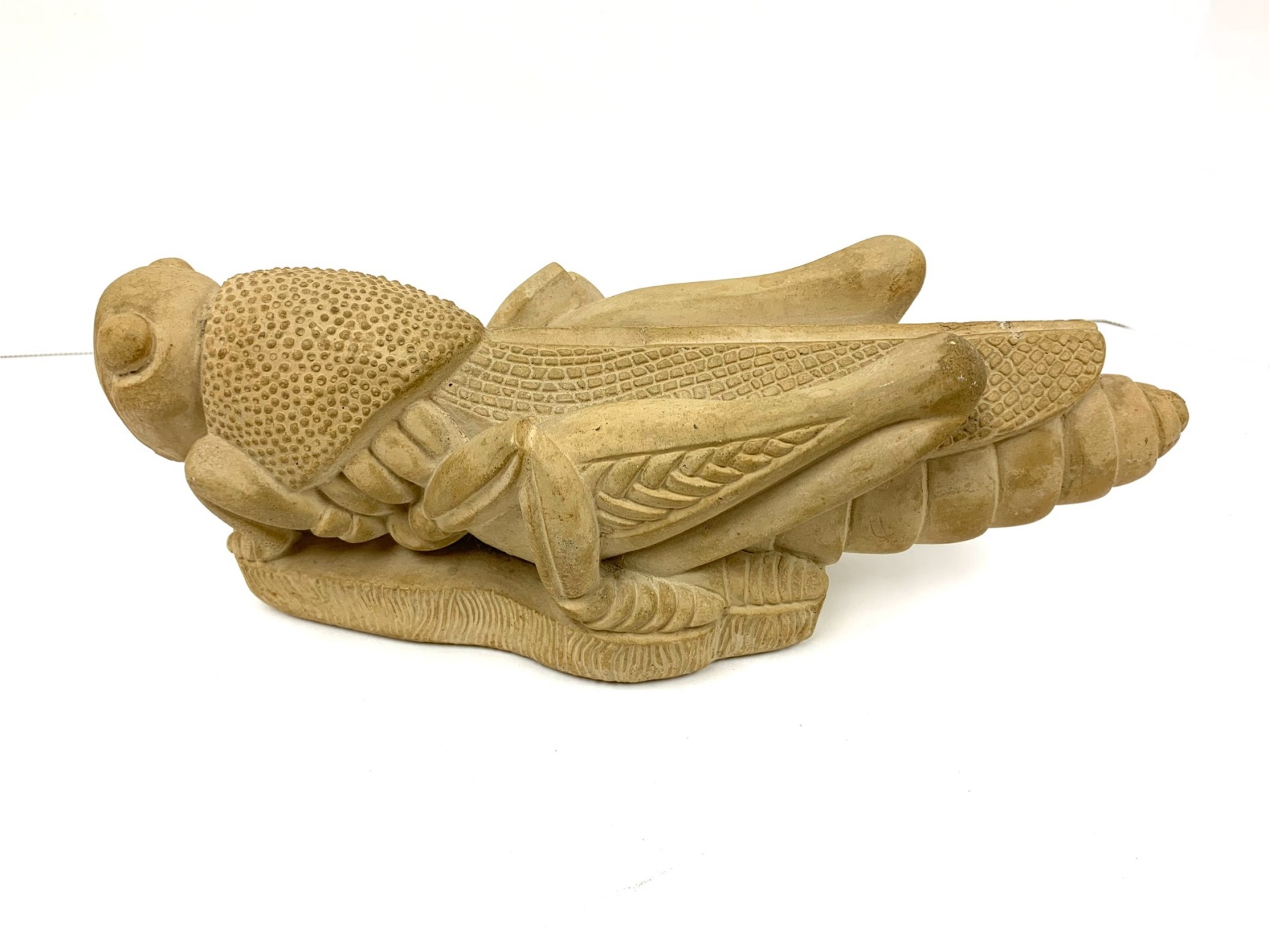 Cast stone grasshopper figure surmounted on a conforming plinth base, The grasshopper nicely detailed and textured in a sand color stain. Signed in mold and dated 1988.
