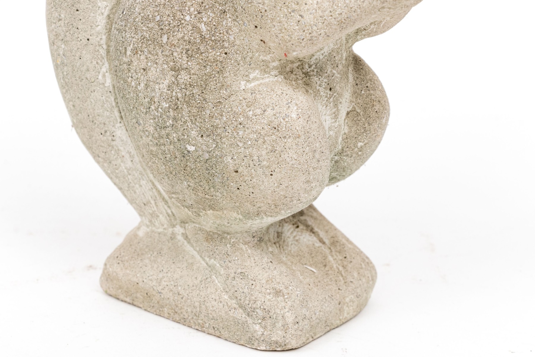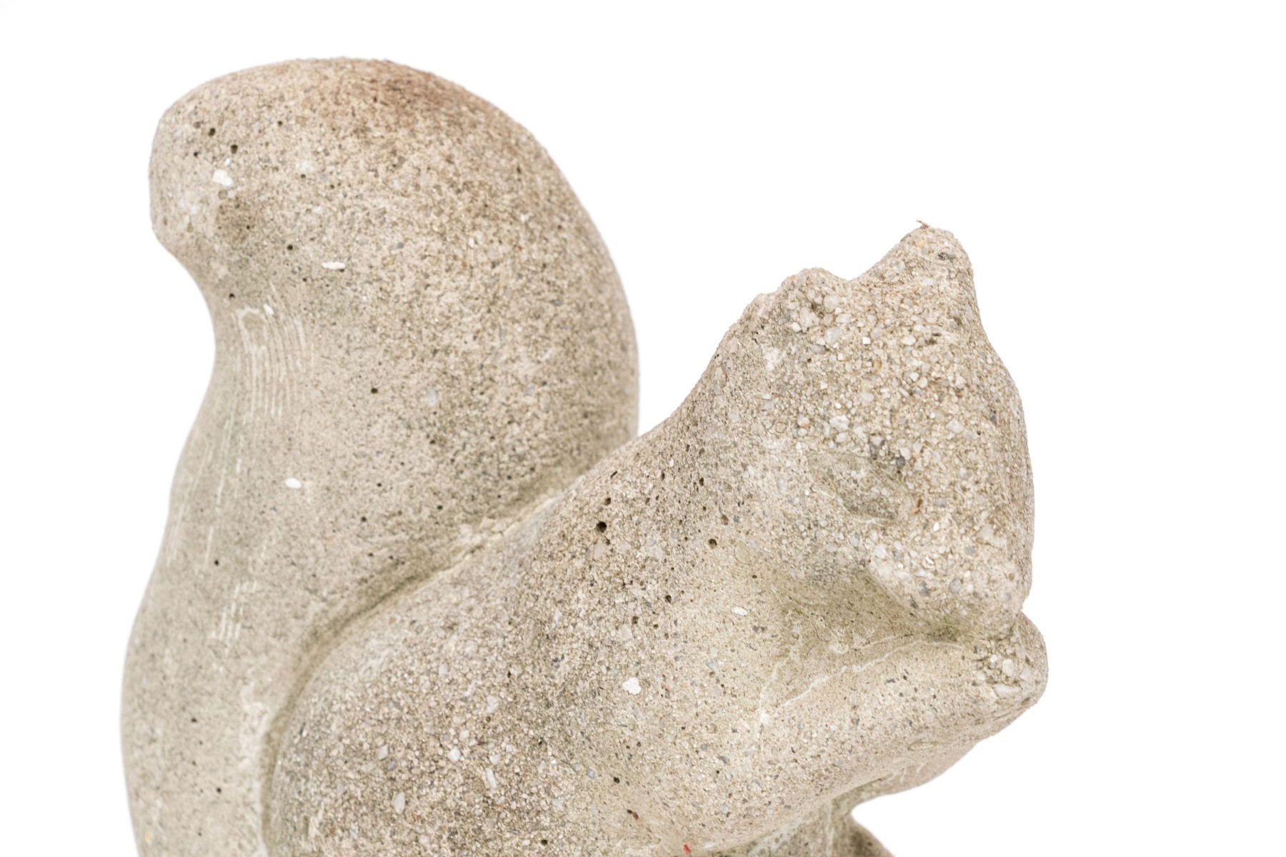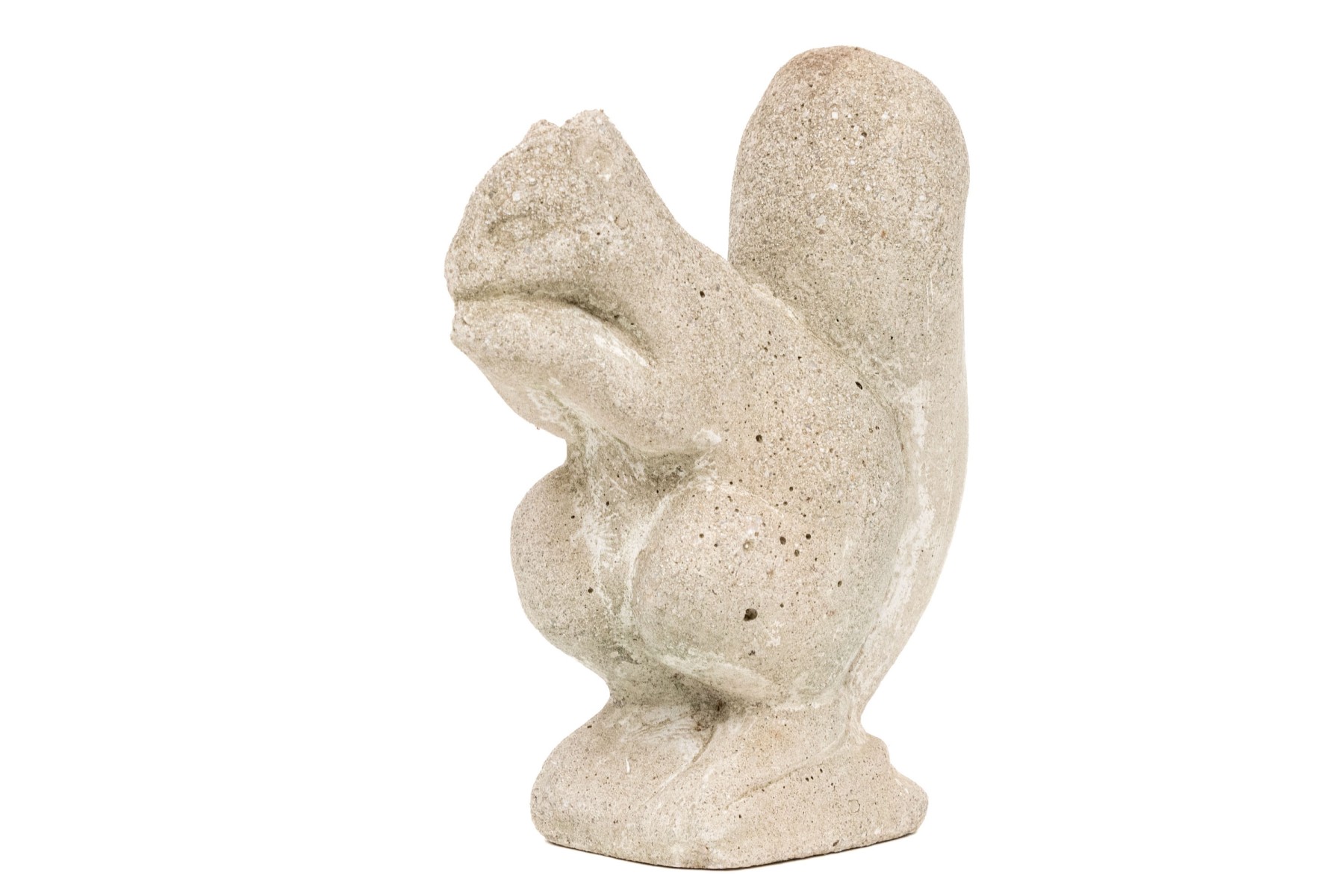 A charming vintage cast stone figure of a squirrel presented standing on its hind legs with its wonderfully voluminous tail behind the squirrel whom is positioned up with its front paws clutched to its mouth as though eating an acorn.