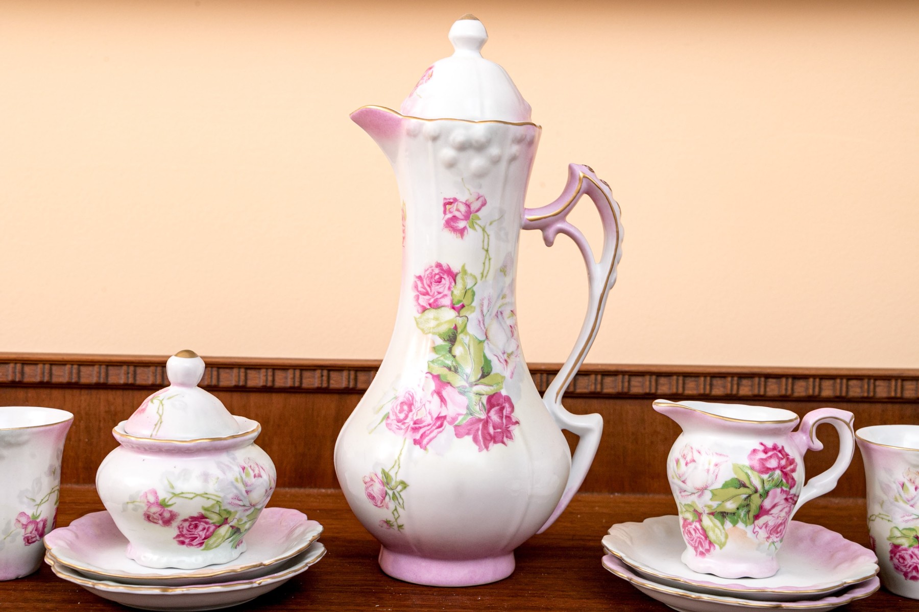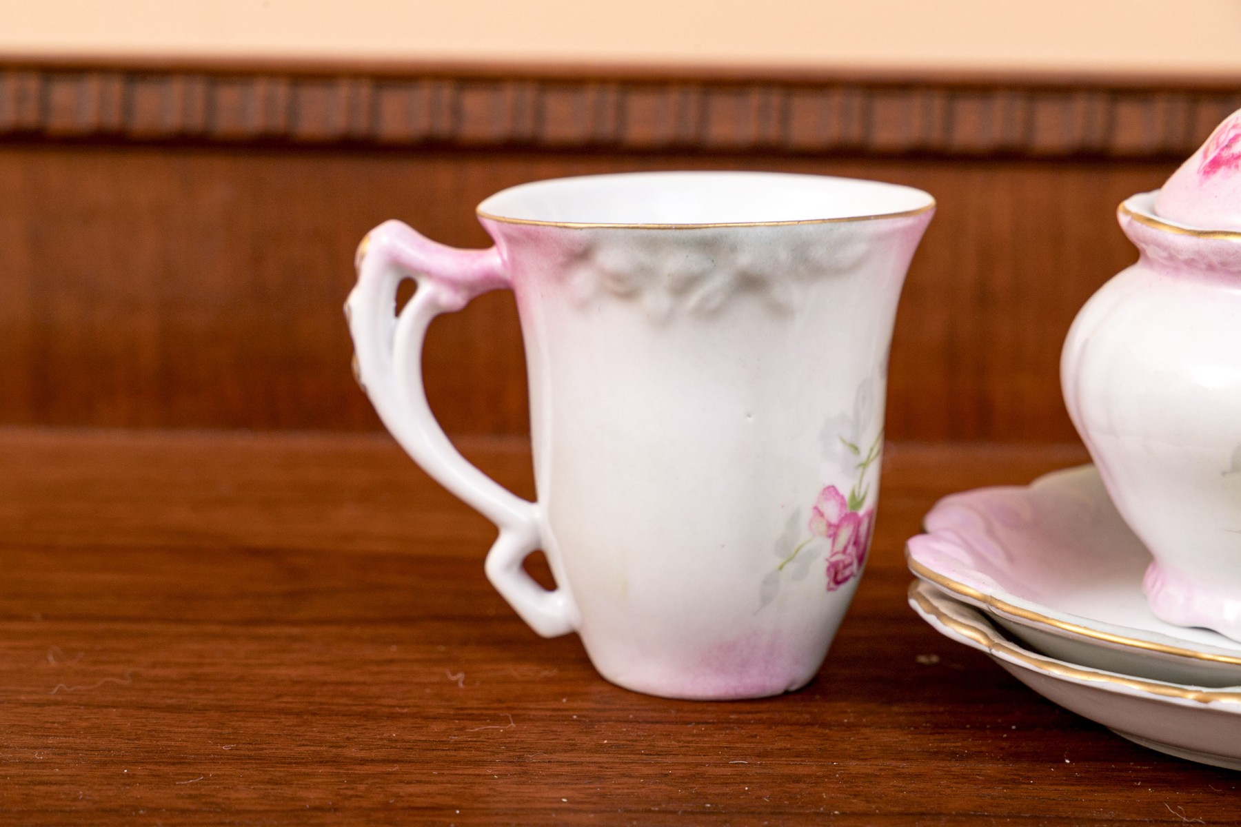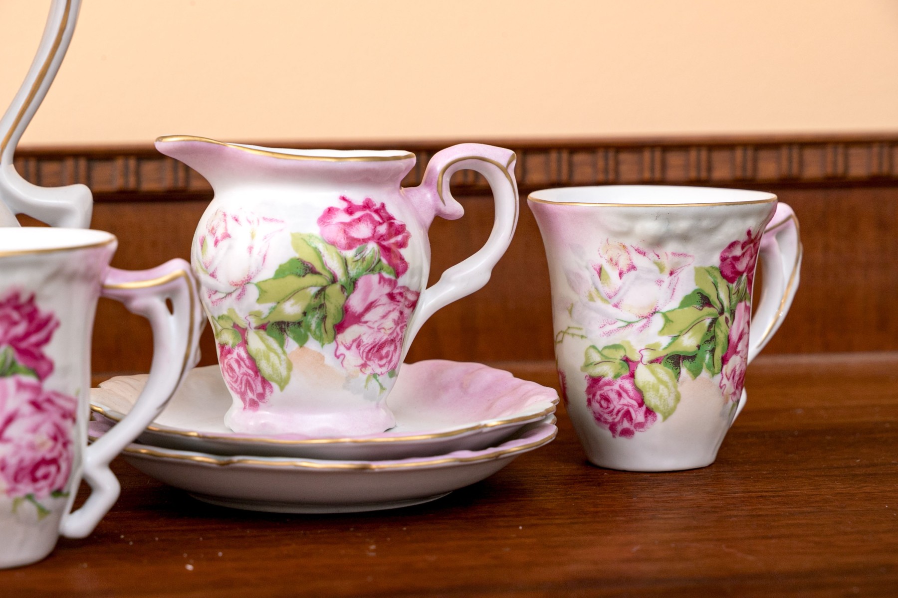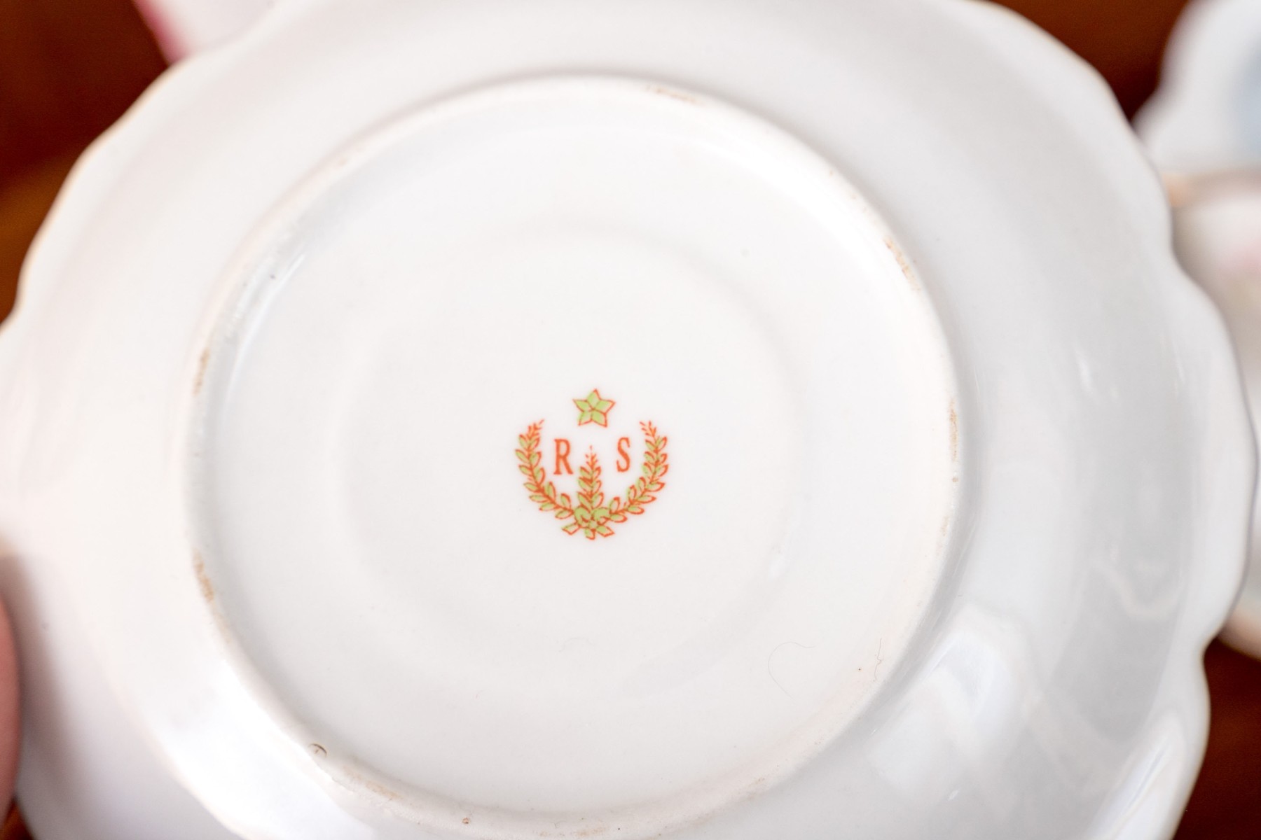 A set of vintage RS reproduction ceramic teaware including a teapot, creamer, lidded sugar bowl, four teacups, and four saucers.