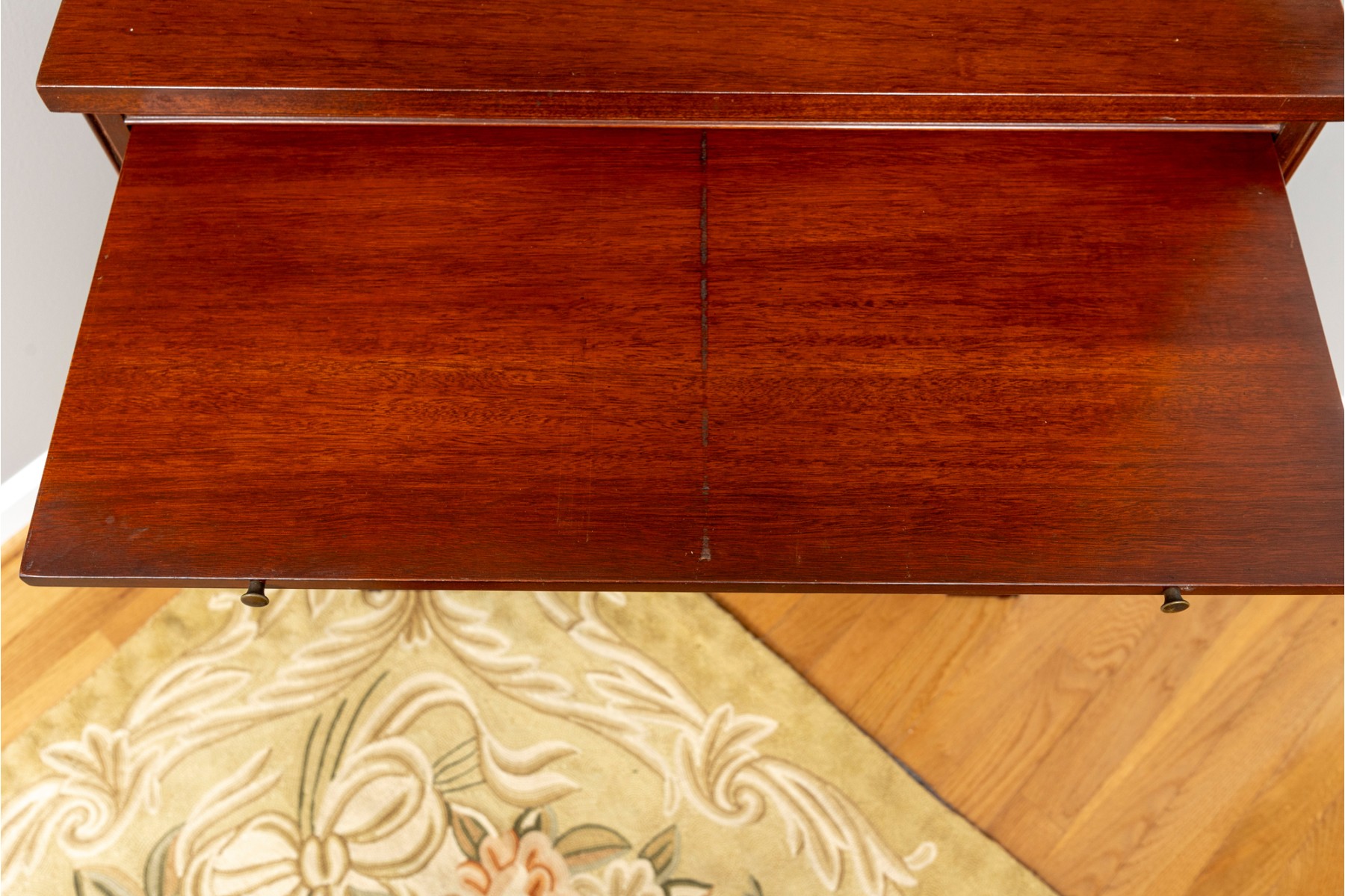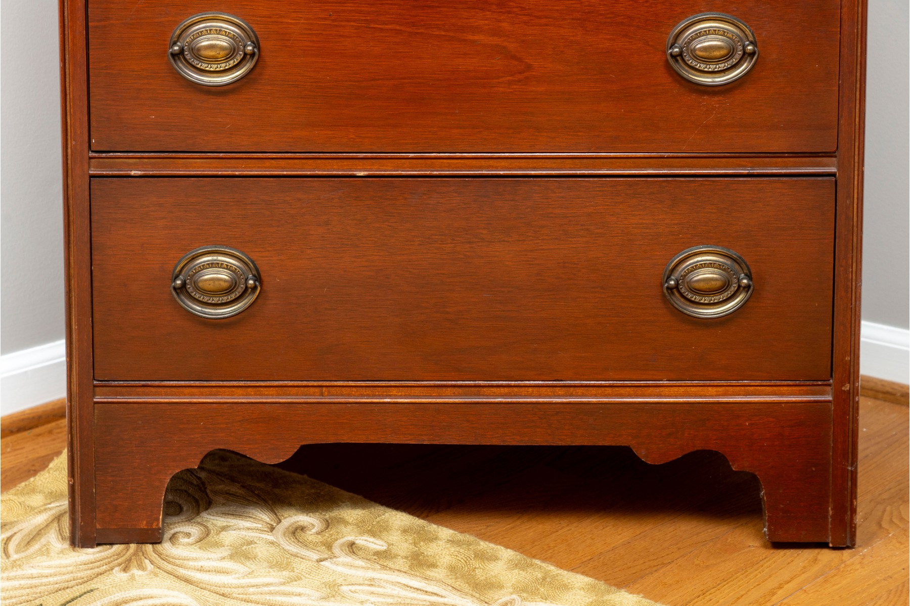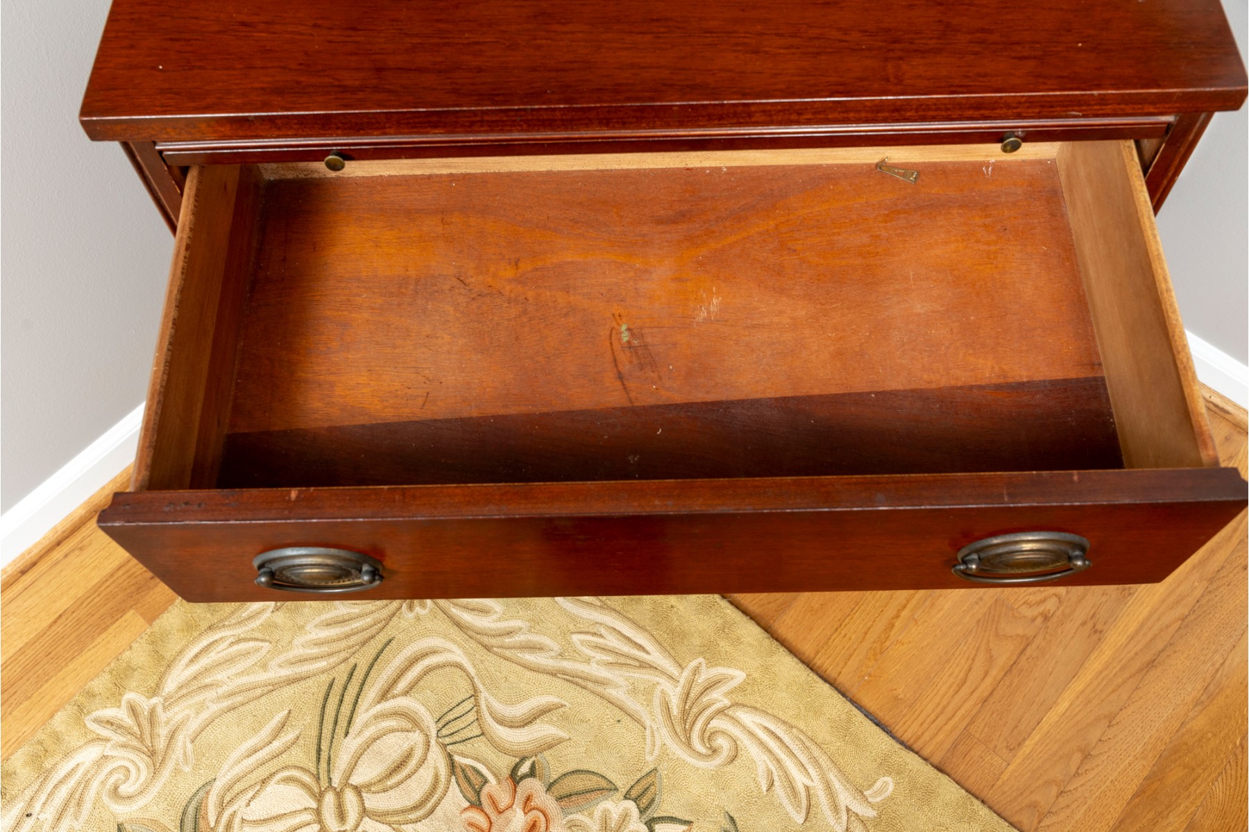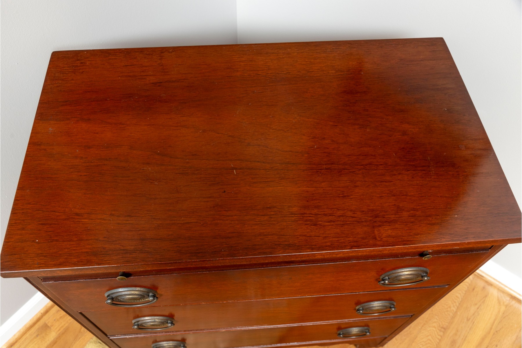 A fine English Georgian Regency style 3-drawer bachelors chest, circa 1960's. Features three dovetailed drawers set below a sliding extension shelf, brass hardware and a handsomely scrolled bottom apron.