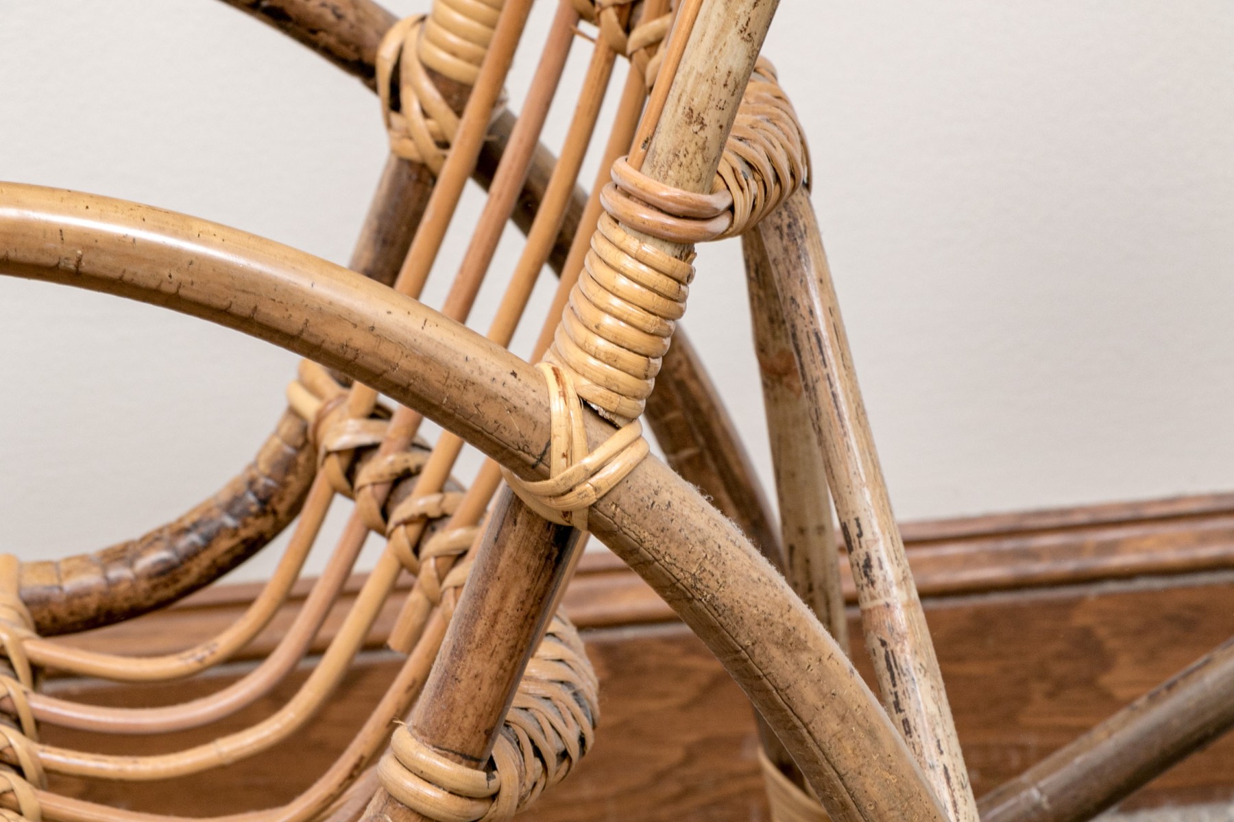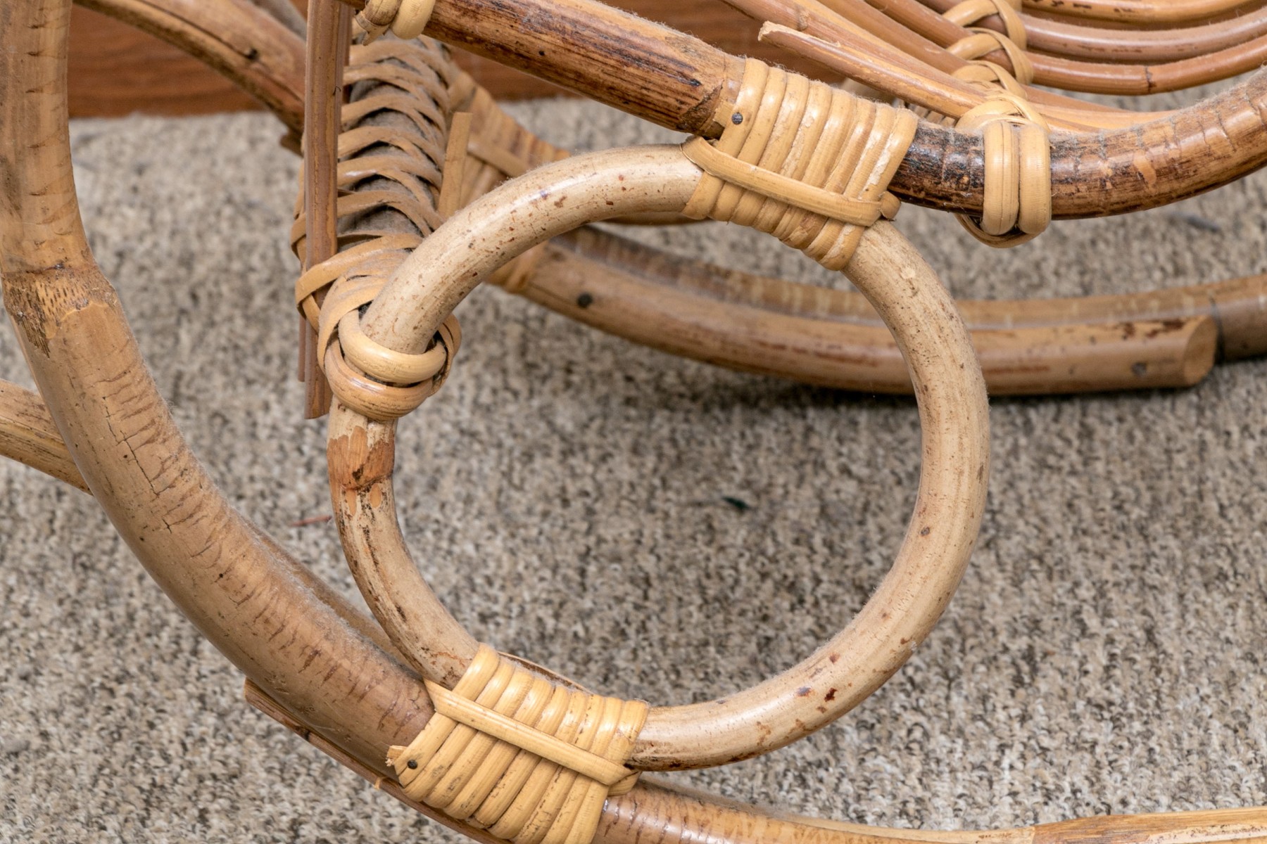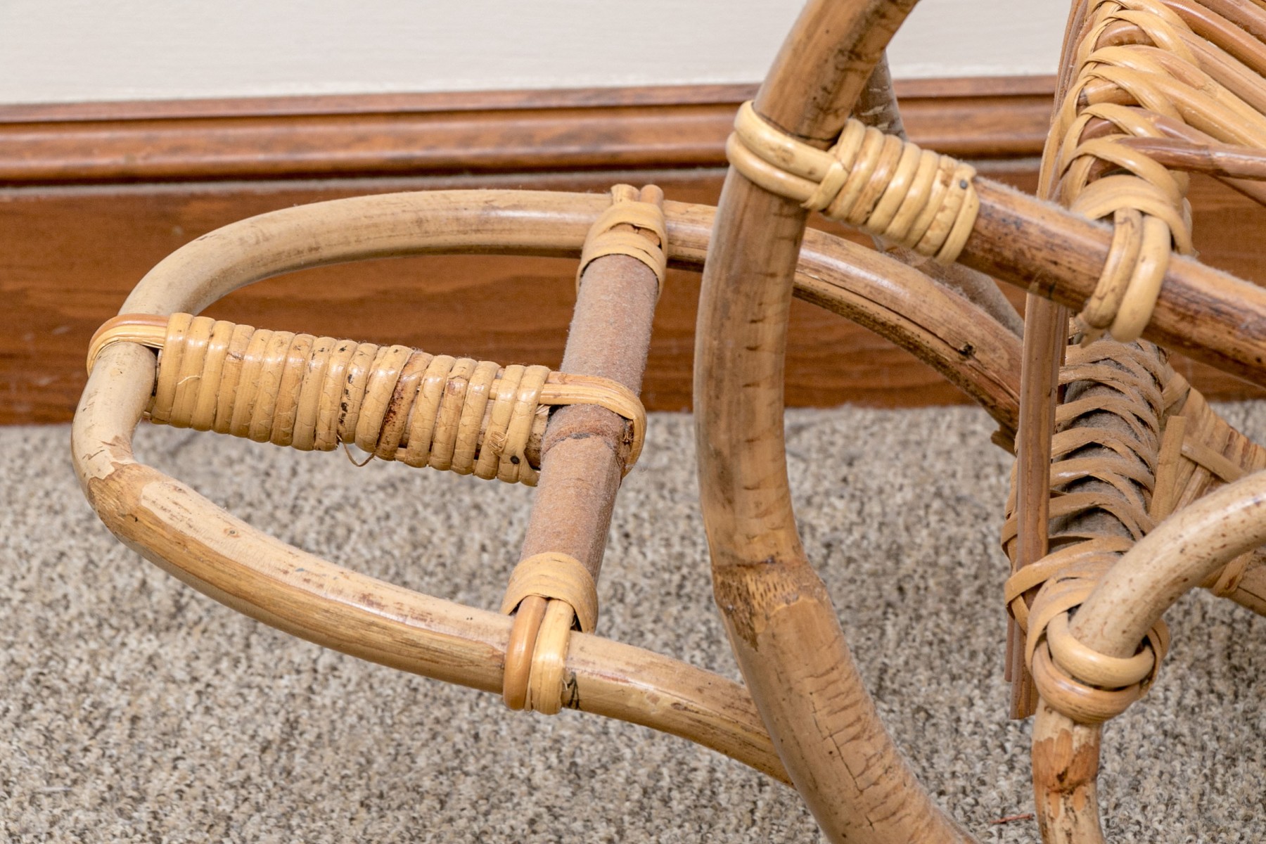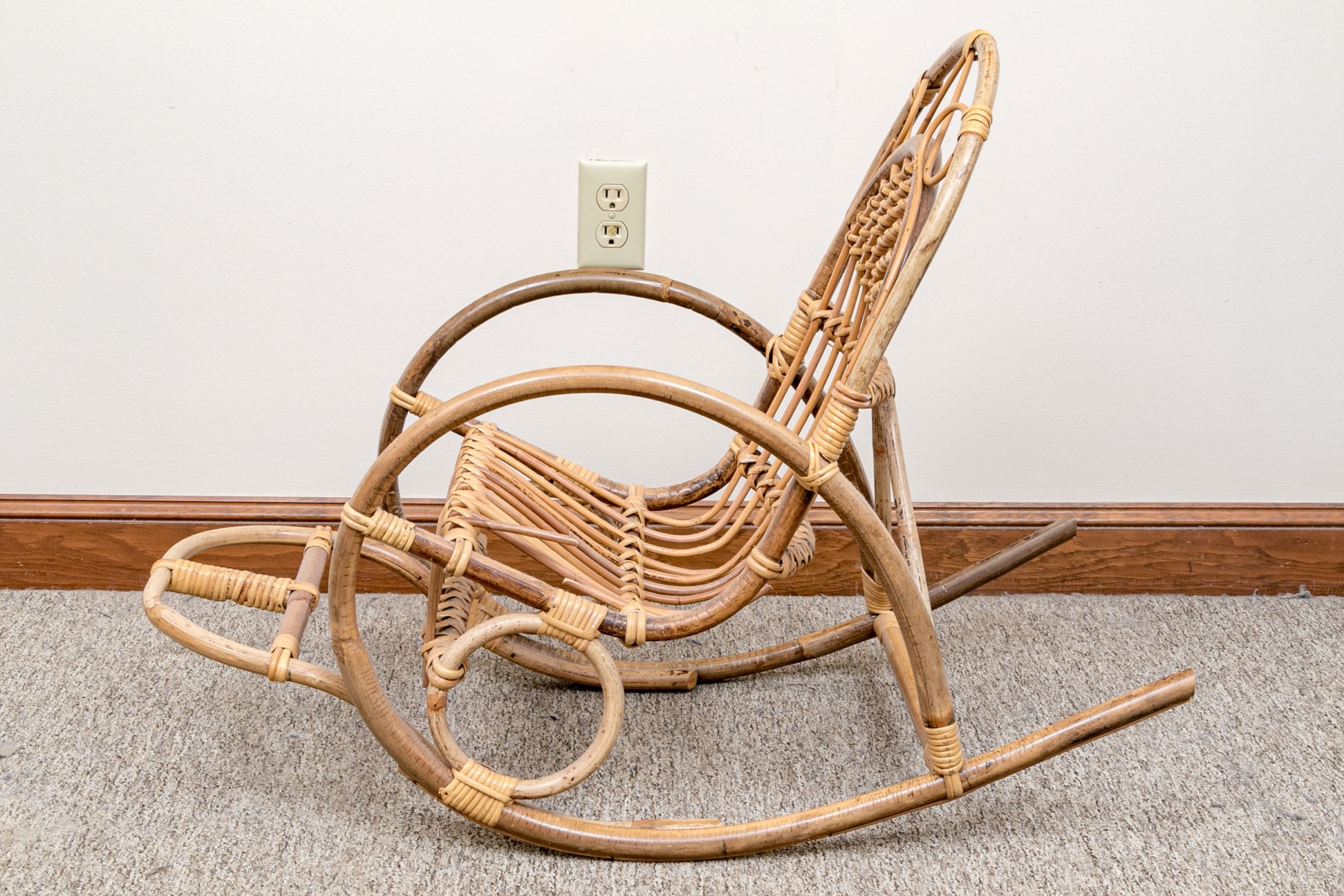A vintage child-sized bamboo and rattan rocking chair, while displaying charming aesthetics, has experienced some breaks and is now suitable for decorative purposes only.