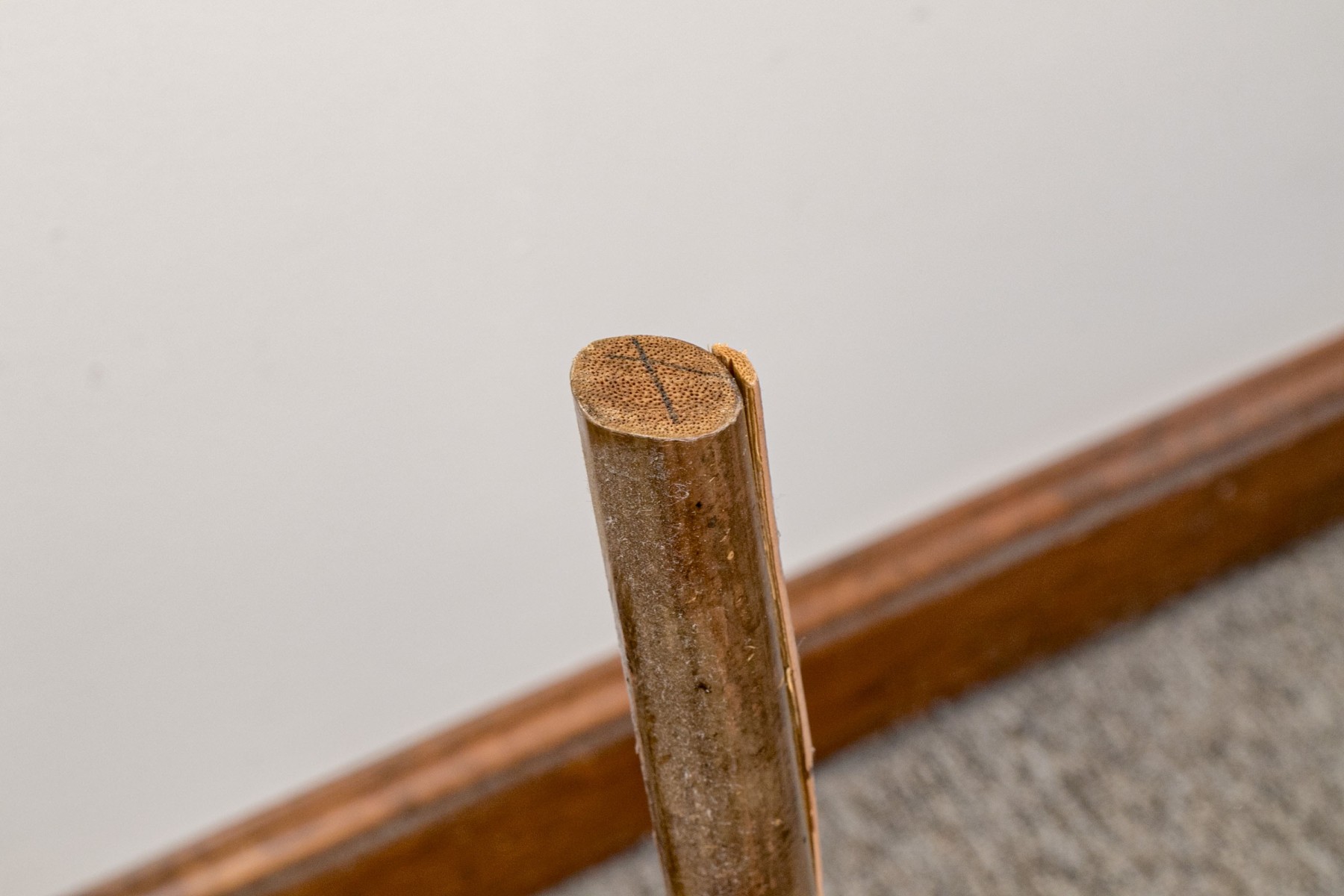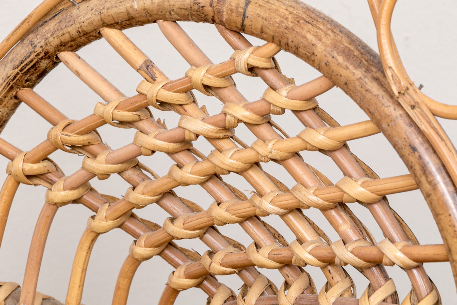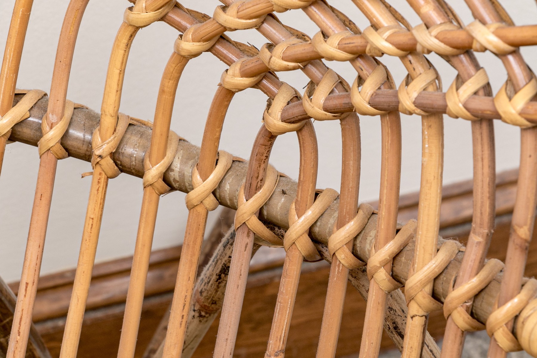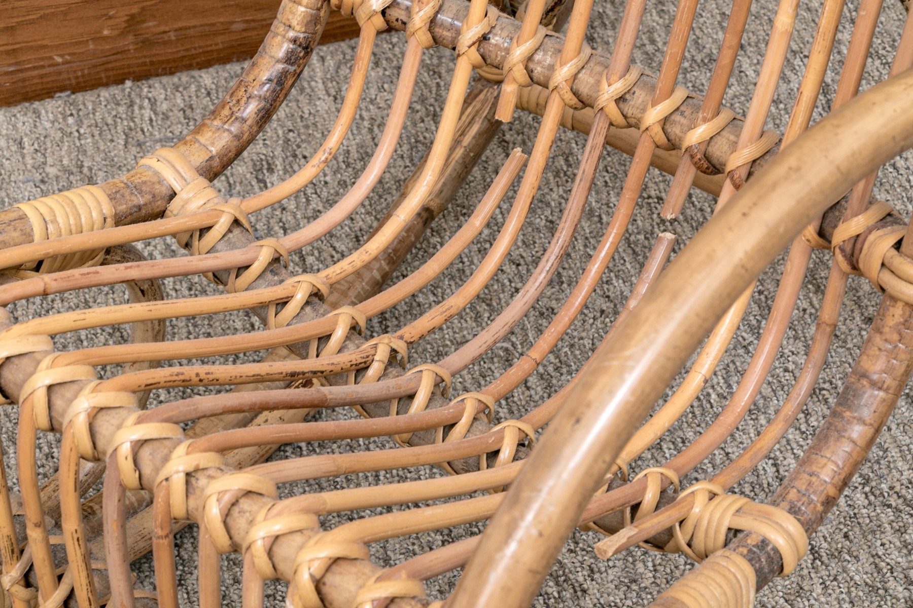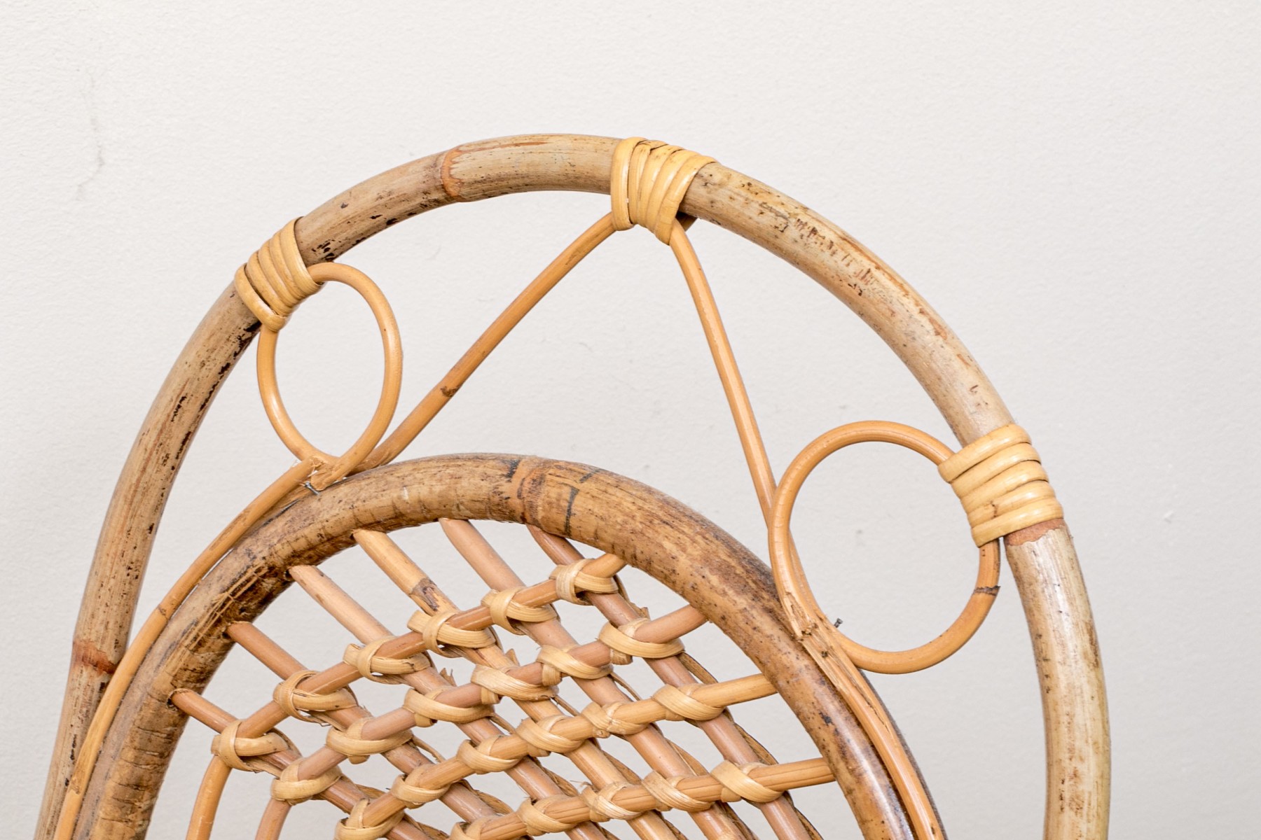 A vintage child-sized bamboo and rattan rocking chair, while displaying charming aesthetics, has experienced some breaks and is now suitable for decorative purposes only.