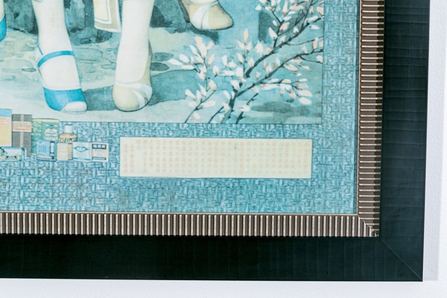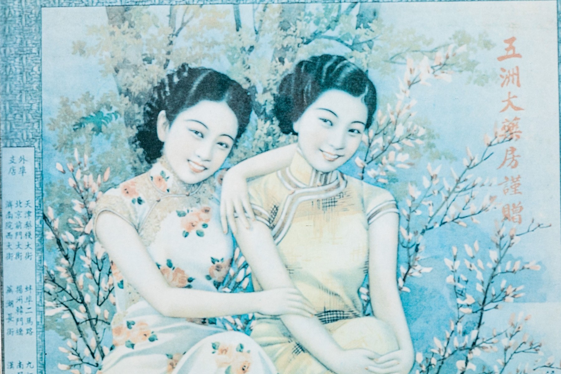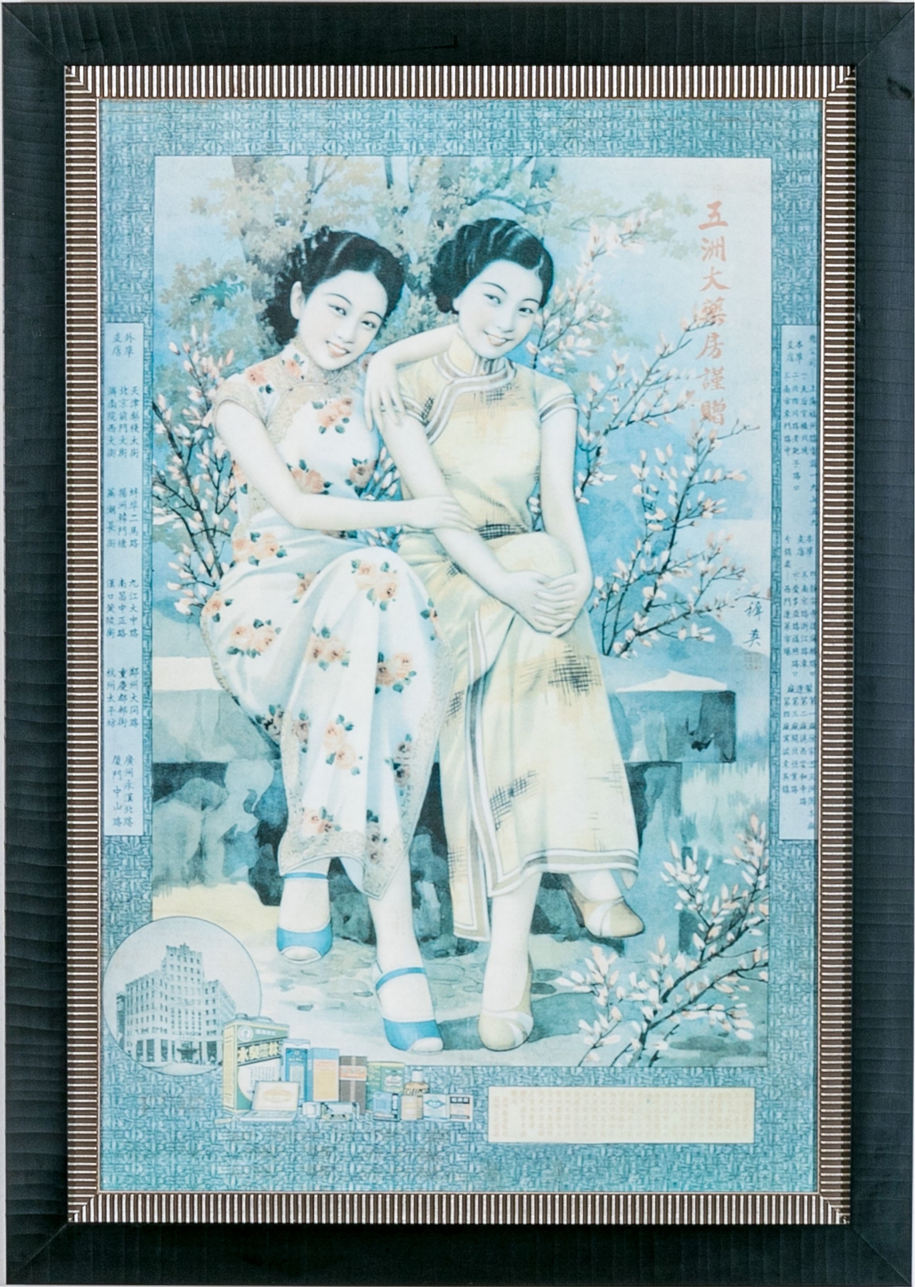 This vintage Chinese advertising poster print showcases two elegant seated Shanghai women amidst a backdrop of vibrant flowers. Displayed in a beautiful ebonized and metallic frame.