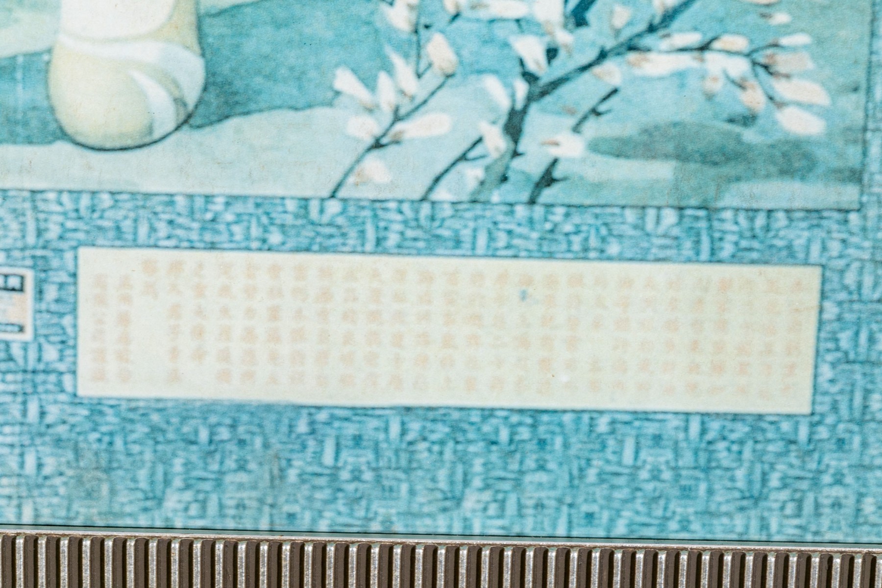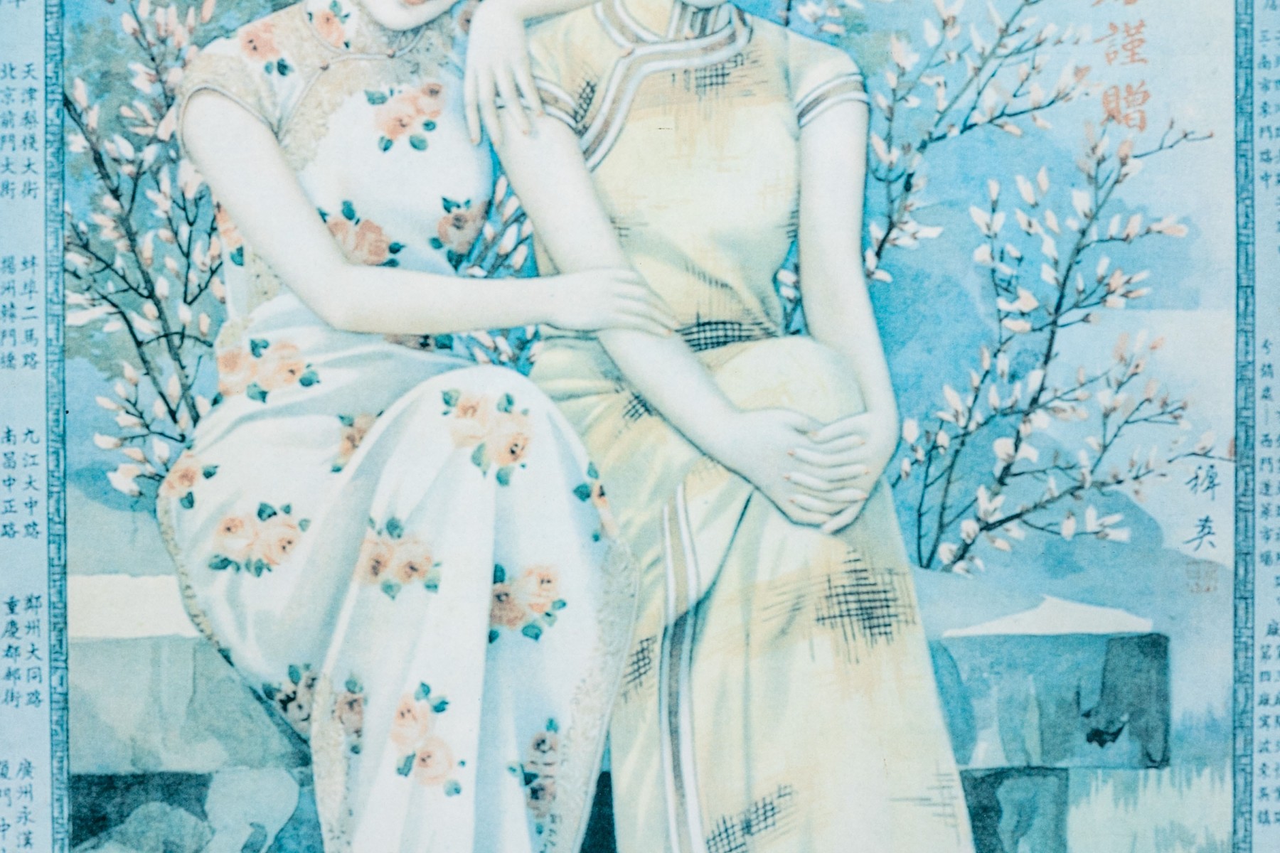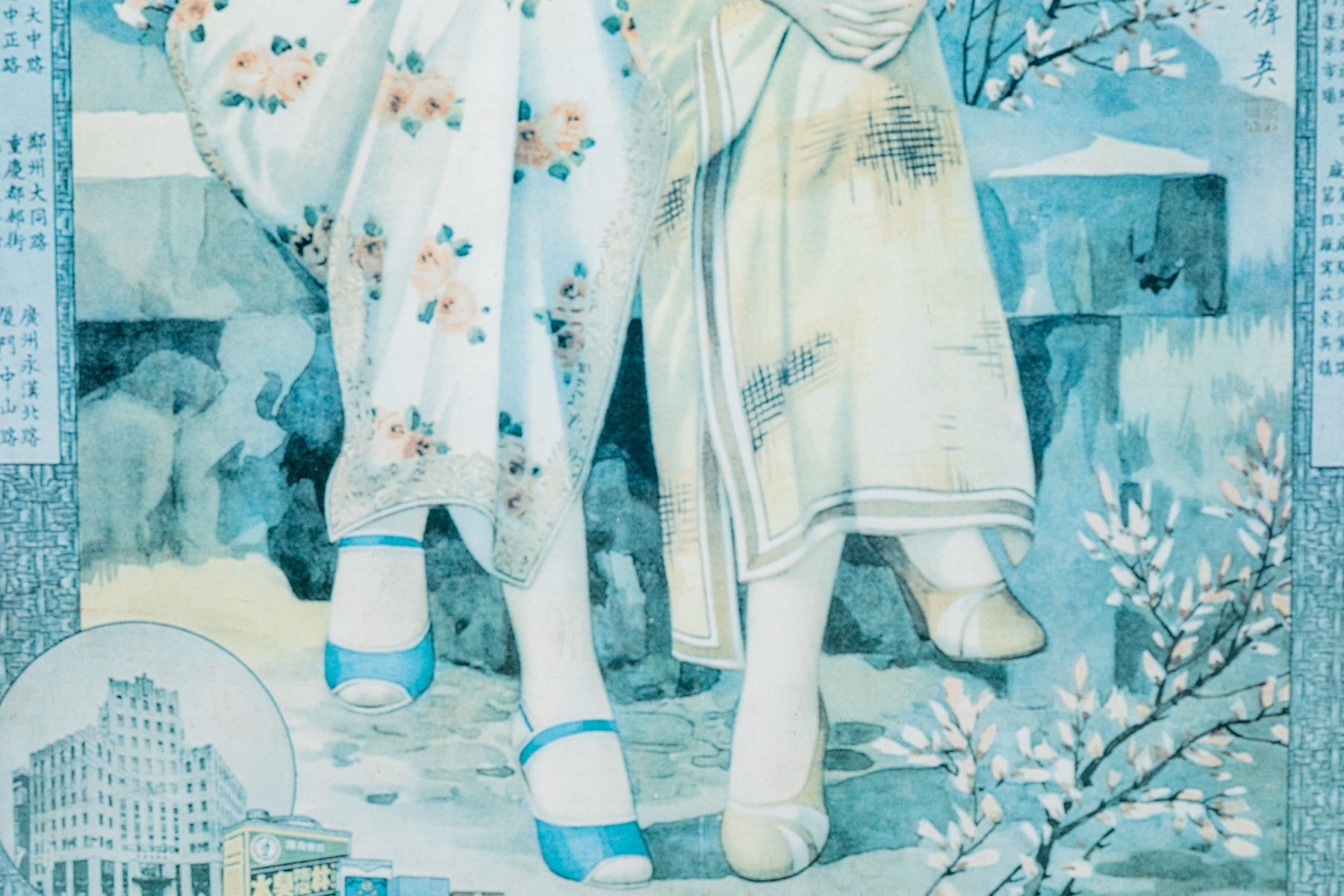 This vintage Chinese advertising poster print showcases two elegant seated Shanghai women amidst a backdrop of vibrant flowers. Displayed in a beautiful ebonized and metallic frame.