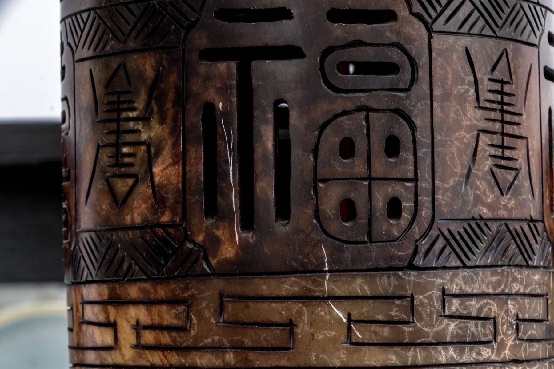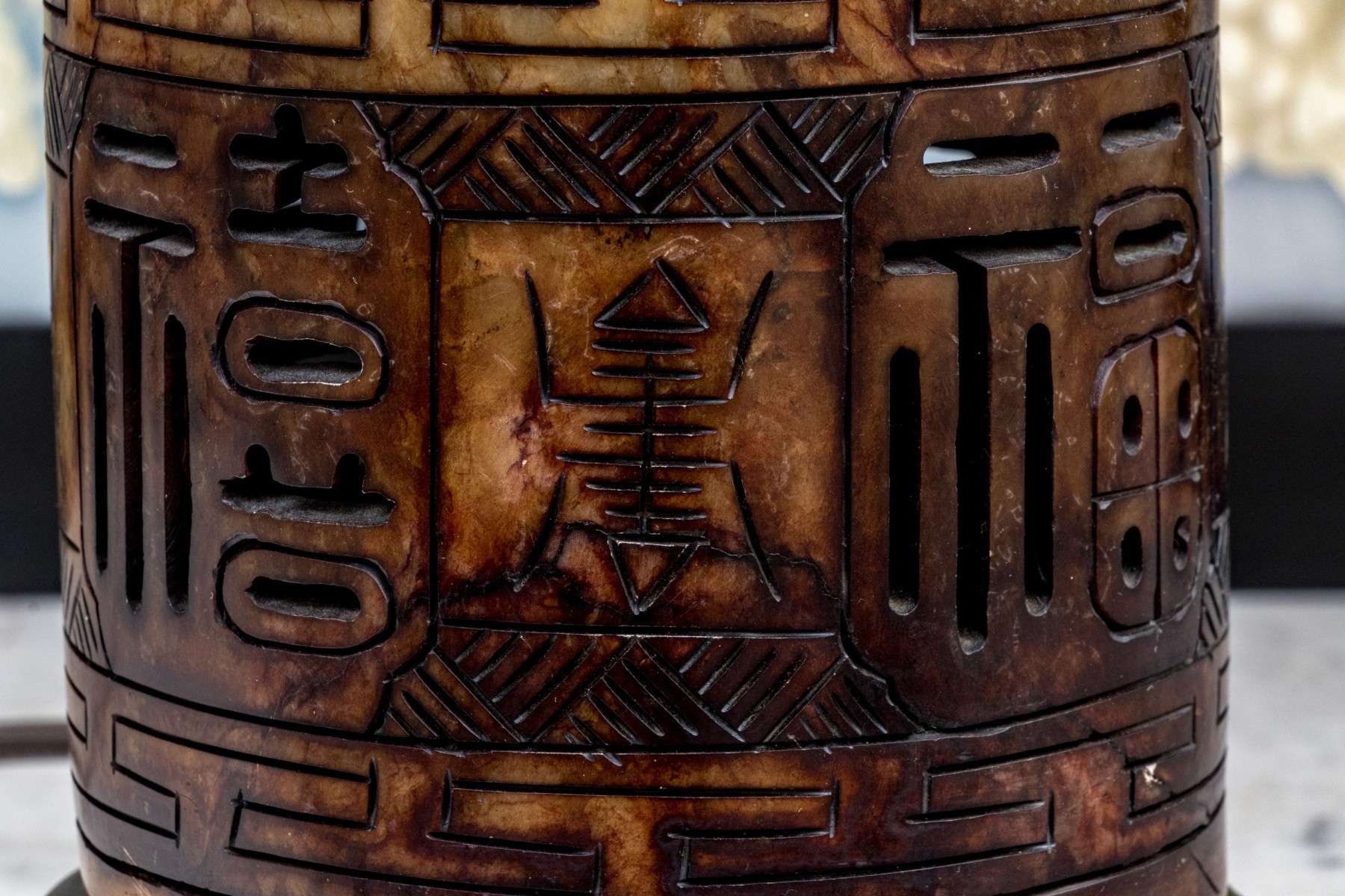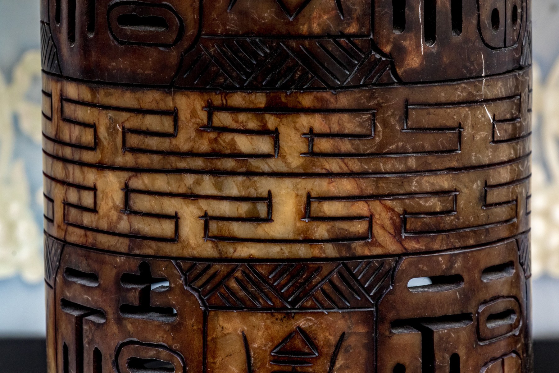 Carved cylindrical, With decorative key fret motifs to the body with pierced and openwork embellishment.