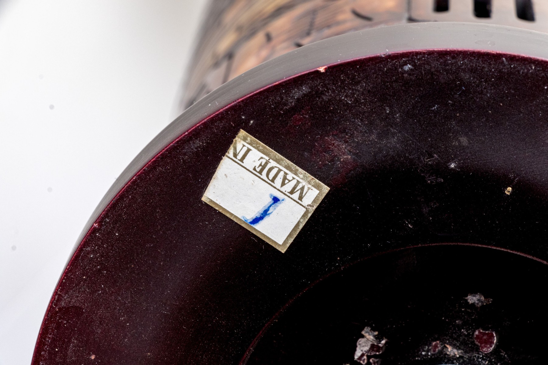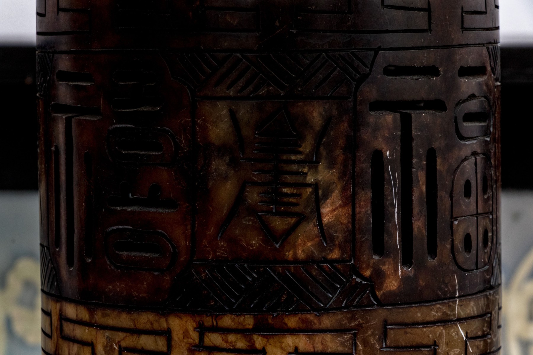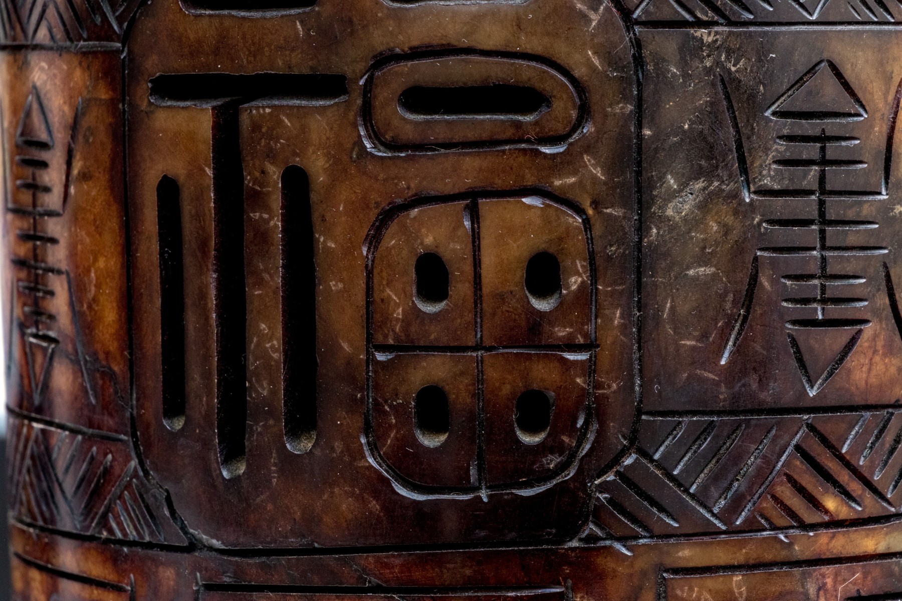 Carved cylindrical, With decorative key fret motifs to the body with pierced and openwork embellishment.
