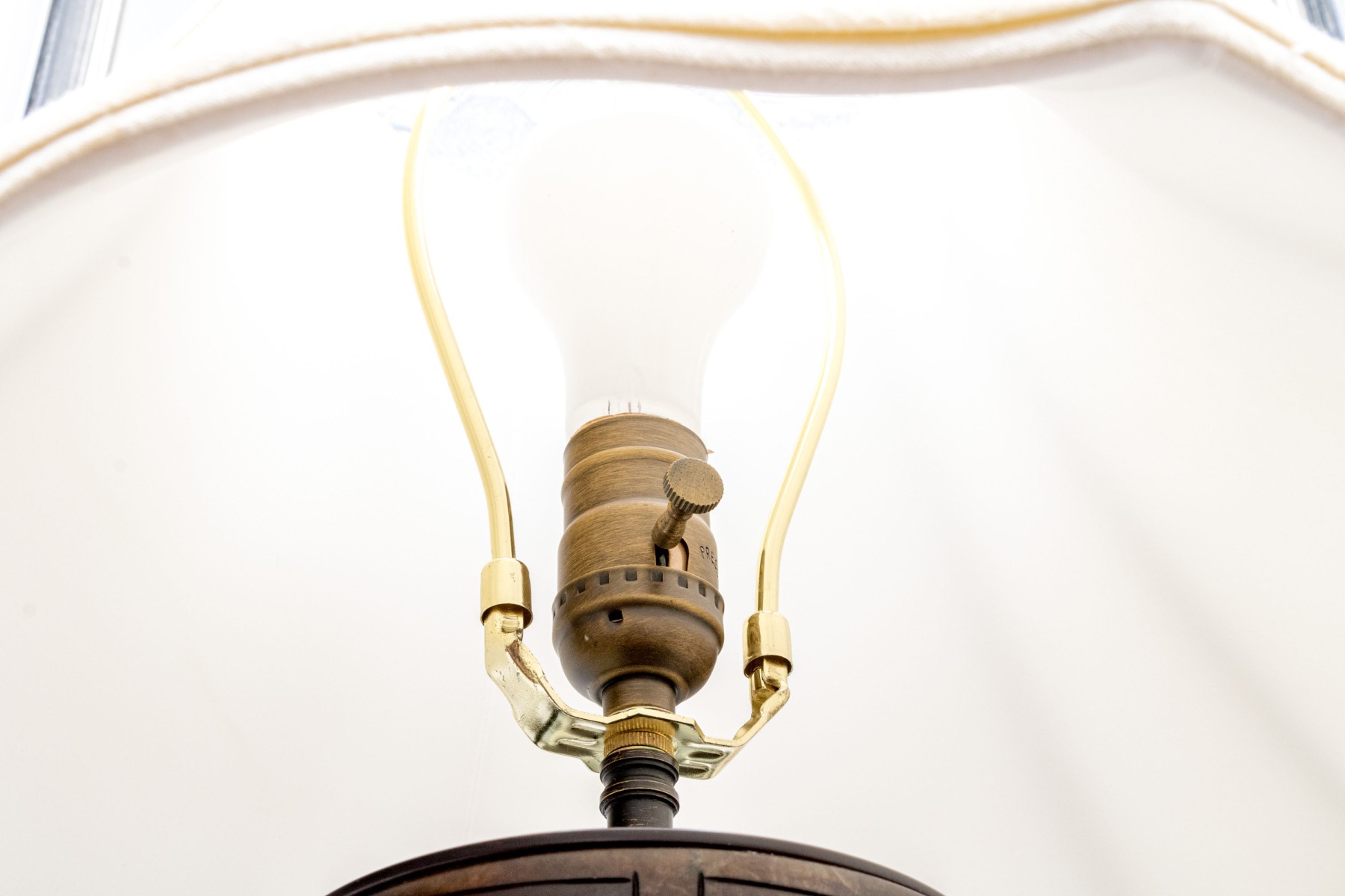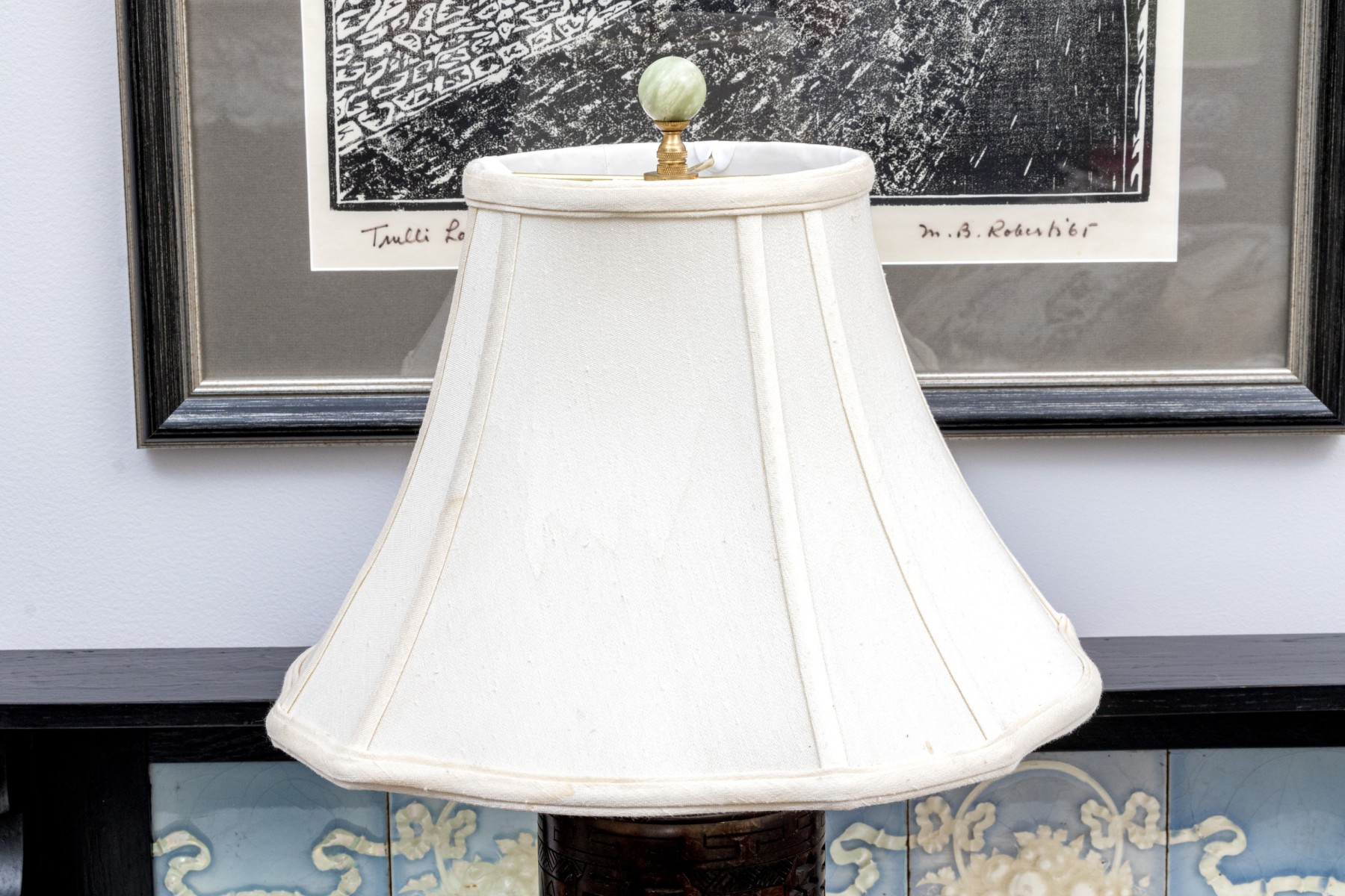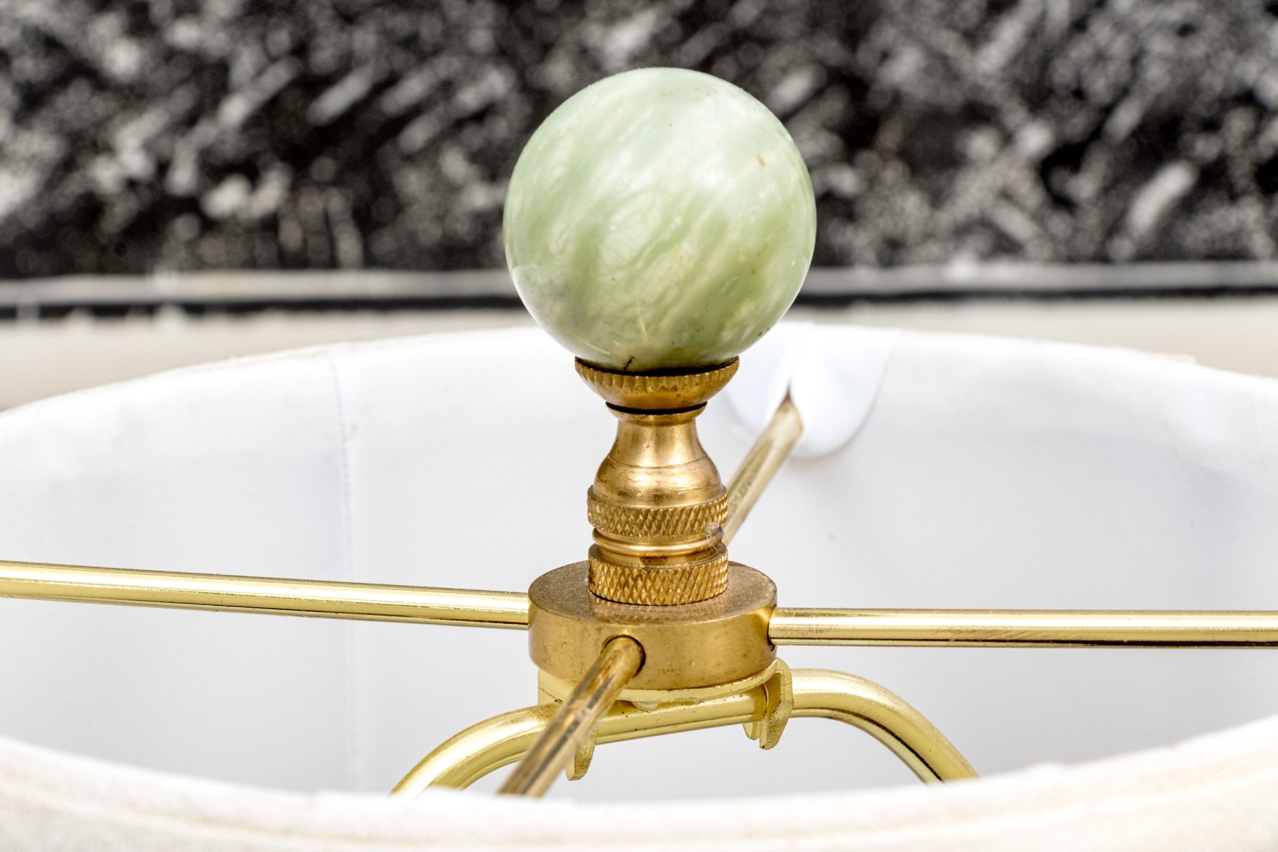 Surmounting the lamp is a bell form shade with circular green carved stone finial.