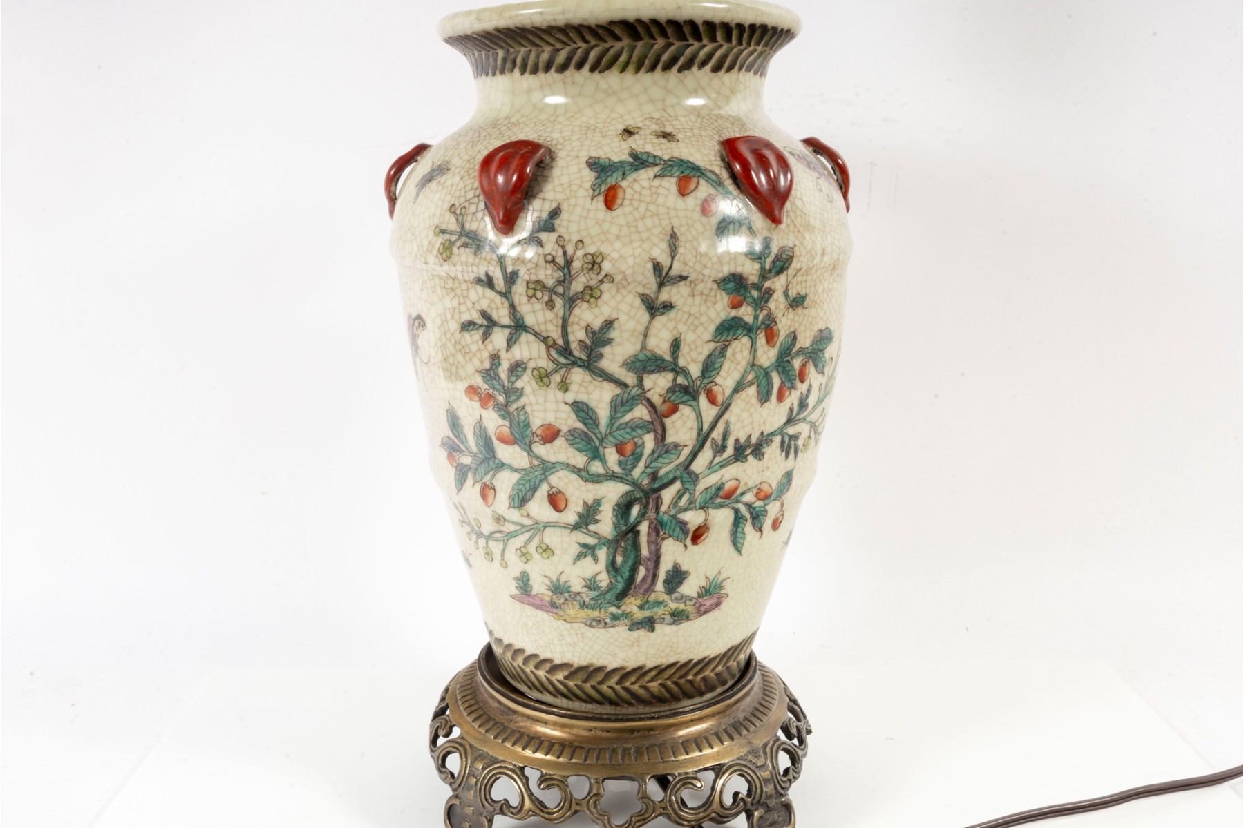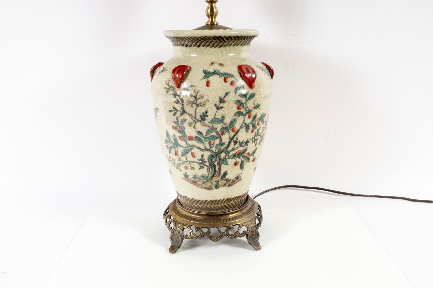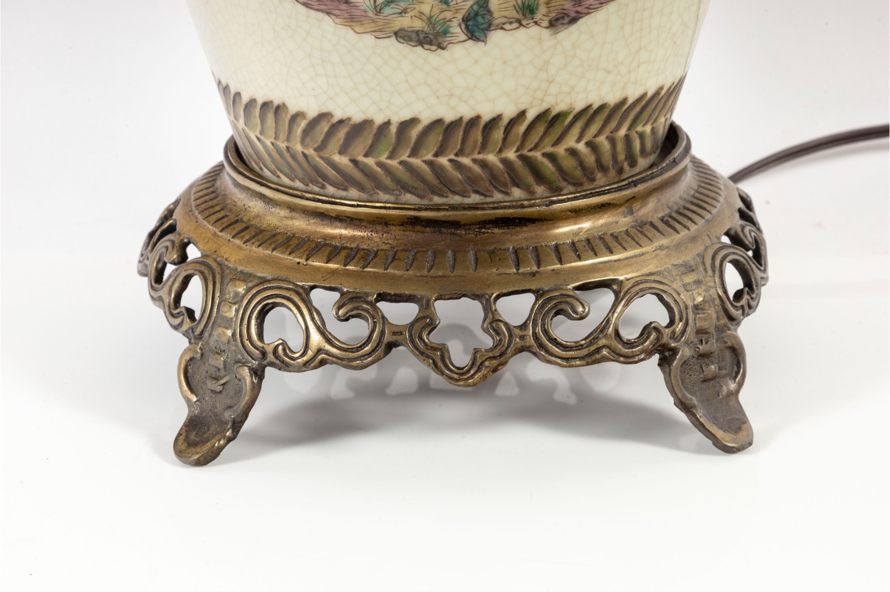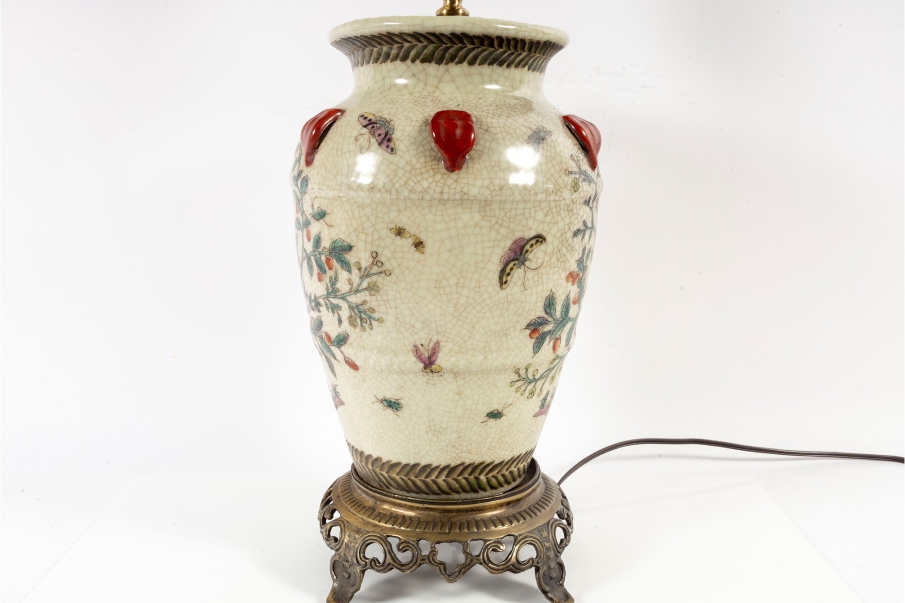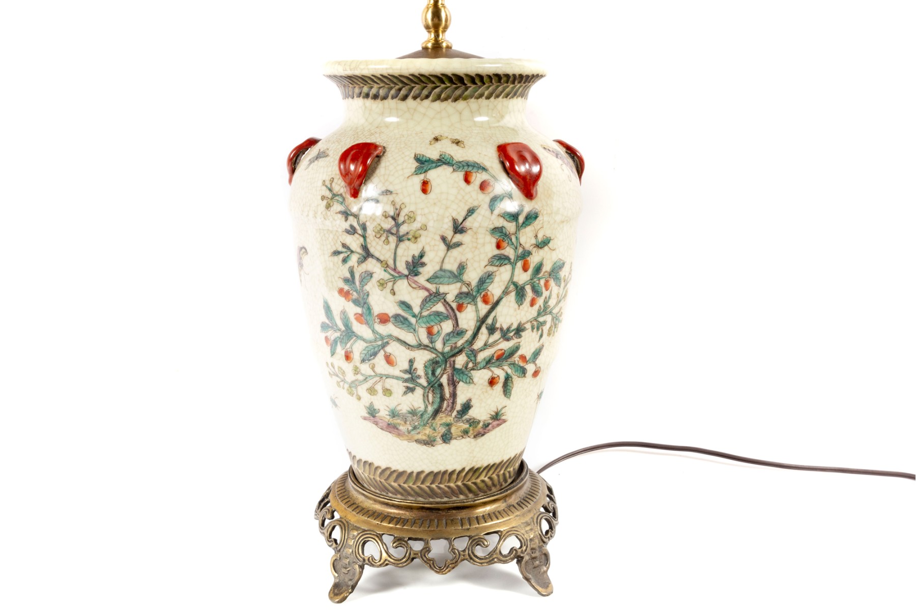 A Chinese jar lamp embellished with a rich cream crackle-glaze accentuating hand-painted florals and mounted on a footed, pierced brass base. Harp and finial included. Shade not included.