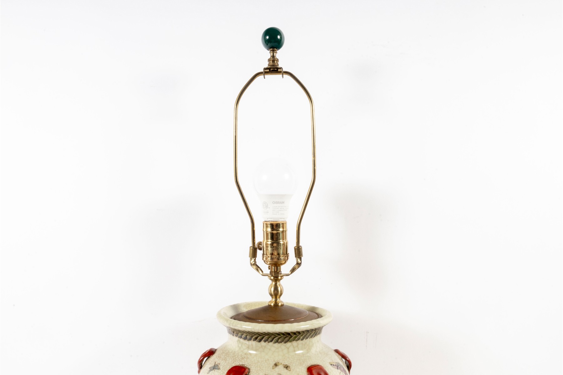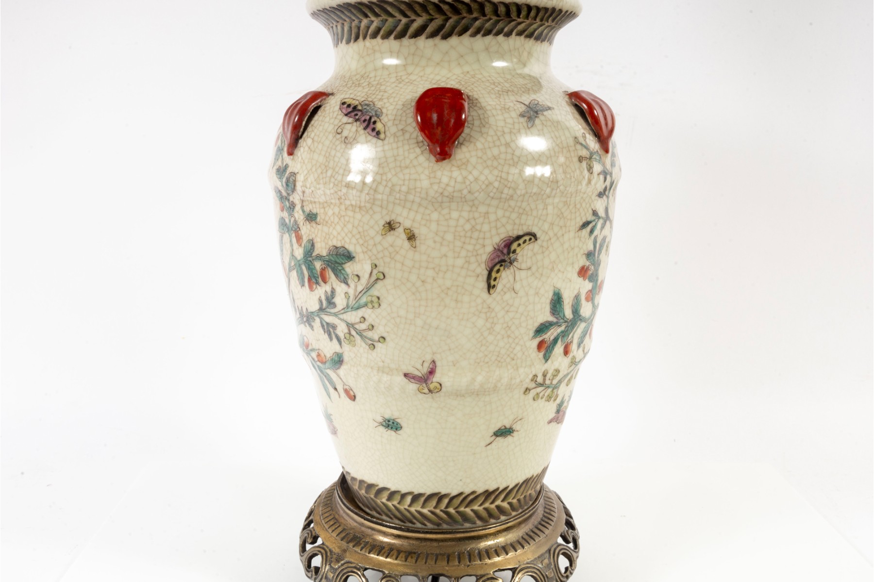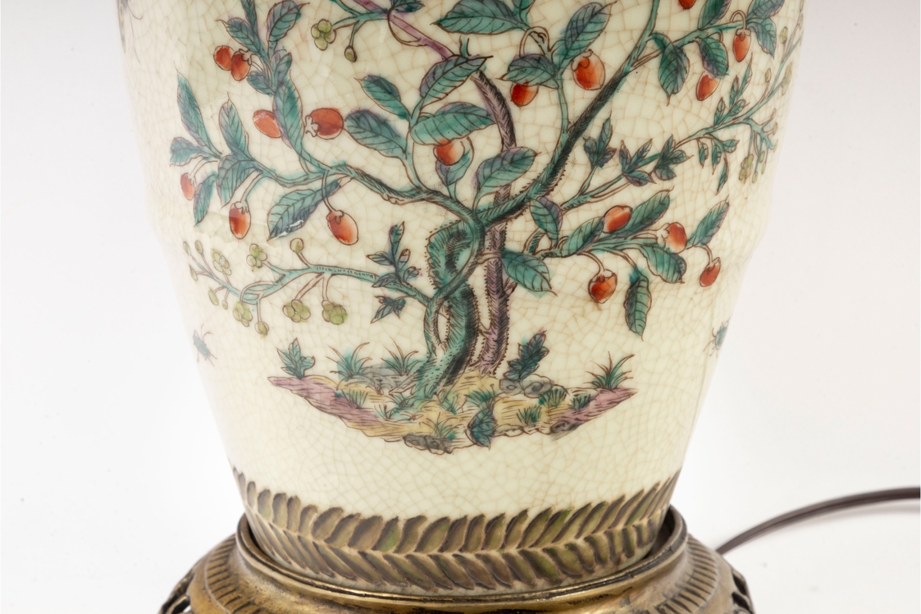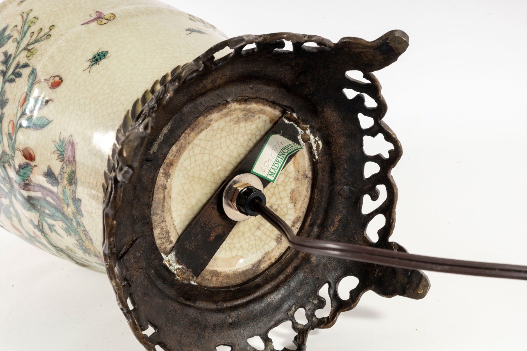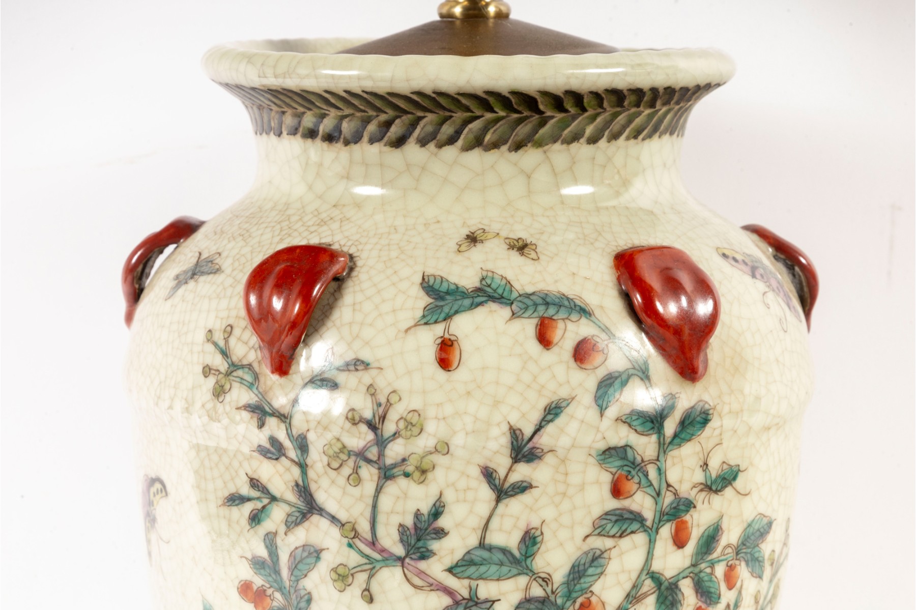 A Chinese jar lamp embellished with a rich cream crackle-glaze accentuating hand-painted florals and mounted on a footed, pierced brass base. Harp and finial included. Shade not included.