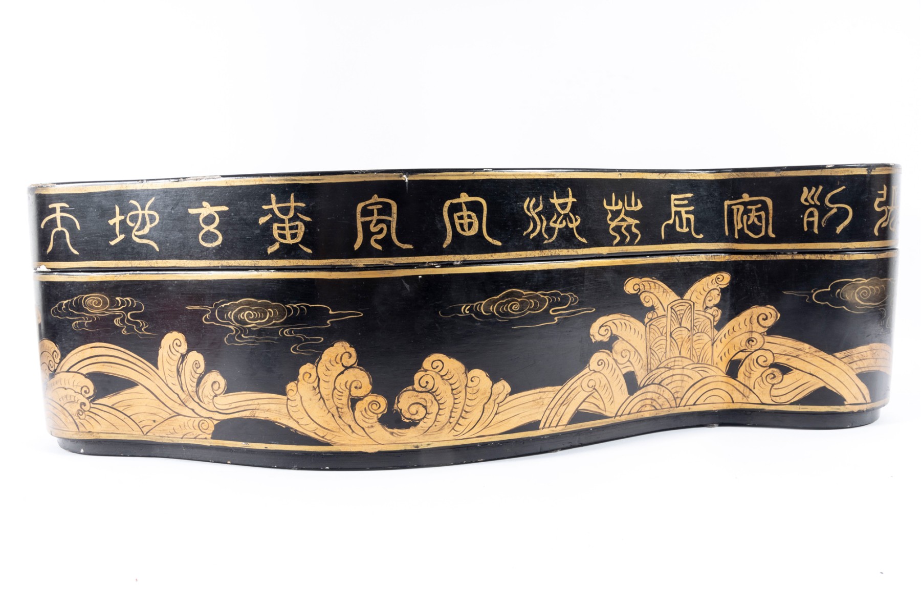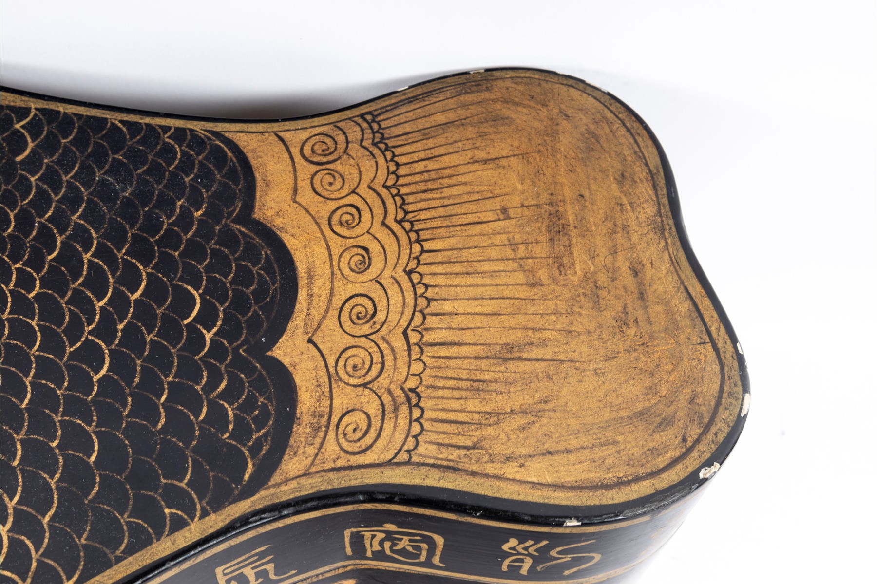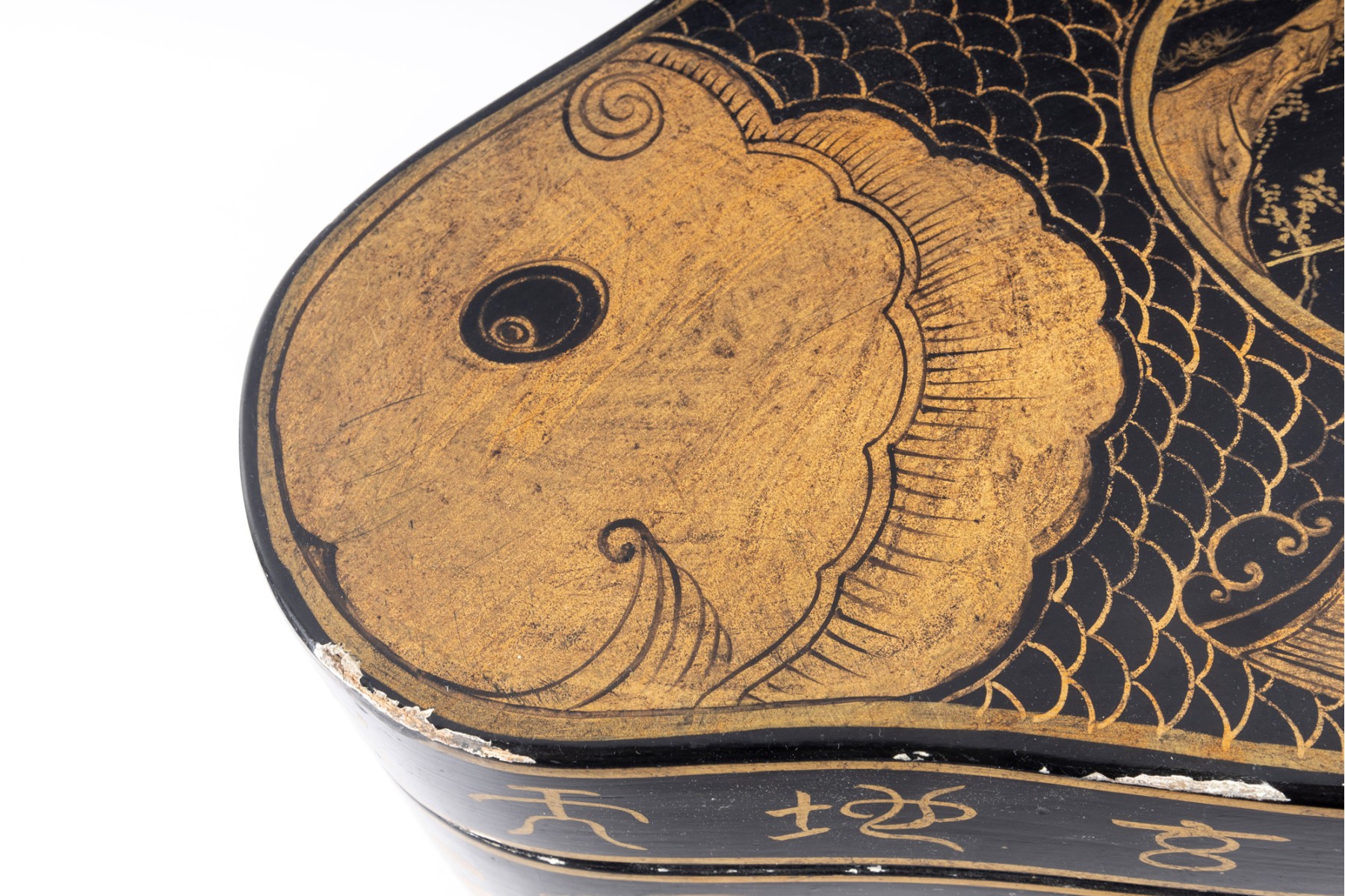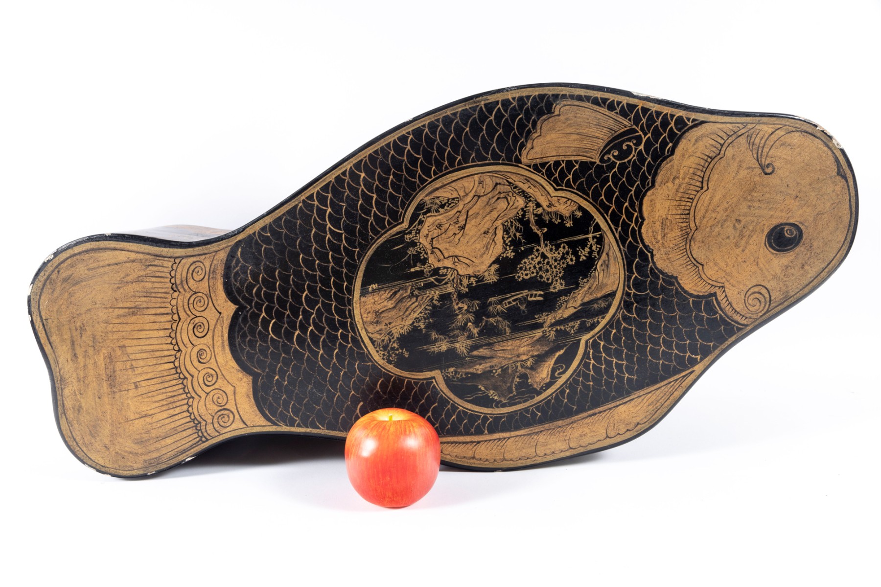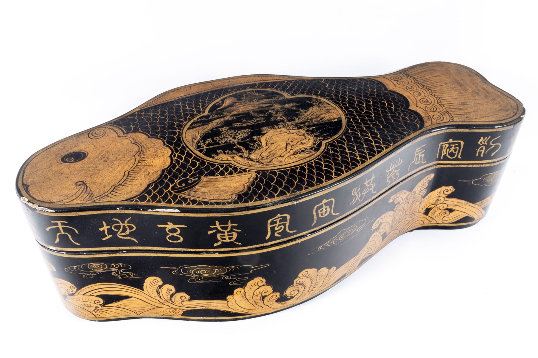 A large, vintage Chinese black-lacquer fish-shaped box with landscape scenes strewn throughout with stencil trim.